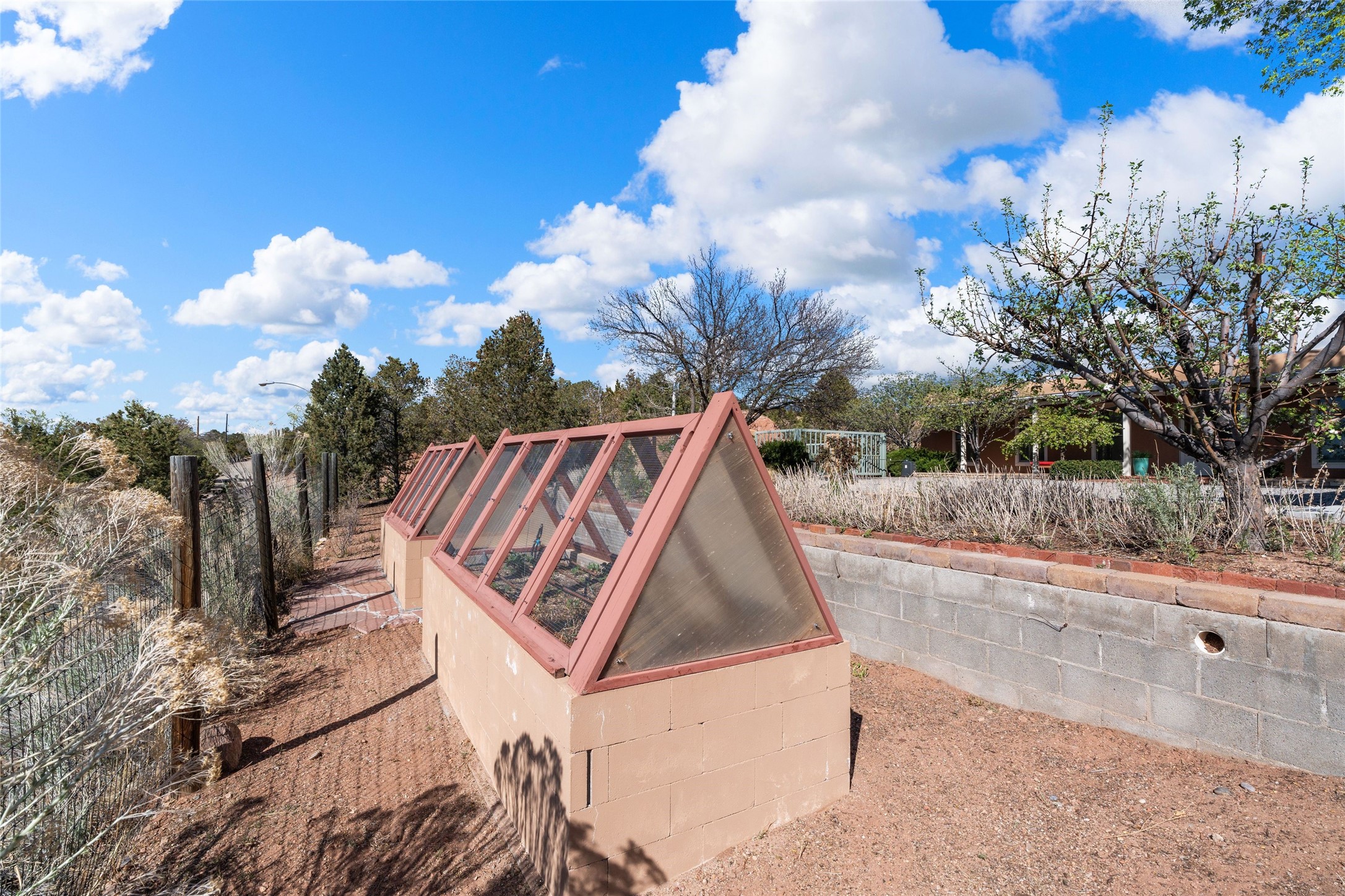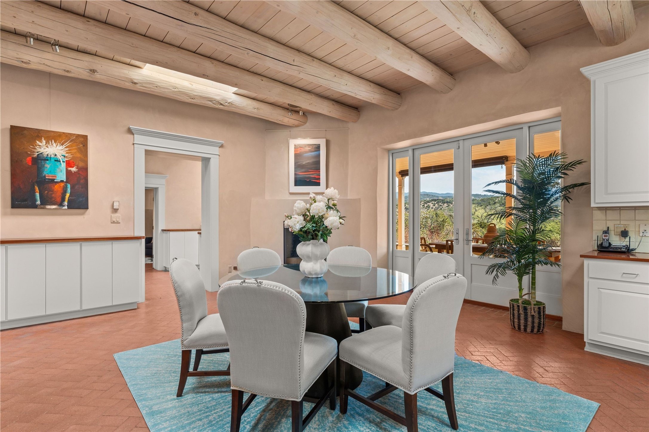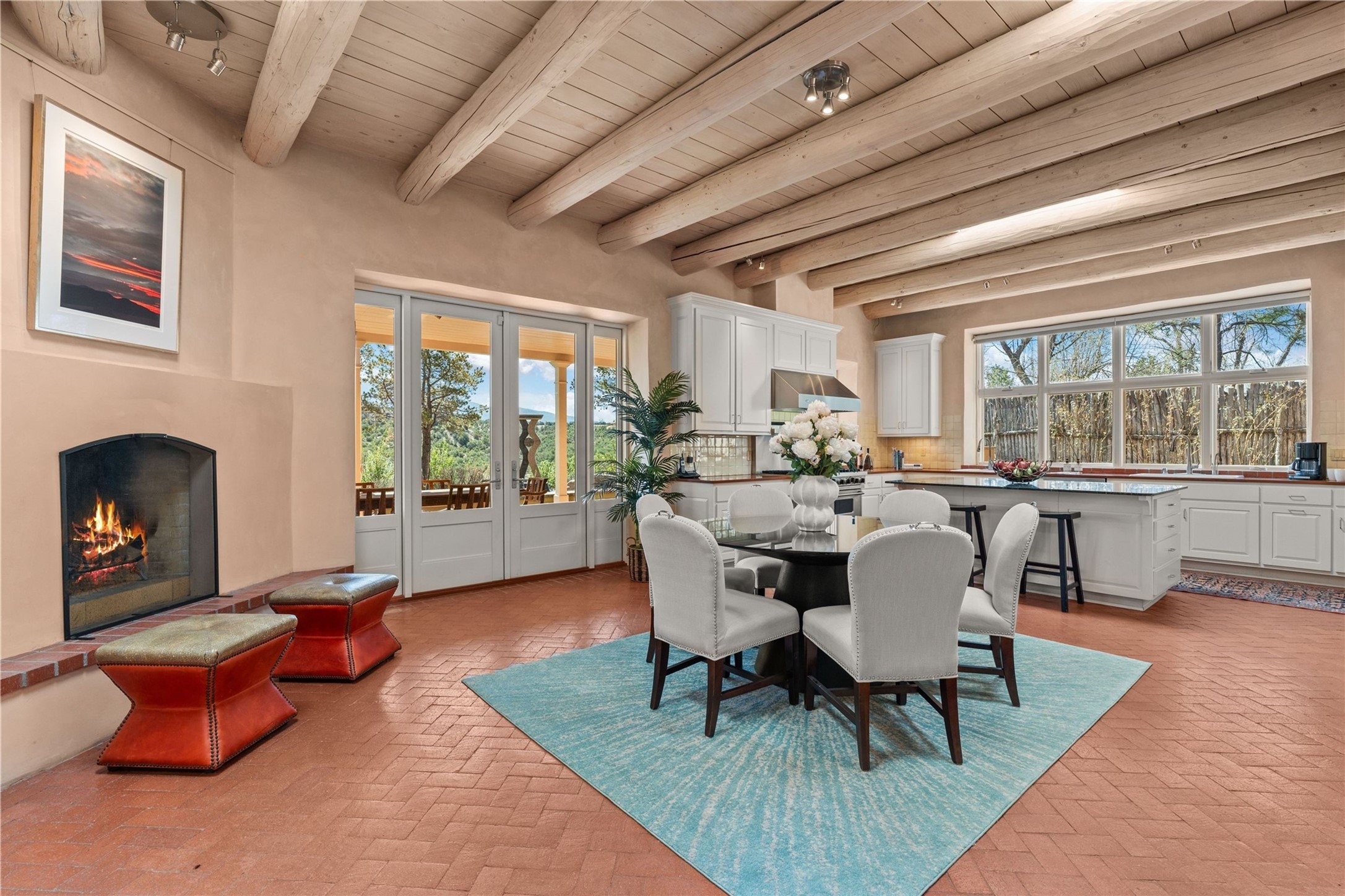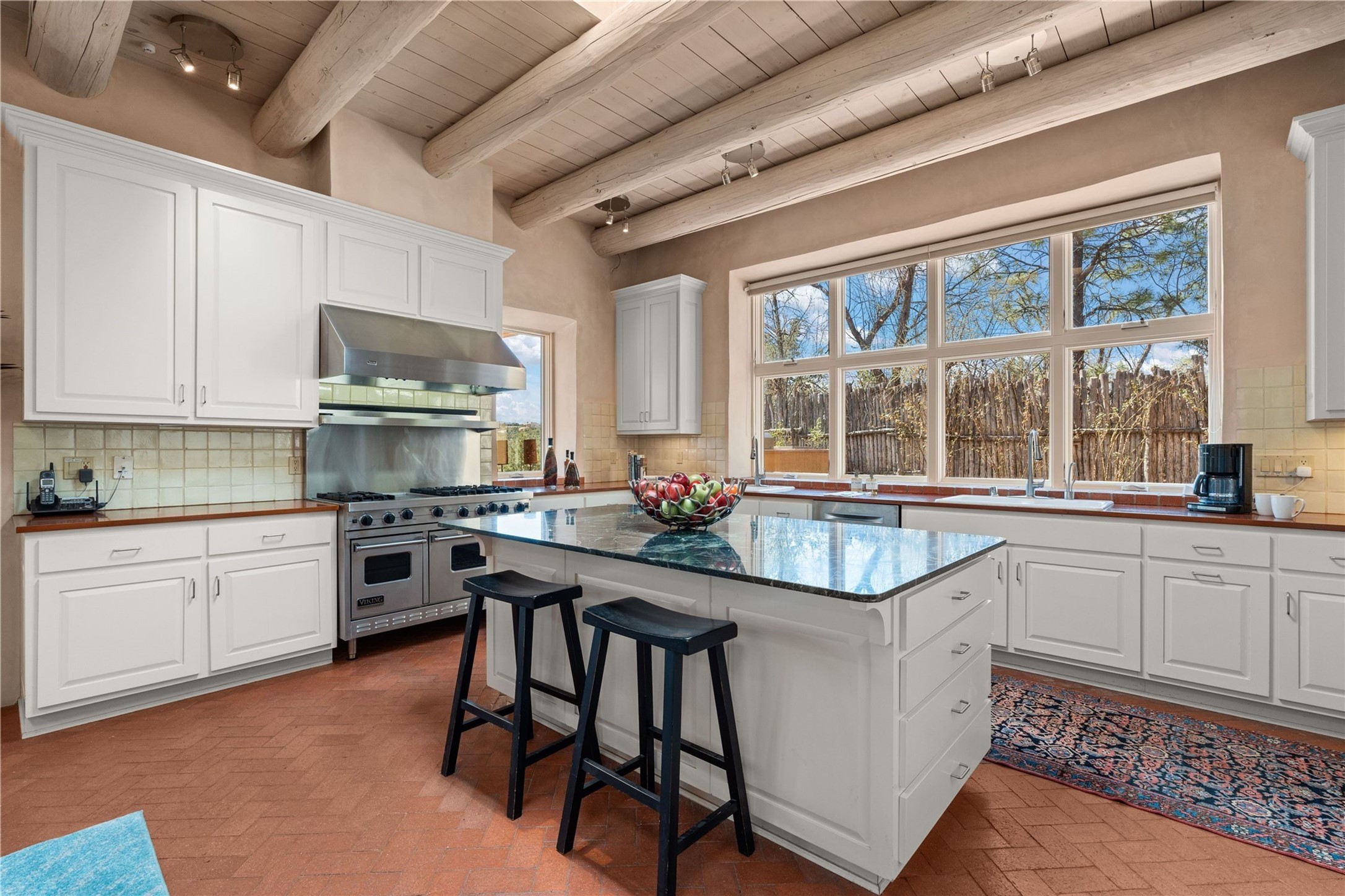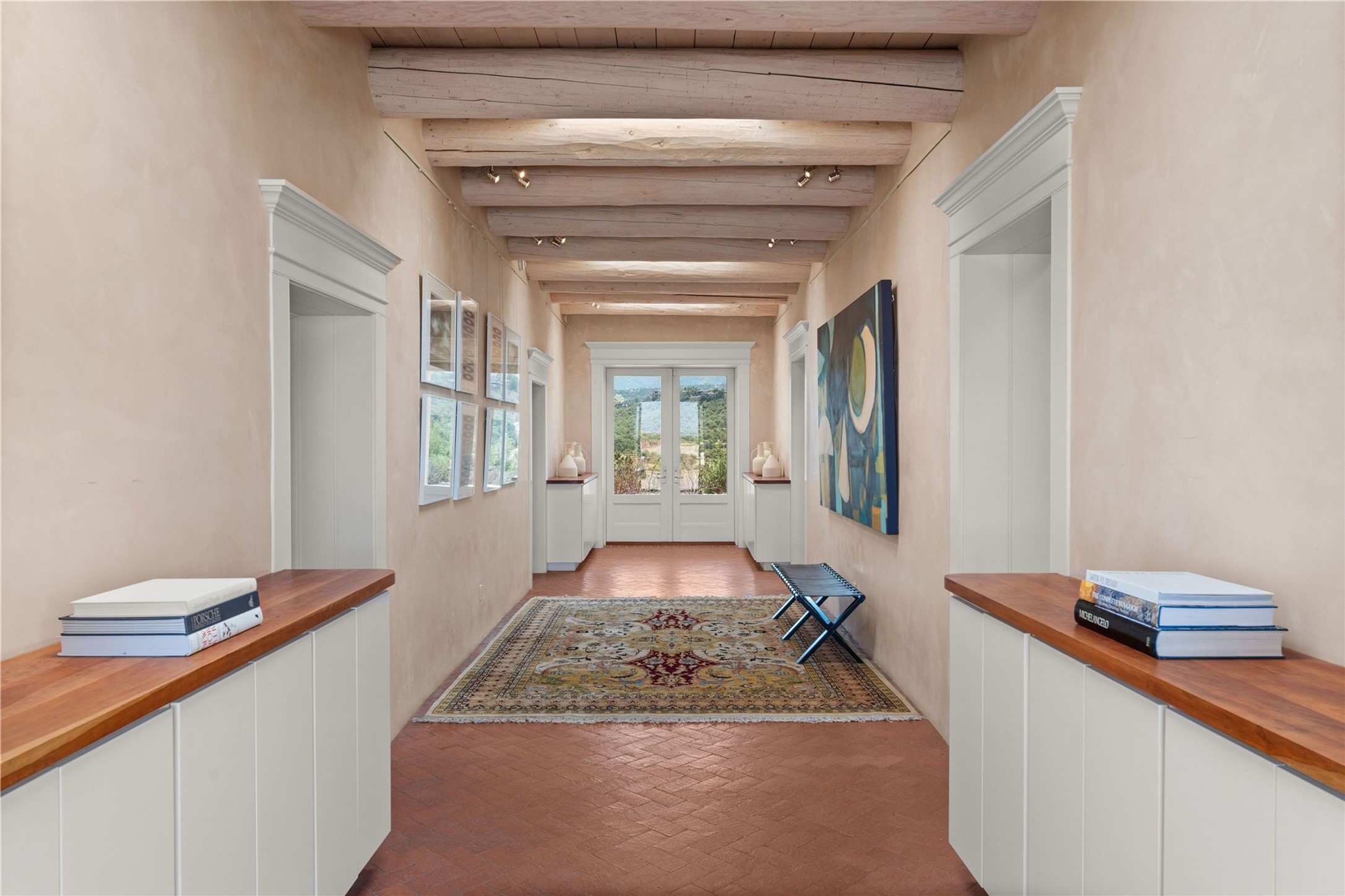 This unique and beautiful 3-bedroom, 3-bath modified Territorial-style, adobe home features unobstructed east-west mountain views and a tableau of breathtaking sunrises and sunsets. Designed by Doug Atwill, a Santa Fe builder/artist with exceptional vision, this home also features 13 ft. high beamed ceilings, 23 skylights, and radiant-heated brick floors complemented by 3 fireplaces. As you enter, a wide and gracious hallway welcomes and guides you to the back portal with stunning views of the eastern mountains. Situated to align with the summer solstice, this central hallway enjoys abundant light and provides a perfect place for displaying artwork. Public areas of the home, including elegant living room, library/media room, and spacious kitchen/dining room, are located on the south side of the hall while the private bedrooms are located on the north side. An outdoor grilling/barbecue station, hot tub, and multiple portals/patios, provide ample space for relaxation and entertaining. Gardeners and chefs alike will delight in the property's mature fruit trees and 2 waist-high irrigated planting beds. Oversized (built 2020) two-car detached garage features heating/cooling, floor-to-ceiling cabinets, art storage, EV charger, 220-volt RV charger and rooftop viewing/entertainment deck with panoramic mountain views. Environmentally conscious buyers will appreciate the green features including the solar photovoltaic electric system. Water monitoring and shut off system. Located less than one mile north of Fort Marcy and the historic Santa Fe Plaza.