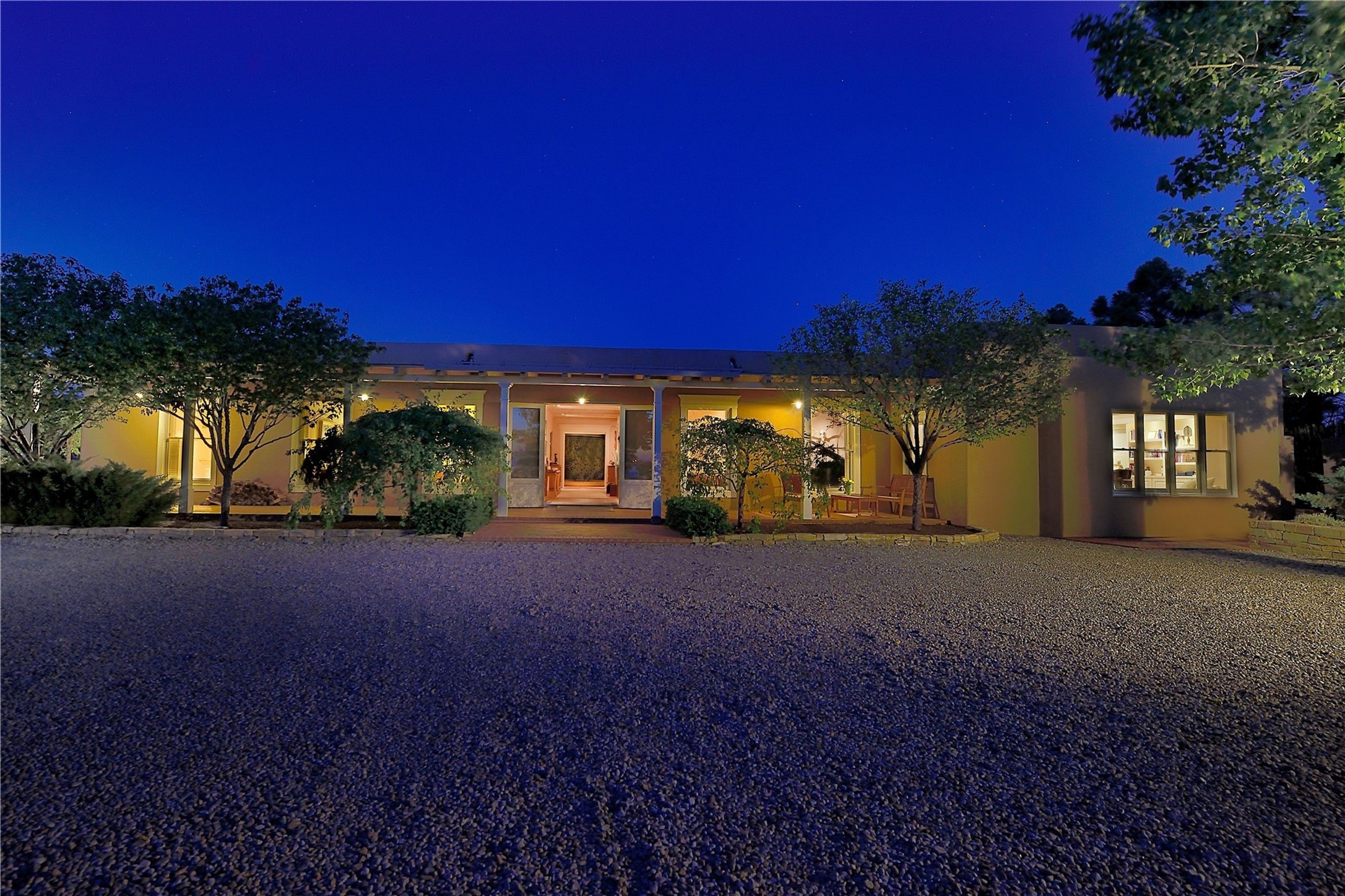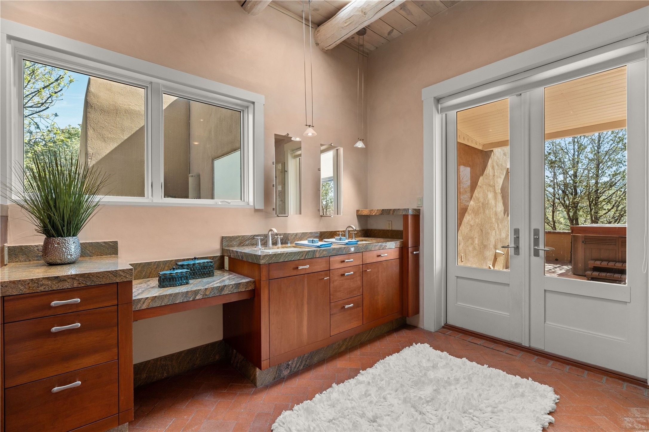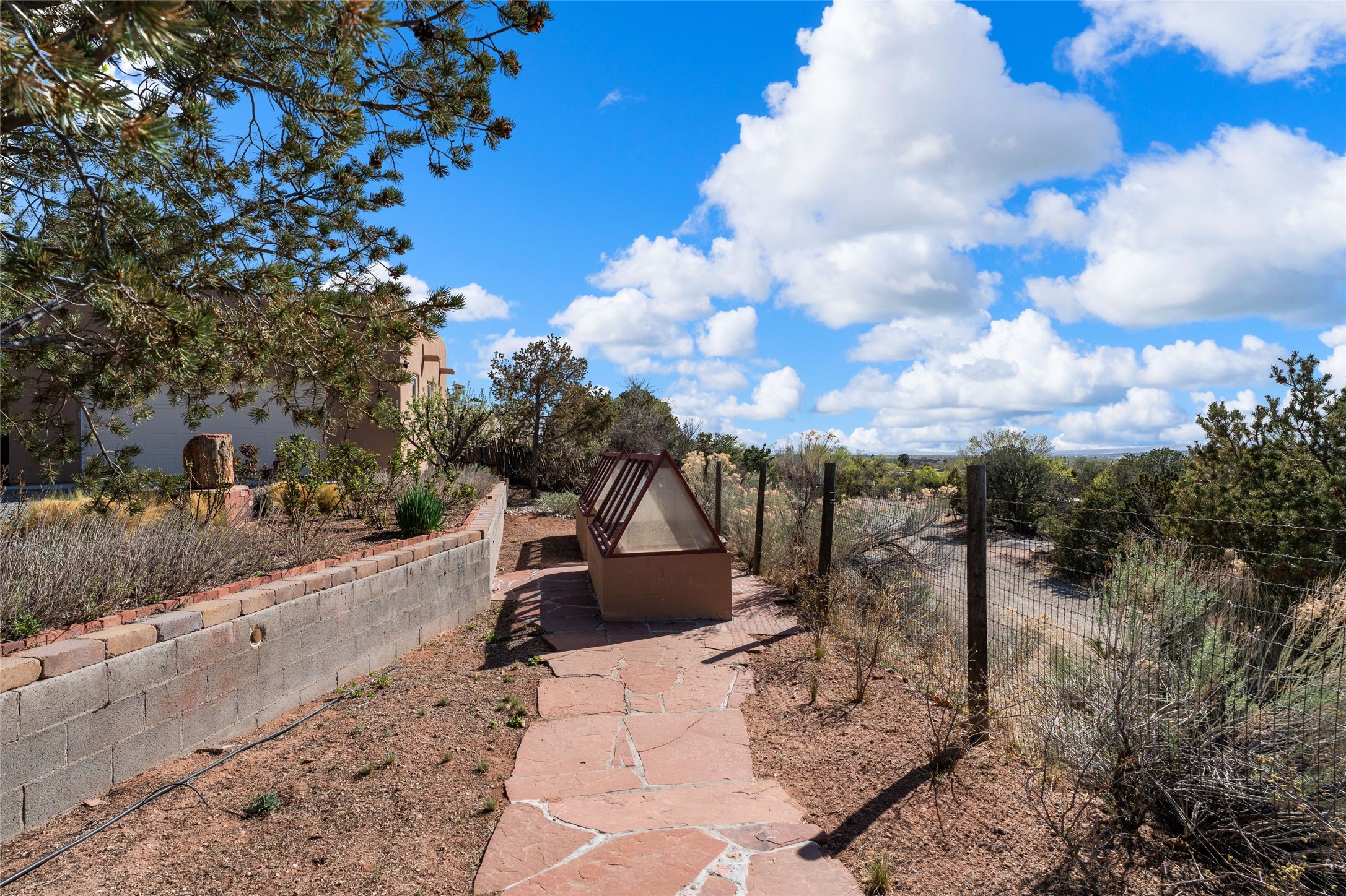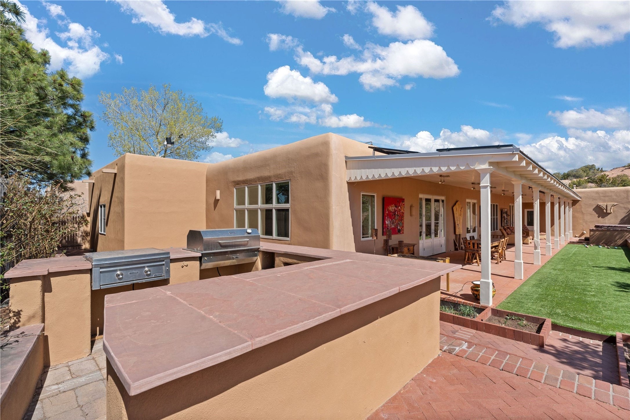 This unique and beautiful 3-bedroom, 3-bath modified Territorial-style, adobe home features unobstructed east-west mountain views and a tableau of breathtaking sunrises and sunsets. Designed by Doug Atwill, a Santa Fe builder/artist with exceptional vision, this home also features 13 ft. high beamed ceilings, 23 skylights, and radiant-heated brick floors complemented by 3 fireplaces. As you enter, a wide and gracious hallway welcomes and guides you to the back portal with stunning views of the eastern mountains. Situated to align with the summer solstice, this central hallway enjoys abundant light and provides a perfect place for displaying artwork. Public areas of the home, including elegant living room, library/media room, and spacious kitchen/dining room, are located on the south side of the hall while the private bedrooms are located on the north side. An outdoor grilling/barbecue station, hot tub, and multiple portals/patios, provide ample space for relaxation and entertaining. Gardeners and chefs alike will delight in the property's mature fruit trees and 2 waist-high irrigated planting beds. Oversized (built 2020) two-car detached garage features heating/cooling, floor-to-ceiling cabinets, art storage, EV charger, 220-volt RV charger and rooftop viewing/entertainment deck with panoramic mountain views. Environmentally conscious buyers will appreciate the green features including the solar photovoltaic electric system. Water monitoring and shut off system. Located less than one mile north of Fort Marcy and the historic Santa Fe Plaza.