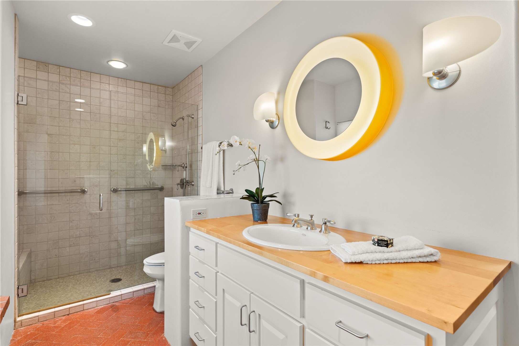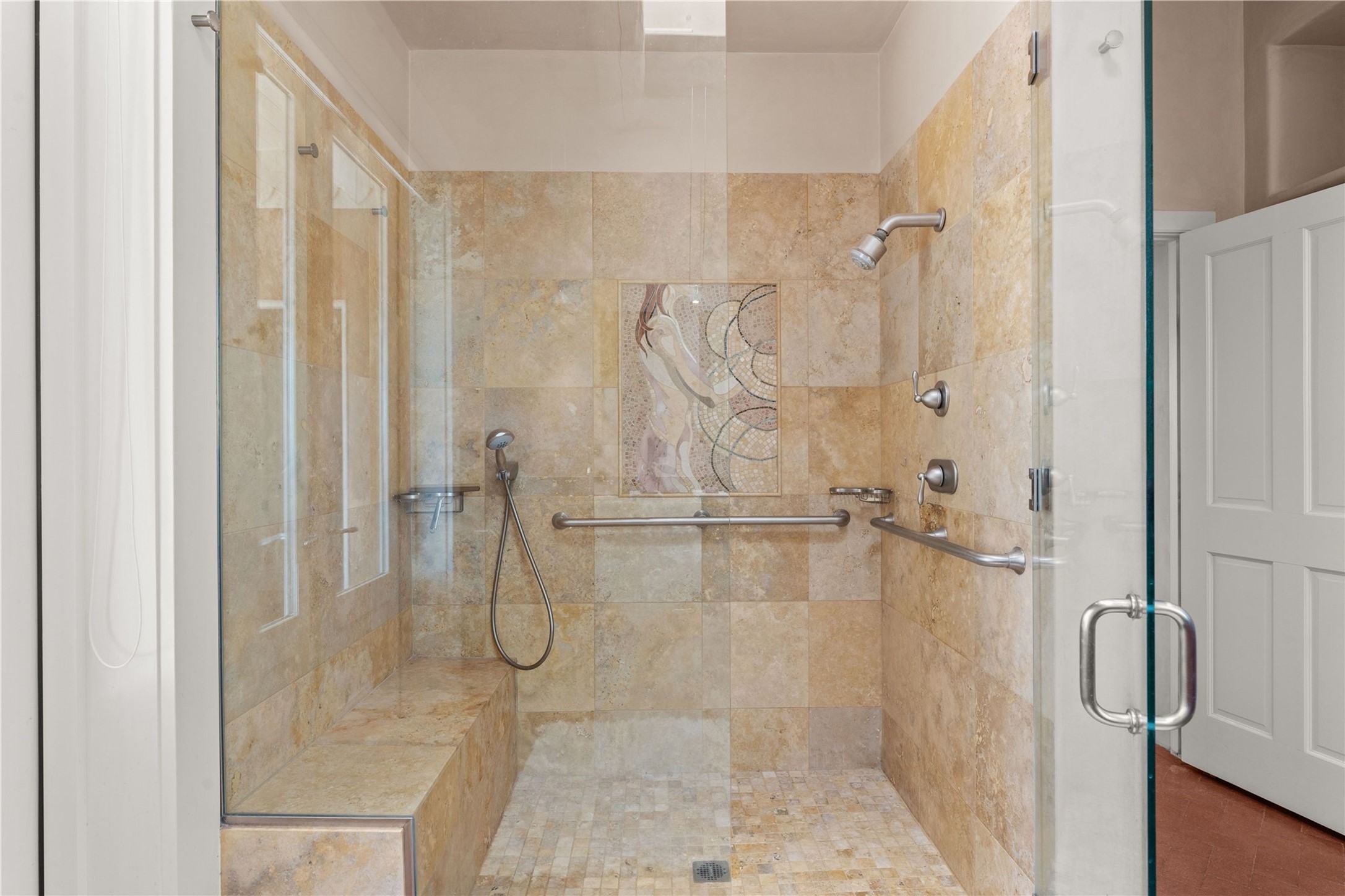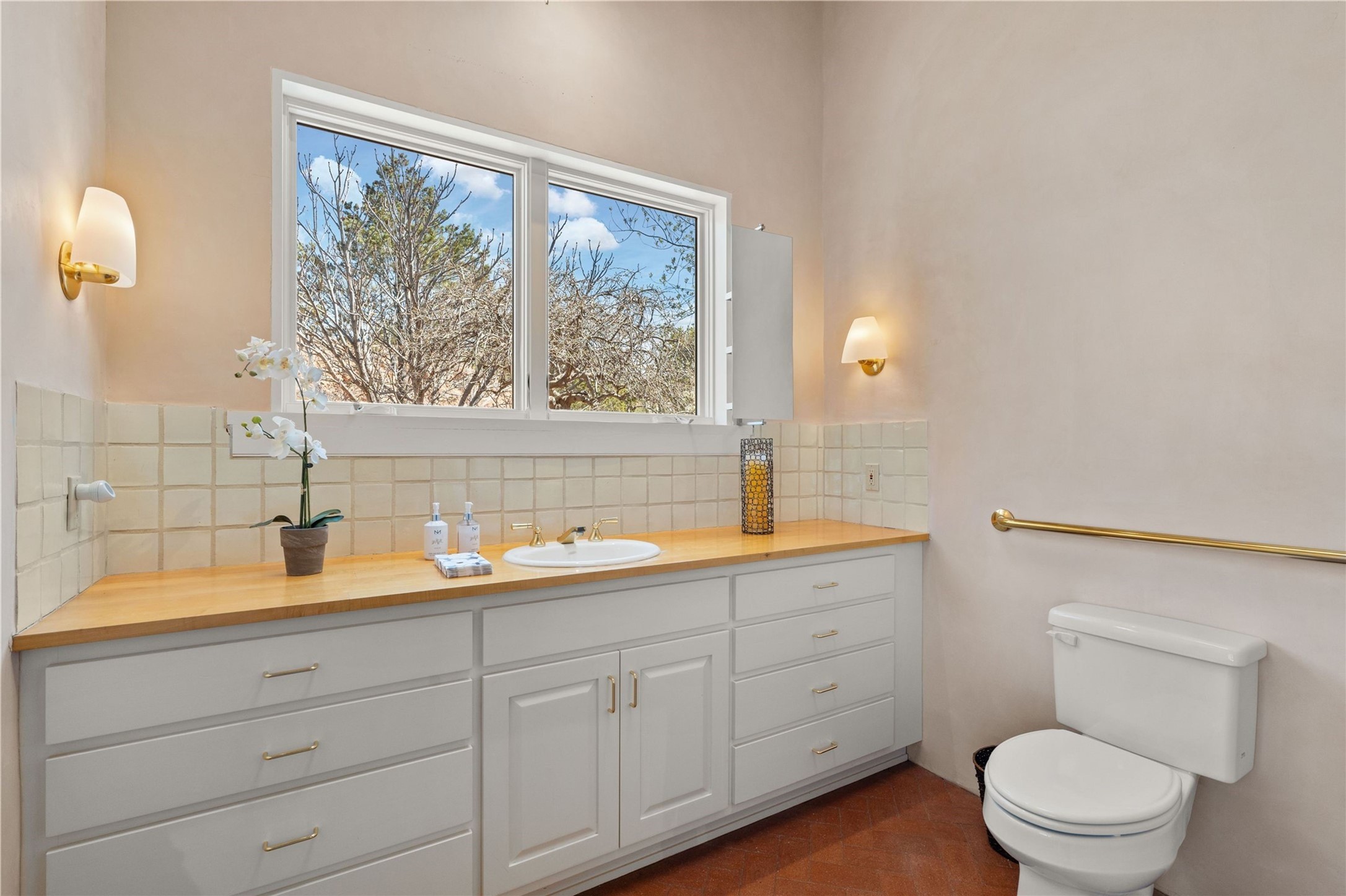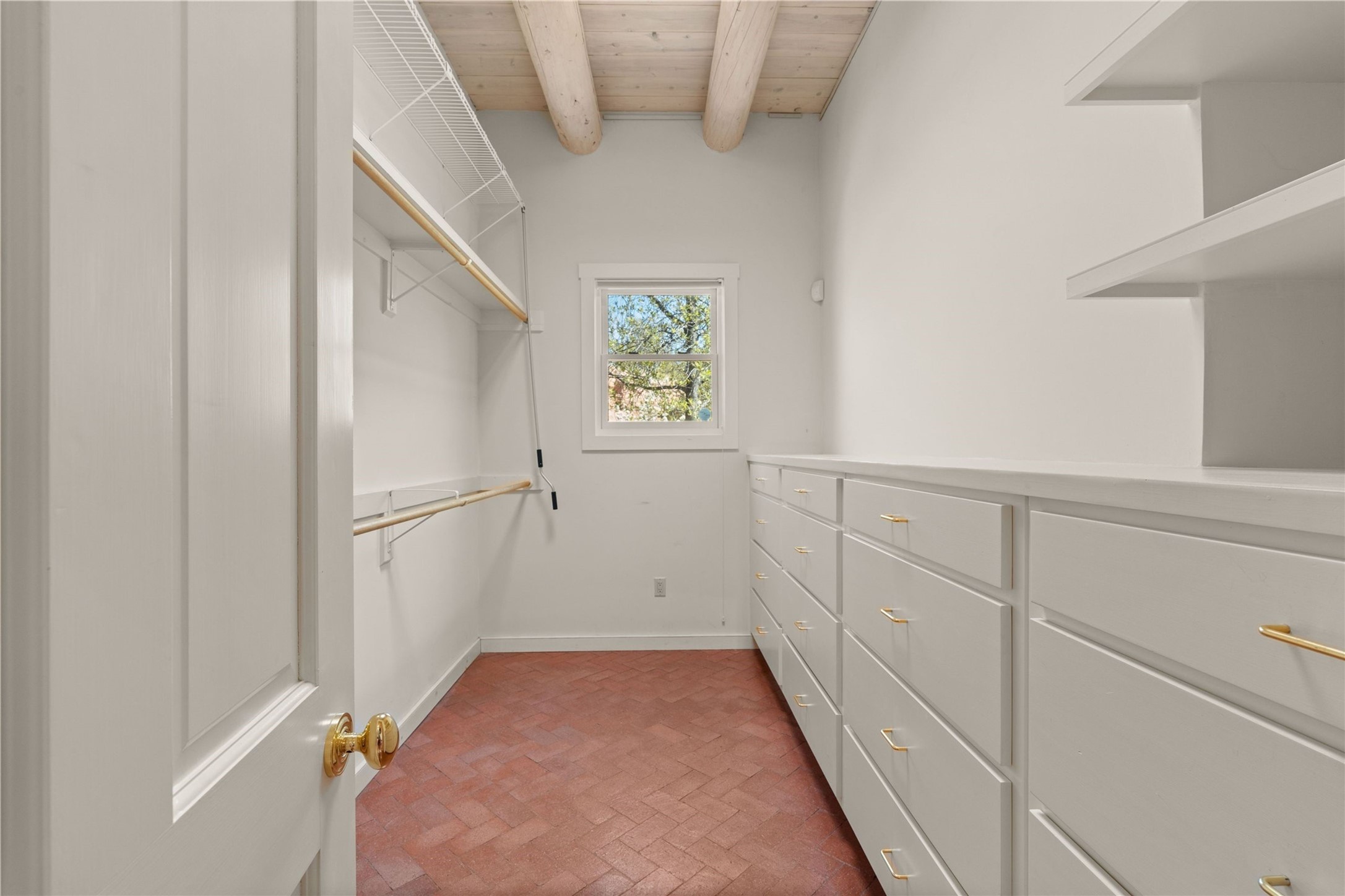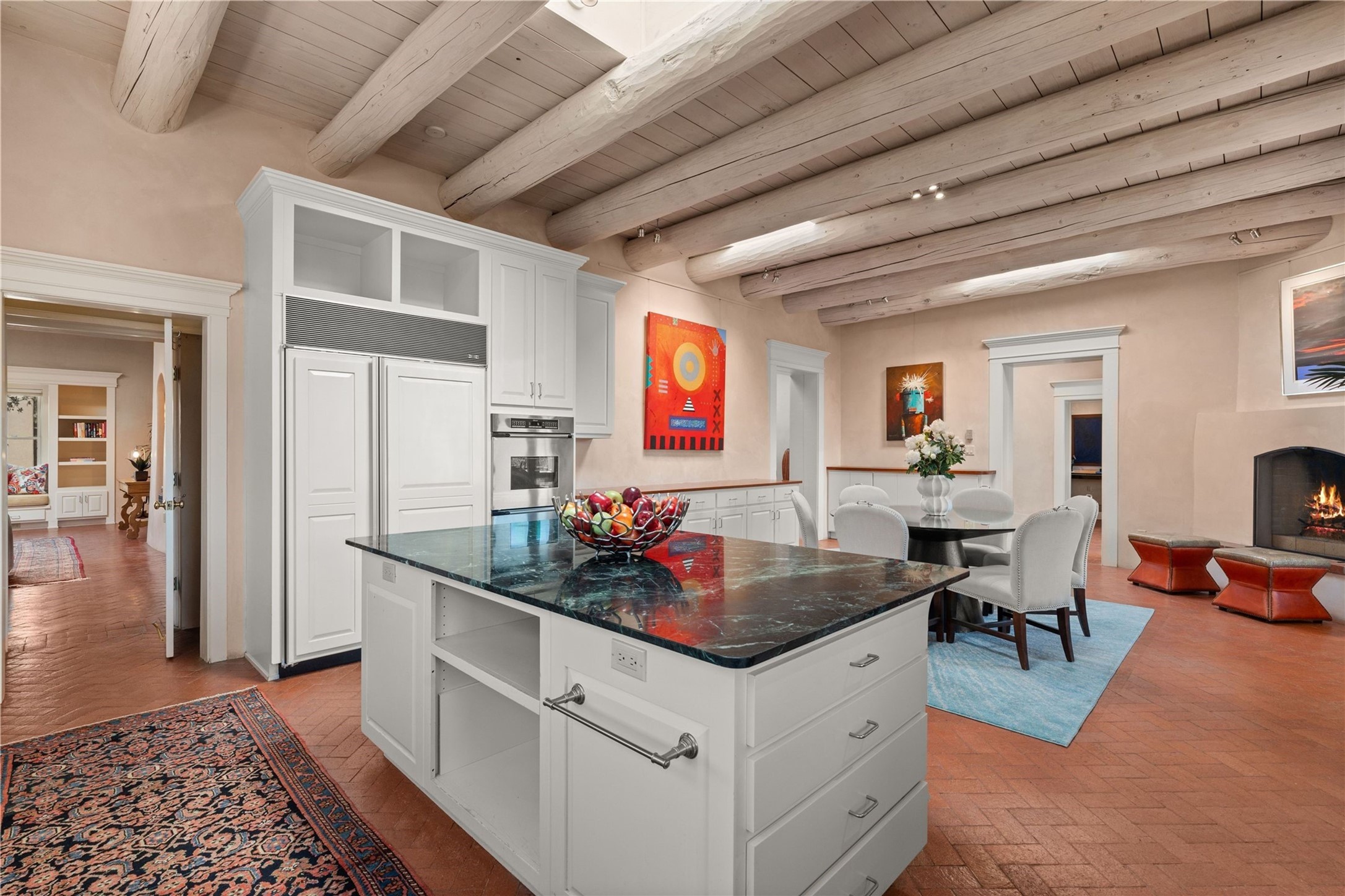 This unique and beautiful 3-bedroom, 3-bath modified Territorial-style, adobe home features unobstructed east-west mountain views and a tableau of breathtaking sunrises and sunsets. Designed by Doug Atwill, a Santa Fe builder/artist with exceptional vision, this home also features 13 ft. high beamed ceilings, 23 skylights, and radiant-heated brick floors complemented by 3 fireplaces. As you enter, a wide and gracious hallway welcomes and guides you to the back portal with stunning views of the eastern mountains. Situated to align with the summer solstice, this central hallway enjoys abundant light and provides a perfect place for displaying artwork. Public areas of the home, including elegant living room, library/media room, and spacious kitchen/dining room, are located on the south side of the hall while the private bedrooms are located on the north side. An outdoor grilling/barbecue station, hot tub, and multiple portals/patios, provide ample space for relaxation and entertaining. Gardeners and chefs alike will delight in the property's mature fruit trees and 2 waist-high irrigated planting beds. Oversized (built 2020) two-car detached garage features heating/cooling, floor-to-ceiling cabinets, art storage, EV charger, 220-volt RV charger and rooftop viewing/entertainment deck with panoramic mountain views. Environmentally conscious buyers will appreciate the green features including the solar photovoltaic electric system. Water monitoring and shut off system. Located less than one mile north of Fort Marcy and the historic Santa Fe Plaza.