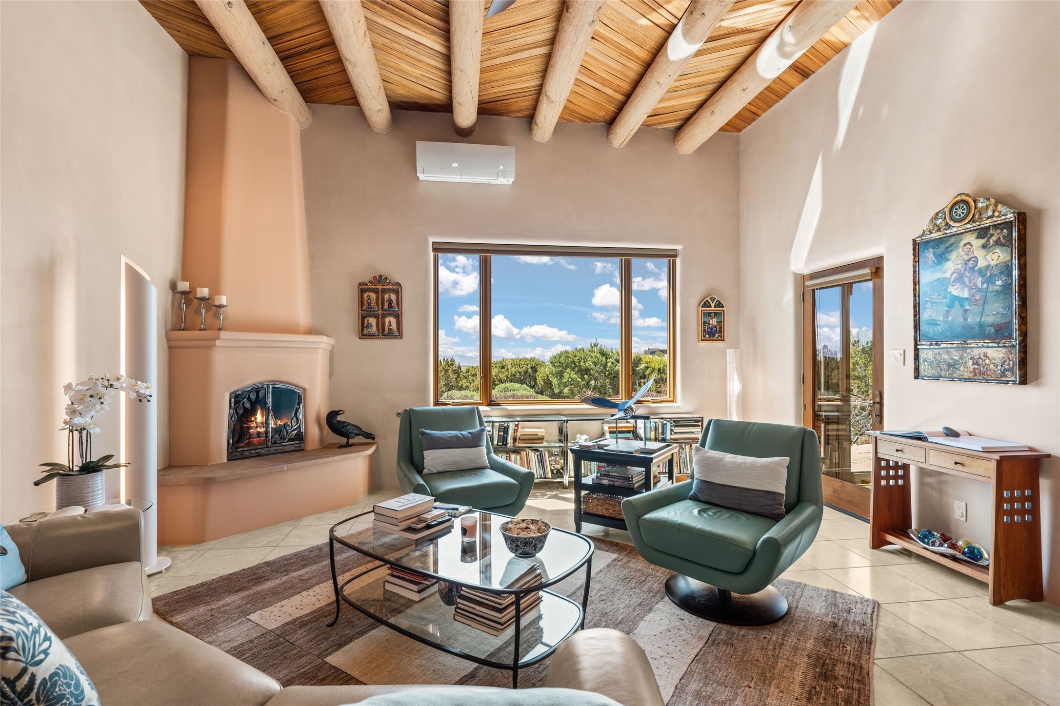 This stunning single-level home features four spacious bedrooms and two and a half baths, all designed without any interior steps for seamless accessibility. The home showcases elegant plastered walls and traditional vigas throughout, creating a warm and inviting atmosphere perfect for entertaining. A gated entry leads you to a welcoming courtyard, while the enclosed sunroom, complete with a wood-burning fireplace, offers a perfect space for relaxation. The gourmet kitchen is a chef's dream, featuring a center island, breakfast bar, Wolf range, and Miele dishwasher, all set on luxurious travertine floors that flow effortlessly throughout the home. The primary suite not only includes a deep jacuzzi tub and fireplace but also grants access to the sunroom, enhancing the living experience. Guests will appreciate the custom Murphy bed in one of the bedrooms, which can easily transform into an office or studio space as needed. Custom Santa Fe awning covers for the skylights modulate climate control during summer months. Enjoy breathtaking sunsets and picturesque views of the Jemez Mountains right from your backyard. Outdoor enthusiasts will appreciate the proximity to La Tierra's extensive walking and hiking trail systems, making it easy to explore the natural beauty of the area. Additionally, this prime location is just a quick drive away from the vibrant downtown plaza, the renowned Canyon Road, and the Santa Fe Opera.