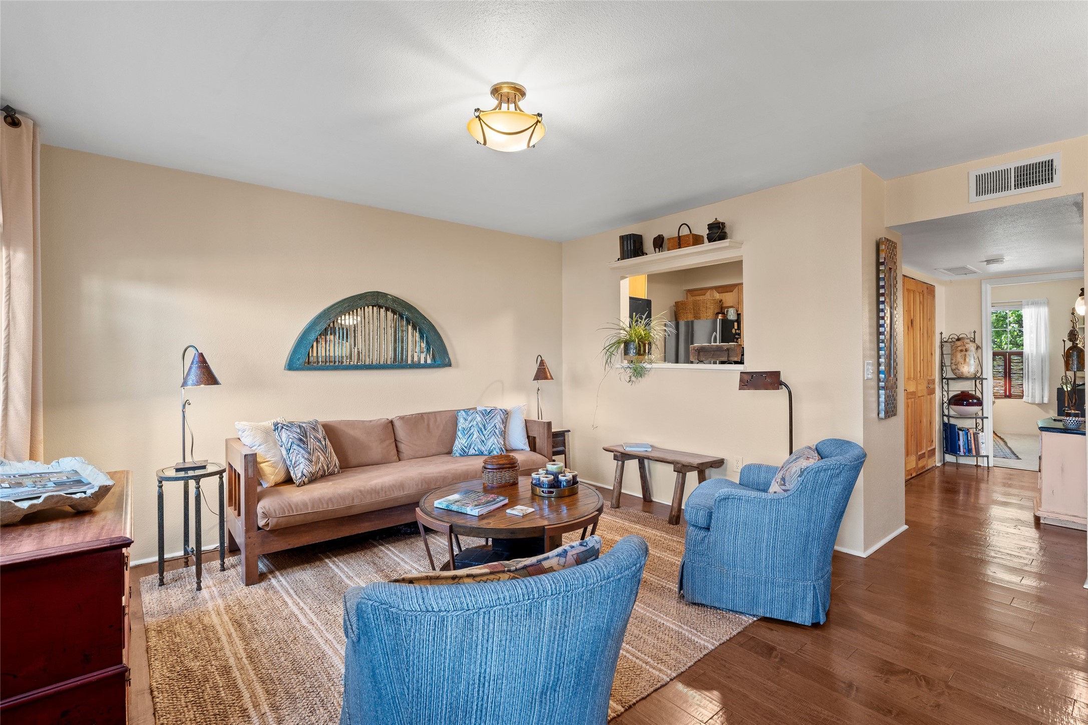 Prime location in Dos Santos. This single level condo on the first floor has a large, inviting front courtyard and opens out to a large common space ramada. This one bedroom, one bath condo with in-unit laundry has charming touches. This center unit is in close proximity to amenities including a seasonal swimming pool, hot tub, fitness area, outdoor grills and clubhouse. The complex also has security gates and a pet area. Convenient location near shopping, schools, medical facilities walking/biking trails.
