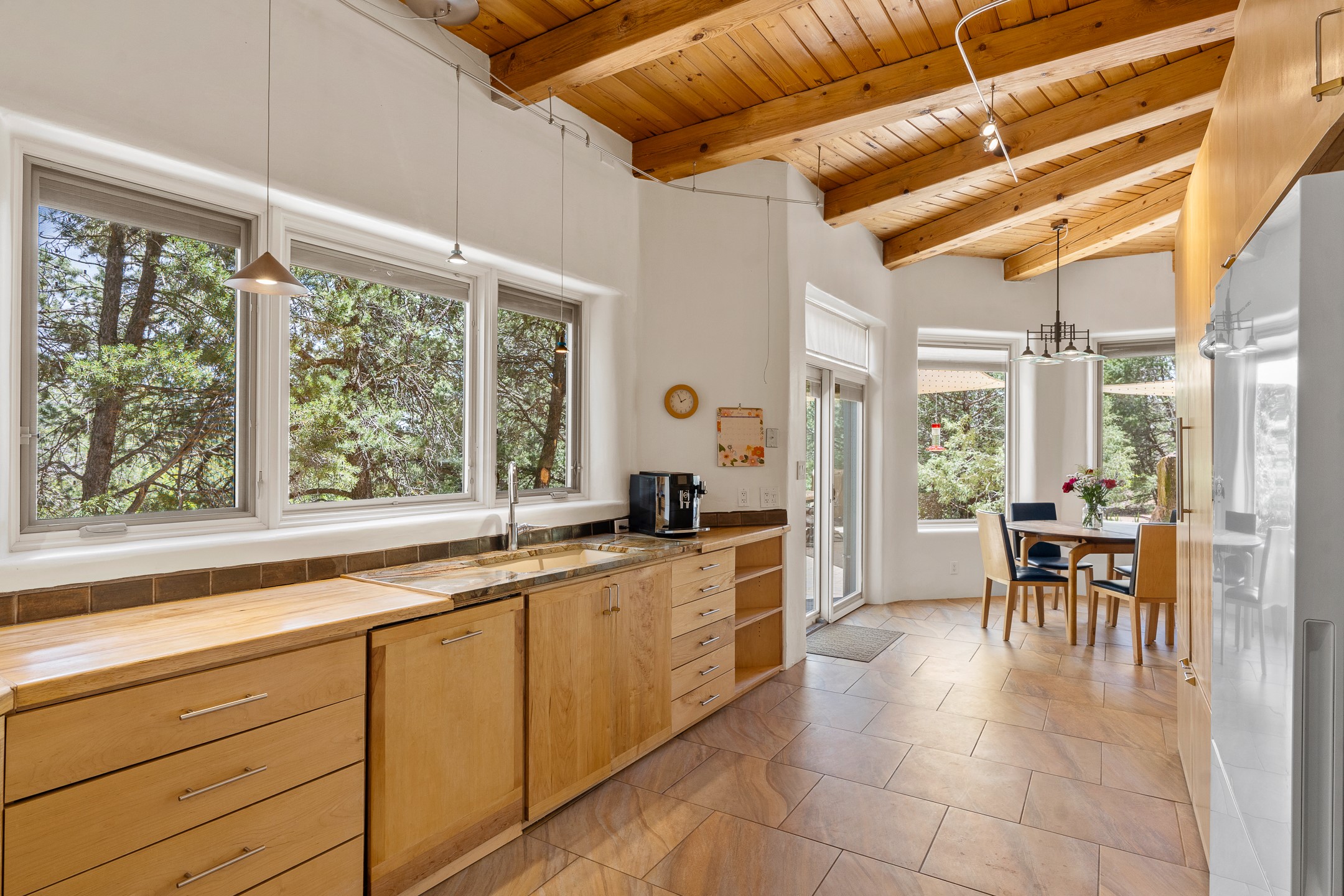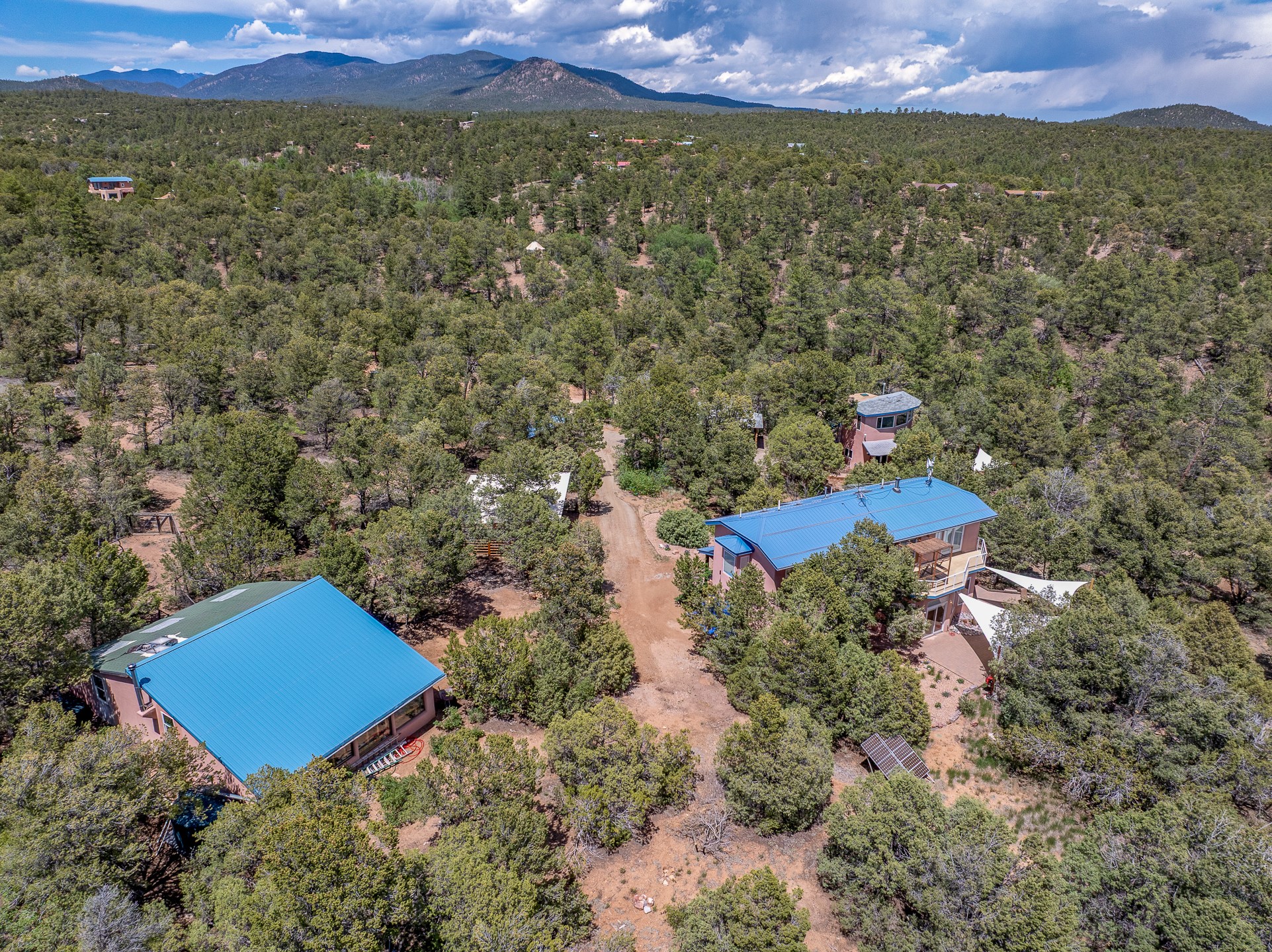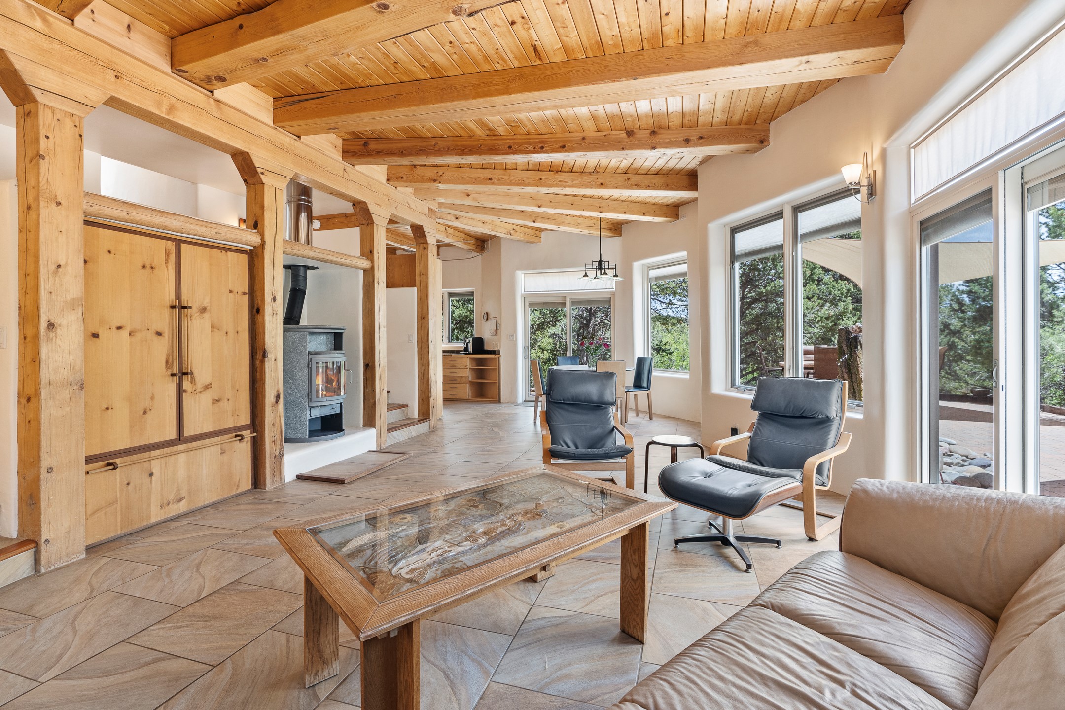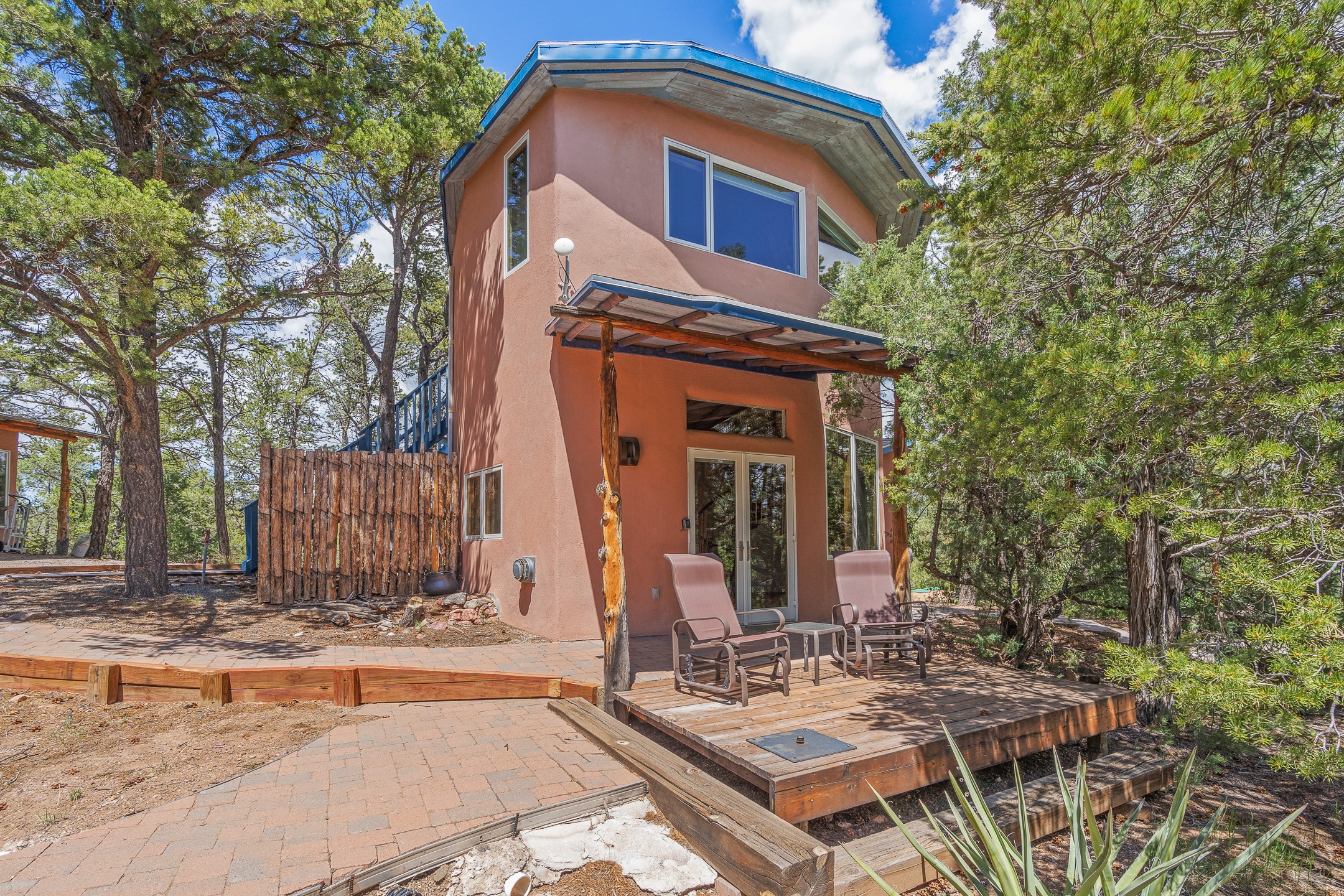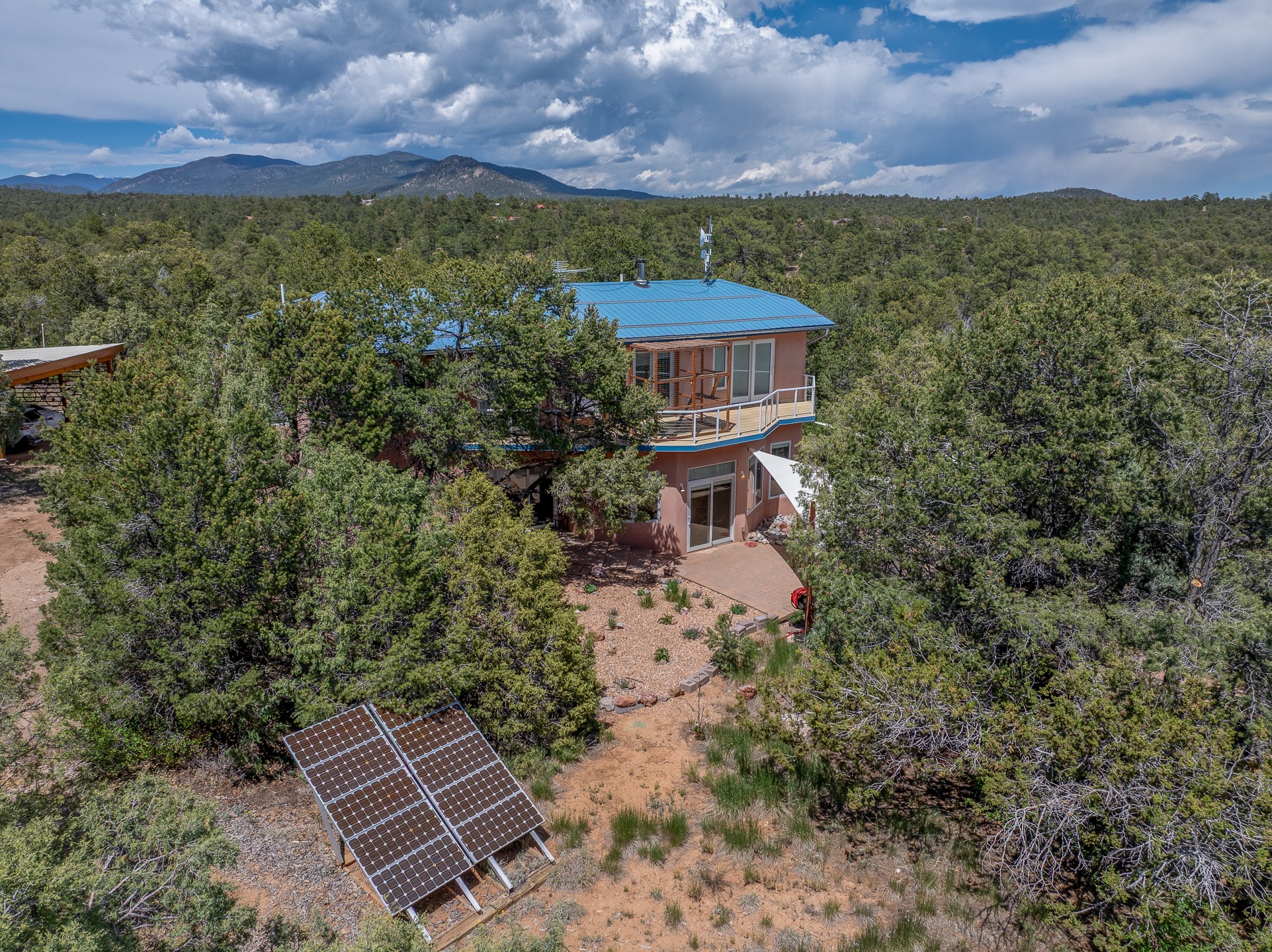 Located just over 20 minutes from downtown Santa Fe, this privately situated, passive solar contemporary home sits on 10.25 wooded acres, surrounded by mature Ponderosa and Pion pines. Designed for energy efficiency, this two-story residence offers both privacy and natural beauty, and regular sightings of native wildlife including birds, bobcats, and gray foxes. Originally built in 1998 and thoughtfully renovated and expanded in 2009, the main house features high-performance Designer Series Pella windows with triple pane, low-E glass and integrated blinds, along with durable hardwood and ceramic tile flooring. The open living and dining area is accented by viga ceilings and a Danish soapstone woodstove, which stores and radiates heat for efficient warmth. A custom-built media cabinet and wood storage add functional elegance. The modern kitchen is a chef's dream, outfitted with custom maple cabinetry, hickory and granite countertops, and premium appliances including a Wolf induction cooktop, Miele wall oven and dishwasher, and Fisher & Paykel refrigerator. A stylish powder room with custom cabinetry and an ensuite guest bedroom with sunroom complete the first floor. Upstairs, you'll find a versatile home office or media area between two spacious bedrooms, each with walk-in closets and private bathrooms featuring custom finishes. An upstairs laundry room with sink is conveniently located near the bedrooms. For added comfort, three Daikin mini-split systems provide efficient cooling in summer and supplemental heating in winter. Velux Integra roof windows, equipped with remote-controlled blinds and rain-sensor auto-close functionality, enhance ventilation and natural light. A secure Catio on the balcony provides a safe outdoor space for feline companions. Also included is a detached one bedroom and 3/4 bathroom, 900 sq ft guesthouse, ideal for guests or as a rental. This private unit offers full functionality while maintaining separation from the main home. Enjoy outdoor living on thoughtful patio spaces with sun sails and a fenced vegetable garden with raised boxes. Snow barriers, heavy-duty galvanized gutters and downspouts, and a two-car carport ensure protection from the elements year-round. The 1200 sf heated workshop on the property offers abundant space for your creative projects. Whether you're seeking a sustainable lifestyle, a quiet creative refuge, or a home with income potential, this unique Santa Fe property offers all that and more.