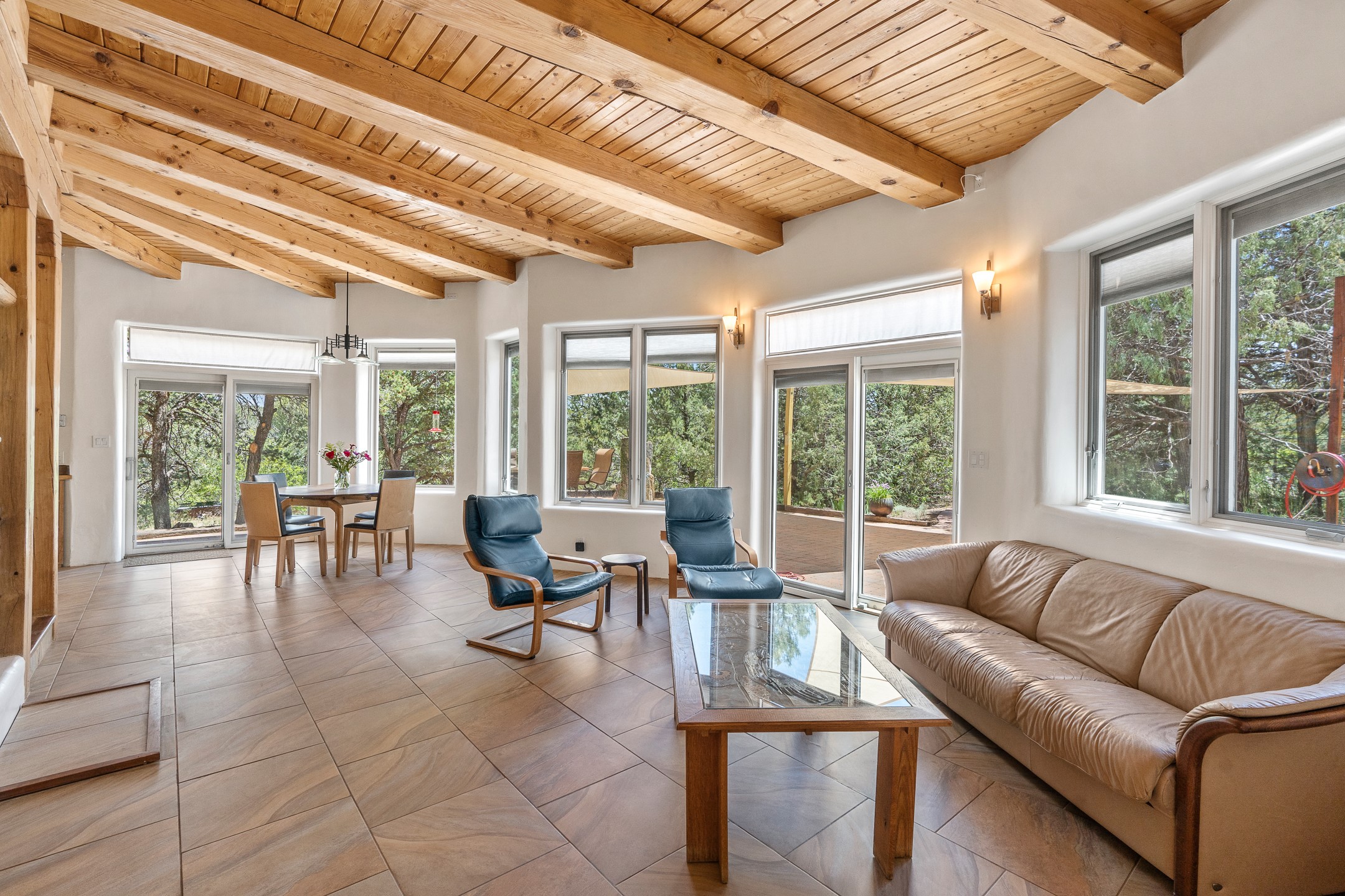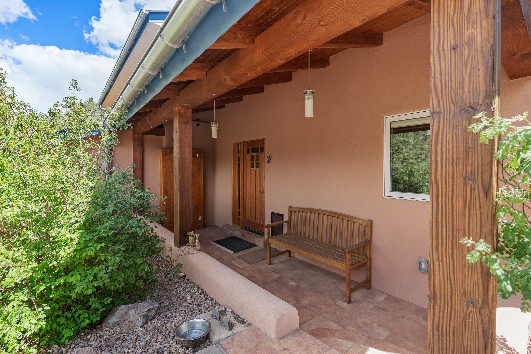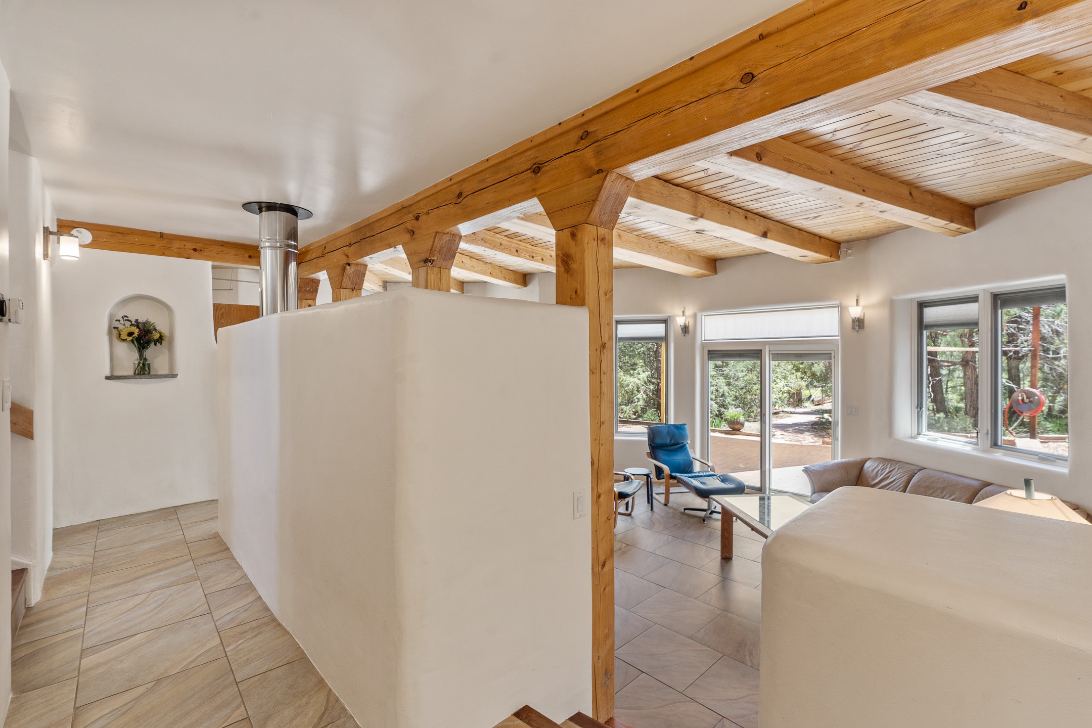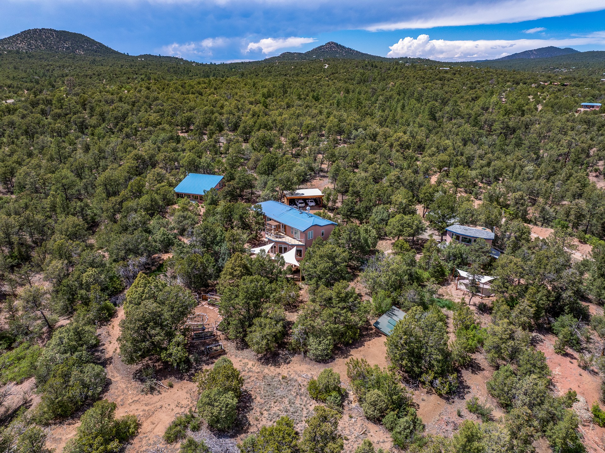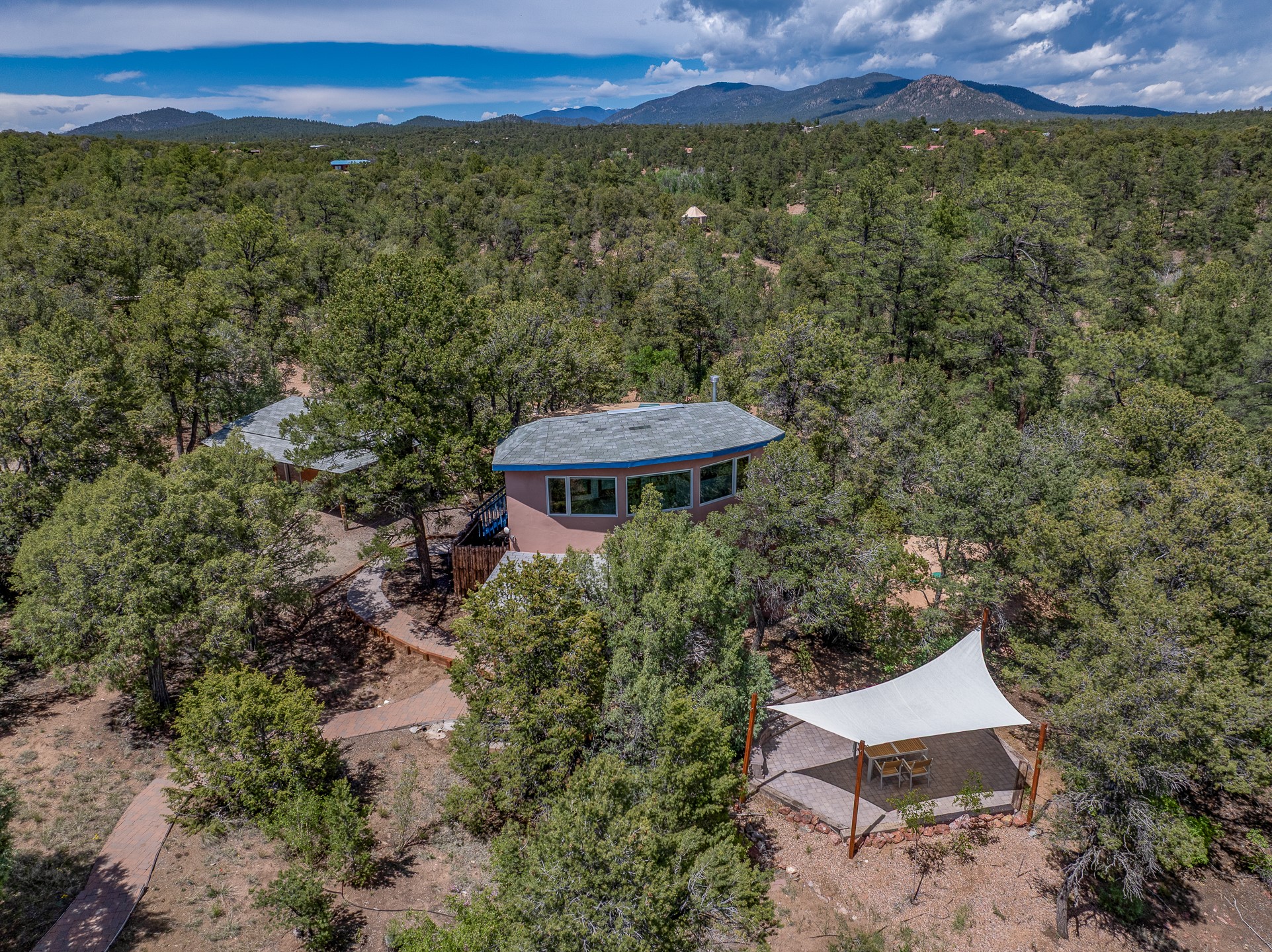 Located just over 20 minutes from downtown Santa Fe, this privately situated, passive solar contemporary home sits on 10.25 wooded acres, surrounded by mature Ponderosa and Pion pines. Designed for energy efficiency, this two-story residence offers both privacy and natural beauty, and regular sightings of native wildlife including birds, bobcats, and gray foxes. Originally built in 1998 and thoughtfully renovated and expanded in 2009, the main house features high-performance Designer Series Pella windows with triple pane, low-E glass and integrated blinds, along with durable hardwood and ceramic tile flooring. The open living and dining area is accented by viga ceilings and a Danish soapstone woodstove, which stores and radiates heat for efficient warmth. A custom-built media cabinet and wood storage add functional elegance. The modern kitchen is a chef's dream, outfitted with custom maple cabinetry, hickory and granite countertops, and premium appliances including a Wolf induction cooktop, Miele wall oven and dishwasher, and Fisher & Paykel refrigerator. A stylish powder room with custom cabinetry and an ensuite guest bedroom with sunroom complete the first floor. Upstairs, you'll find a versatile home office or media area between two spacious bedrooms, each with walk-in closets and private bathrooms featuring custom finishes. An upstairs laundry room with sink is conveniently located near the bedrooms. For added comfort, three Daikin mini-split systems provide efficient cooling in summer and supplemental heating in winter. Velux Integra roof windows, equipped with remote-controlled blinds and rain-sensor auto-close functionality, enhance ventilation and natural light. A secure Catio on the balcony provides a safe outdoor space for feline companions. Also included is a detached one bedroom and 3/4 bathroom, 900 sq ft guesthouse, ideal for guests or as a rental. This private unit offers full functionality while maintaining separation from the main home. Enjoy outdoor living on thoughtful patio spaces with sun sails and a fenced vegetable garden with raised boxes. Snow barriers, heavy-duty galvanized gutters and downspouts, and a two-car carport ensure protection from the elements year-round. The 1200 sf heated workshop on the property offers abundant space for your creative projects. Whether you're seeking a sustainable lifestyle, a quiet creative refuge, or a home with income potential, this unique Santa Fe property offers all that and more.