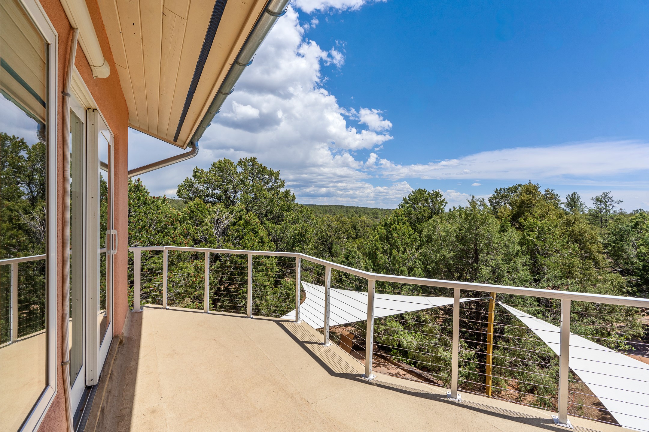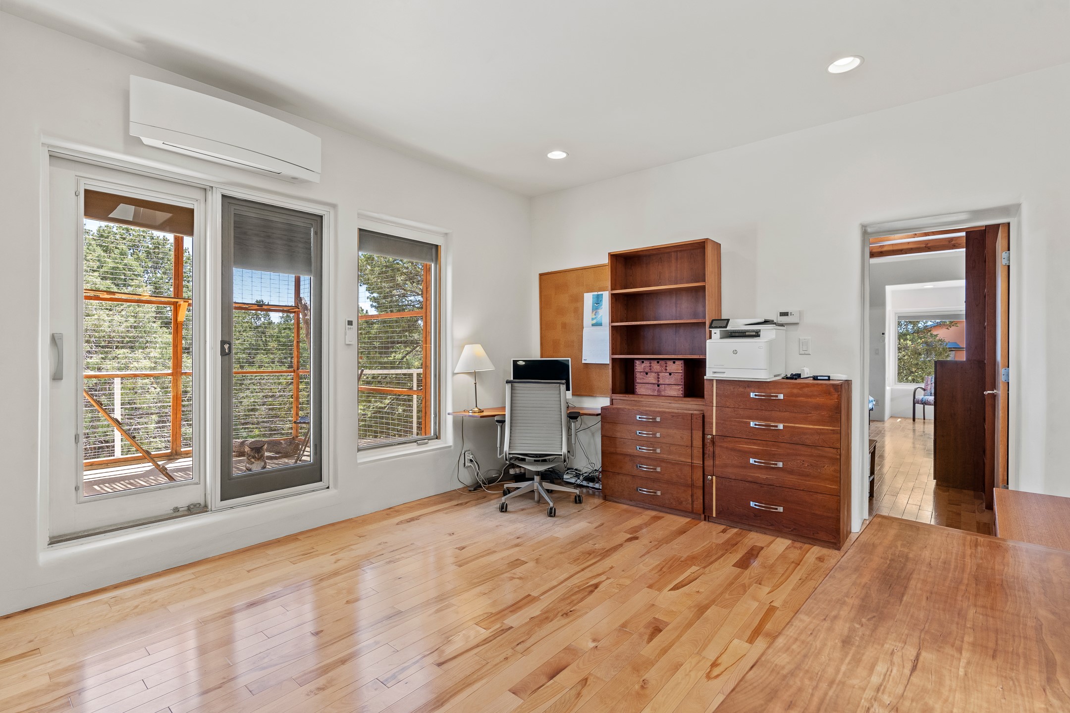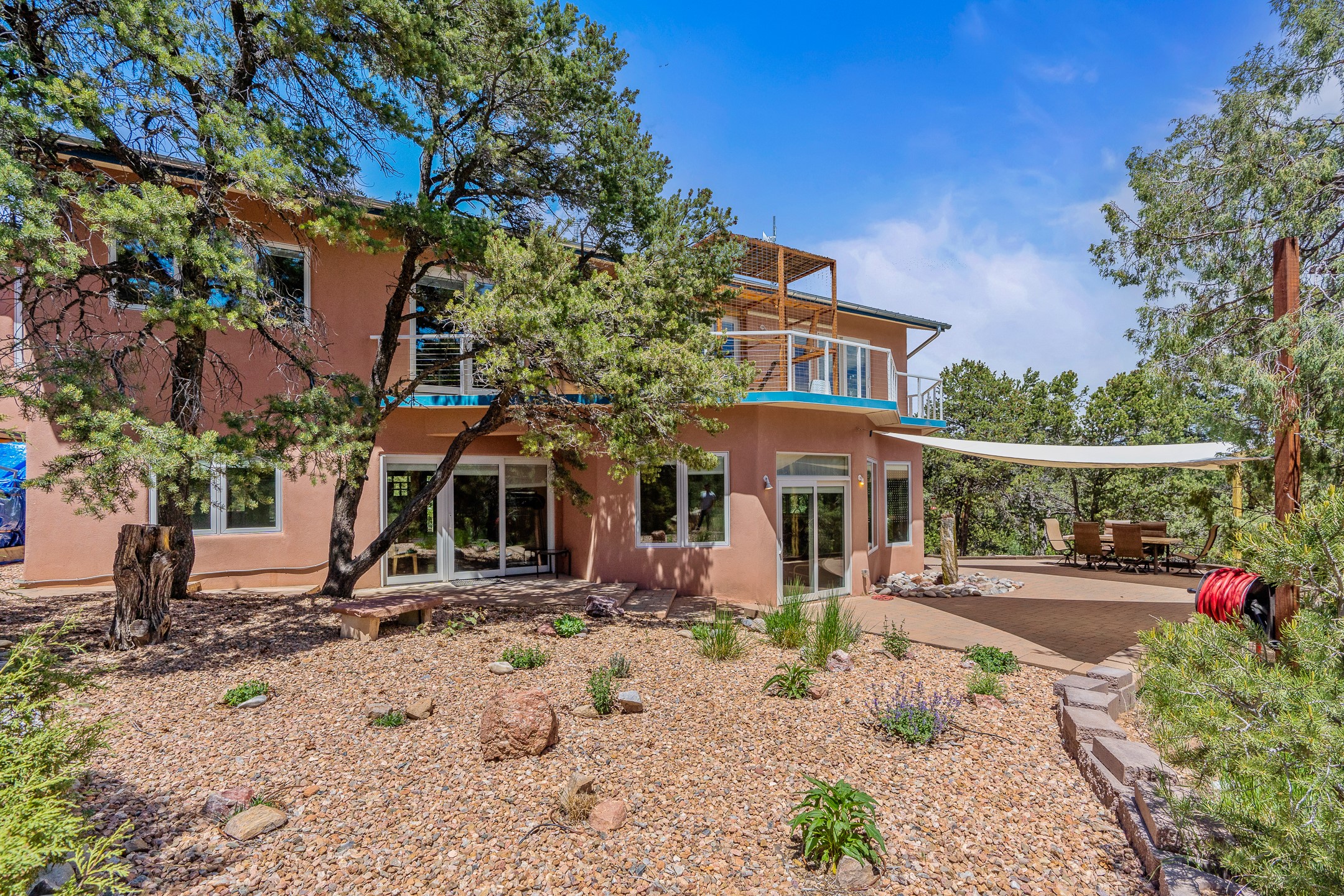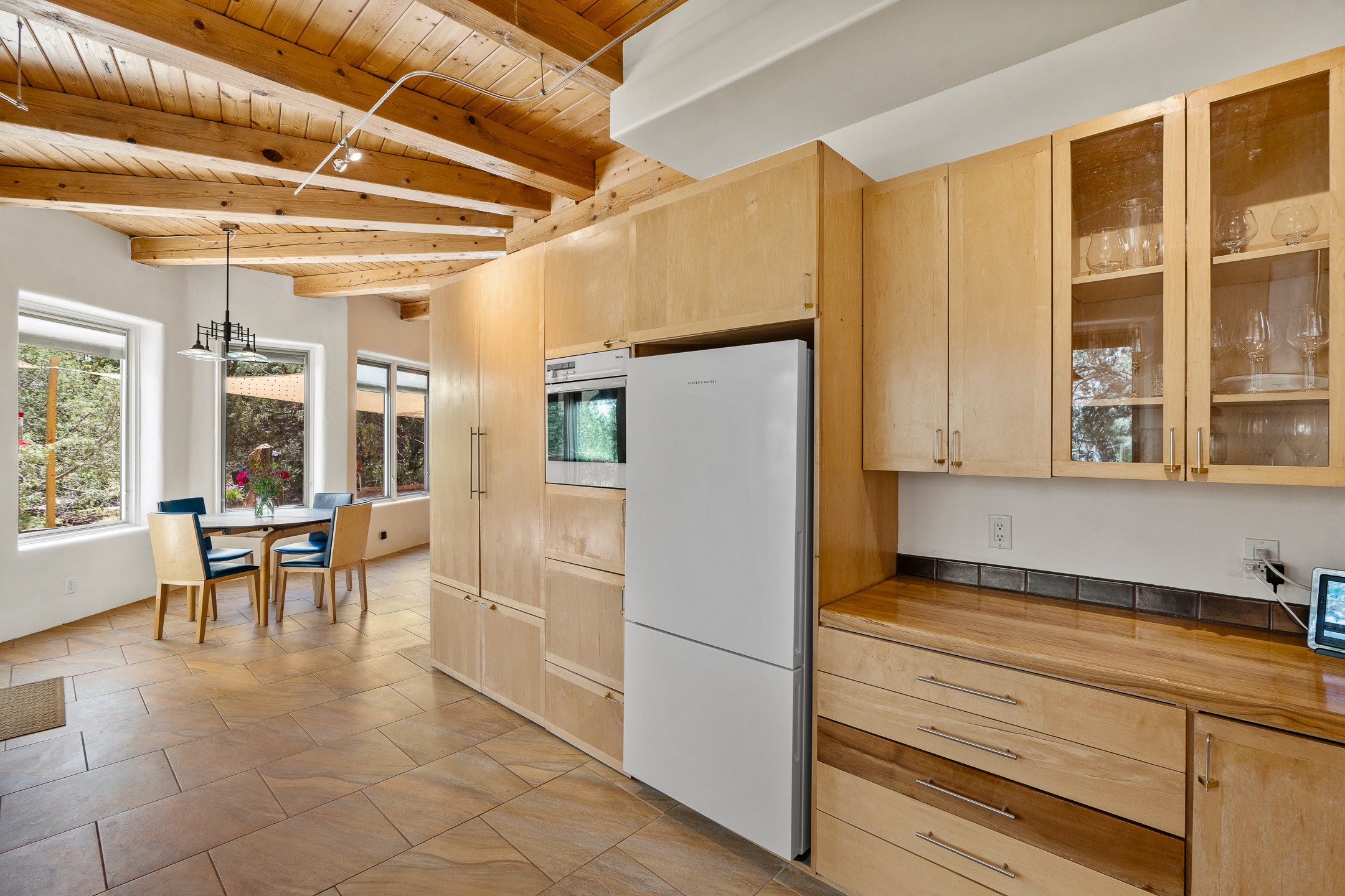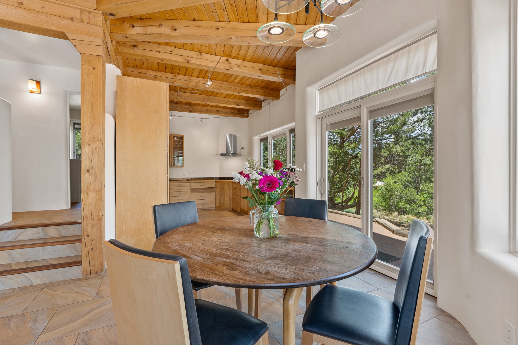 Located just over 20 minutes from downtown Santa Fe, this privately situated, passive solar contemporary home sits on 10.25 wooded acres, surrounded by mature Ponderosa and Pion pines. Designed for energy efficiency, this two-story residence offers both privacy and natural beauty, and regular sightings of native wildlife including birds, bobcats, and gray foxes. Originally built in 1998 and thoughtfully renovated and expanded in 2009, the main house features high-performance Designer Series Pella windows with triple pane, low-E glass and integrated blinds, along with durable hardwood and ceramic tile flooring. The open living and dining area is accented by viga ceilings and a Danish soapstone woodstove, which stores and radiates heat for efficient warmth. A custom-built media cabinet and wood storage add functional elegance. The modern kitchen is a chef's dream, outfitted with custom maple cabinetry, hickory and granite countertops, and premium appliances including a Wolf induction cooktop, Miele wall oven and dishwasher, and Fisher & Paykel refrigerator. A stylish powder room with custom cabinetry and an ensuite guest bedroom with sunroom complete the first floor. Upstairs, you'll find a versatile home office or media area between two spacious bedrooms, each with walk-in closets and private bathrooms featuring custom finishes. An upstairs laundry room with sink is conveniently located near the bedrooms. For added comfort, three Daikin mini-split systems provide efficient cooling in summer and supplemental heating in winter. Velux Integra roof windows, equipped with remote-controlled blinds and rain-sensor auto-close functionality, enhance ventilation and natural light. A secure Catio on the balcony provides a safe outdoor space for feline companions. Also included is a detached one bedroom and 3/4 bathroom, 900 sq ft guesthouse, ideal for guests or as a rental. This private unit offers full functionality while maintaining separation from the main home. Enjoy outdoor living on thoughtful patio spaces with sun sails and a fenced vegetable garden with raised boxes. Snow barriers, heavy-duty galvanized gutters and downspouts, and a two-car carport ensure protection from the elements year-round. The 1200 sf heated workshop on the property offers abundant space for your creative projects. Whether you're seeking a sustainable lifestyle, a quiet creative refuge, or a home with income potential, this unique Santa Fe property offers all that and more.