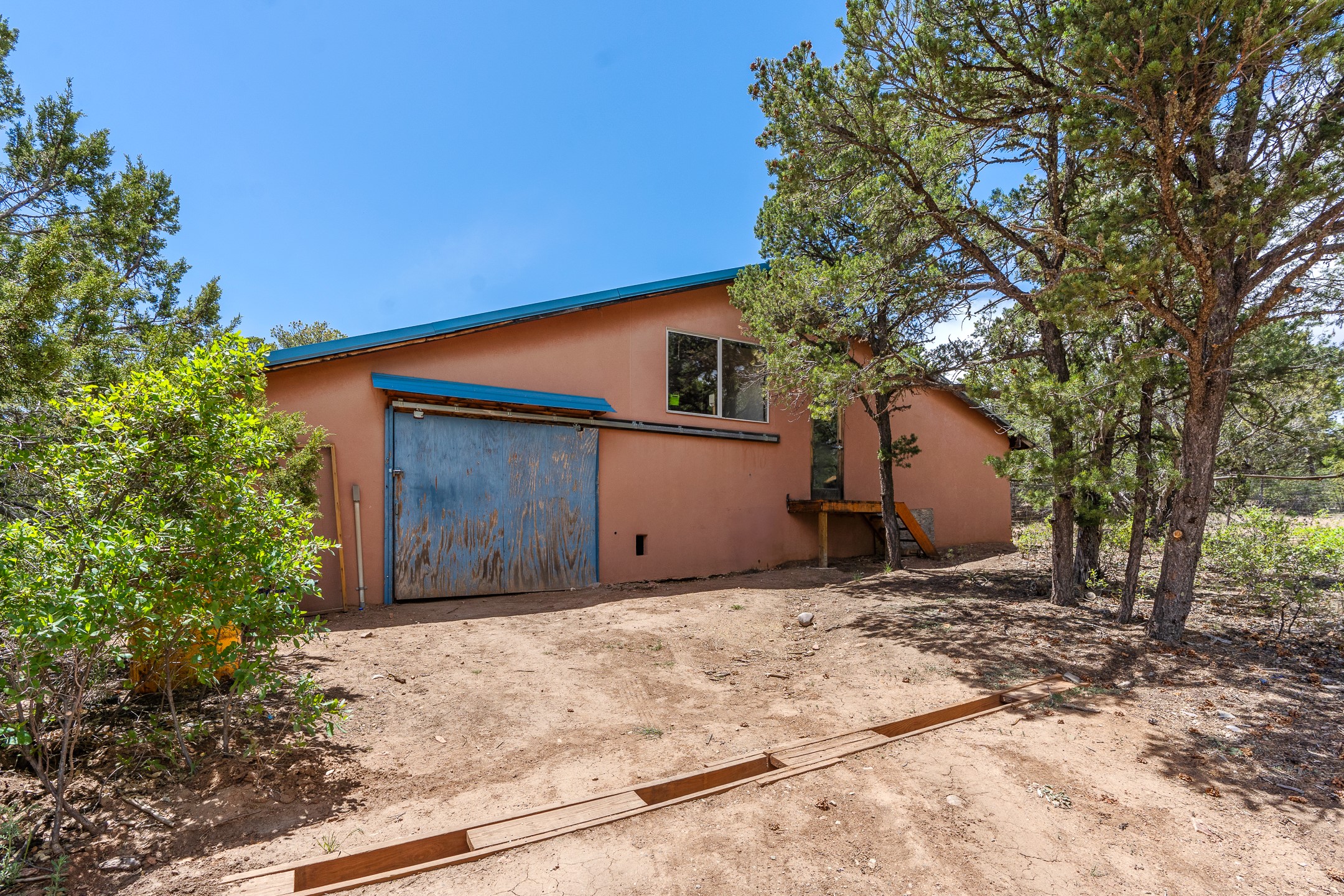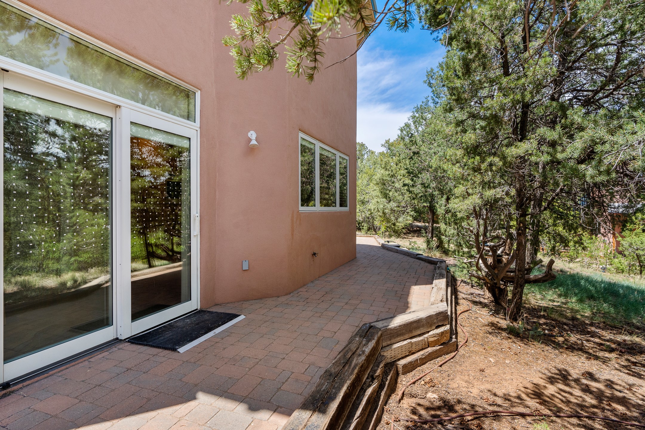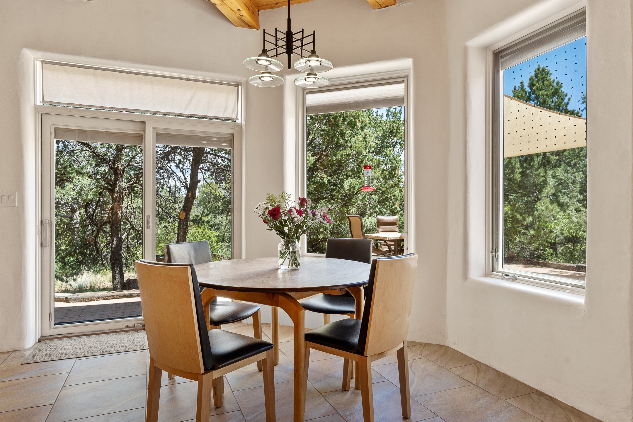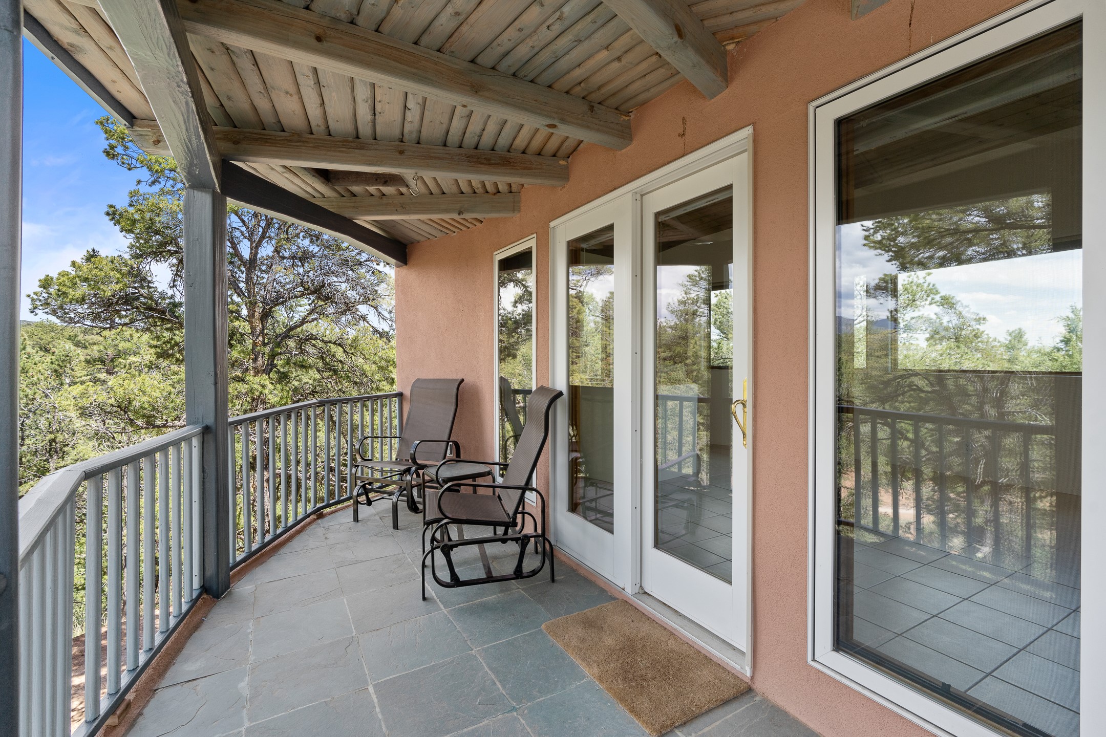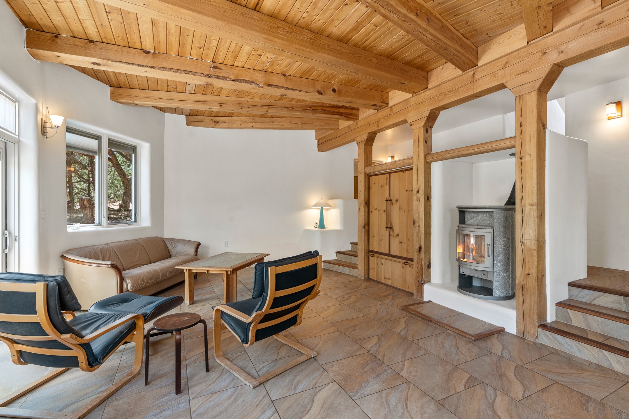 Located just over 20 minutes from downtown Santa Fe, this privately situated, passive solar contemporary home sits on 10.25 wooded acres, surrounded by mature Ponderosa and Pion pines. Designed for energy efficiency, this two-story residence offers both privacy and natural beauty, and regular sightings of native wildlife including birds, bobcats, and gray foxes. Originally built in 1998 and thoughtfully renovated and expanded in 2009, the main house features high-performance Designer Series Pella windows with triple pane, low-E glass and integrated blinds, along with durable hardwood and ceramic tile flooring. The open living and dining area is accented by viga ceilings and a Danish soapstone woodstove, which stores and radiates heat for efficient warmth. A custom-built media cabinet and wood storage add functional elegance. The modern kitchen is a chef's dream, outfitted with custom maple cabinetry, hickory and granite countertops, and premium appliances including a Wolf induction cooktop, Miele wall oven and dishwasher, and Fisher & Paykel refrigerator. A stylish powder room with custom cabinetry and an ensuite guest bedroom with sunroom complete the first floor. Upstairs, you'll find a versatile home office or media area between two spacious bedrooms, each with walk-in closets and private bathrooms featuring custom finishes. An upstairs laundry room with sink is conveniently located near the bedrooms. For added comfort, three Daikin mini-split systems provide efficient cooling in summer and supplemental heating in winter. Velux Integra roof windows, equipped with remote-controlled blinds and rain-sensor auto-close functionality, enhance ventilation and natural light. A secure Catio on the balcony provides a safe outdoor space for feline companions. Also included is a detached one bedroom and 3/4 bathroom, 900 sq ft guesthouse, ideal for guests or as a rental. This private unit offers full functionality while maintaining separation from the main home. Enjoy outdoor living on thoughtful patio spaces with sun sails and a fenced vegetable garden with raised boxes. Snow barriers, heavy-duty galvanized gutters and downspouts, and a two-car carport ensure protection from the elements year-round. The 1200 sf heated workshop on the property offers abundant space for your creative projects. Whether you're seeking a sustainable lifestyle, a quiet creative refuge, or a home with income potential, this unique Santa Fe property offers all that and more.
