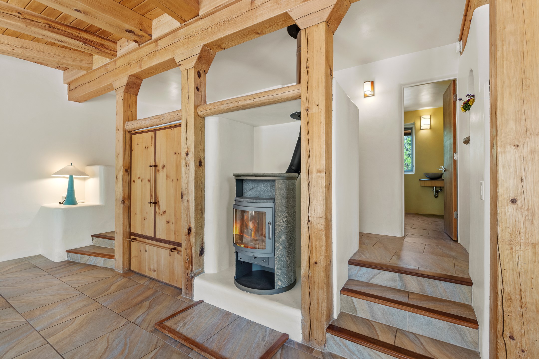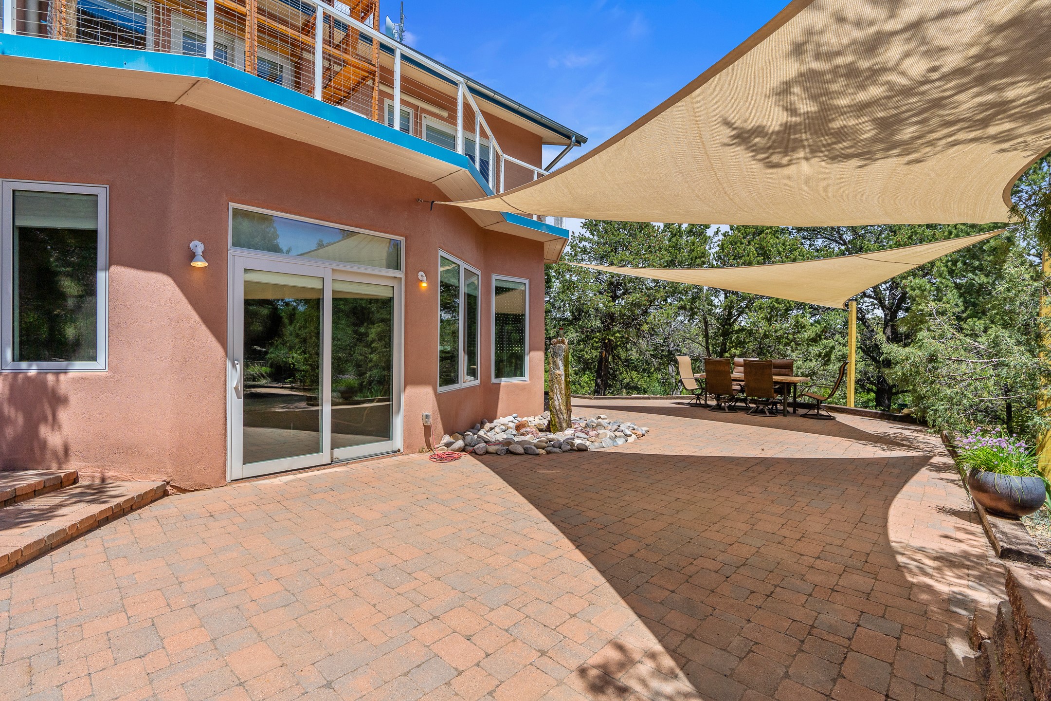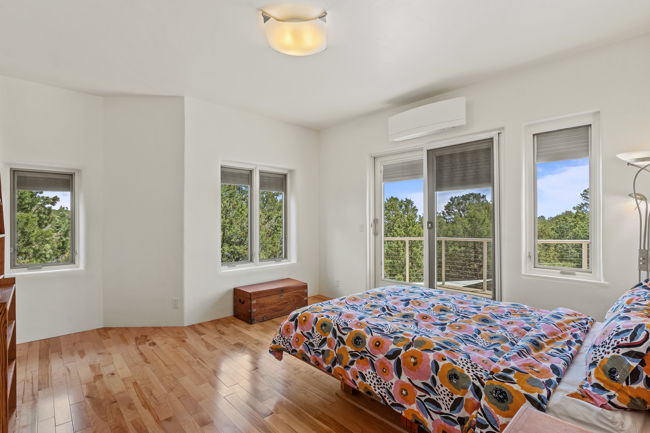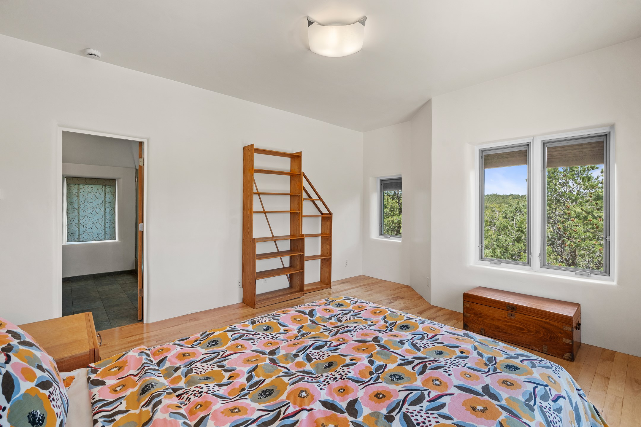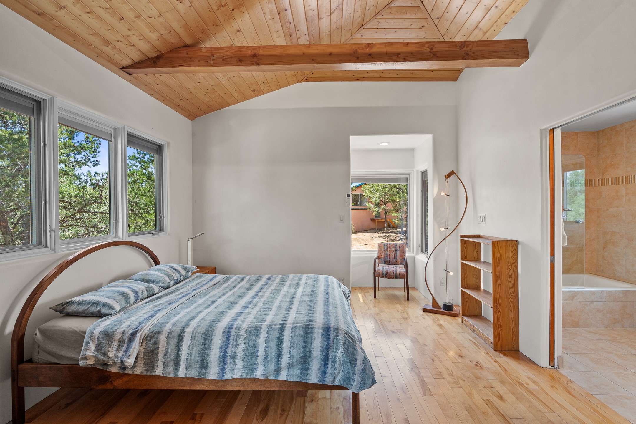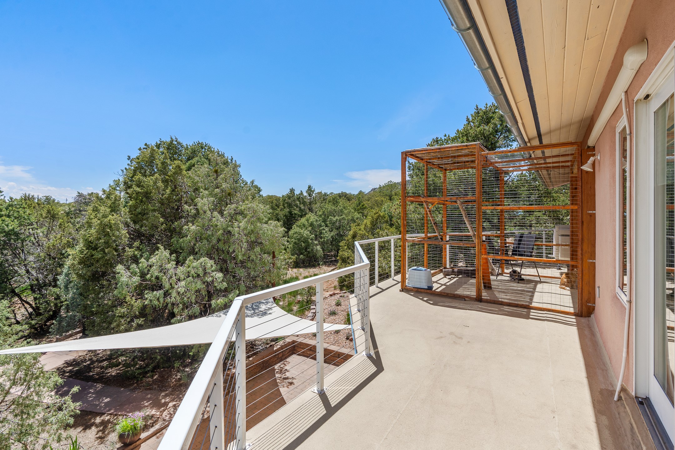 Located just over 20 minutes from downtown Santa Fe, this privately situated, passive solar contemporary home sits on 10.25 wooded acres, surrounded by mature Ponderosa and Pion pines. Designed for energy efficiency, this two-story residence offers both privacy and natural beauty, and regular sightings of native wildlife including birds, bobcats, and gray foxes. Originally built in 1998 and thoughtfully renovated and expanded in 2009, the main house features high-performance Designer Series Pella windows with triple pane, low-E glass and integrated blinds, along with durable hardwood and ceramic tile flooring. The open living and dining area is accented by viga ceilings and a Danish soapstone woodstove, which stores and radiates heat for efficient warmth. A custom-built media cabinet and wood storage add functional elegance. The modern kitchen is a chef's dream, outfitted with custom maple cabinetry, hickory and granite countertops, and premium appliances including a Wolf induction cooktop, Miele wall oven and dishwasher, and Fisher & Paykel refrigerator. A stylish powder room with custom cabinetry and an ensuite guest bedroom with sunroom complete the first floor. Upstairs, you'll find a versatile home office or media area between two spacious bedrooms, each with walk-in closets and private bathrooms featuring custom finishes. An upstairs laundry room with sink is conveniently located near the bedrooms. For added comfort, three Daikin mini-split systems provide efficient cooling in summer and supplemental heating in winter. Velux Integra roof windows, equipped with remote-controlled blinds and rain-sensor auto-close functionality, enhance ventilation and natural light. A secure Catio on the balcony provides a safe outdoor space for feline companions. Also included is a detached one bedroom and 3/4 bathroom, 900 sq ft guesthouse, ideal for guests or as a rental. This private unit offers full functionality while maintaining separation from the main home. Enjoy outdoor living on thoughtful patio spaces with sun sails and a fenced vegetable garden with raised boxes. Snow barriers, heavy-duty galvanized gutters and downspouts, and a two-car carport ensure protection from the elements year-round. The 1200 sf heated workshop on the property offers abundant space for your creative projects. Whether you're seeking a sustainable lifestyle, a quiet creative refuge, or a home with income potential, this unique Santa Fe property offers all that and more.