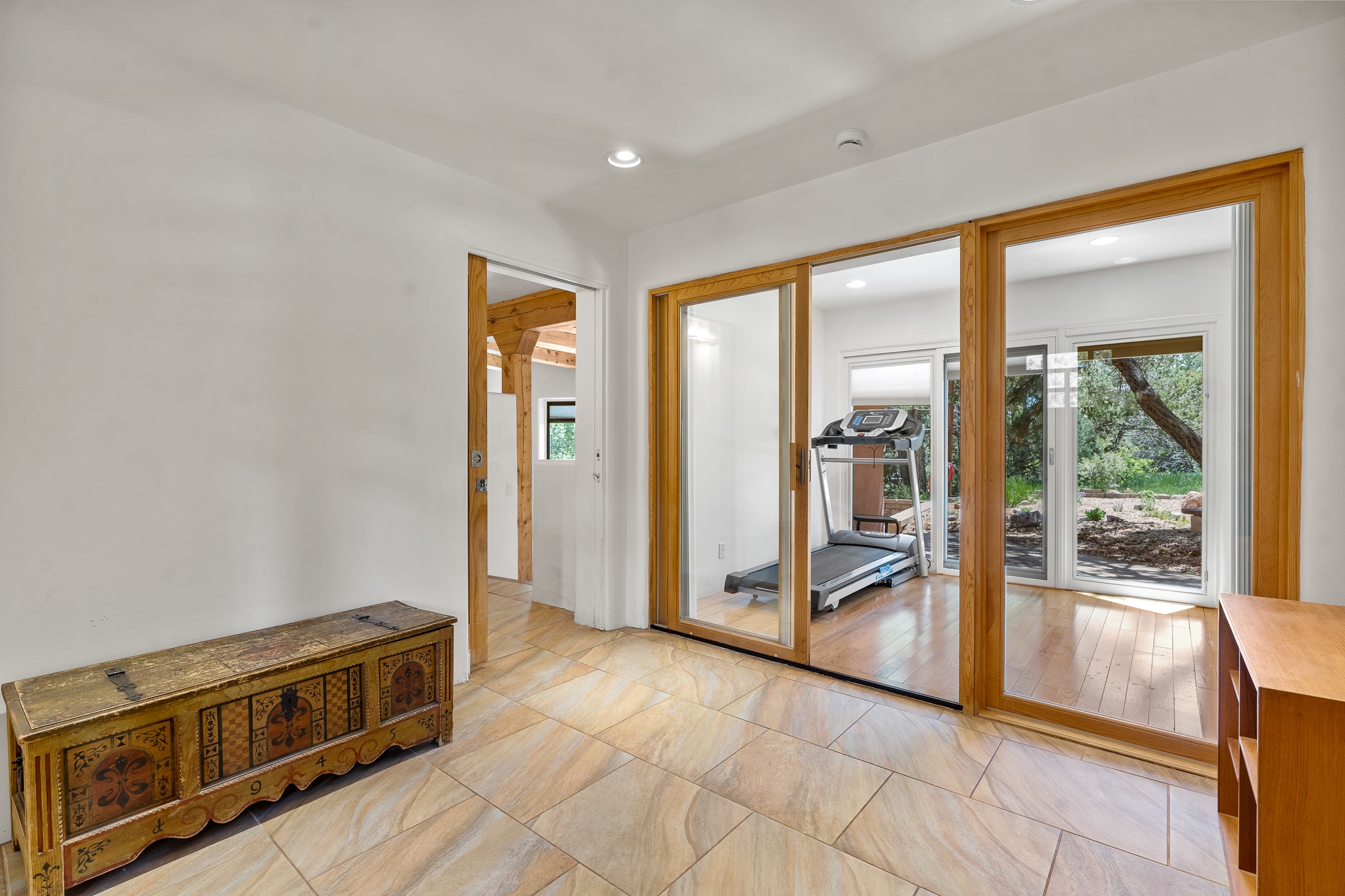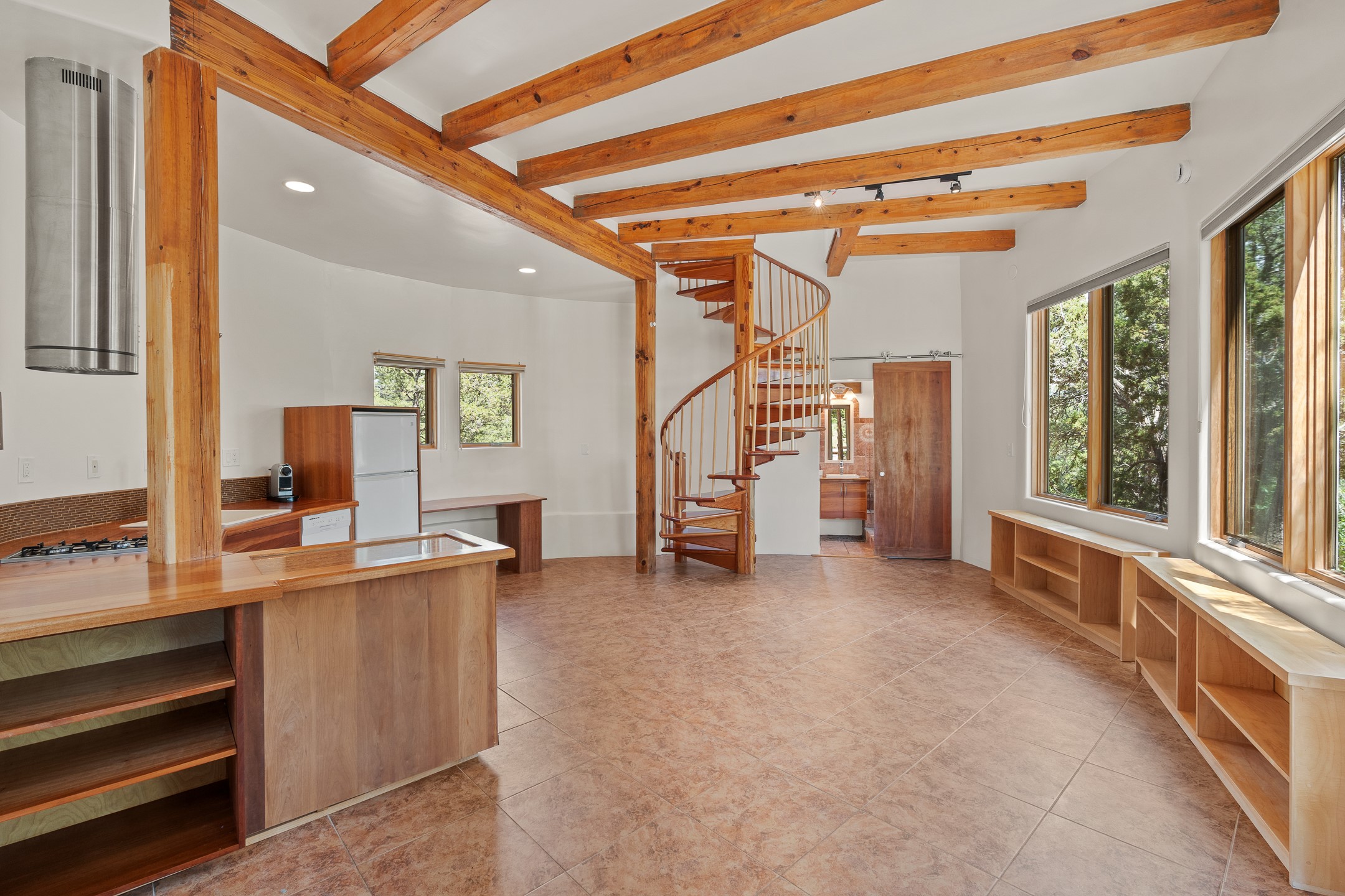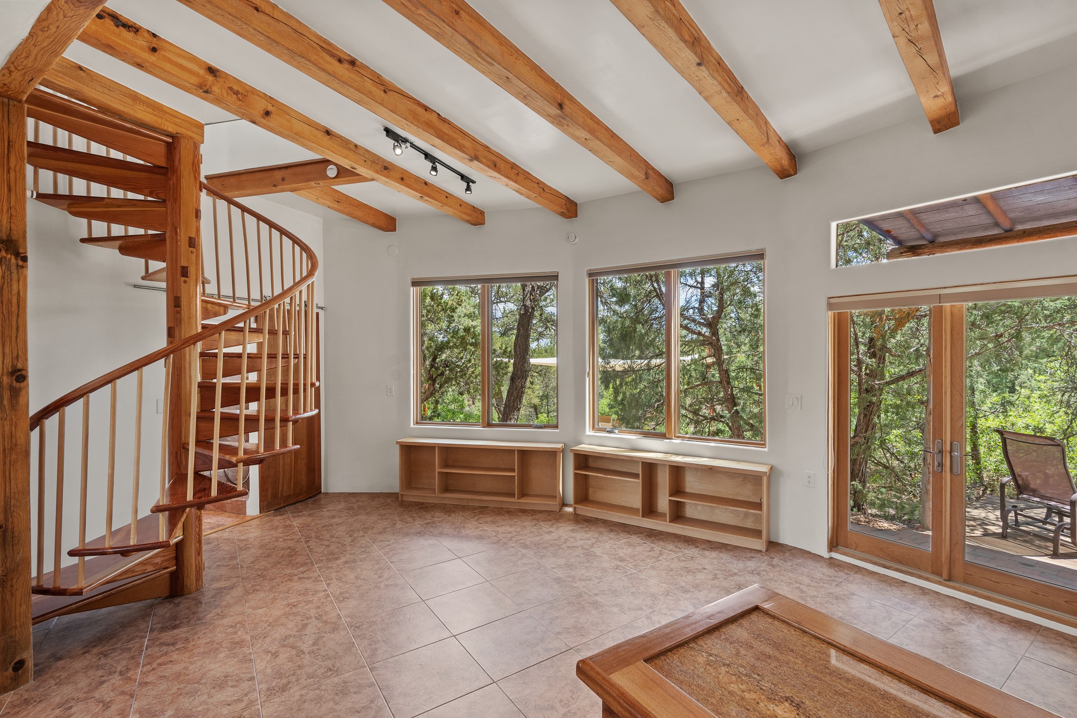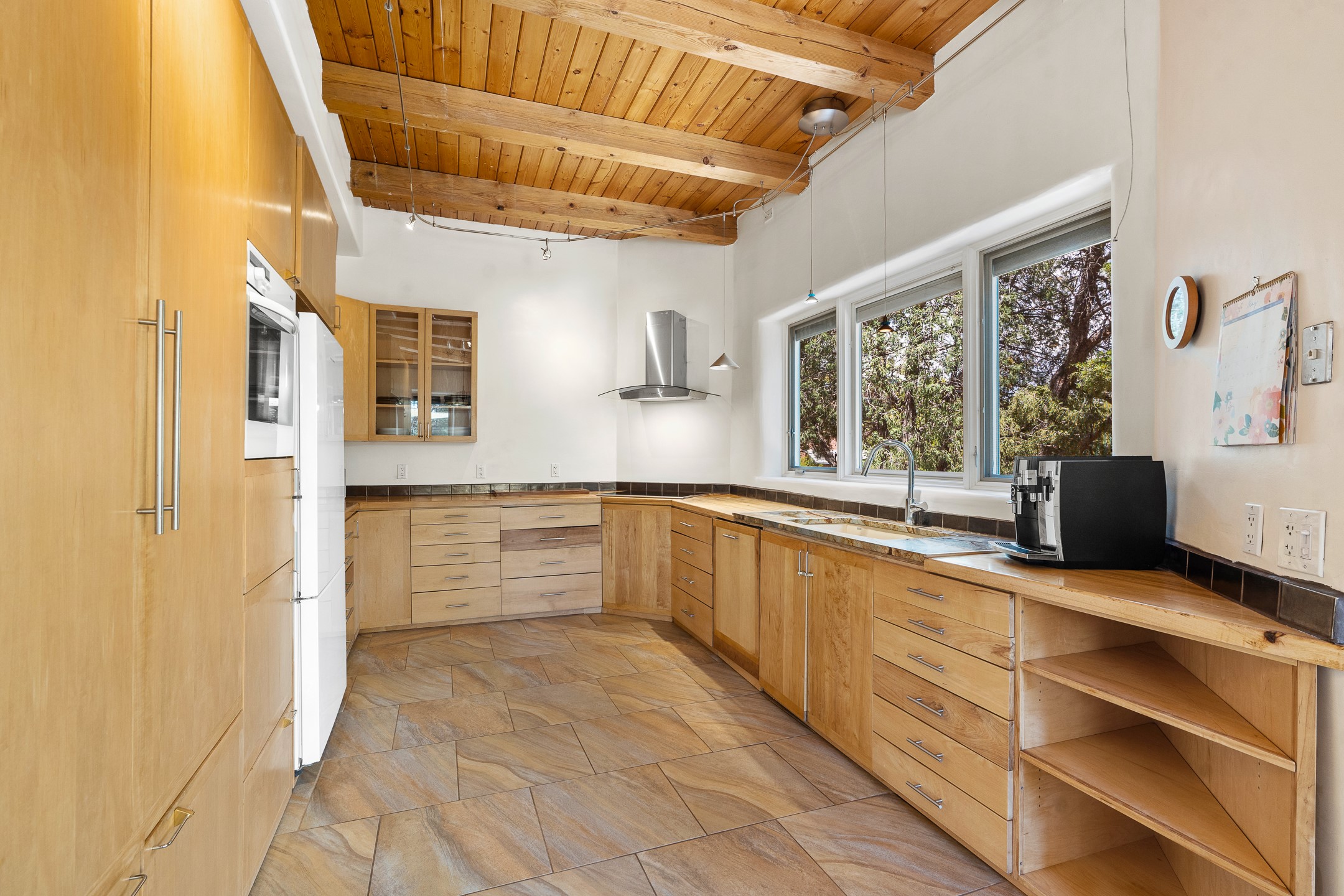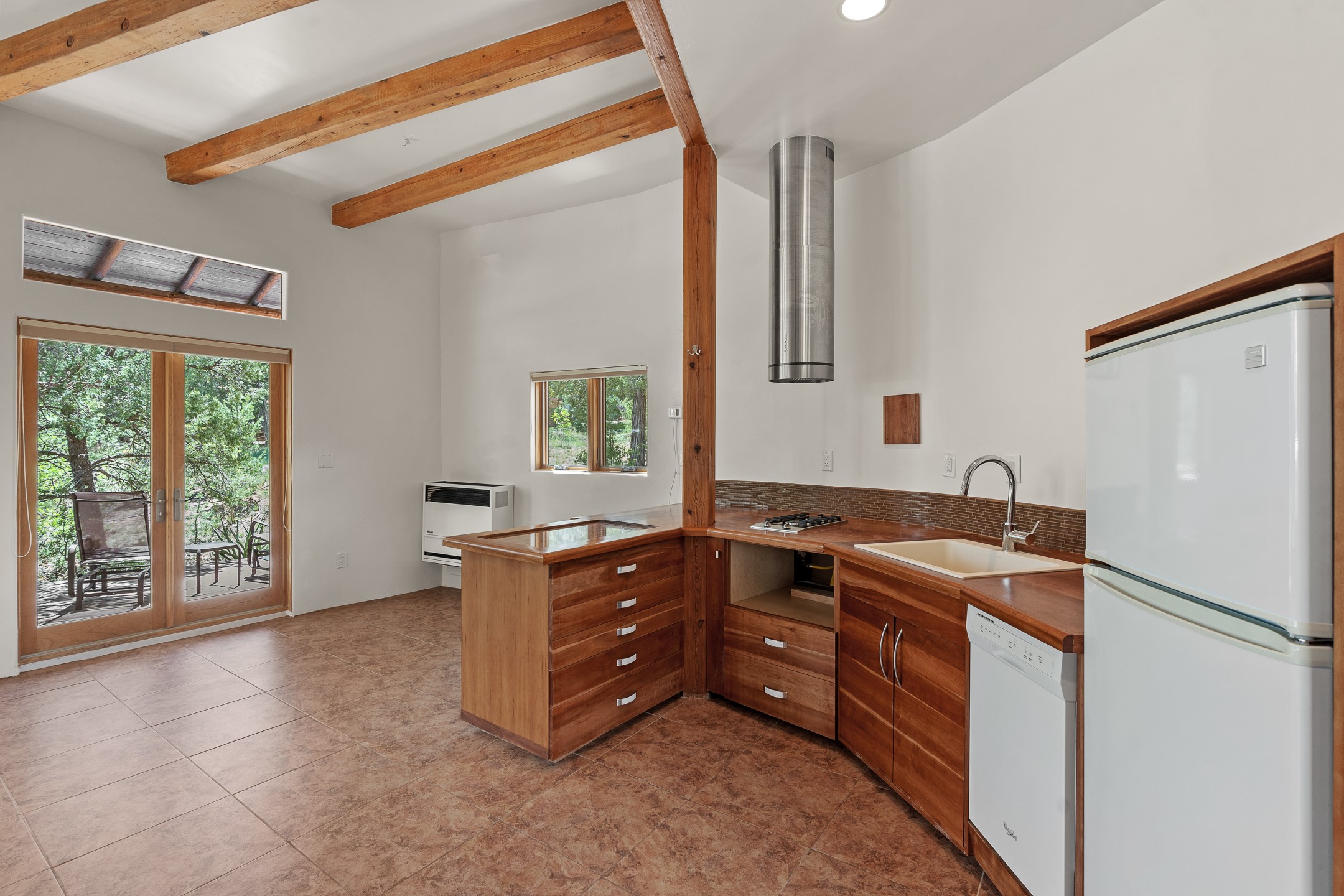 Located just over 20 minutes from downtown Santa Fe, this privately situated, passive solar contemporary home sits on 10.25 wooded acres, surrounded by mature Ponderosa and Pion pines. Designed for energy efficiency, this two-story residence offers both privacy and natural beauty, and regular sightings of native wildlife including birds, bobcats, and gray foxes. Originally built in 1998 and thoughtfully renovated and expanded in 2009, the main house features high-performance Designer Series Pella windows with triple pane, low-E glass and integrated blinds, along with durable hardwood and ceramic tile flooring. The open living and dining area is accented by viga ceilings and a Danish soapstone woodstove, which stores and radiates heat for efficient warmth. A custom-built media cabinet and wood storage add functional elegance. The modern kitchen is a chef's dream, outfitted with custom maple cabinetry, hickory and granite countertops, and premium appliances including a Wolf induction cooktop, Miele wall oven and dishwasher, and Fisher & Paykel refrigerator. A stylish powder room with custom cabinetry and an ensuite guest bedroom with sunroom complete the first floor. Upstairs, you'll find a versatile home office or media area between two spacious bedrooms, each with walk-in closets and private bathrooms featuring custom finishes. An upstairs laundry room with sink is conveniently located near the bedrooms. For added comfort, three Daikin mini-split systems provide efficient cooling in summer and supplemental heating in winter. Velux Integra roof windows, equipped with remote-controlled blinds and rain-sensor auto-close functionality, enhance ventilation and natural light. A secure Catio on the balcony provides a safe outdoor space for feline companions. Also included is a detached one bedroom and 3/4 bathroom, 900 sq ft guesthouse, ideal for guests or as a rental. This private unit offers full functionality while maintaining separation from the main home. Enjoy outdoor living on thoughtful patio spaces with sun sails and a fenced vegetable garden with raised boxes. Snow barriers, heavy-duty galvanized gutters and downspouts, and a two-car carport ensure protection from the elements year-round. The 1200 sf heated workshop on the property offers abundant space for your creative projects. Whether you're seeking a sustainable lifestyle, a quiet creative refuge, or a home with income potential, this unique Santa Fe property offers all that and more.
