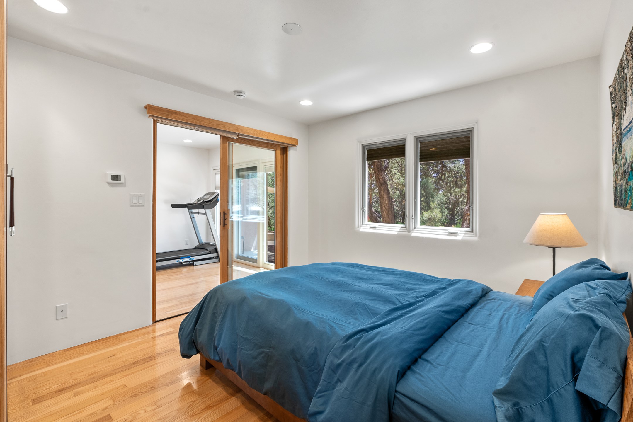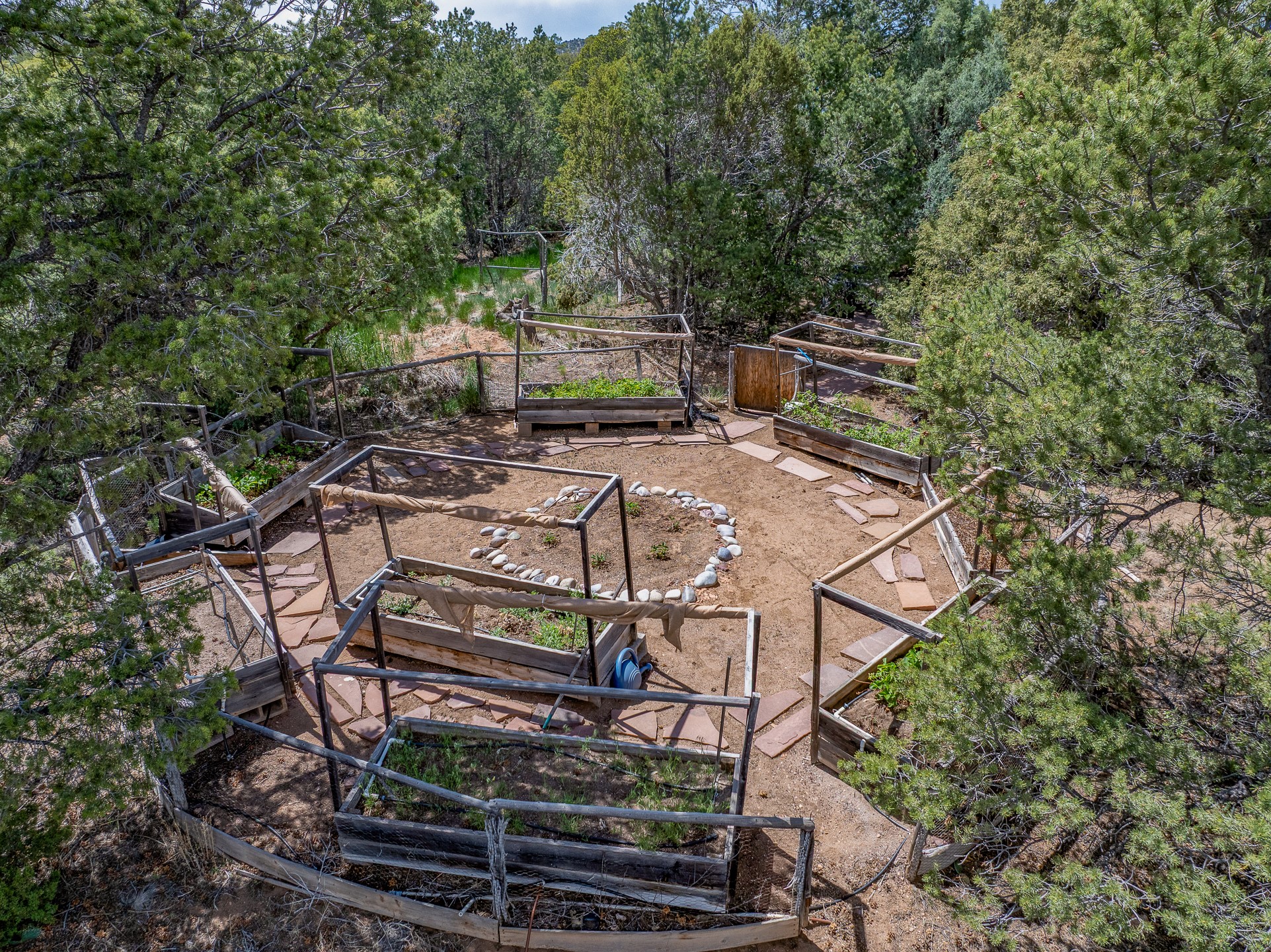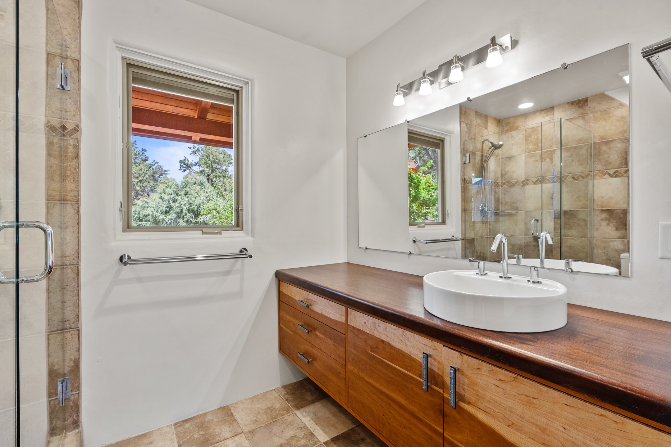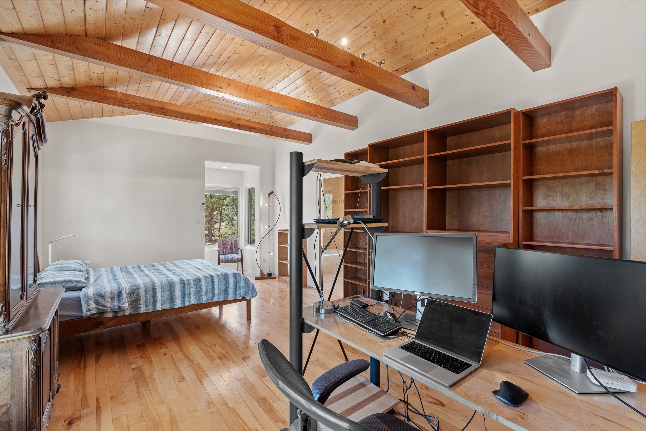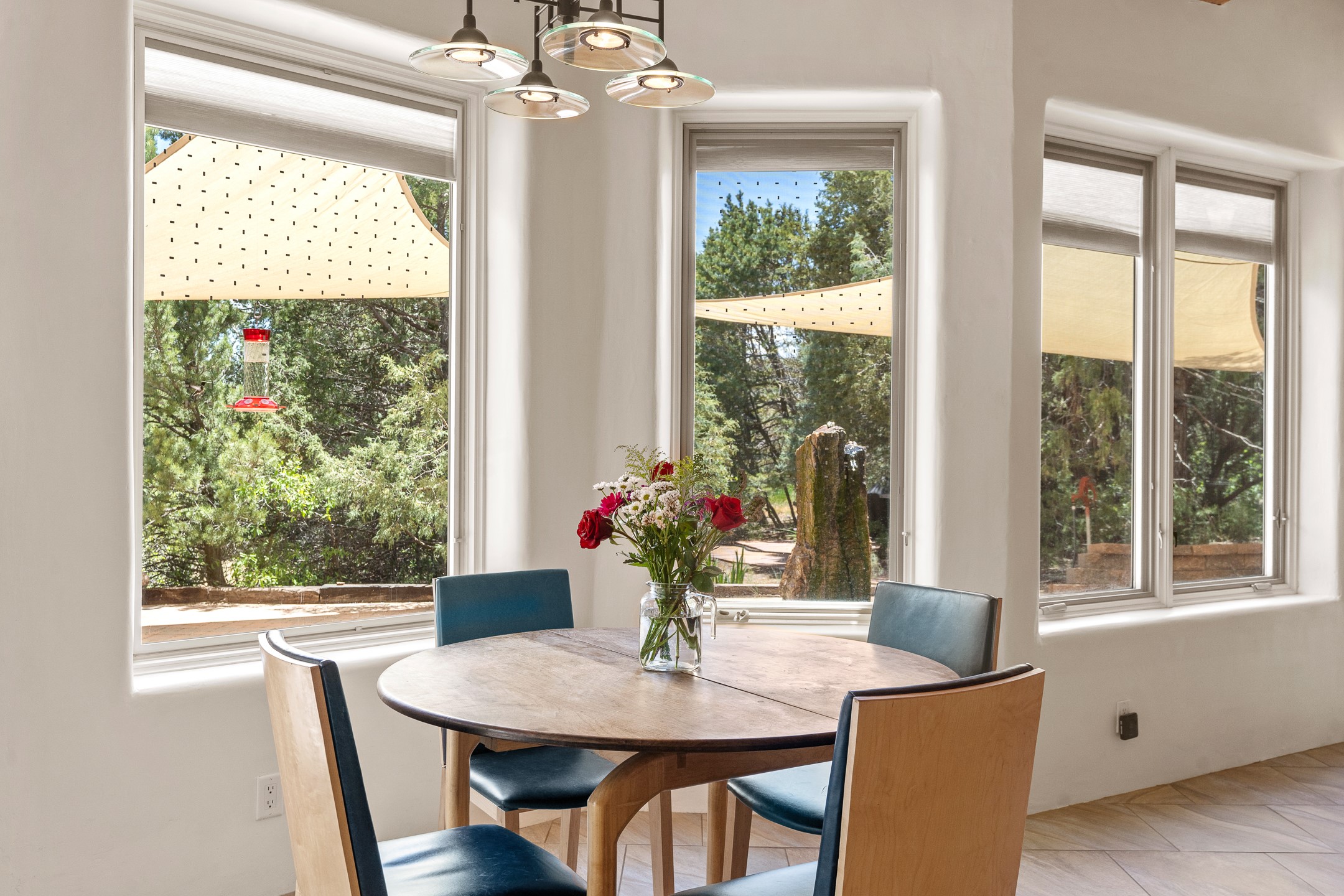 Located just over 20 minutes from downtown Santa Fe, this privately situated, passive solar contemporary home sits on 10.25 wooded acres, surrounded by mature Ponderosa and Pion pines. Designed for energy efficiency, this two-story residence offers both privacy and natural beauty, and regular sightings of native wildlife including birds, bobcats, and gray foxes. Originally built in 1998 and thoughtfully renovated and expanded in 2009, the main house features high-performance Designer Series Pella windows with triple pane, low-E glass and integrated blinds, along with durable hardwood and ceramic tile flooring. The open living and dining area is accented by viga ceilings and a Danish soapstone woodstove, which stores and radiates heat for efficient warmth. A custom-built media cabinet and wood storage add functional elegance. The modern kitchen is a chef's dream, outfitted with custom maple cabinetry, hickory and granite countertops, and premium appliances including a Wolf induction cooktop, Miele wall oven and dishwasher, and Fisher & Paykel refrigerator. A stylish powder room with custom cabinetry and an ensuite guest bedroom with sunroom complete the first floor. Upstairs, you'll find a versatile home office or media area between two spacious bedrooms, each with walk-in closets and private bathrooms featuring custom finishes. An upstairs laundry room with sink is conveniently located near the bedrooms. For added comfort, three Daikin mini-split systems provide efficient cooling in summer and supplemental heating in winter. Velux Integra roof windows, equipped with remote-controlled blinds and rain-sensor auto-close functionality, enhance ventilation and natural light. A secure Catio on the balcony provides a safe outdoor space for feline companions. Also included is a detached one bedroom and 3/4 bathroom, 900 sq ft guesthouse, ideal for guests or as a rental. This private unit offers full functionality while maintaining separation from the main home. Enjoy outdoor living on thoughtful patio spaces with sun sails and a fenced vegetable garden with raised boxes. Snow barriers, heavy-duty galvanized gutters and downspouts, and a two-car carport ensure protection from the elements year-round. The 1200 sf heated workshop on the property offers abundant space for your creative projects. Whether you're seeking a sustainable lifestyle, a quiet creative refuge, or a home with income potential, this unique Santa Fe property offers all that and more.