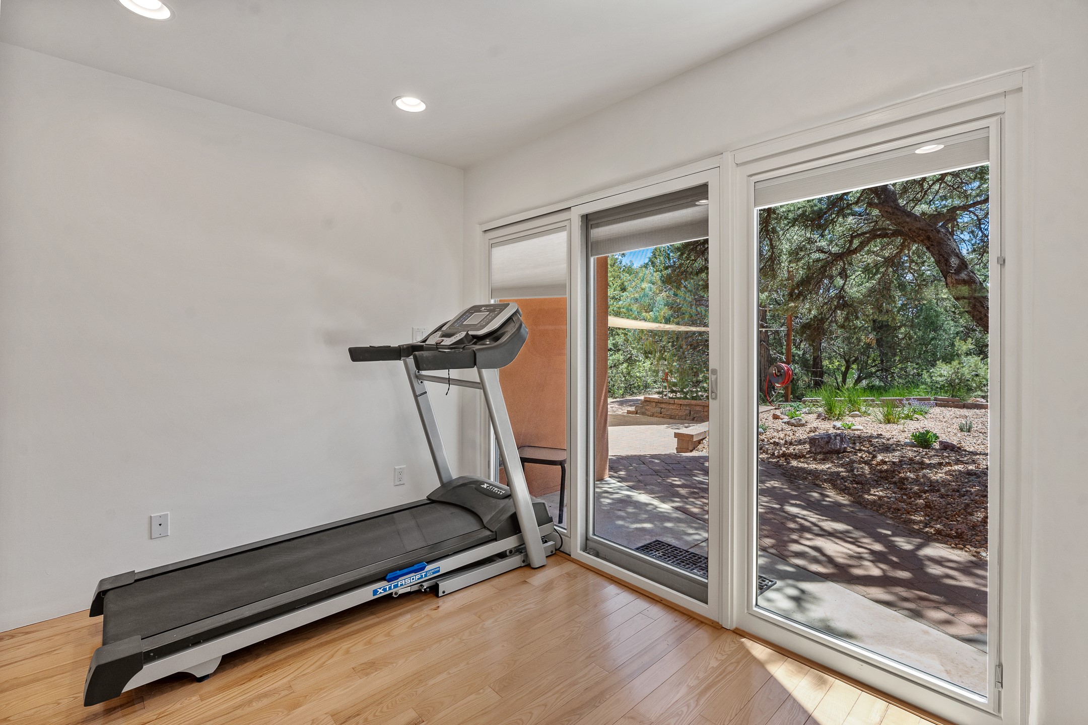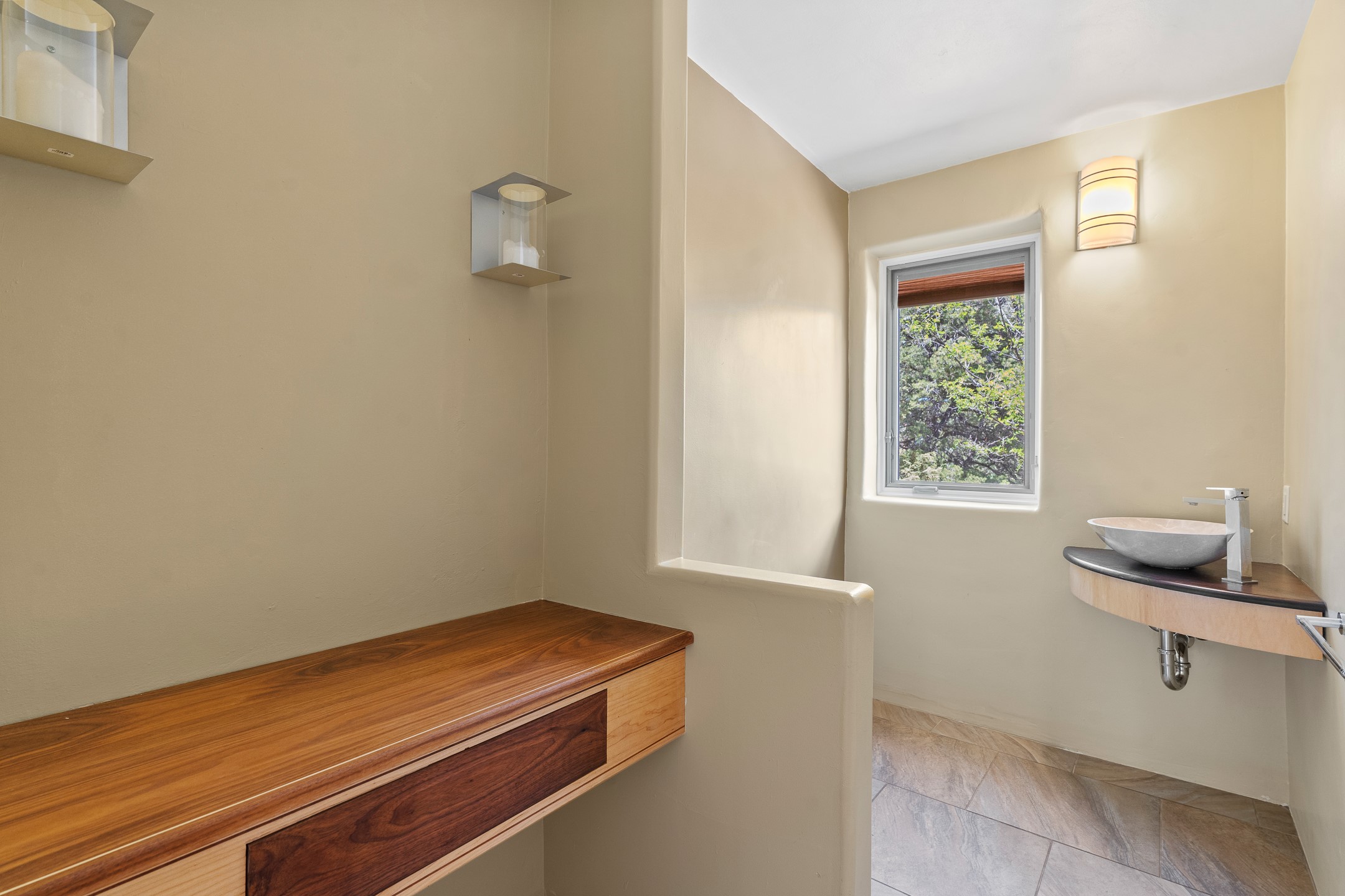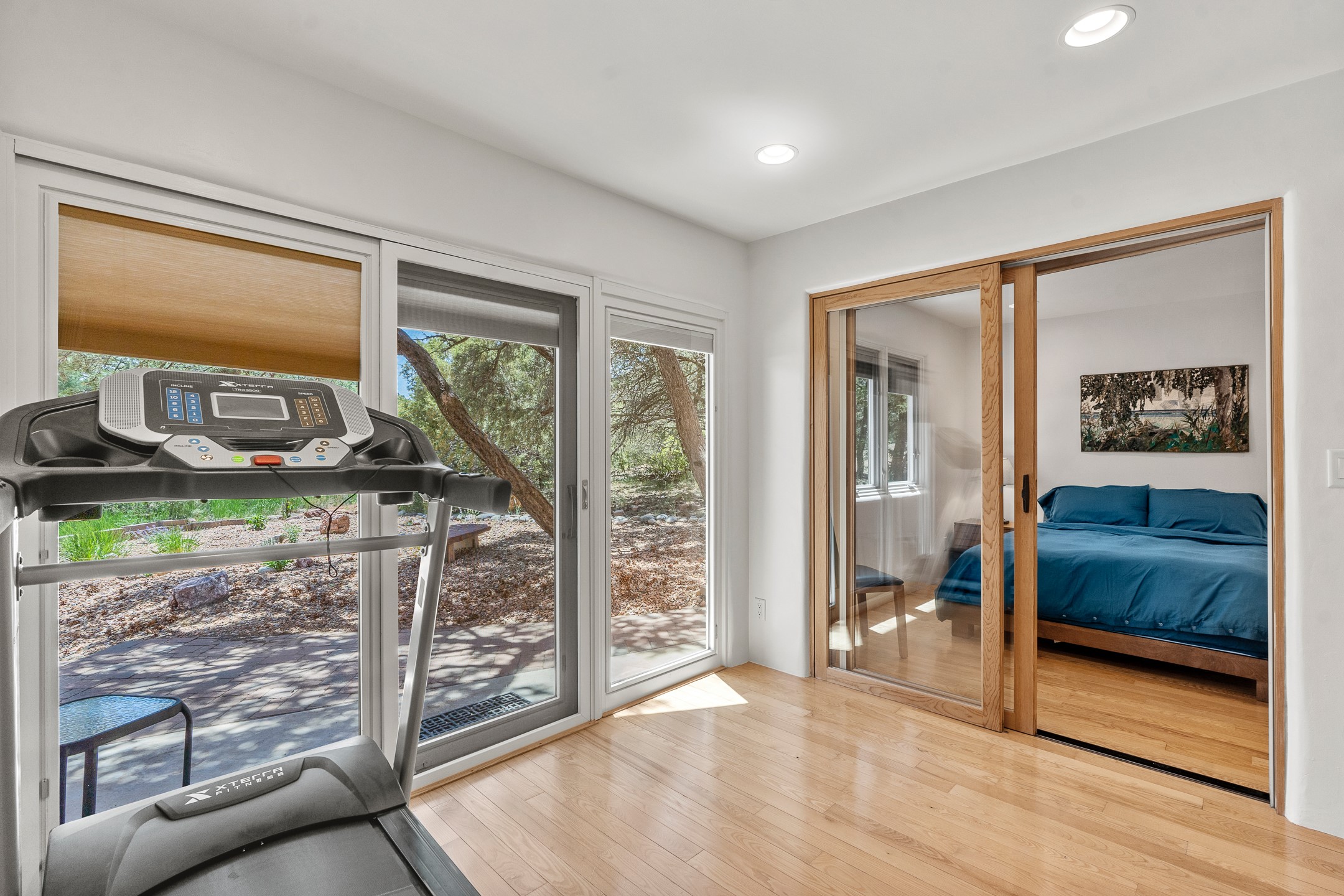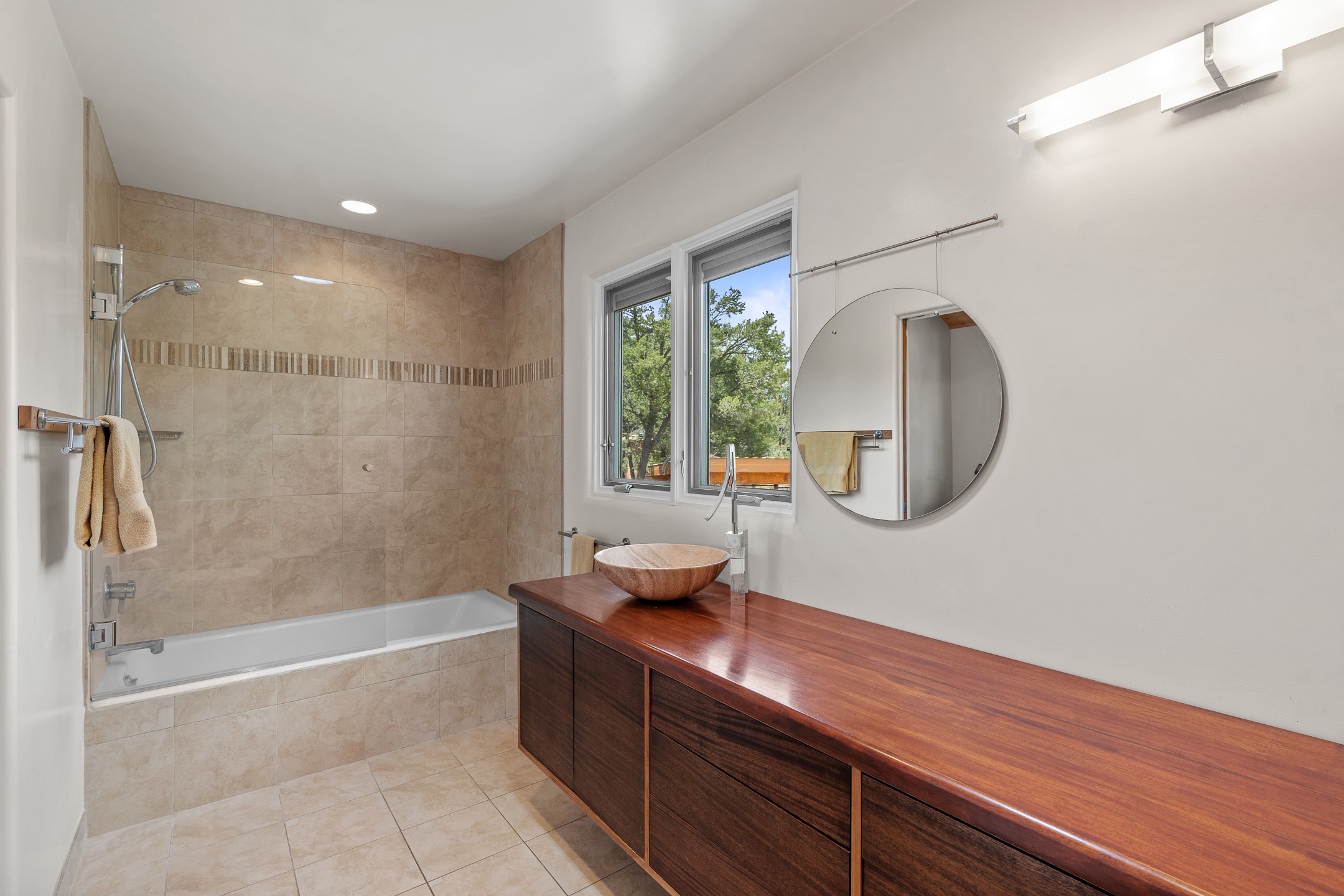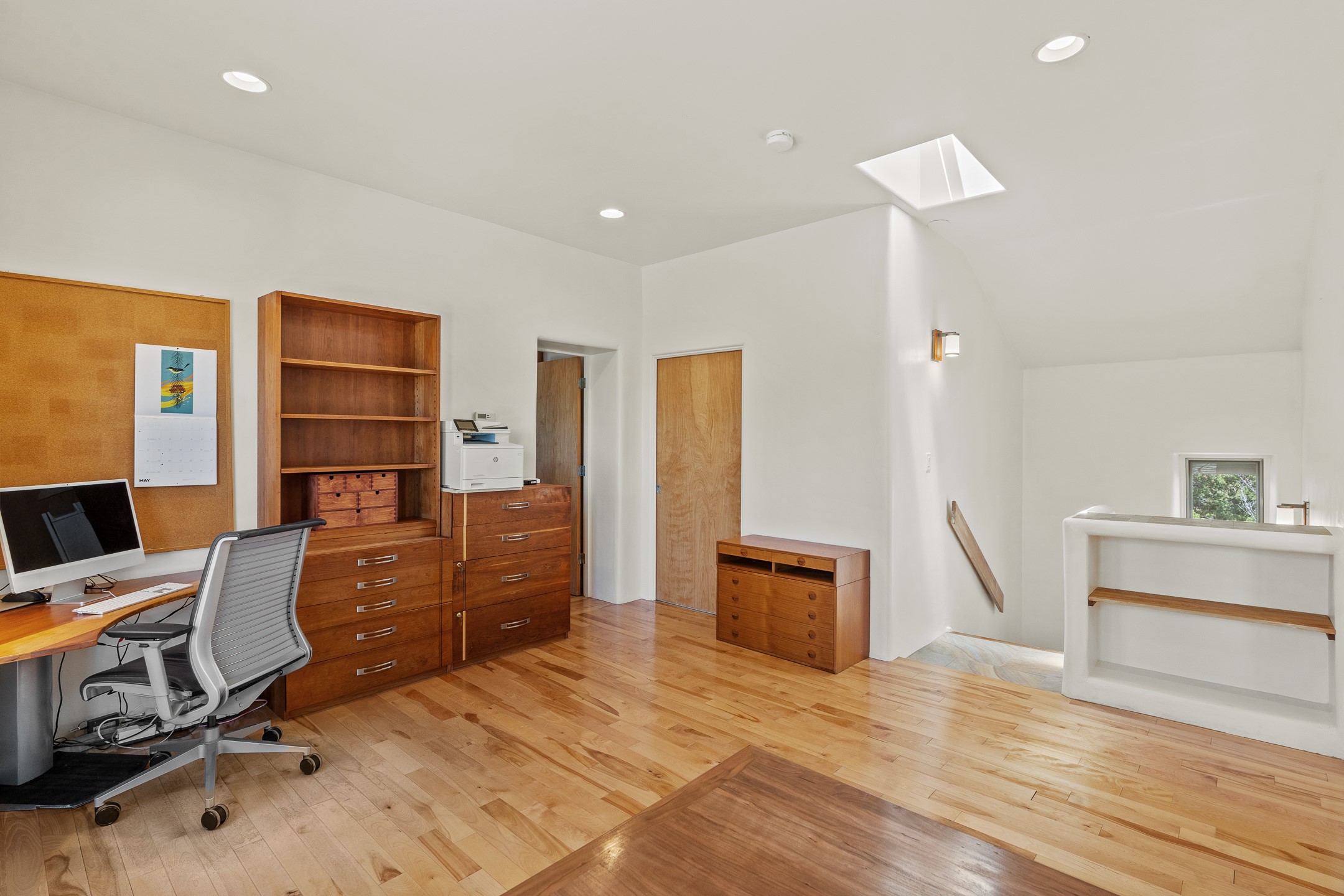 Located just over 20 minutes from downtown Santa Fe, this privately situated, passive solar contemporary home sits on 10.25 wooded acres, surrounded by mature Ponderosa and Pion pines. Designed for energy efficiency, this two-story residence offers both privacy and natural beauty, and regular sightings of native wildlife including birds, bobcats, and gray foxes. Originally built in 1998 and thoughtfully renovated and expanded in 2009, the main house features high-performance Designer Series Pella windows with triple pane, low-E glass and integrated blinds, along with durable hardwood and ceramic tile flooring. The open living and dining area is accented by viga ceilings and a Danish soapstone woodstove, which stores and radiates heat for efficient warmth. A custom-built media cabinet and wood storage add functional elegance. The modern kitchen is a chef's dream, outfitted with custom maple cabinetry, hickory and granite countertops, and premium appliances including a Wolf induction cooktop, Miele wall oven and dishwasher, and Fisher & Paykel refrigerator. A stylish powder room with custom cabinetry and an ensuite guest bedroom with sunroom complete the first floor. Upstairs, you'll find a versatile home office or media area between two spacious bedrooms, each with walk-in closets and private bathrooms featuring custom finishes. An upstairs laundry room with sink is conveniently located near the bedrooms. For added comfort, three Daikin mini-split systems provide efficient cooling in summer and supplemental heating in winter. Velux Integra roof windows, equipped with remote-controlled blinds and rain-sensor auto-close functionality, enhance ventilation and natural light. A secure Catio on the balcony provides a safe outdoor space for feline companions. Also included is a detached one bedroom and 3/4 bathroom, 900 sq ft guesthouse, ideal for guests or as a rental. This private unit offers full functionality while maintaining separation from the main home. Enjoy outdoor living on thoughtful patio spaces with sun sails and a fenced vegetable garden with raised boxes. Snow barriers, heavy-duty galvanized gutters and downspouts, and a two-car carport ensure protection from the elements year-round. The 1200 sf heated workshop on the property offers abundant space for your creative projects. Whether you're seeking a sustainable lifestyle, a quiet creative refuge, or a home with income potential, this unique Santa Fe property offers all that and more.