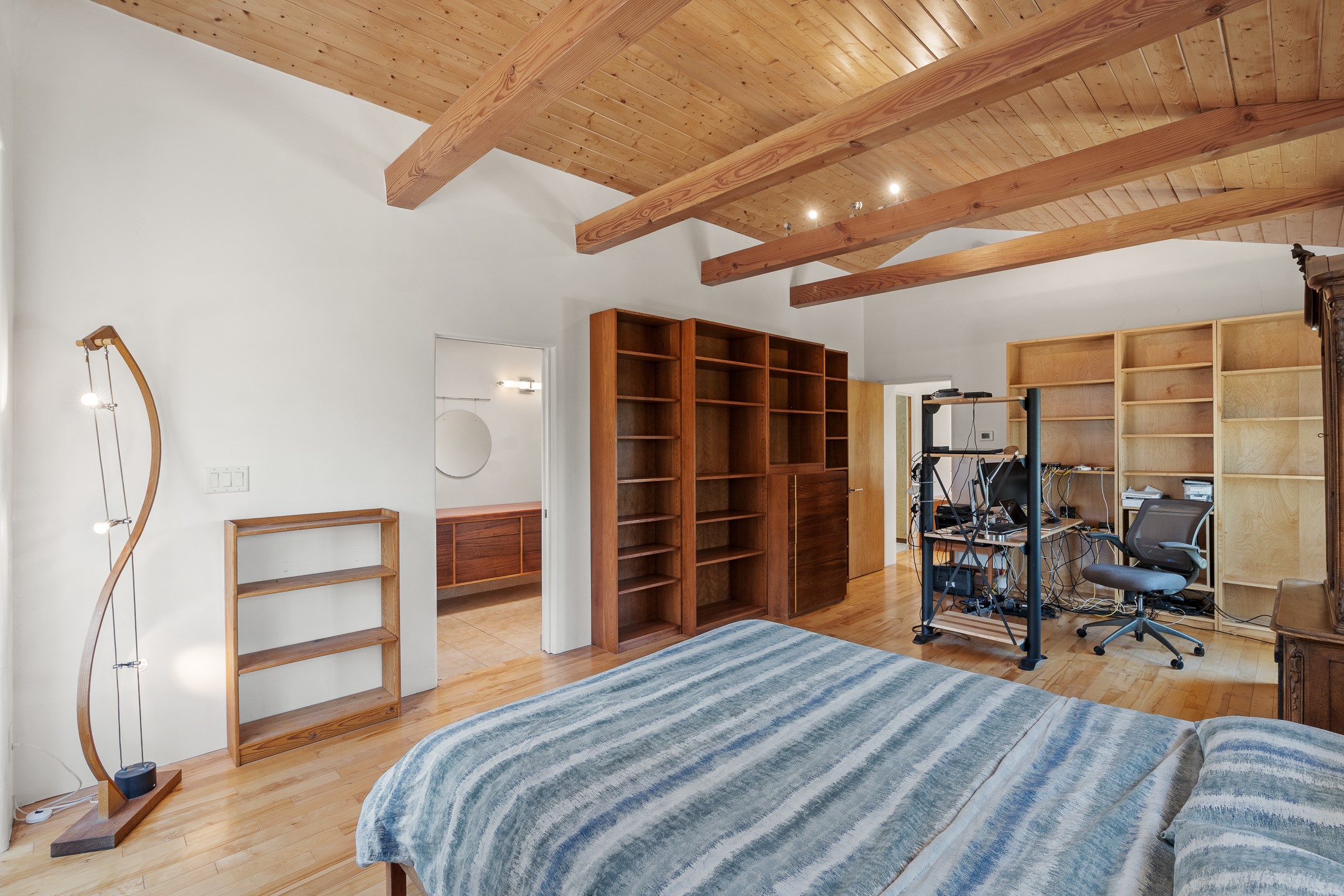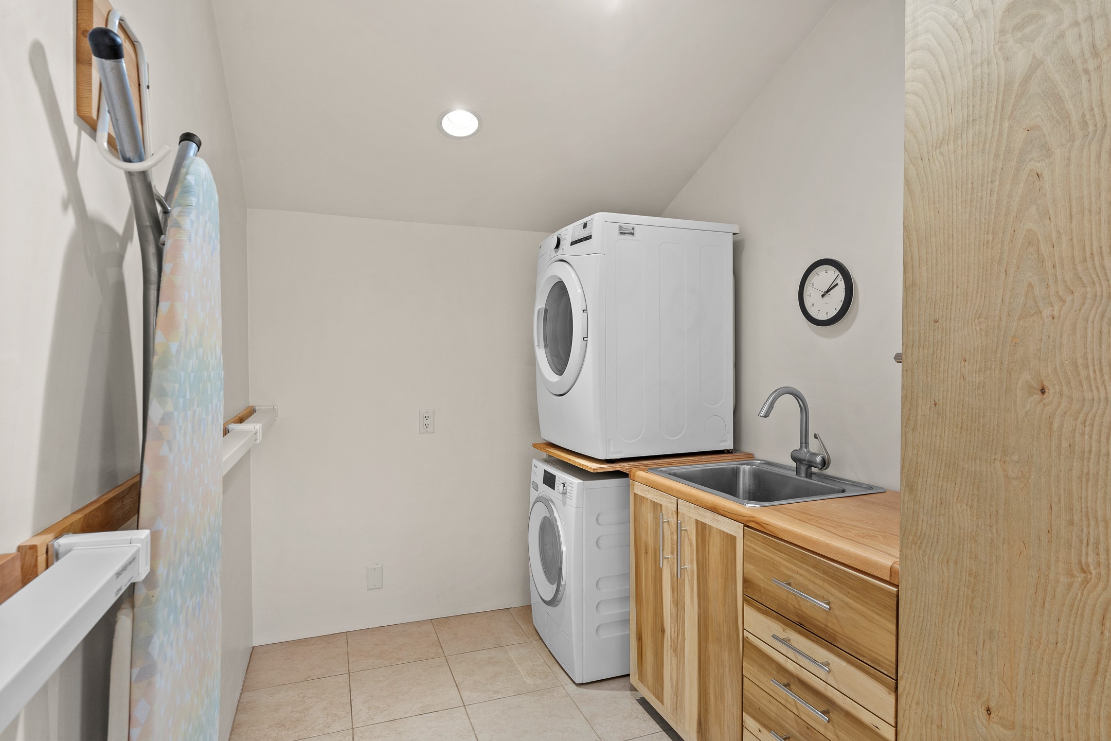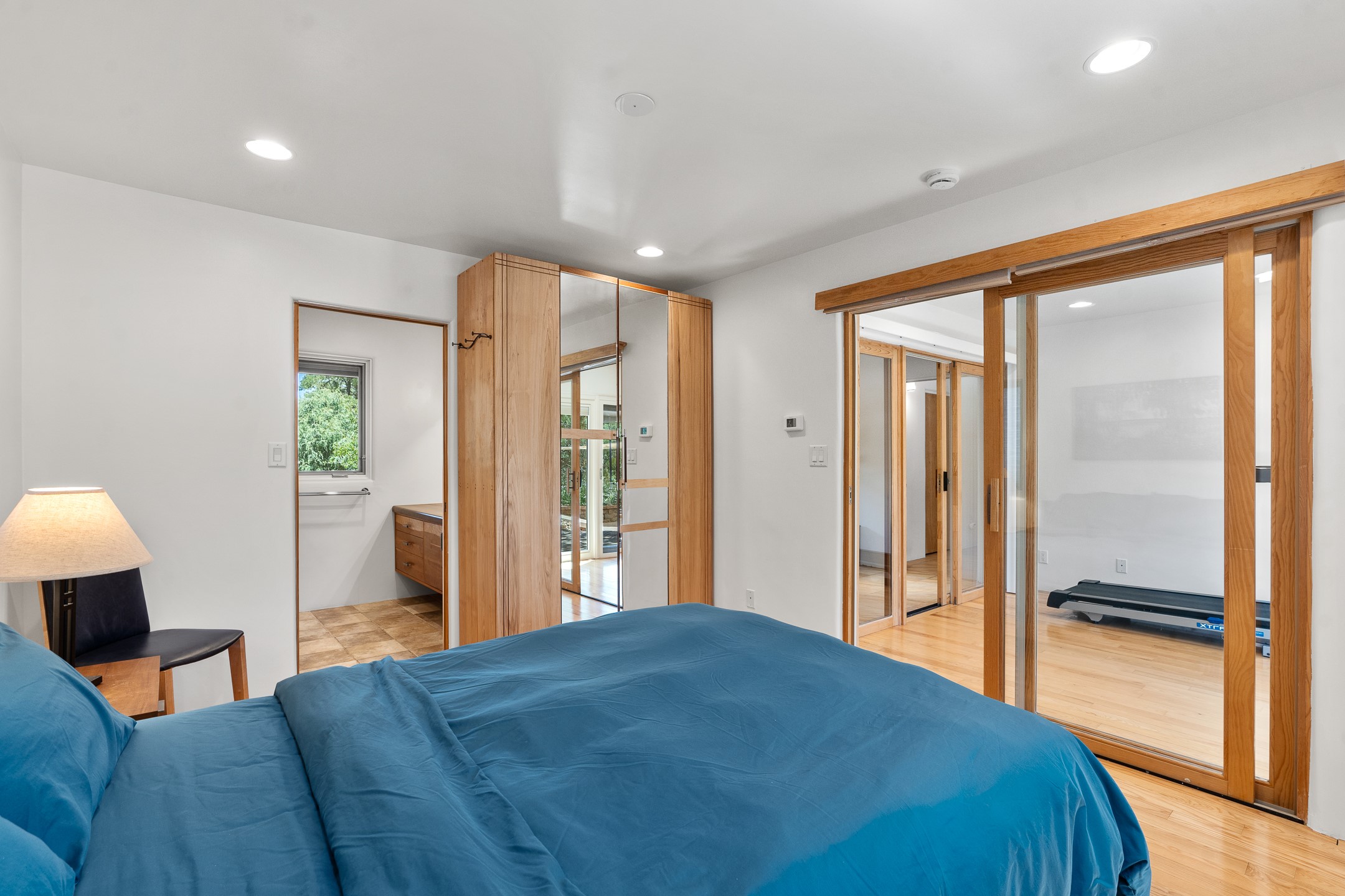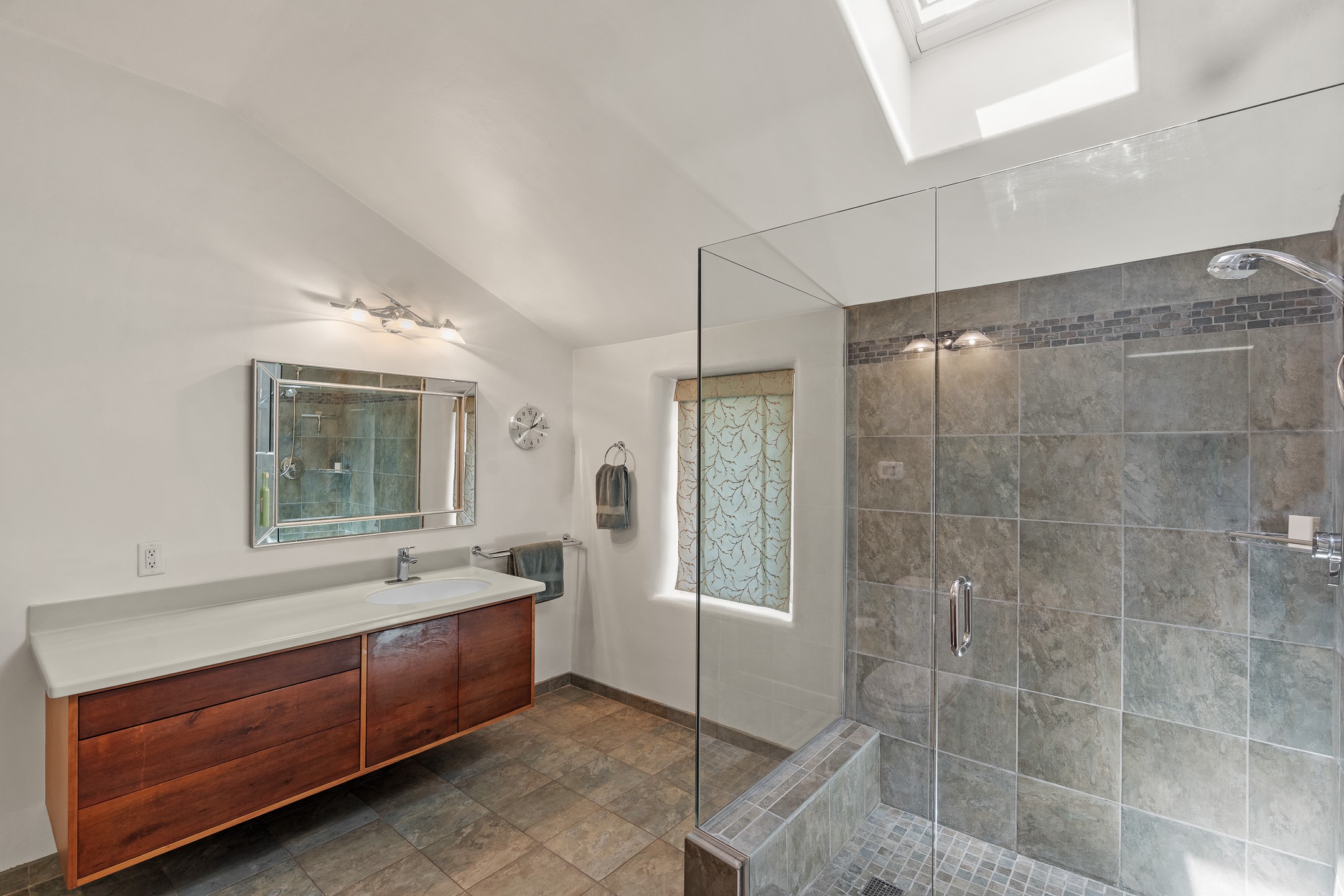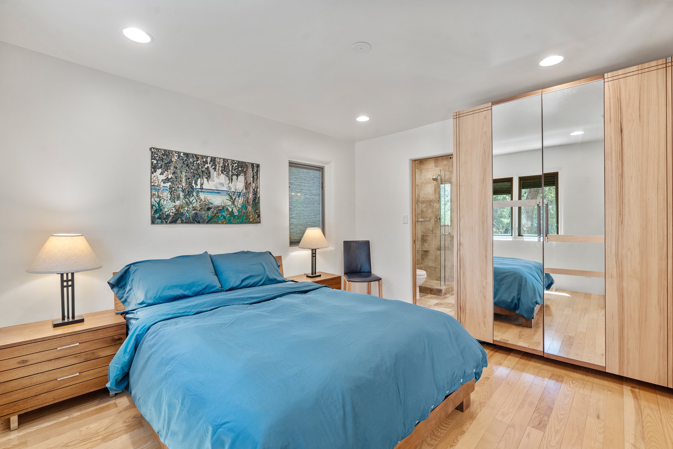 Located just over 20 minutes from downtown Santa Fe, this privately situated, passive solar contemporary home sits on 10.25 wooded acres, surrounded by mature Ponderosa and Pion pines. Designed for energy efficiency, this two-story residence offers both privacy and natural beauty, and regular sightings of native wildlife including birds, bobcats, and gray foxes. Originally built in 1998 and thoughtfully renovated and expanded in 2009, the main house features high-performance Designer Series Pella windows with triple pane, low-E glass and integrated blinds, along with durable hardwood and ceramic tile flooring. The open living and dining area is accented by viga ceilings and a Danish soapstone woodstove, which stores and radiates heat for efficient warmth. A custom-built media cabinet and wood storage add functional elegance. The modern kitchen is a chef's dream, outfitted with custom maple cabinetry, hickory and granite countertops, and premium appliances including a Wolf induction cooktop, Miele wall oven and dishwasher, and Fisher & Paykel refrigerator. A stylish powder room with custom cabinetry and an ensuite guest bedroom with sunroom complete the first floor. Upstairs, you'll find a versatile home office or media area between two spacious bedrooms, each with walk-in closets and private bathrooms featuring custom finishes. An upstairs laundry room with sink is conveniently located near the bedrooms. For added comfort, three Daikin mini-split systems provide efficient cooling in summer and supplemental heating in winter. Velux Integra roof windows, equipped with remote-controlled blinds and rain-sensor auto-close functionality, enhance ventilation and natural light. A secure Catio on the balcony provides a safe outdoor space for feline companions. Also included is a detached one bedroom and 3/4 bathroom, 900 sq ft guesthouse, ideal for guests or as a rental. This private unit offers full functionality while maintaining separation from the main home. Enjoy outdoor living on thoughtful patio spaces with sun sails and a fenced vegetable garden with raised boxes. Snow barriers, heavy-duty galvanized gutters and downspouts, and a two-car carport ensure protection from the elements year-round. The 1200 sf heated workshop on the property offers abundant space for your creative projects. Whether you're seeking a sustainable lifestyle, a quiet creative refuge, or a home with income potential, this unique Santa Fe property offers all that and more.
