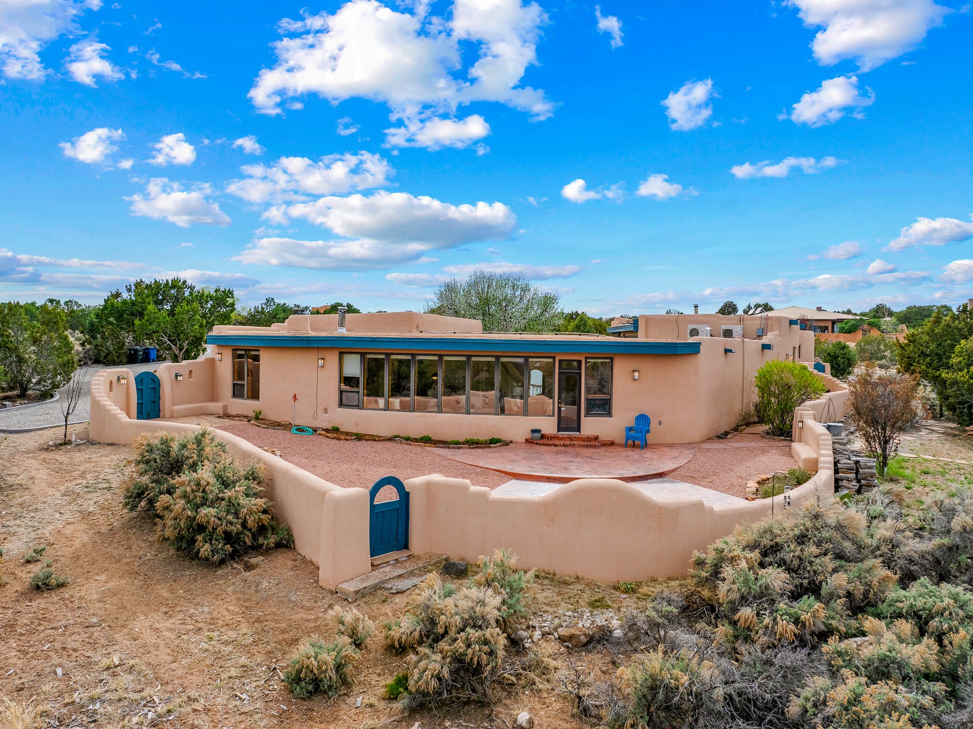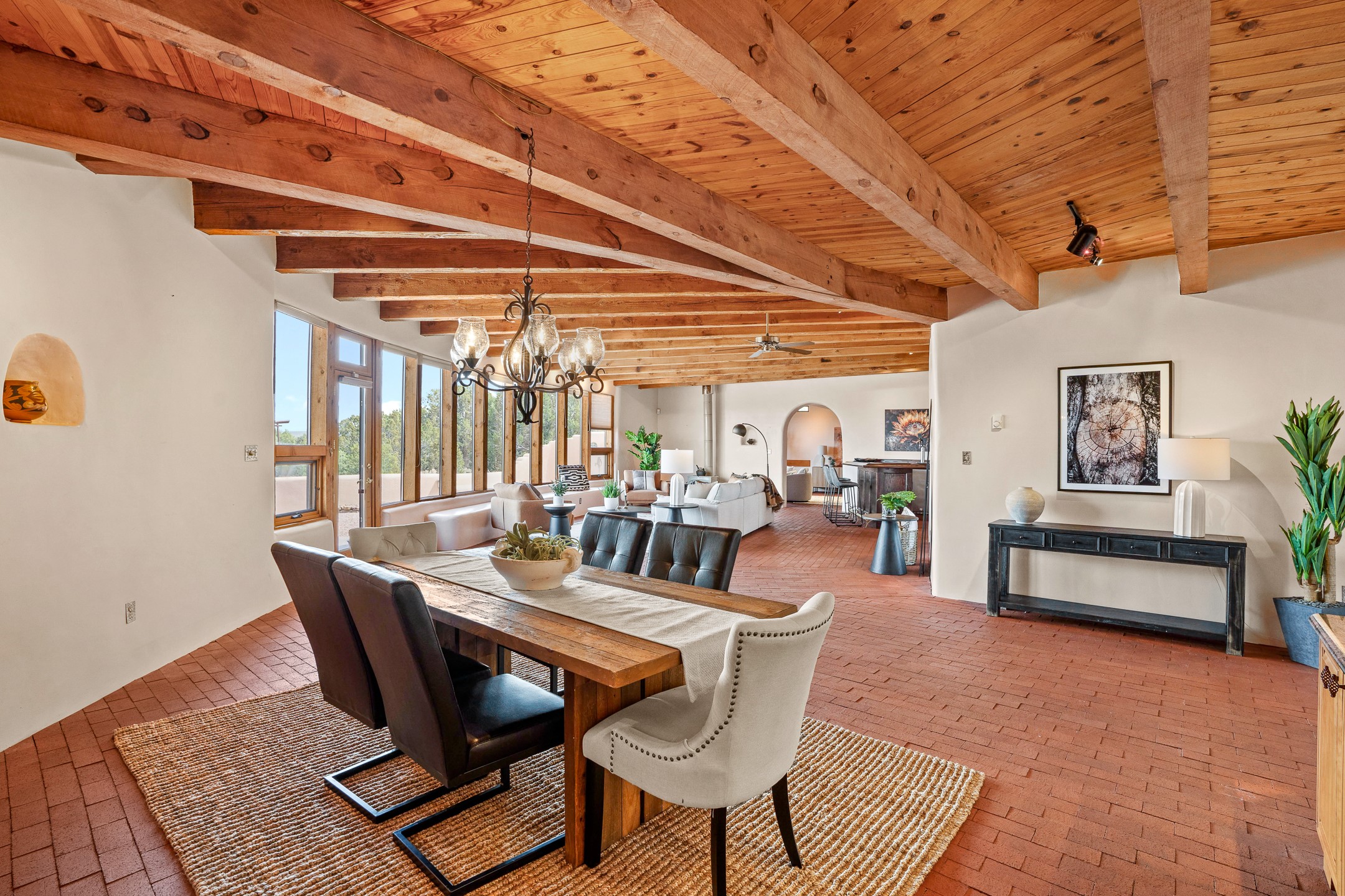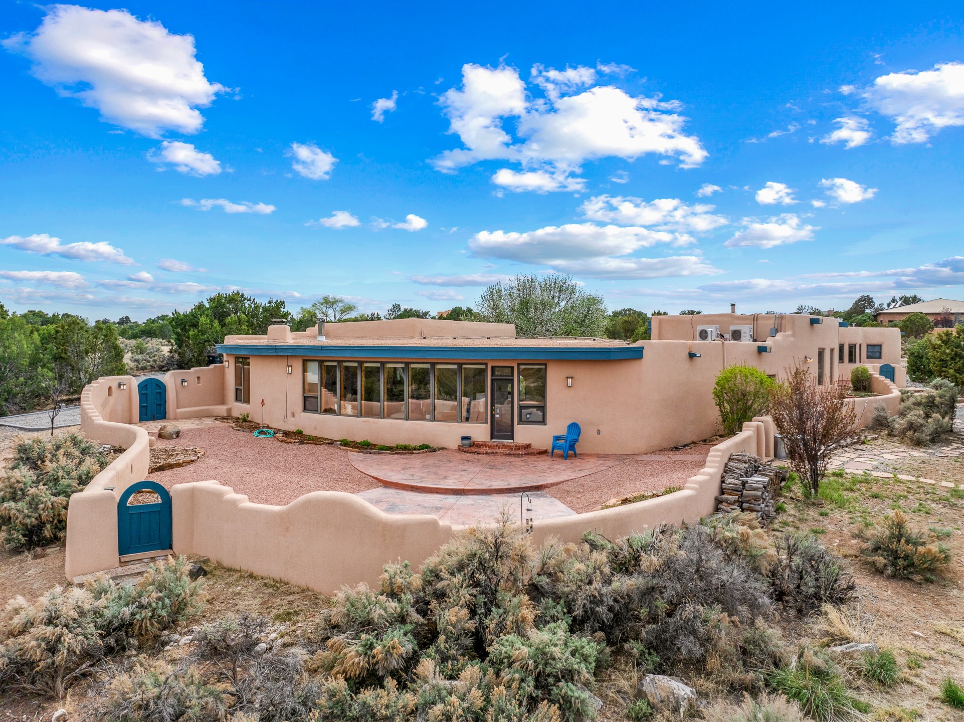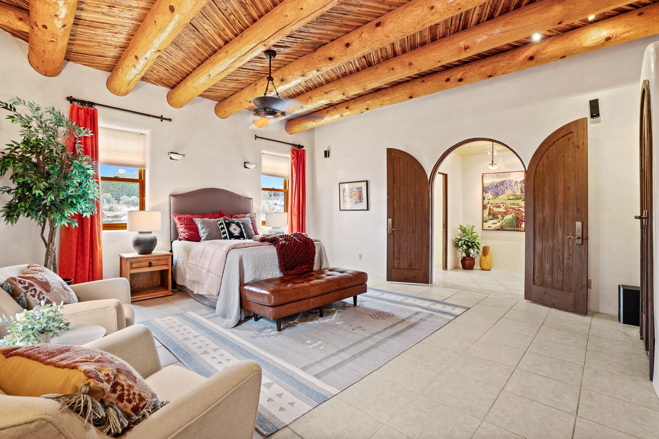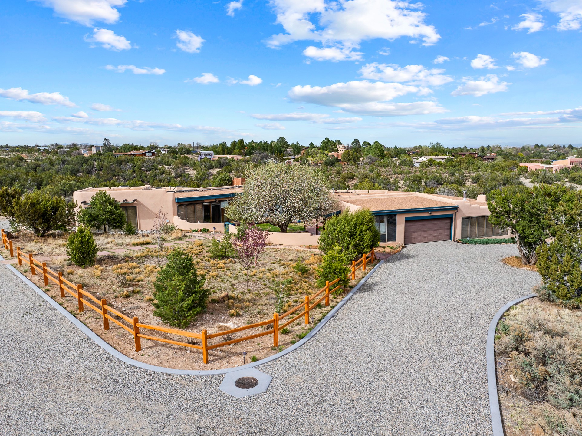 Adobe Masterpiece, Entertainer's Dream, 2.04 Acres Backing to County Land, 4917 Sq Ft, Living Room with Incredibly Stunning Views, High-End Finishes, Vigas, Beams, Kiva Fireplace, Extensive Professional Landscaping, Attached Casita, 575 Sq Ft Shop with Roll-Up, Mini-Split Cooling, Chicken Coop, Garden Beds, and More! Welcome to 155 Piedra Loop!This exquisite property caters to those with discerning taste. Situated on 2.04 acres backing to County land with White Rock Canyon just beyond, the property features 360 degree views, from the Jemez Mountains to the West, and the Sangre de Cristos to the East. The house features true adobe construction, enabling the architect to create curved walls for panoramic views while following the gentle contours of the land. The living room is the showcase room, with floor to ceiling windows providing you and your guests with expansive views over the back courtyard of the Sangre de Cristos. Brick floors, vigas, and exposed beams provide a classic Southwest ambiance, while the built-in bar with beer taps will keep your guests refreshed. The kitchen is ready to accommodate large gatherings and includes a large island with an induction cooktop and overhead vent, Wolf double ovens, a plate warmer, granite countertops, generous cabinet space, a serving window to the dining room, and a wide walkway to accommodate multiple chefs and servers. The primary suite is approximately 1200 sq ft and will serve as your private sanctuary. It includes a private office, laundry room, and sitting room, in addition to the large bedroom, cedar-finished walk-in closet, and bathroom. The primary bathroom includes dual vanities, a large tub, and a walk-in shower. A private courtyard is located off the master suite. The main courtyard leading to the home has been professionally landscaped, and features a number of trees, grass with automatic sprinklers, and the entrance to the attached casita. The casita features a bedroom and a bathroom. To the north of the main house sits a separate shop, which includes a roll-up door, space for two vehicles (in tandem), and a half bathroom. The back yard includes a dog kennel / chicken coop, established garden beds, and the back courtyard for entertaining guests outdoors while taking in views of the Sangres as the sun sets behind you. This property is truly special. The sellers plan to review offers on Tuesday, April 29, so schedule your showing today before this exquisite property is gone!