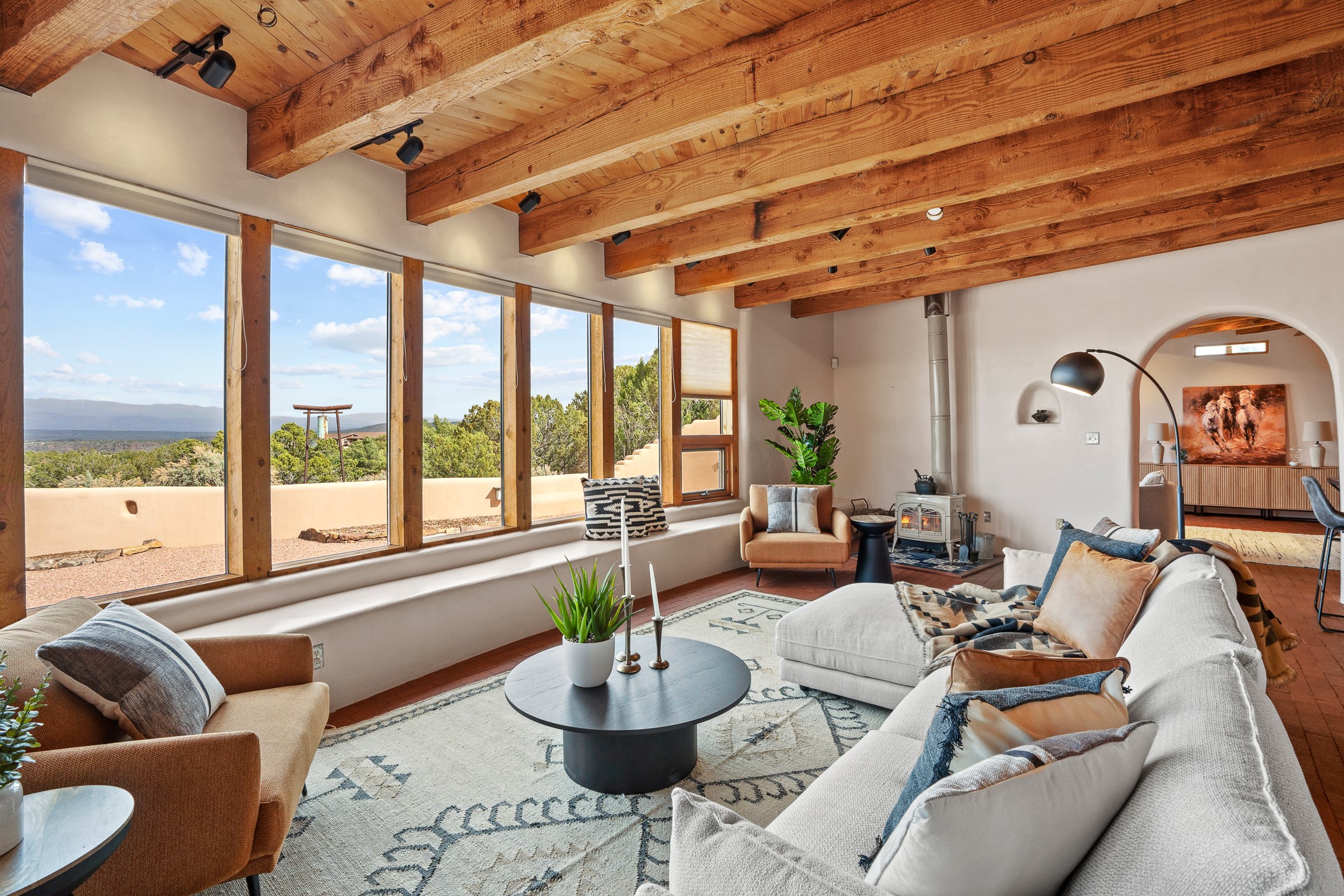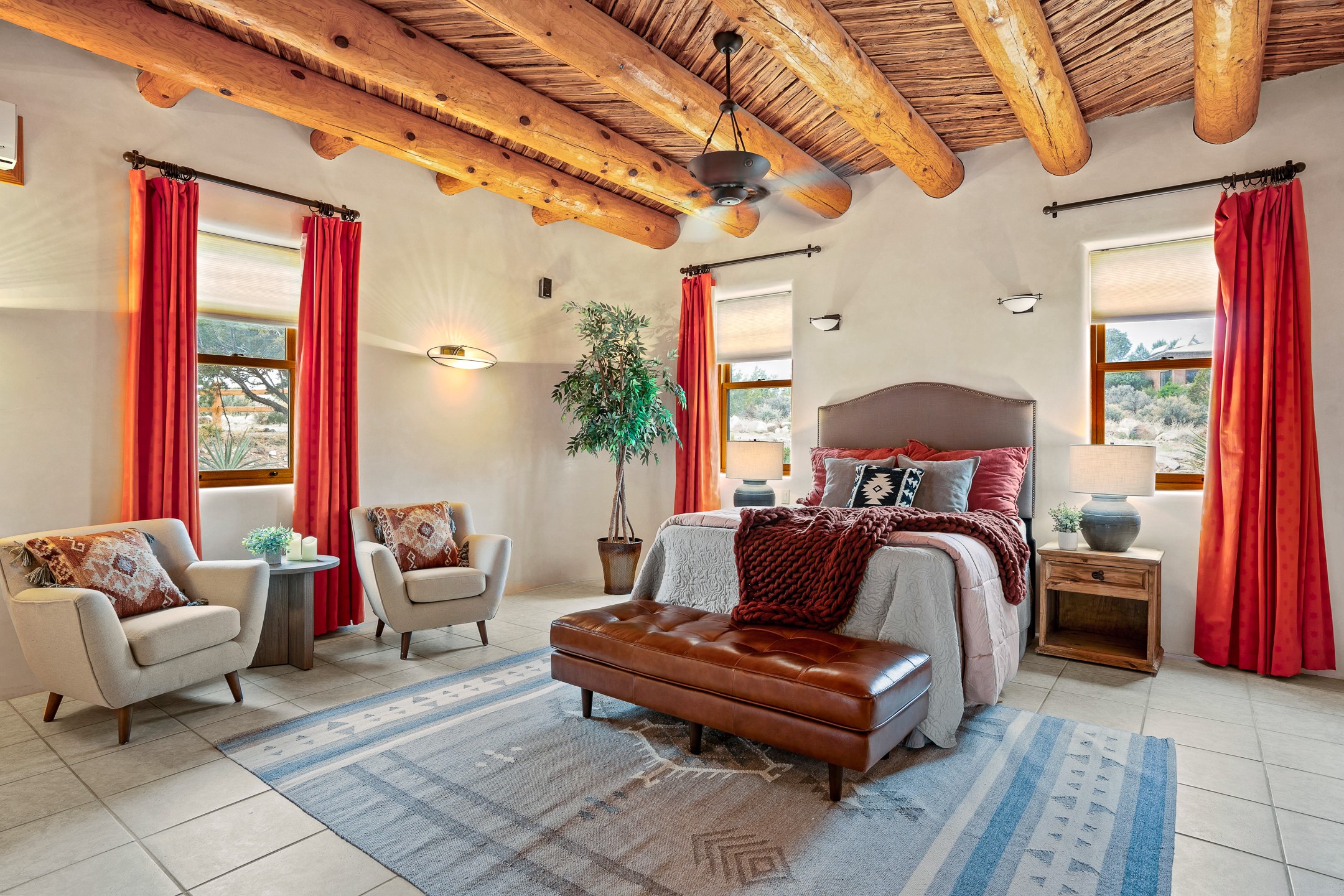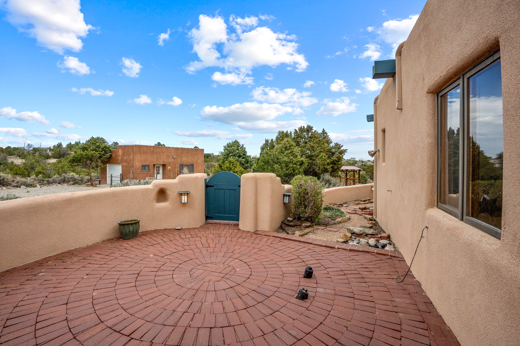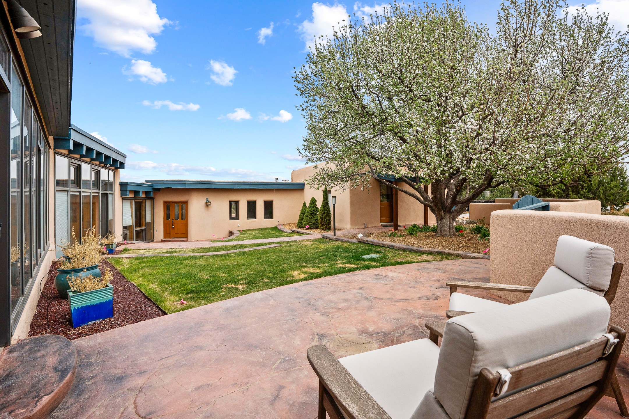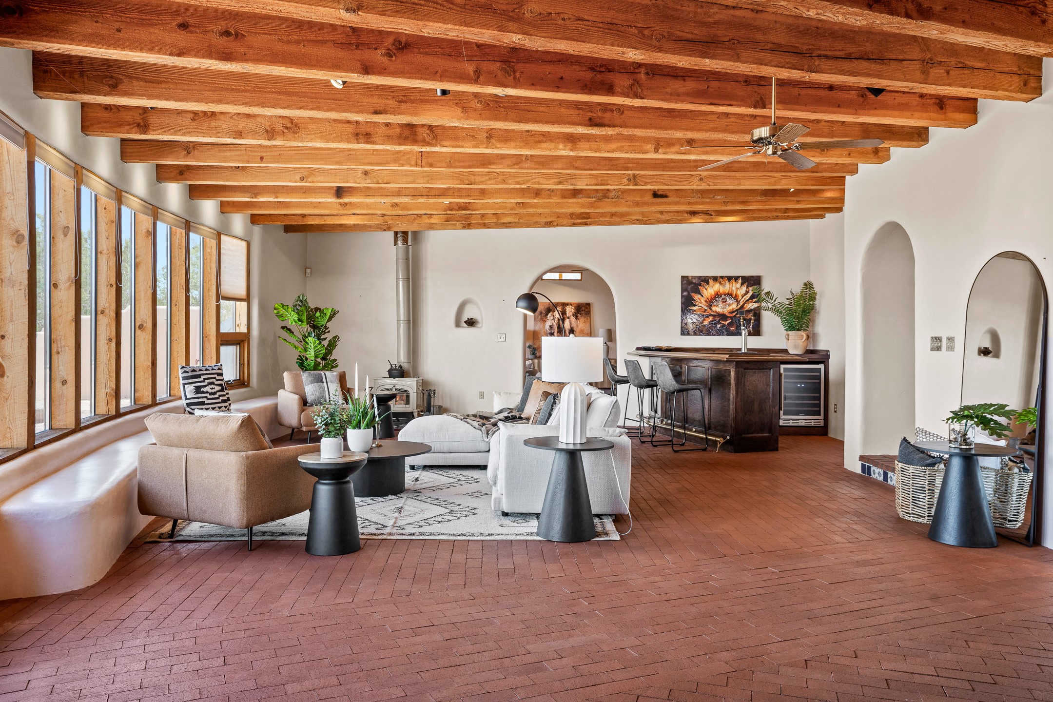 Adobe Masterpiece, Entertainer's Dream, 2.04 Acres Backing to County Land, 4917 Sq Ft, Living Room with Incredibly Stunning Views, High-End Finishes, Vigas, Beams, Kiva Fireplace, Extensive Professional Landscaping, Attached Casita, 575 Sq Ft Shop with Roll-Up, Mini-Split Cooling, Chicken Coop, Garden Beds, and More! Welcome to 155 Piedra Loop!This exquisite property caters to those with discerning taste. Situated on 2.04 acres backing to County land with White Rock Canyon just beyond, the property features 360 degree views, from the Jemez Mountains to the West, and the Sangre de Cristos to the East. The house features true adobe construction, enabling the architect to create curved walls for panoramic views while following the gentle contours of the land. The living room is the showcase room, with floor to ceiling windows providing you and your guests with expansive views over the back courtyard of the Sangre de Cristos. Brick floors, vigas, and exposed beams provide a classic Southwest ambiance, while the built-in bar with beer taps will keep your guests refreshed. The kitchen is ready to accommodate large gatherings and includes a large island with an induction cooktop and overhead vent, Wolf double ovens, a plate warmer, granite countertops, generous cabinet space, a serving window to the dining room, and a wide walkway to accommodate multiple chefs and servers. The primary suite is approximately 1200 sq ft and will serve as your private sanctuary. It includes a private office, laundry room, and sitting room, in addition to the large bedroom, cedar-finished walk-in closet, and bathroom. The primary bathroom includes dual vanities, a large tub, and a walk-in shower. A private courtyard is located off the master suite. The main courtyard leading to the home has been professionally landscaped, and features a number of trees, grass with automatic sprinklers, and the entrance to the attached casita. The casita features a bedroom and a bathroom. To the north of the main house sits a separate shop, which includes a roll-up door, space for two vehicles (in tandem), and a half bathroom. The back yard includes a dog kennel / chicken coop, established garden beds, and the back courtyard for entertaining guests outdoors while taking in views of the Sangres as the sun sets behind you. This property is truly special. The sellers plan to review offers on Tuesday, April 29, so schedule your showing today before this exquisite property is gone!