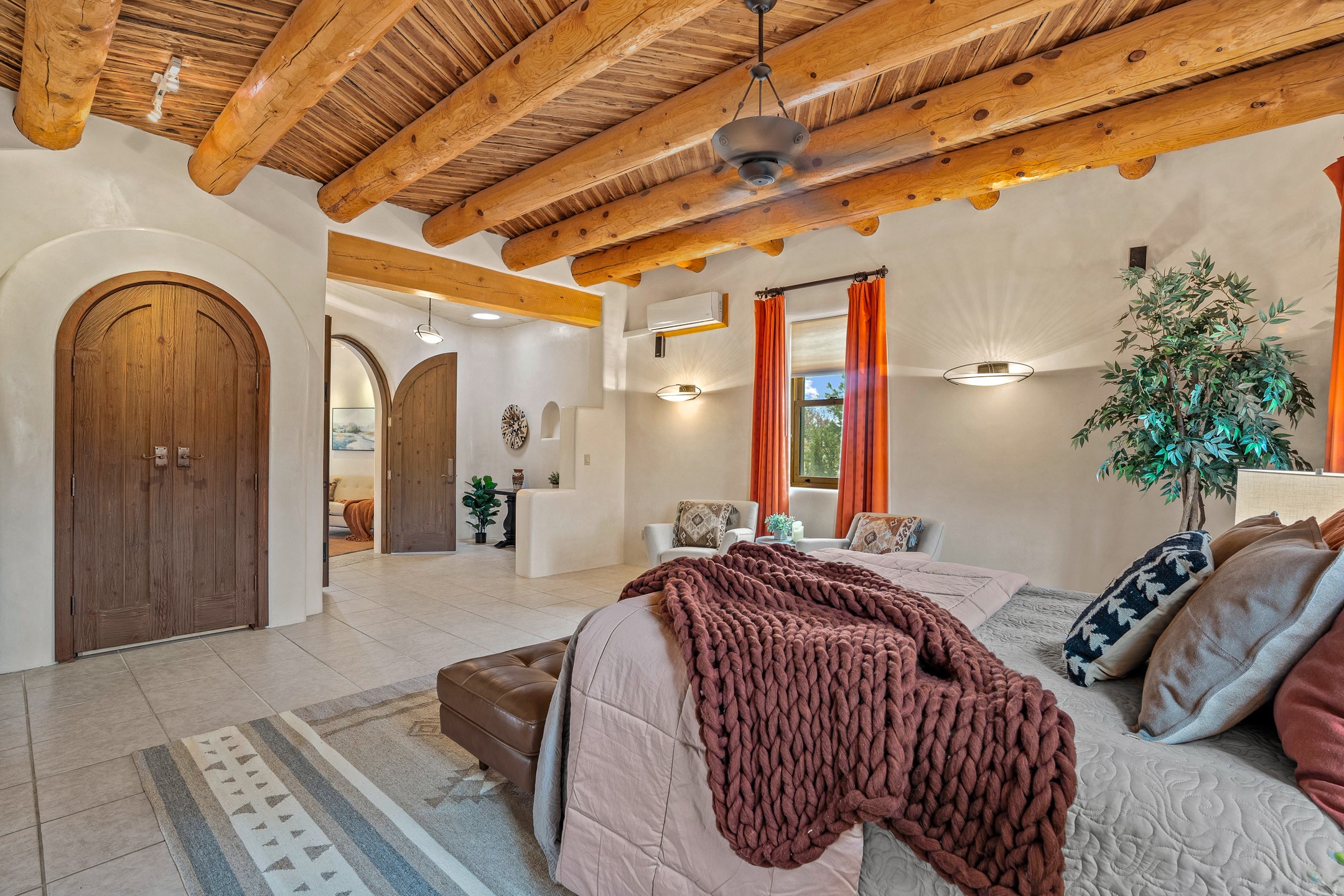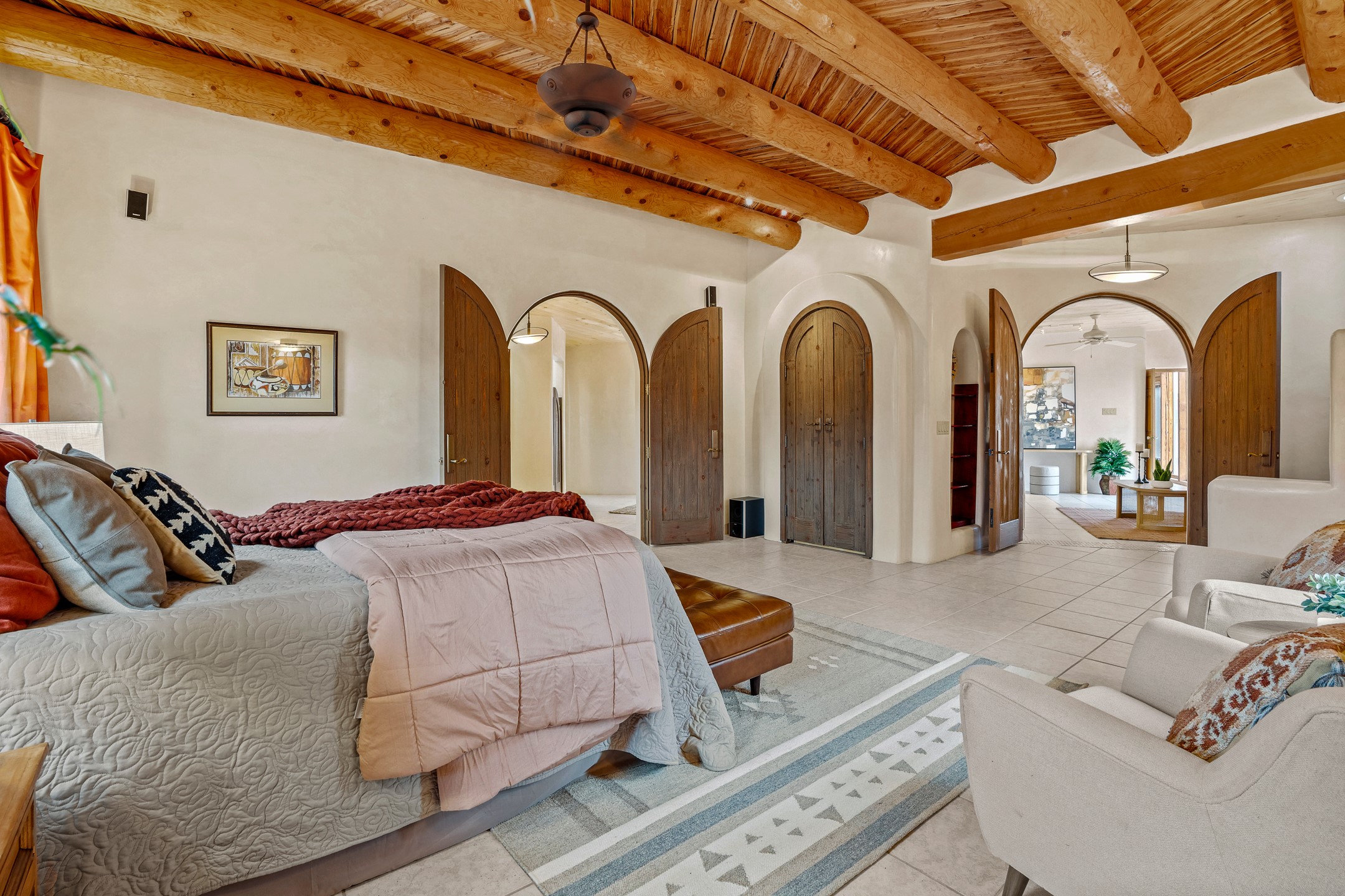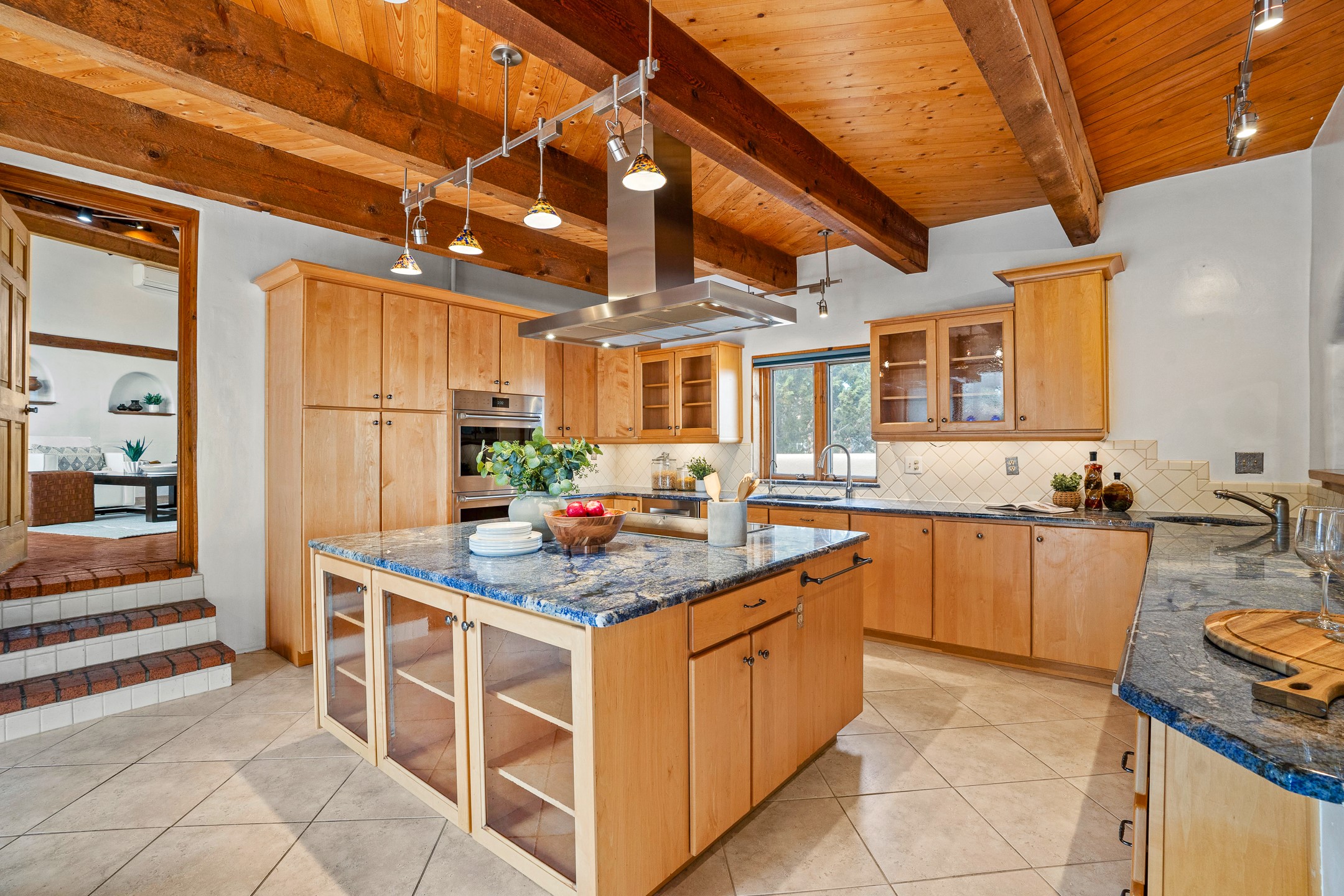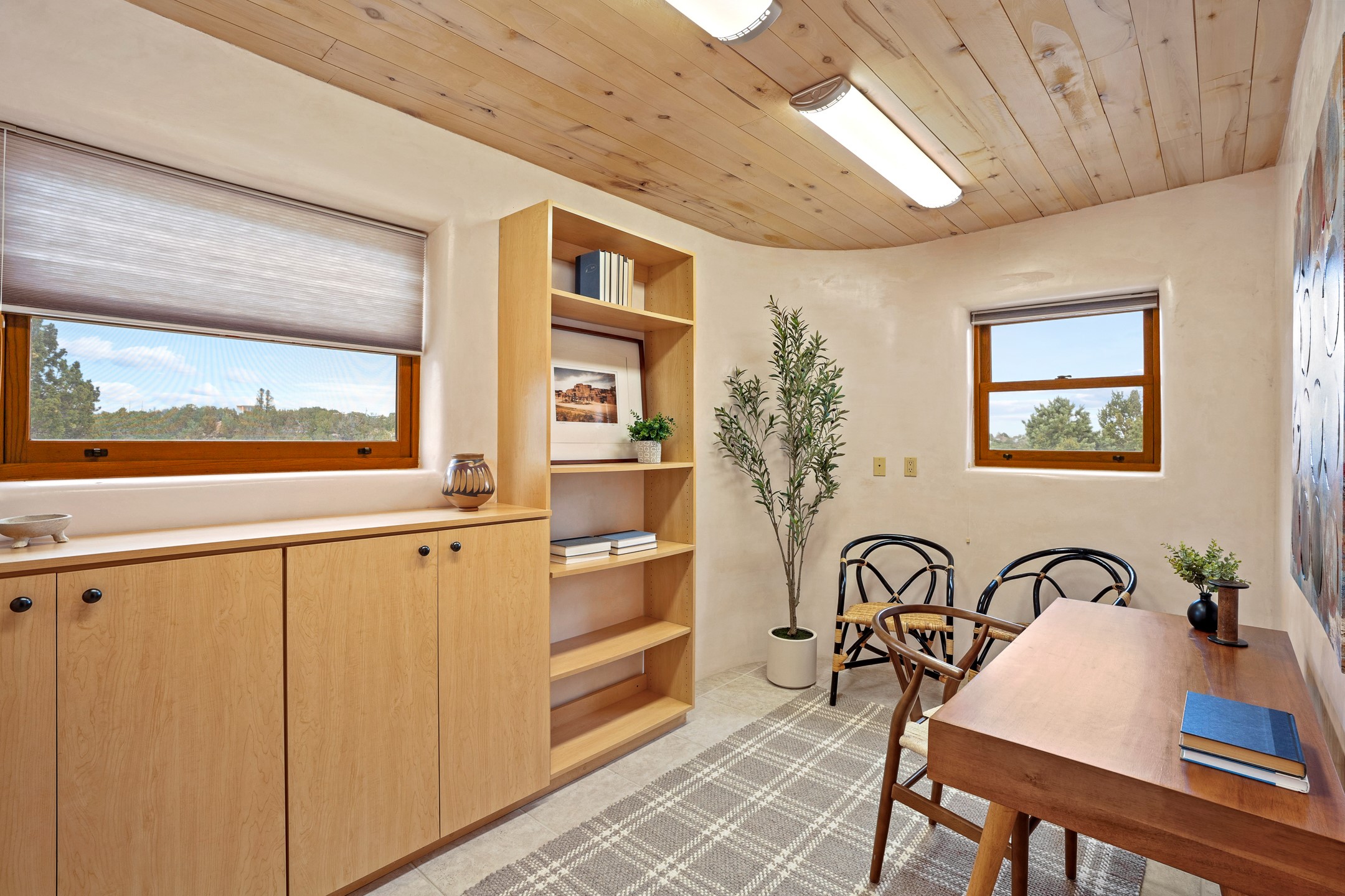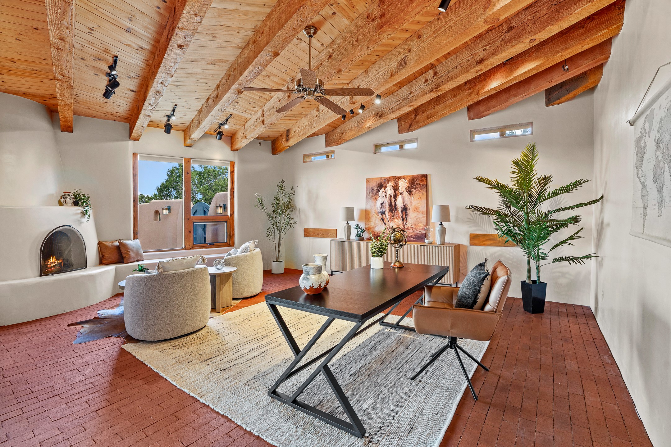 Adobe Masterpiece, Entertainer's Dream, 2.04 Acres Backing to County Land, 4917 Sq Ft, Living Room with Incredibly Stunning Views, High-End Finishes, Vigas, Beams, Kiva Fireplace, Extensive Professional Landscaping, Attached Casita, 575 Sq Ft Shop with Roll-Up, Mini-Split Cooling, Chicken Coop, Garden Beds, and More! Welcome to 155 Piedra Loop!This exquisite property caters to those with discerning taste. Situated on 2.04 acres backing to County land with White Rock Canyon just beyond, the property features 360 degree views, from the Jemez Mountains to the West, and the Sangre de Cristos to the East. The house features true adobe construction, enabling the architect to create curved walls for panoramic views while following the gentle contours of the land. The living room is the showcase room, with floor to ceiling windows providing you and your guests with expansive views over the back courtyard of the Sangre de Cristos. Brick floors, vigas, and exposed beams provide a classic Southwest ambiance, while the built-in bar with beer taps will keep your guests refreshed. The kitchen is ready to accommodate large gatherings and includes a large island with an induction cooktop and overhead vent, Wolf double ovens, a plate warmer, granite countertops, generous cabinet space, a serving window to the dining room, and a wide walkway to accommodate multiple chefs and servers. The primary suite is approximately 1200 sq ft and will serve as your private sanctuary. It includes a private office, laundry room, and sitting room, in addition to the large bedroom, cedar-finished walk-in closet, and bathroom. The primary bathroom includes dual vanities, a large tub, and a walk-in shower. A private courtyard is located off the master suite. The main courtyard leading to the home has been professionally landscaped, and features a number of trees, grass with automatic sprinklers, and the entrance to the attached casita. The casita features a bedroom and a bathroom. To the north of the main house sits a separate shop, which includes a roll-up door, space for two vehicles (in tandem), and a half bathroom. The back yard includes a dog kennel / chicken coop, established garden beds, and the back courtyard for entertaining guests outdoors while taking in views of the Sangres as the sun sets behind you. This property is truly special. The sellers plan to review offers on Tuesday, April 29, so schedule your showing today before this exquisite property is gone!