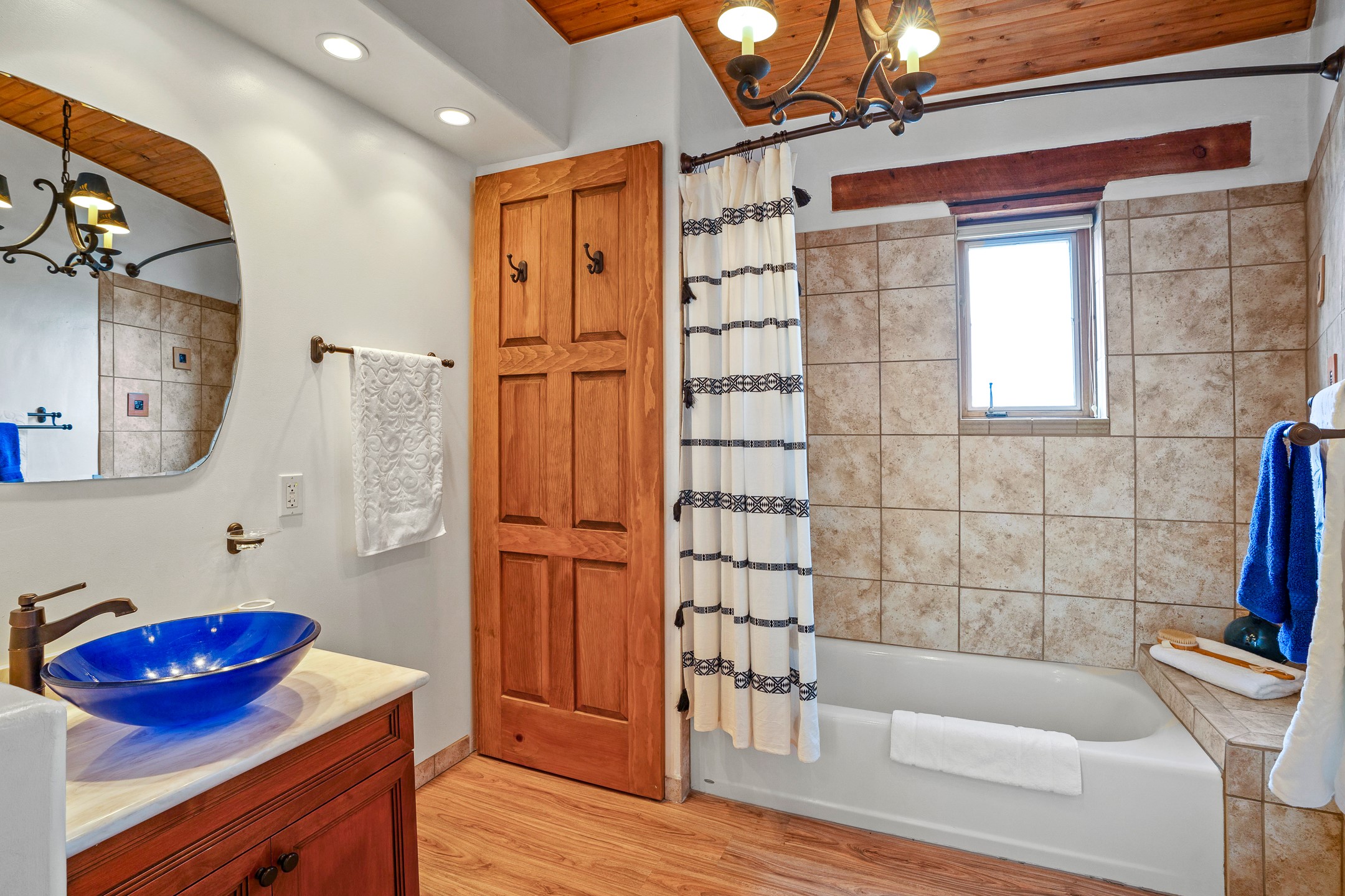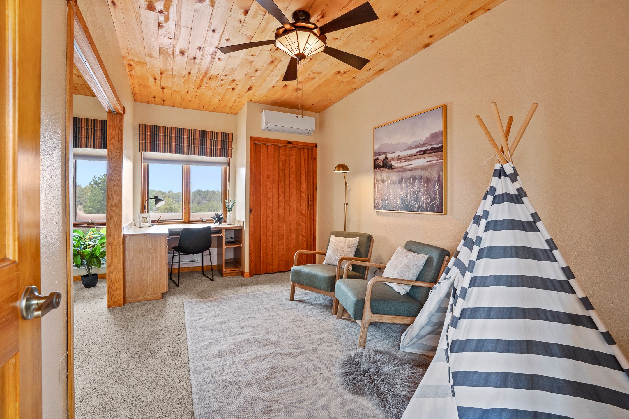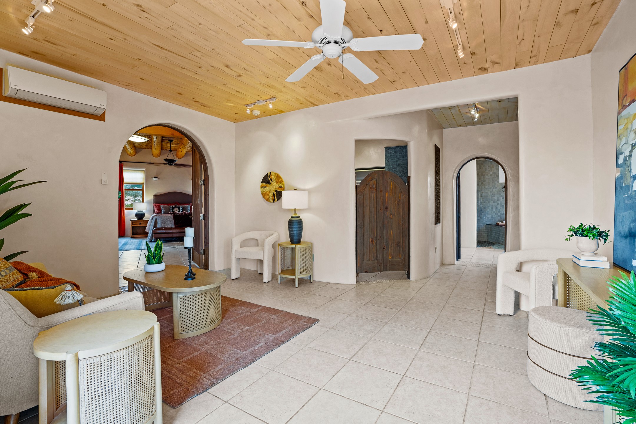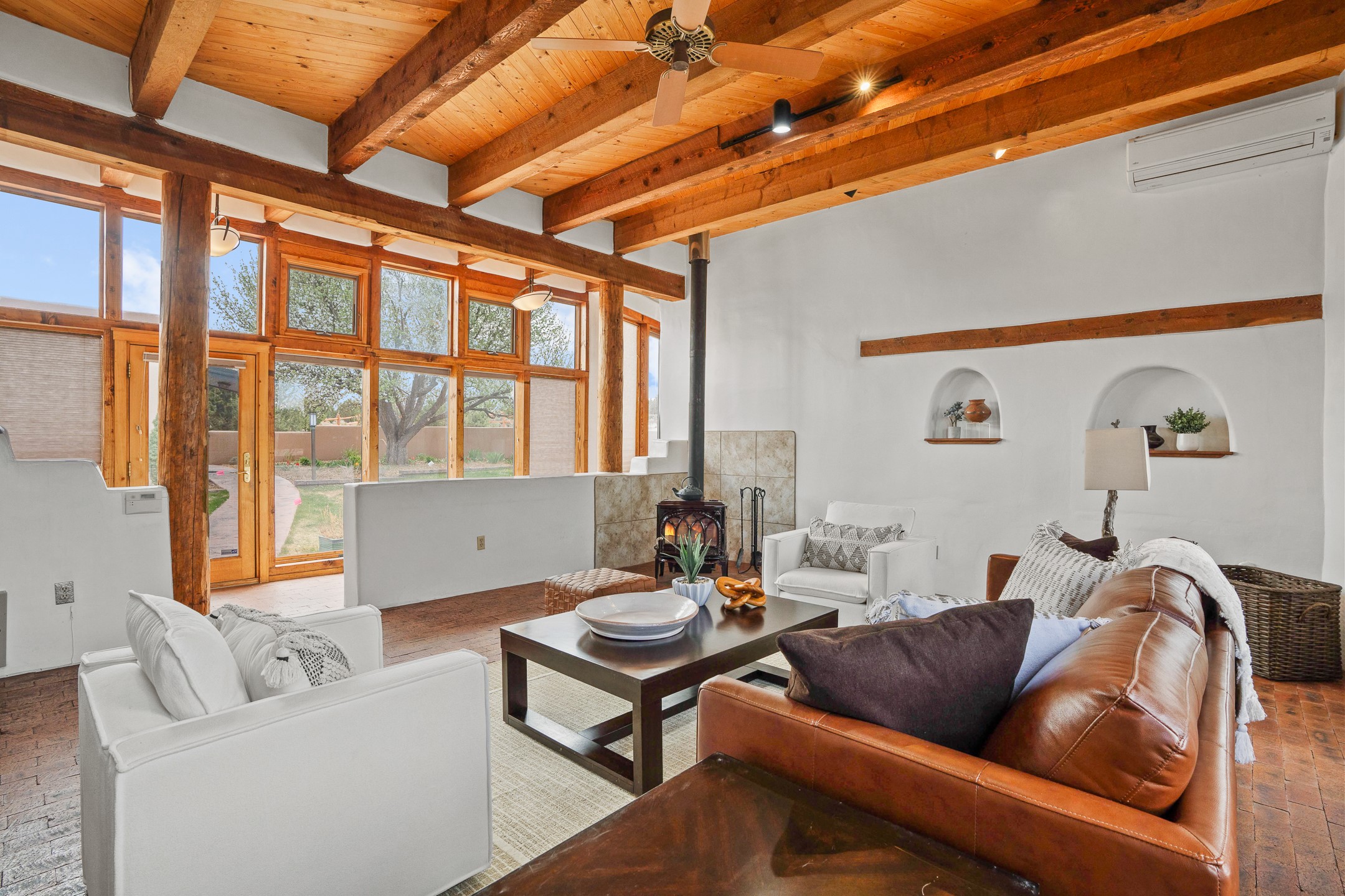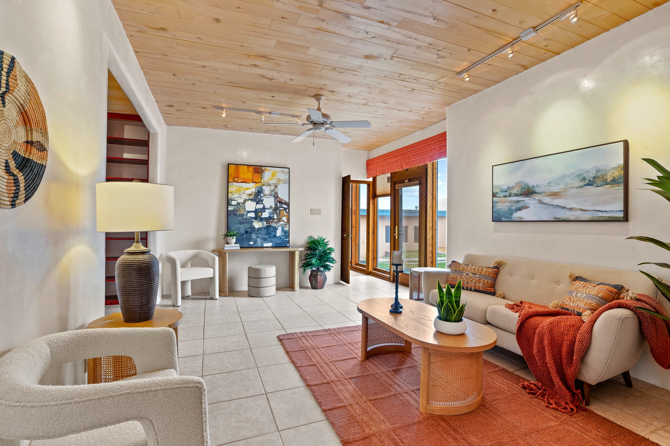 Adobe Masterpiece, Entertainer's Dream, 2.04 Acres Backing to County Land, 4917 Sq Ft, Living Room with Incredibly Stunning Views, High-End Finishes, Vigas, Beams, Kiva Fireplace, Extensive Professional Landscaping, Attached Casita, 575 Sq Ft Shop with Roll-Up, Mini-Split Cooling, Chicken Coop, Garden Beds, and More! Welcome to 155 Piedra Loop!This exquisite property caters to those with discerning taste. Situated on 2.04 acres backing to County land with White Rock Canyon just beyond, the property features 360 degree views, from the Jemez Mountains to the West, and the Sangre de Cristos to the East. The house features true adobe construction, enabling the architect to create curved walls for panoramic views while following the gentle contours of the land. The living room is the showcase room, with floor to ceiling windows providing you and your guests with expansive views over the back courtyard of the Sangre de Cristos. Brick floors, vigas, and exposed beams provide a classic Southwest ambiance, while the built-in bar with beer taps will keep your guests refreshed. The kitchen is ready to accommodate large gatherings and includes a large island with an induction cooktop and overhead vent, Wolf double ovens, a plate warmer, granite countertops, generous cabinet space, a serving window to the dining room, and a wide walkway to accommodate multiple chefs and servers. The primary suite is approximately 1200 sq ft and will serve as your private sanctuary. It includes a private office, laundry room, and sitting room, in addition to the large bedroom, cedar-finished walk-in closet, and bathroom. The primary bathroom includes dual vanities, a large tub, and a walk-in shower. A private courtyard is located off the master suite. The main courtyard leading to the home has been professionally landscaped, and features a number of trees, grass with automatic sprinklers, and the entrance to the attached casita. The casita features a bedroom and a bathroom. To the north of the main house sits a separate shop, which includes a roll-up door, space for two vehicles (in tandem), and a half bathroom. The back yard includes a dog kennel / chicken coop, established garden beds, and the back courtyard for entertaining guests outdoors while taking in views of the Sangres as the sun sets behind you. This property is truly special. The sellers plan to review offers on Tuesday, April 29, so schedule your showing today before this exquisite property is gone!