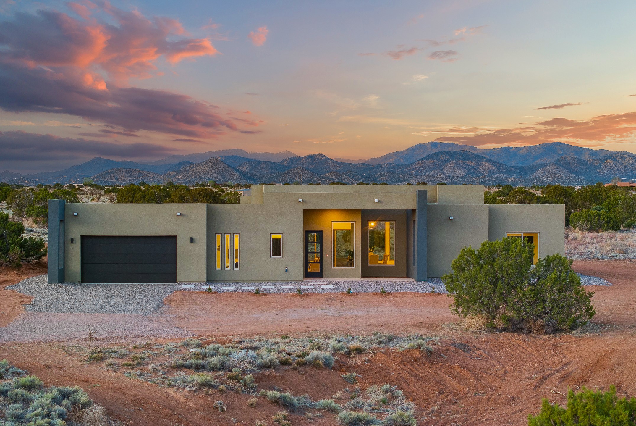 Just completed and ready for occupancy! One of the best view lots in the area. Mountain views from every window in this new custom built contemporary pueblo style home with open floor plan situated on a huge 12.50 +/- ac. private lot in Ceilo Tranquilo. Perfect for indoor and outdoor entertaining with 1000 square foot (50 x 20) back portal and over 200 square foot front portal. Open kitchen/family/dining room has floor to ceiling windows and double sliding glass doors to take in the fabulous views and access to the portal. The contemporary kitchen has a huge island bar and large walk in pantry. Home has all tile floors, high ceilings throughout and central a/c and heat. Owner's suite has large picture window with fabulous mountain views and sliding door to the portal. Owner's bath has double sinks, soaking tub and large walk in shower room with double shower heads and rain showers and a large walk in closet. Home features contemporary style vigas in living areas. Many extras including a bonus room that could be a mud room, office, studio or crafts room, oversized two car garage with extra storage space. This home has it all; new home, fabulous views, great outdoor spaces, contemporary open floor plan, large private lot that allows horses and additional structures. Easy access to all the shopping and dining and near all the outdoor activities. $4000 appliance credit for range, dishwasher and microwave.