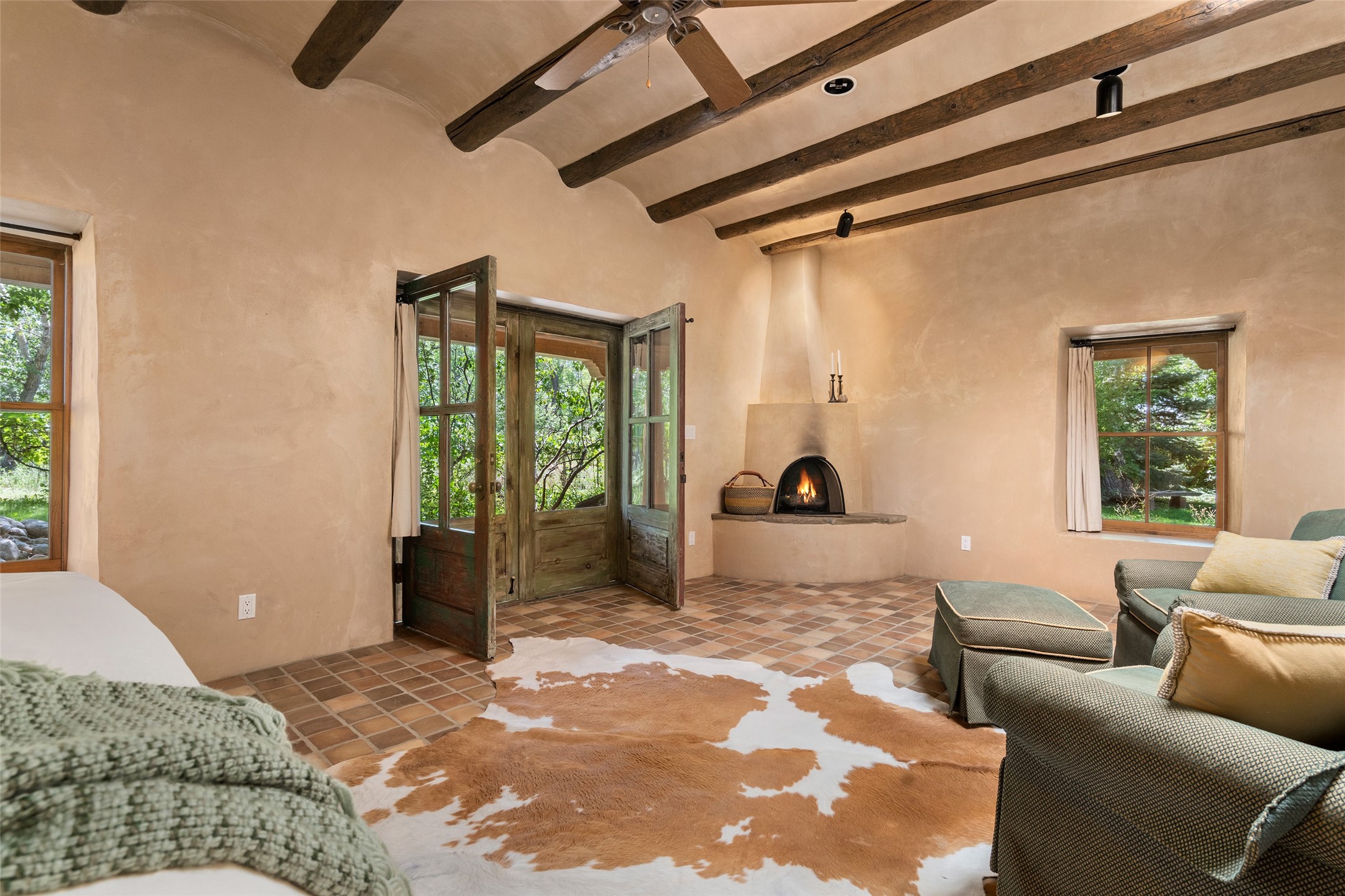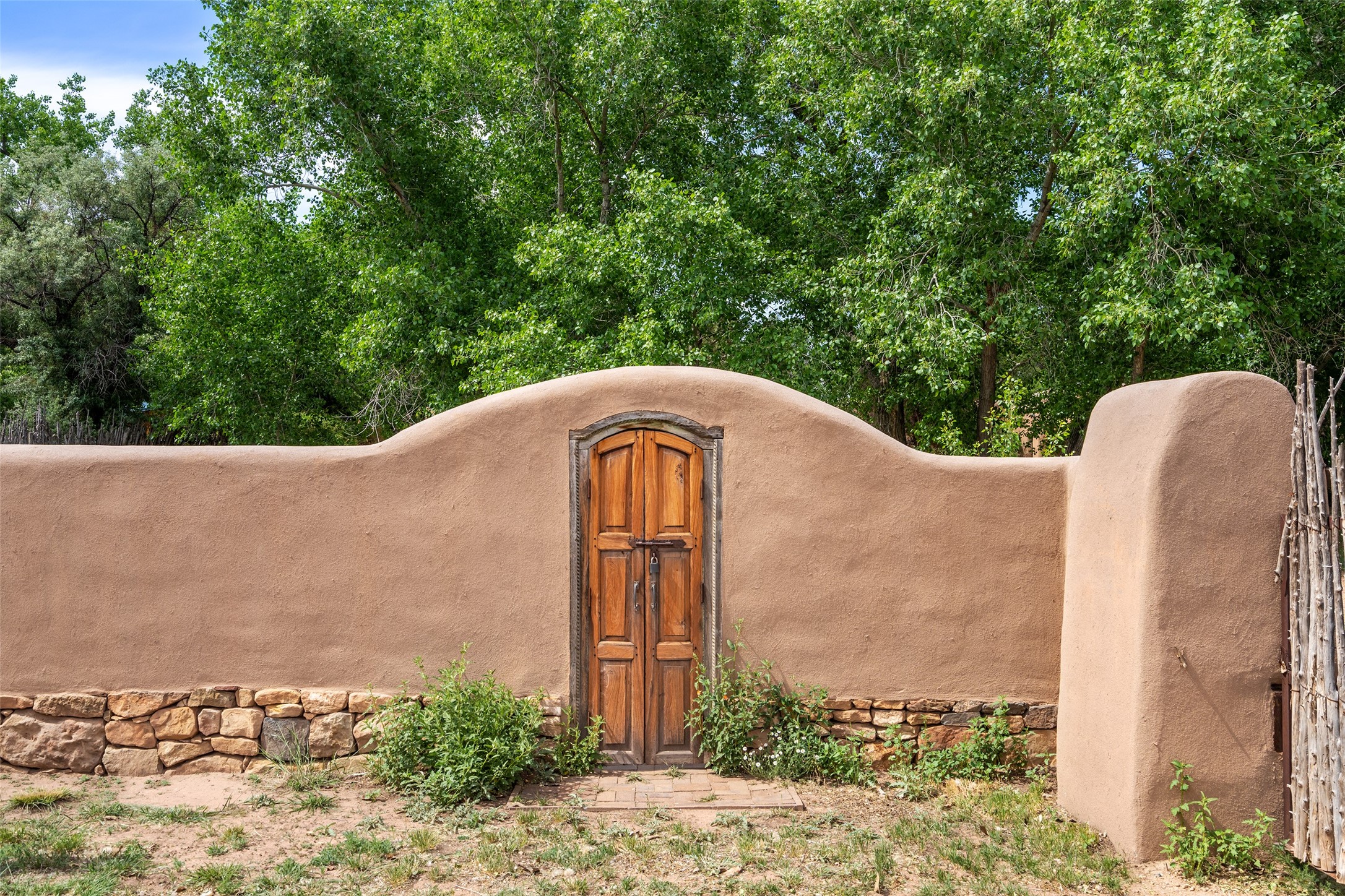 Historic Adobe Oasis on the Galisteo CreekCreate your own paradise along the Galisteo Creek. This stunning 6.39 acre estate offers a compelling blend of historic character, traditional craftsmanship, and natural beauty. A renovated 2 bed, 2 bath double adobe main residence, and a charming 1 bedroom, 1 bath guest quarters create a private compound offering the best of old and new in the heart of one of New Mexico's most storied villages, all a mere 30 minute drive from Santa Fe.The main home features 2 bedrooms and 2.5 baths, showcasing hand-plastered walls, vigas, latillas, deep adobe walls, high ceilings and wood-burning fireplaces that reflect the architectural heritage of the area, enhanced by historic ruins on the property dating back to 1880. Thoughtful renovations and preservation work ensure modern comfort while honoring the property's authenticity.Residents and guests will appreciate the privacy of the split floor plan, with the two bedroom suites separate and serene, each featuring their own cozy fireplace and en suite bath. The large kitchen boasts an equally large butlers pantry. It's a generous amount of space allowing for a multifaceted culinary experience. Set beneath majestic cottonwoods in a park-like setting, surrounded by lush irrigated landscaping, the grounds are verdant with fruit trees and flower gardens. Proximity to the Galisteo Creek enhances the sense of abundance and connection, with expansive portals and shaded outdoor spaces ideal for quiet retreat or entertaining.The separate guest house offers its own living space with a kitchenette and bath, ideal for hosting guests or tenants. It has also been used as an artist studio as the concrete floors allow for being creative. There is a large barn door that opens out to a small porch perfect for a lovely evening dinner. Experience this rare, water-adjacent adobe property in an artistic community full of heritage and natural splendor.