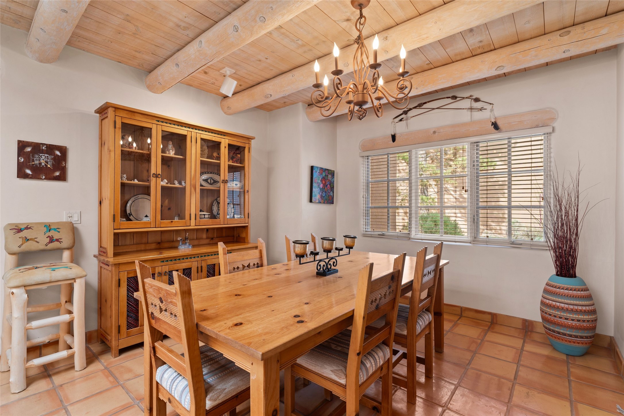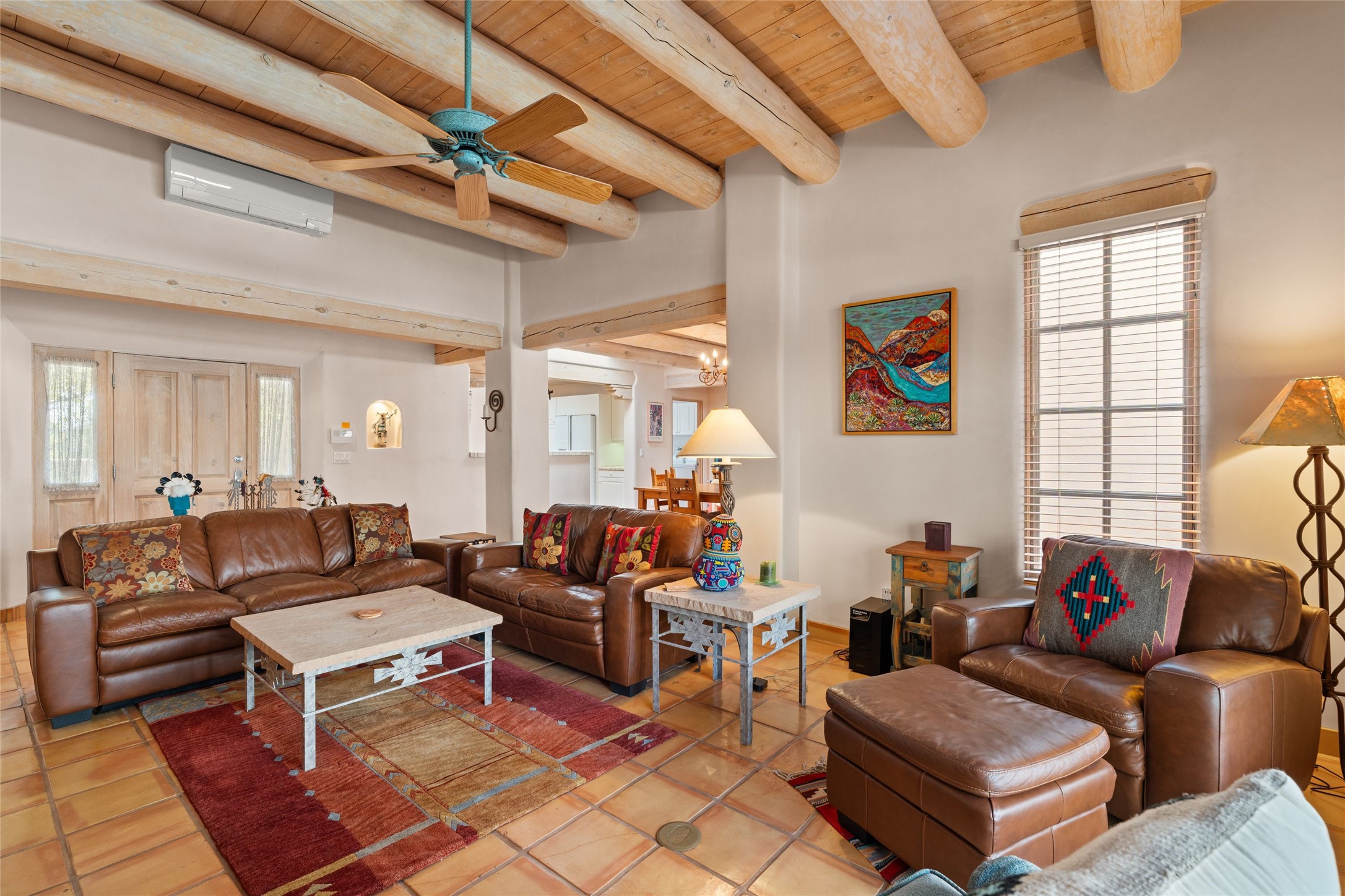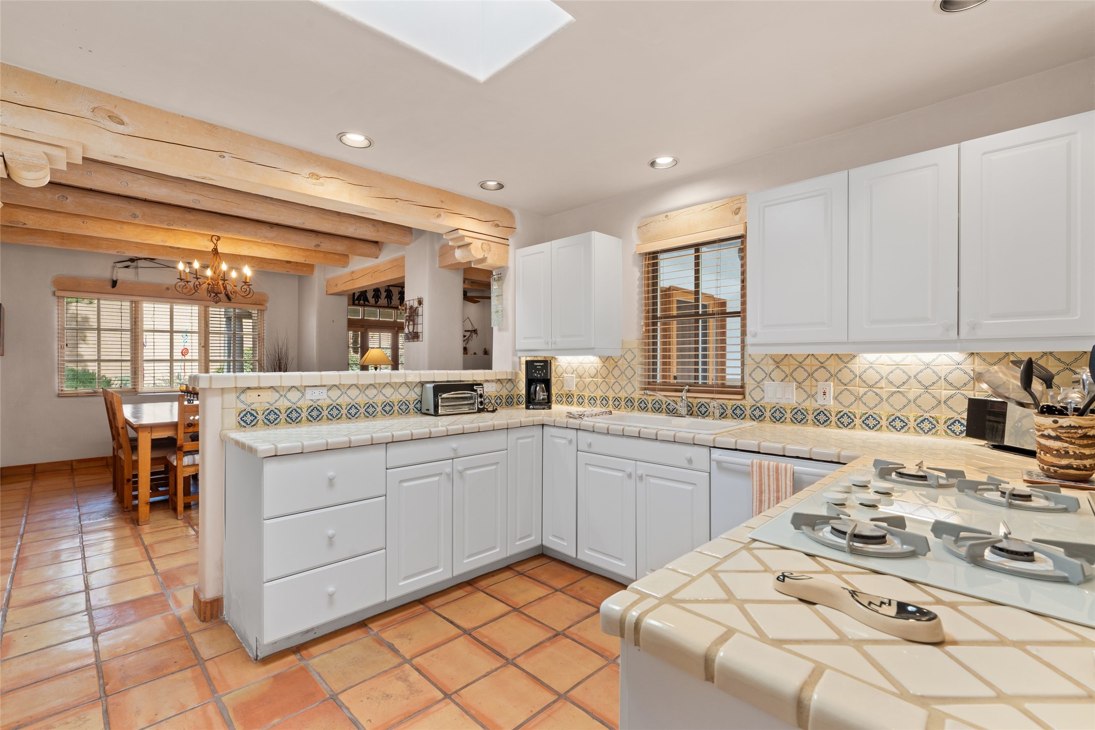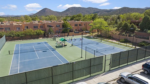 Classic Quail Run Pinon B with delightful outdoor spaces, charming Santa Fe style and an ideal floorplan. Enter through the spacious front courtyard which showcases views of the first green and those fabulous sunsets. The home will greet you with Saltillo floors, open living and optimal separation of bedrooms. Light filled kitchen nook compliments a spacious kitchen which extends to an alluring dining and living area. Sizable primary bedroom features a wood burning Kiva and opens to an ample back portal with lovely high desert landscape. Located on a quiet cul de sac in the midst of Santa Fe's premier condominium resort. Ownership at Quail Run includes 24 hour hosted security, beautiful grounds, state of the art gym and pool, multiple fitness classes, engaging 9 hole golf course, pickleball, tennis and much more. Come and experience!