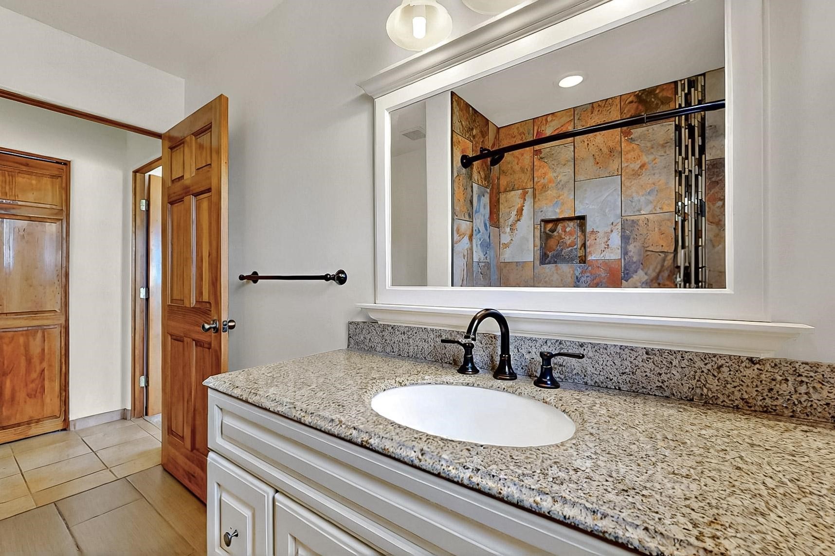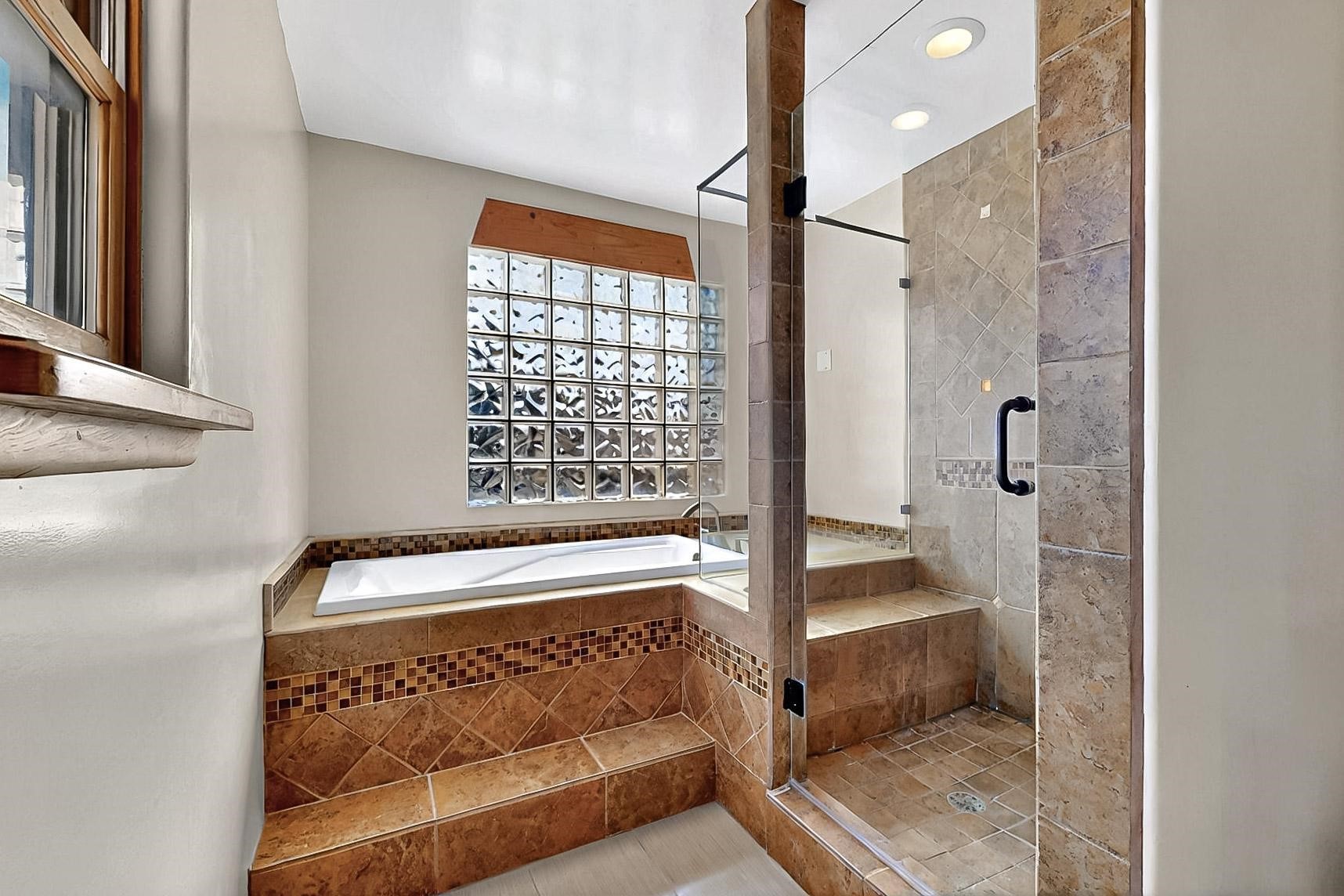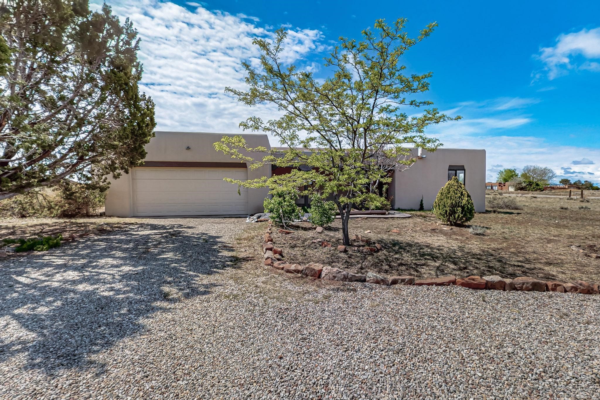 Contemporary pueblo custom built home in move in condition, extremely well maintained. High ceilings create a spaciousness in this 2115 sq.ft, split 3 bedroom plus small office, 2 full bath home. A new silicone roofing system was installed in 2019, new radiant boiler, new zones and new hot water heater in 2017, windows and stucco maintained, garden wall was re stuccoed in 2023, the private well was inspected and electrical upgraded in 2017. Both front and rear portal support beams and some woodwork have been replaced, and the front paved area replaced. Located on a large 1.8acre corner lot, there is a 2 car garage accessed by a circular driveway with plenty of parking, and big privately walled rear garden and portal for entertaining sunsets and the night sky. Just off a paved road, it is within easy reach of all Eldorado amenities, local shopping, schools, library, senior center and minutes into Santa Fe.