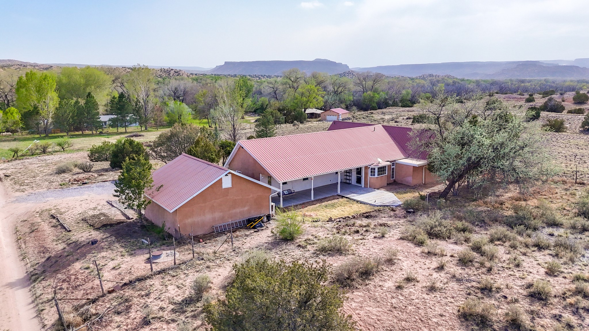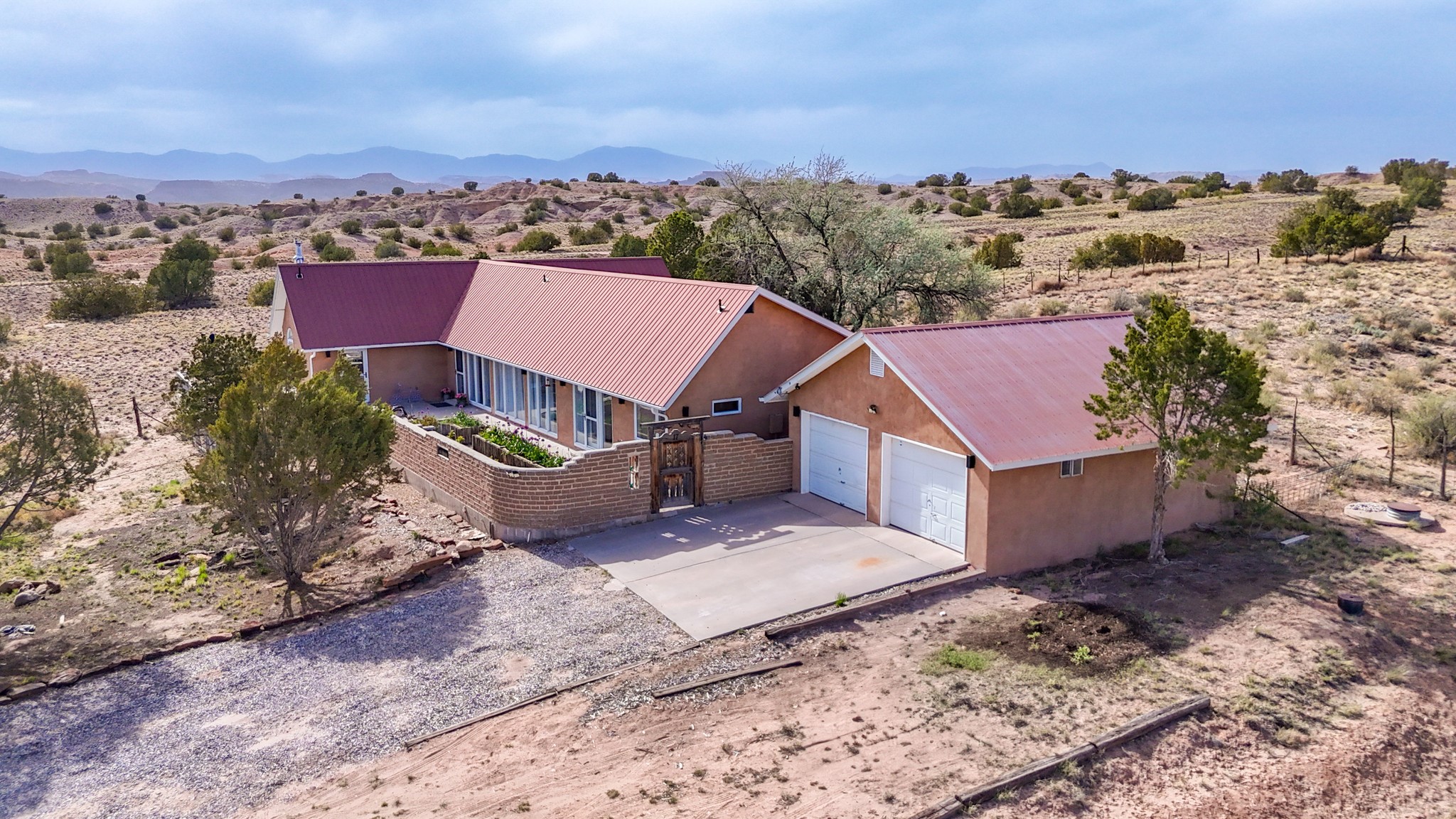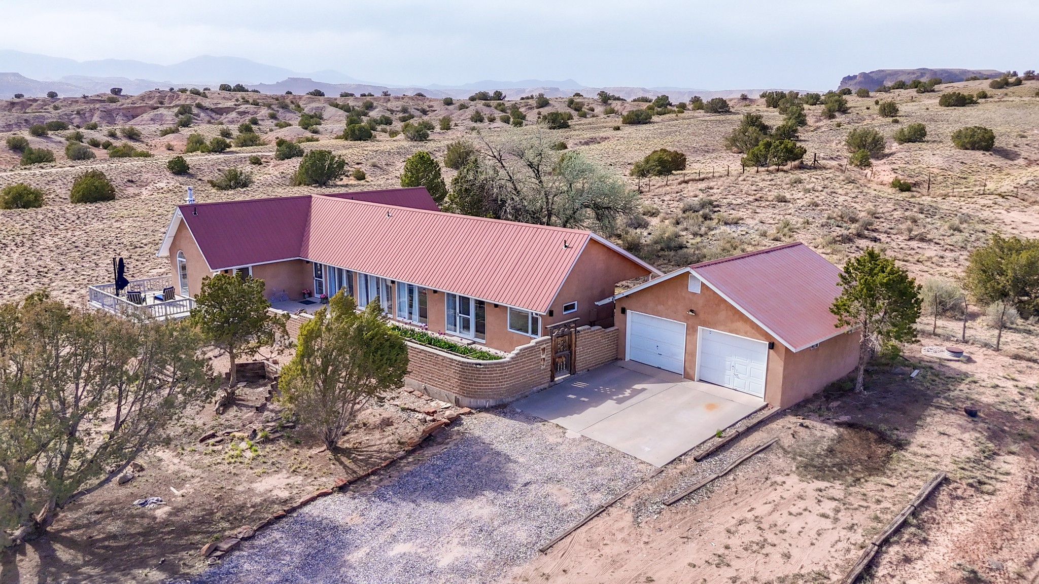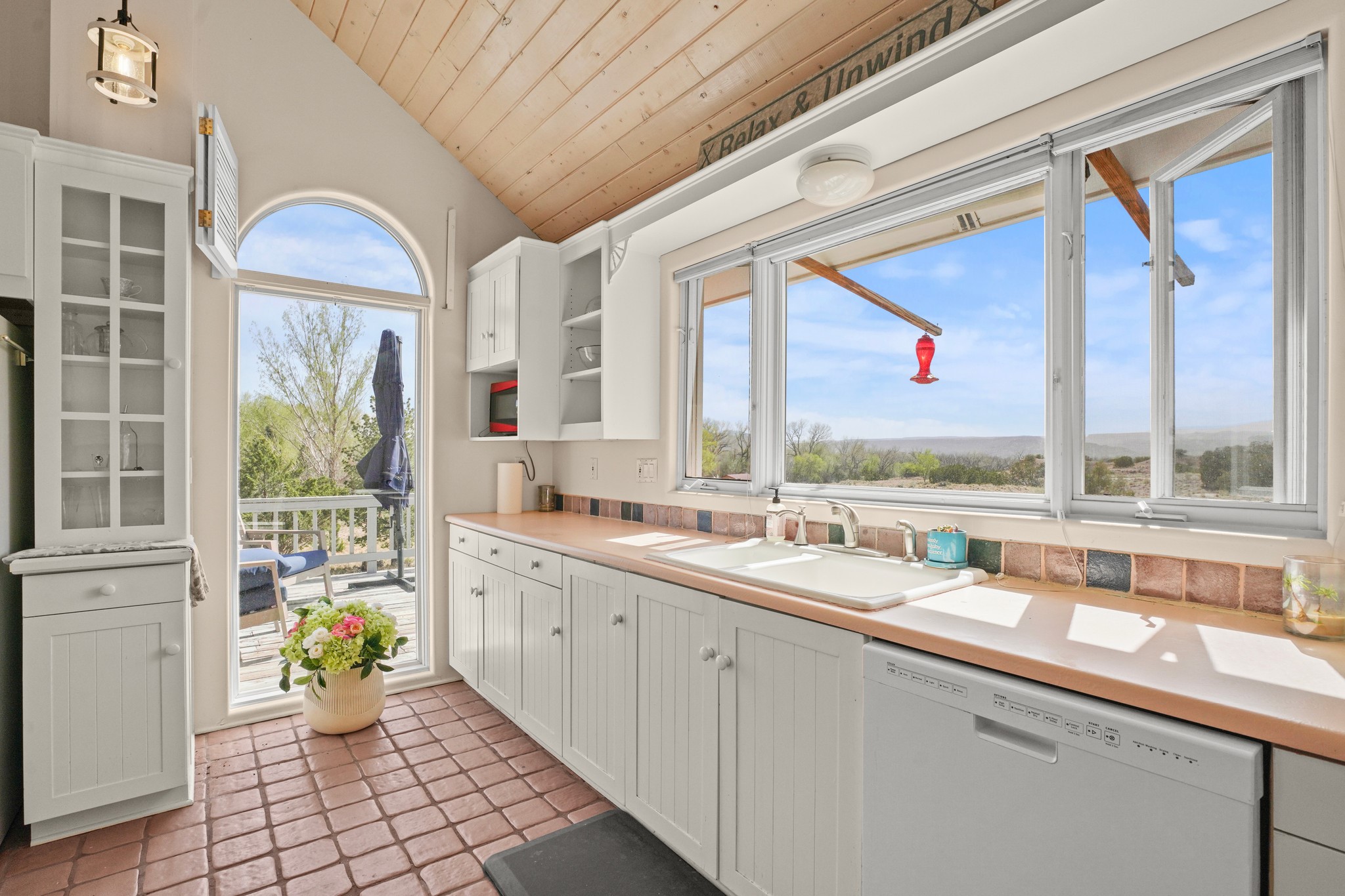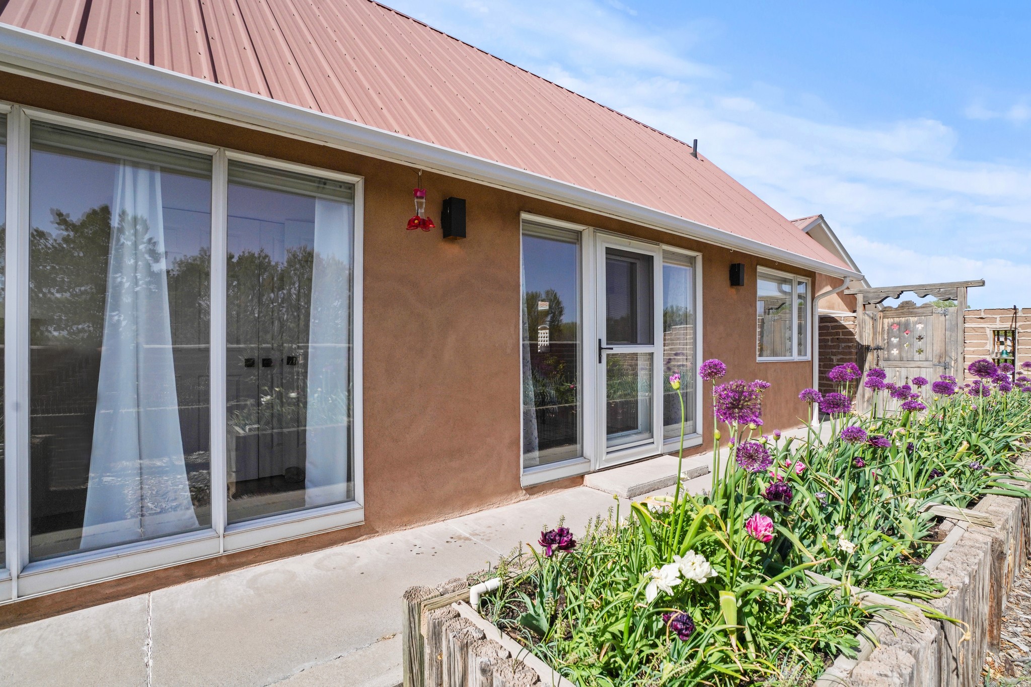Peace and Tranquility coupled with views are added features to this custom, passive solar home. As you pull into this 3/4 acres property, you are met with a 2 car garage, and an adobe wall that welcomes you into the courtyard garden leading to the front door. This home boasts pitched, high ceilings with blonde T&G planks and large windows which make this home fill with light. The three bedrooms are generous in size and one is currently used as an exercise room. There are 2 bathrooms, and the primary suite bath has a large window to take in the view. The land abuts the San Ildefonso Pueblo with unobstructed sunset views of the Jemez mountains and Pajarito Plateau. Recent updates include an energy efficient 2 ton mini split system for auxiliary heating in winter and cooling in summer 2024, new propane water heater 2022, upgrade to the zone system of the boiler for radiant floor heating system 2022. This property is country living with an easy drive to Los Alamos, Santa Fe and Espanola.