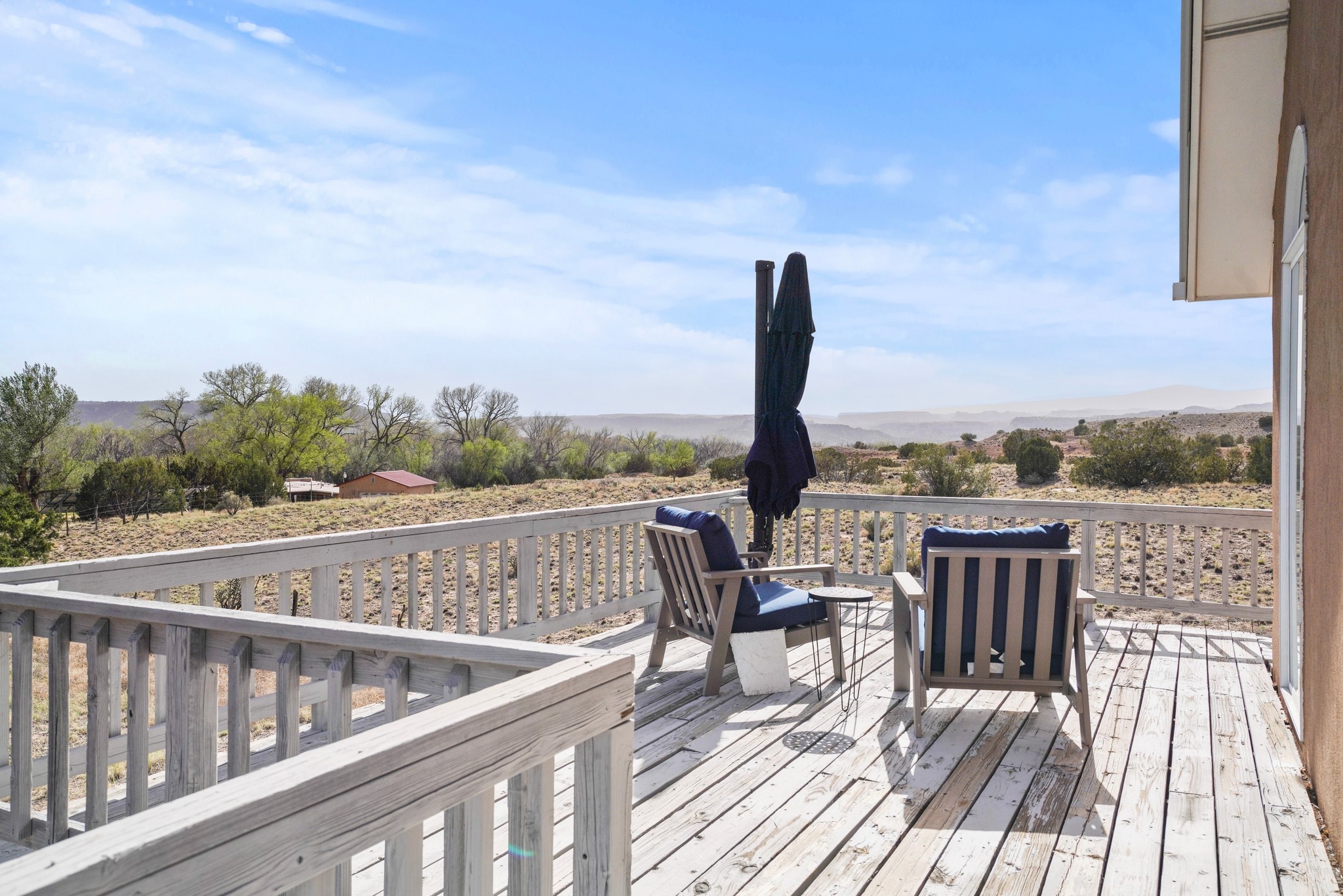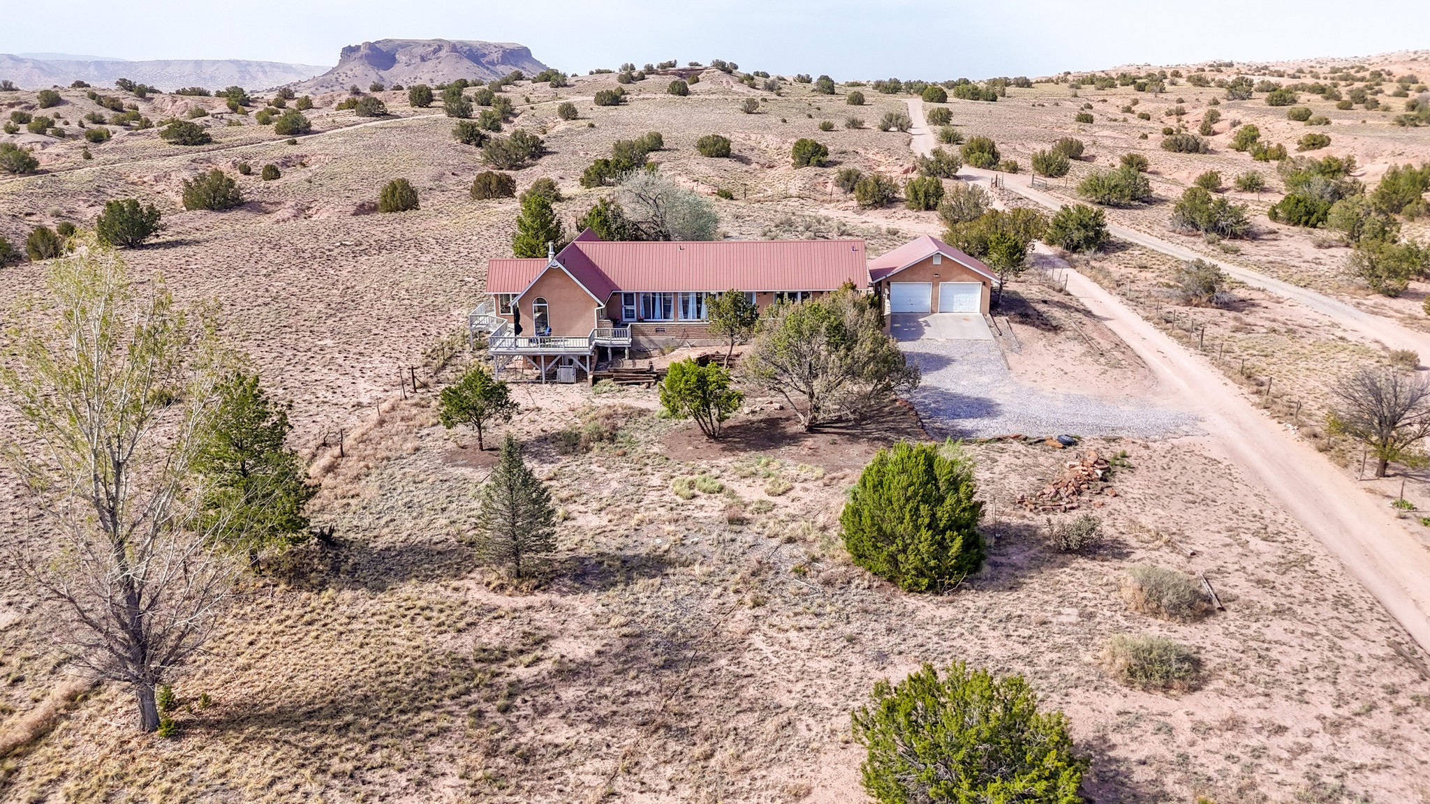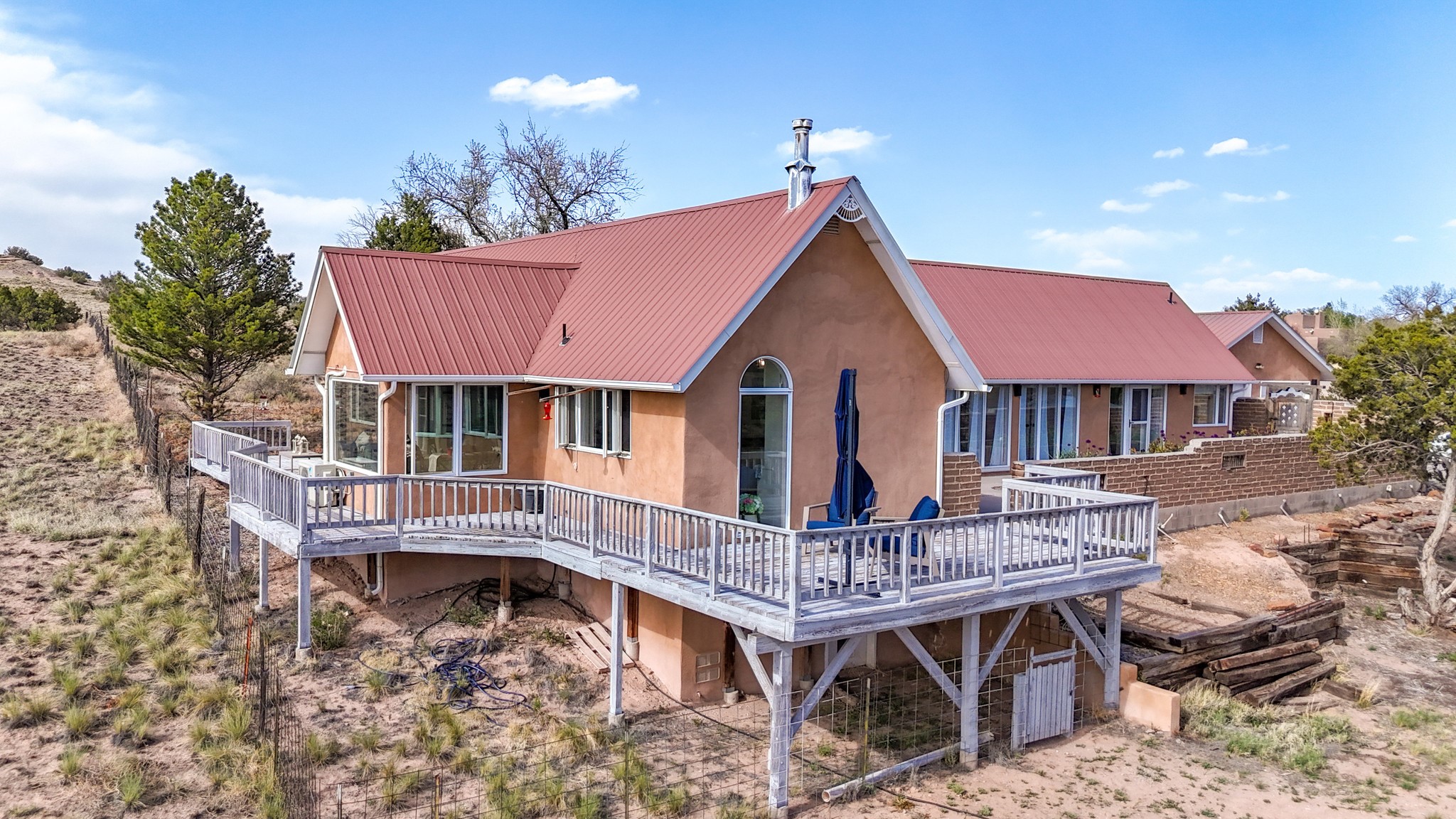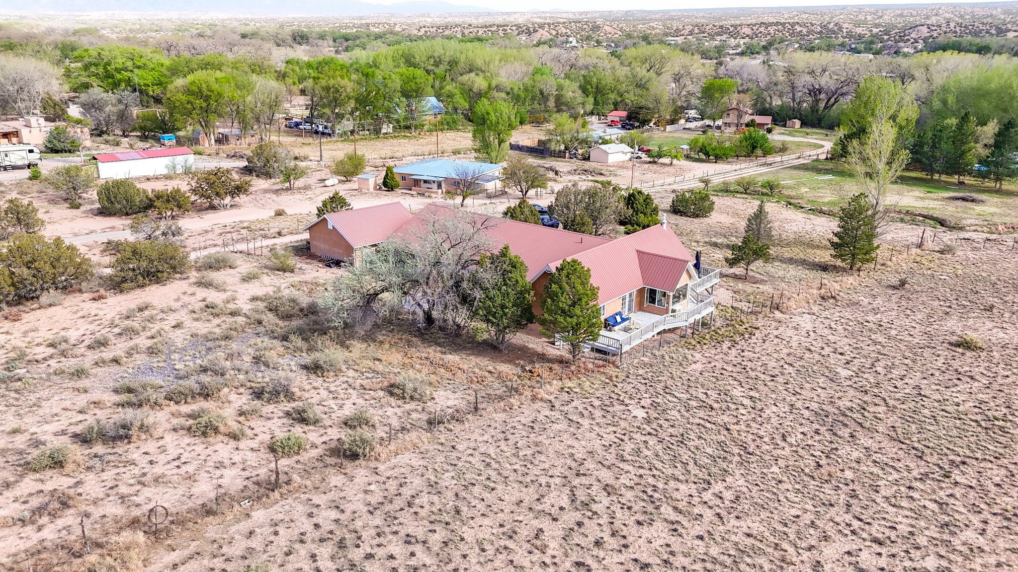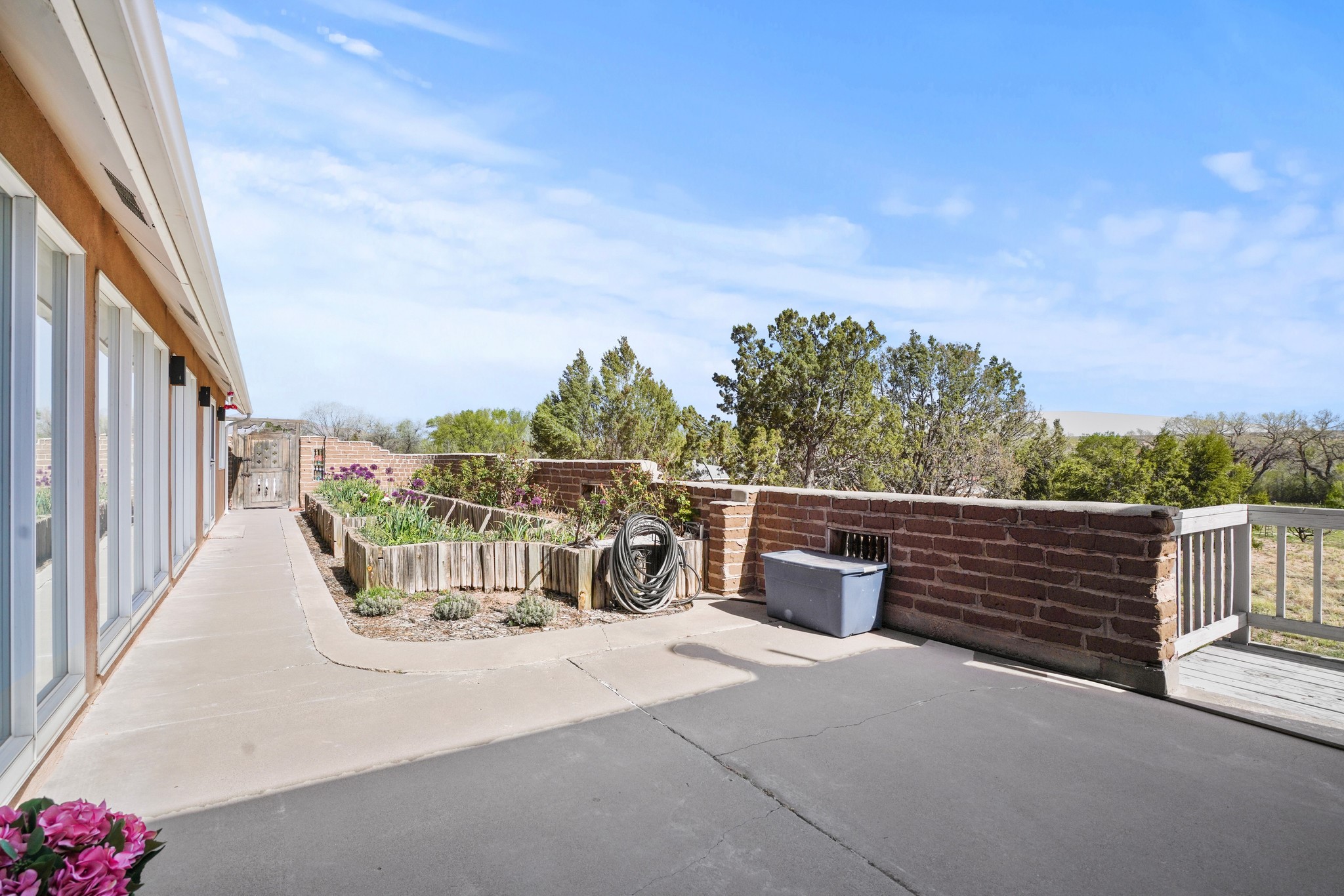 Peace and Tranquility coupled with views are added features to this custom, passive solar home. As you pull into this 3/4 acres property, you are met with a 2 car garage, and an adobe wall that welcomes you into the courtyard garden leading to the front door. This home boasts pitched, high ceilings with blonde T&G planks and large windows which make this home fill with light. The three bedrooms are generous in size and one is currently used as an exercise room. There are 2 bathrooms, and the primary suite bath has a large window to take in the view. The land abuts the San Ildefonso Pueblo with unobstructed sunset views of the Jemez mountains and Pajarito Plateau. Recent updates include an energy efficient 2 ton mini split system for auxiliary heating in winter and cooling in summer 2024, new propane water heater 2022, upgrade to the zone system of the boiler for radiant floor heating system 2022. This property is country living with an easy drive to Los Alamos, Santa Fe and Espanola.