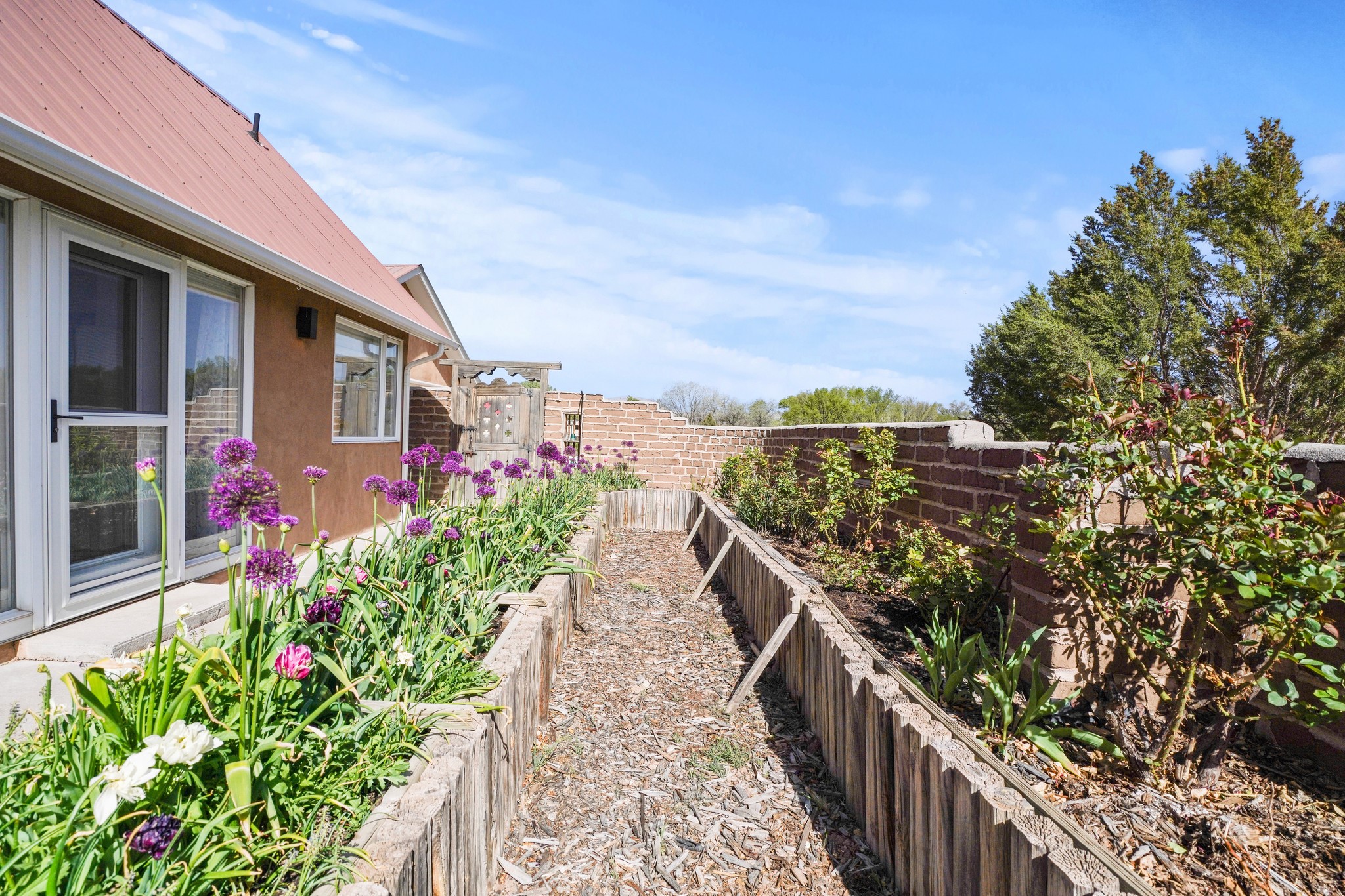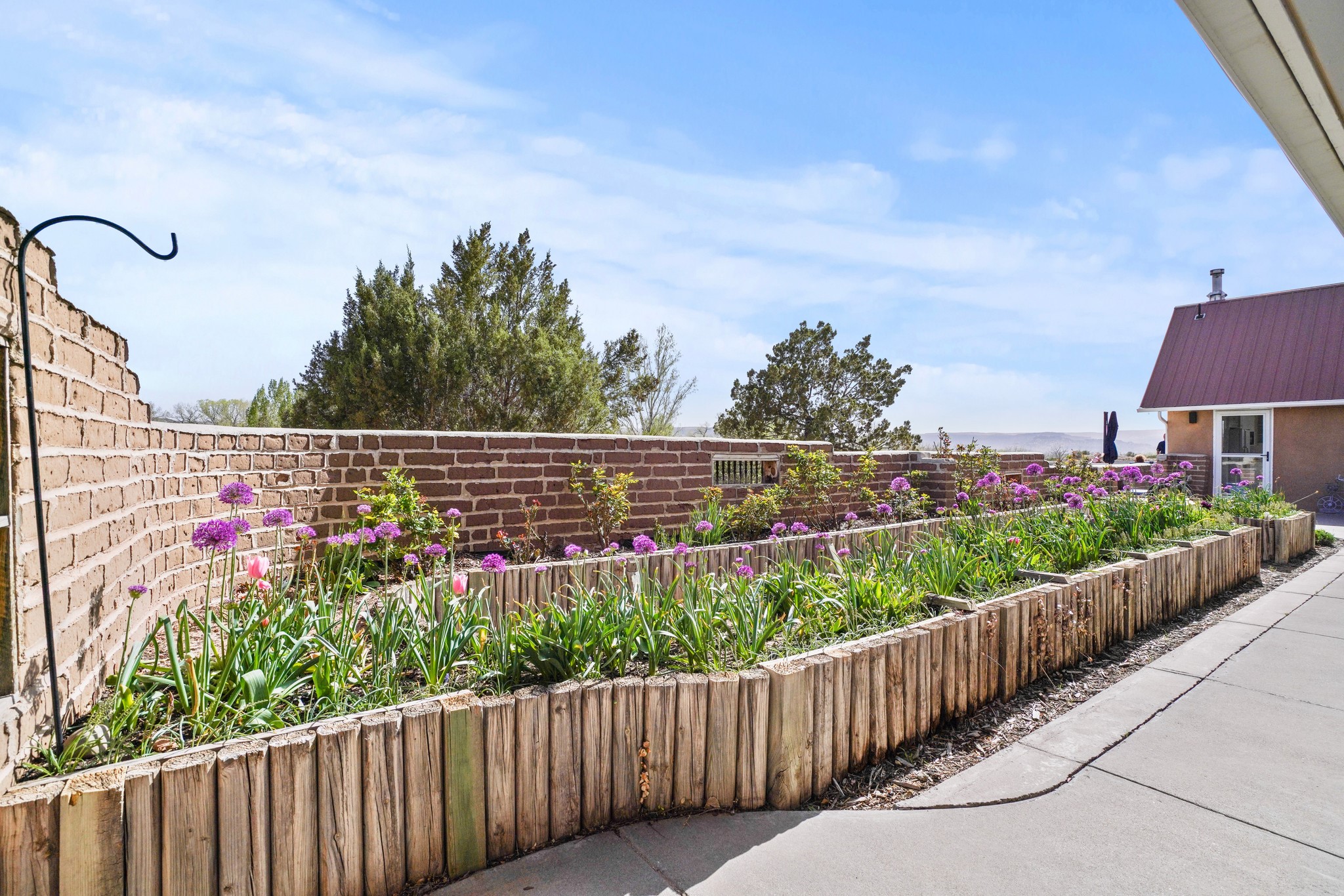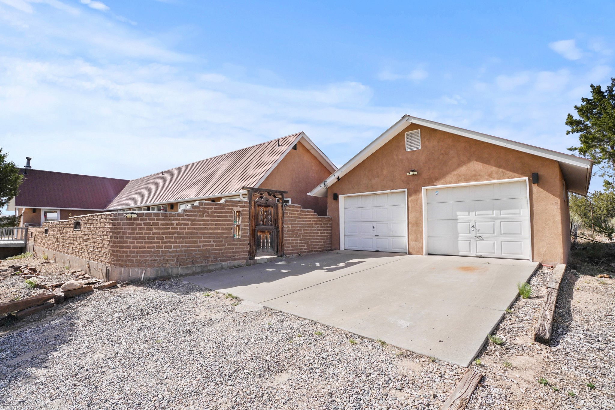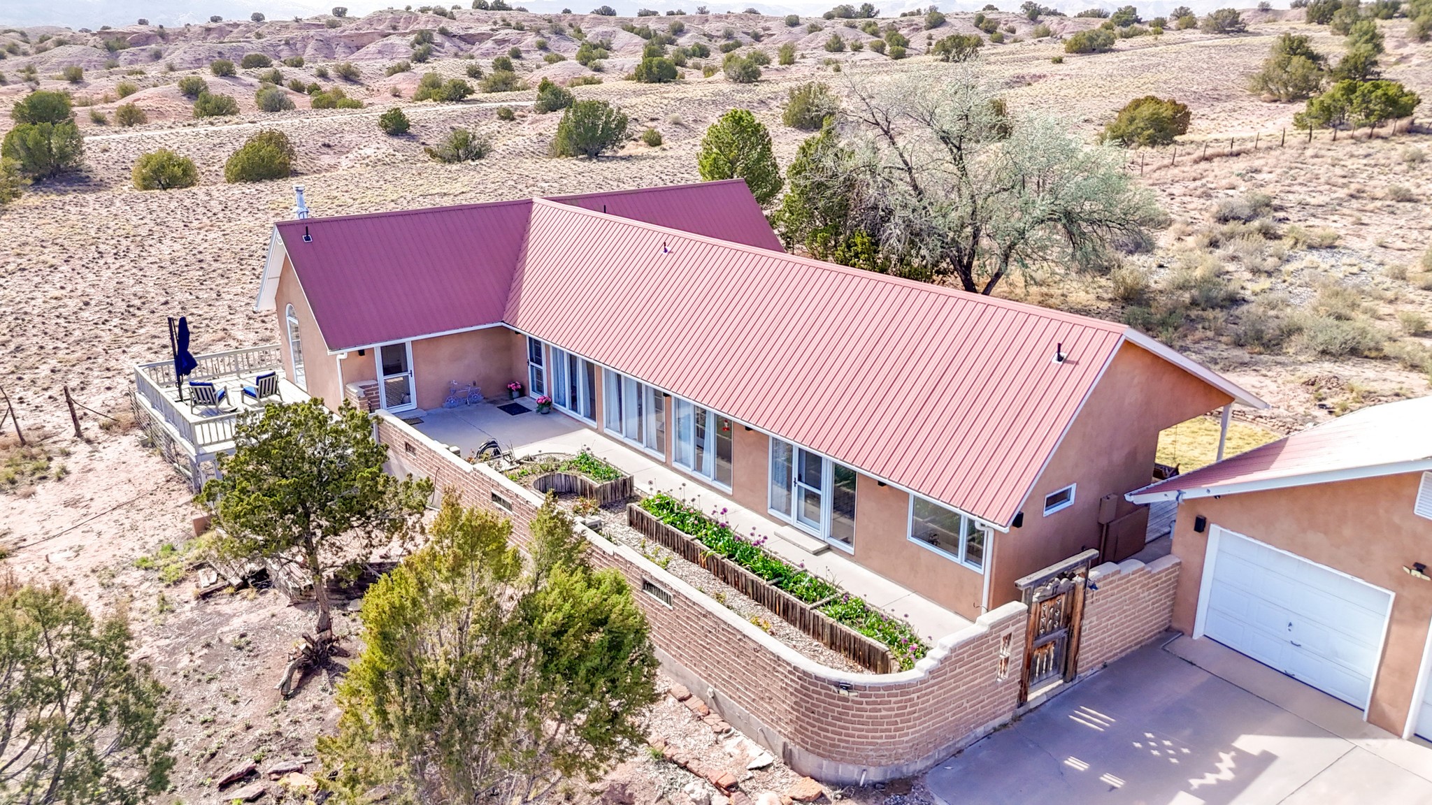 Peace and Tranquility coupled with views are added features to this custom, passive solar home. As you pull into this 3/4 acres property, you are met with a 2 car garage, and an adobe wall that welcomes you into the courtyard garden leading to the front door. This home boasts pitched, high ceilings with blonde T&G planks and large windows which make this home fill with light. The three bedrooms are generous in size and one is currently used as an exercise room. There are 2 bathrooms, and the primary suite bath has a large window to take in the view. The land abuts the San Ildefonso Pueblo with unobstructed sunset views of the Jemez mountains and Pajarito Plateau. Recent updates include an energy efficient 2 ton mini split system for auxiliary heating in winter and cooling in summer 2024, new propane water heater 2022, upgrade to the zone system of the boiler for radiant floor heating system 2022. This property is country living with an easy drive to Los Alamos, Santa Fe and Espanola.