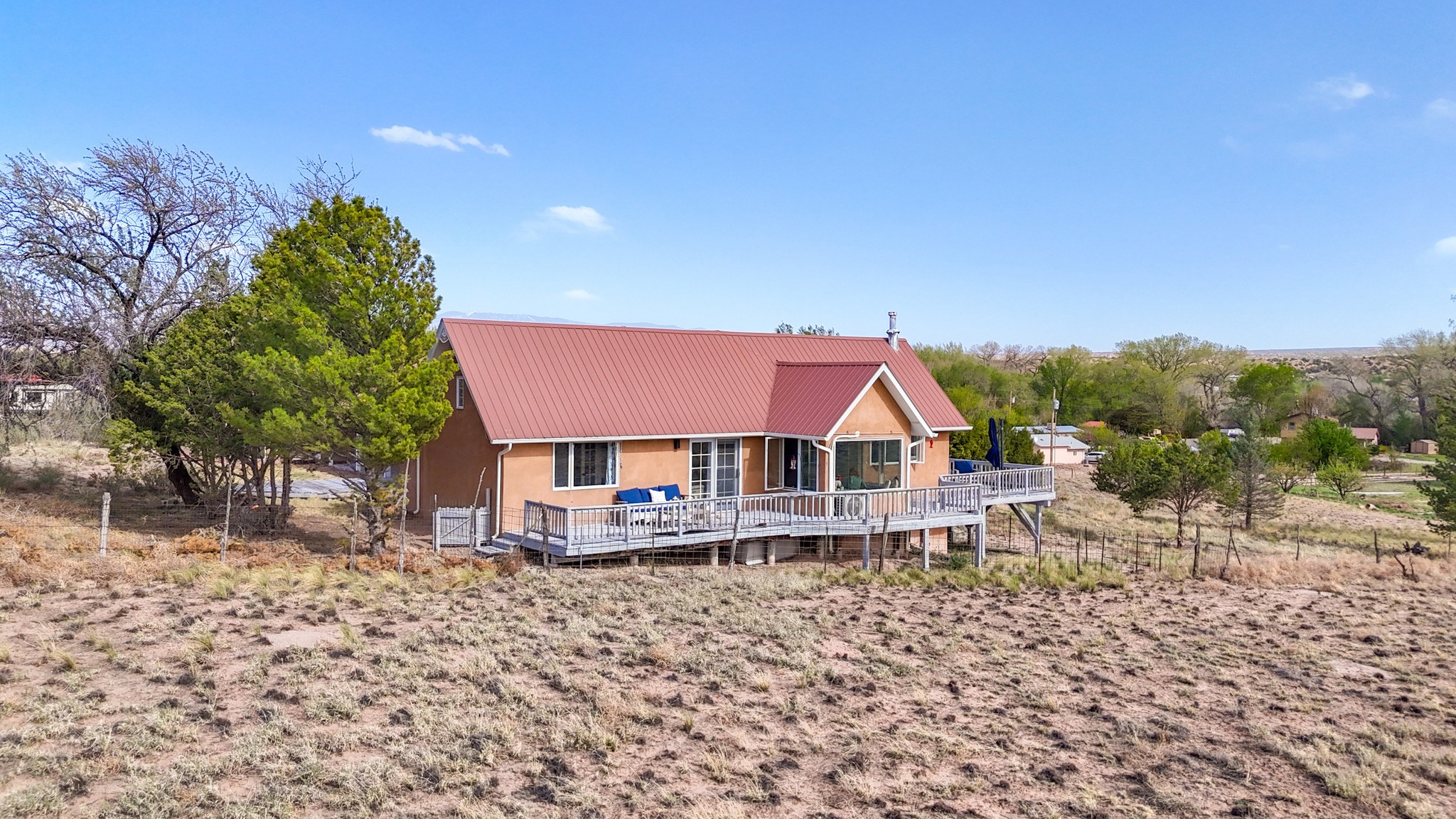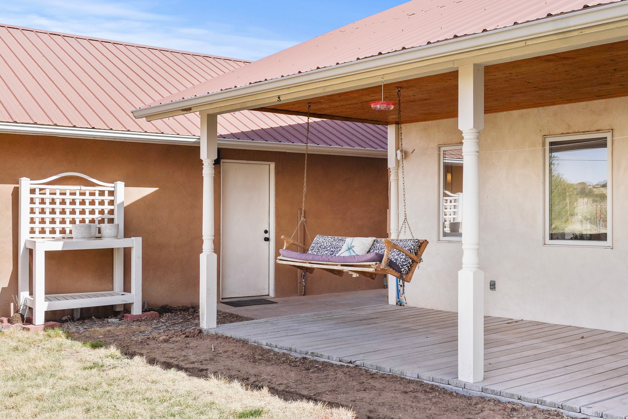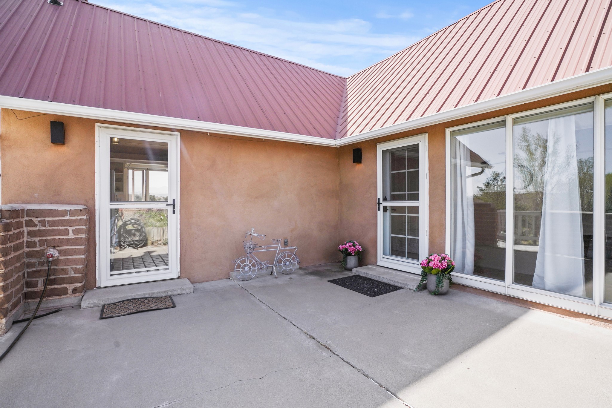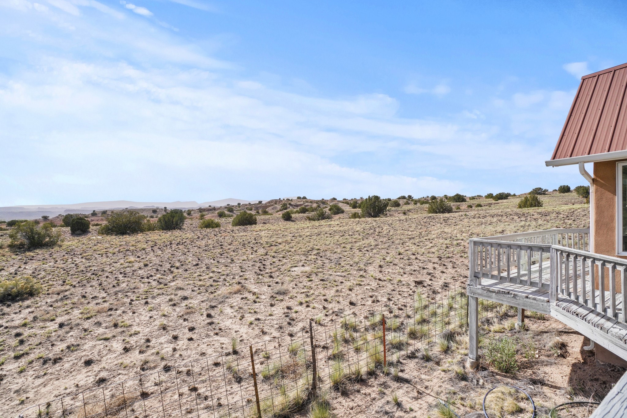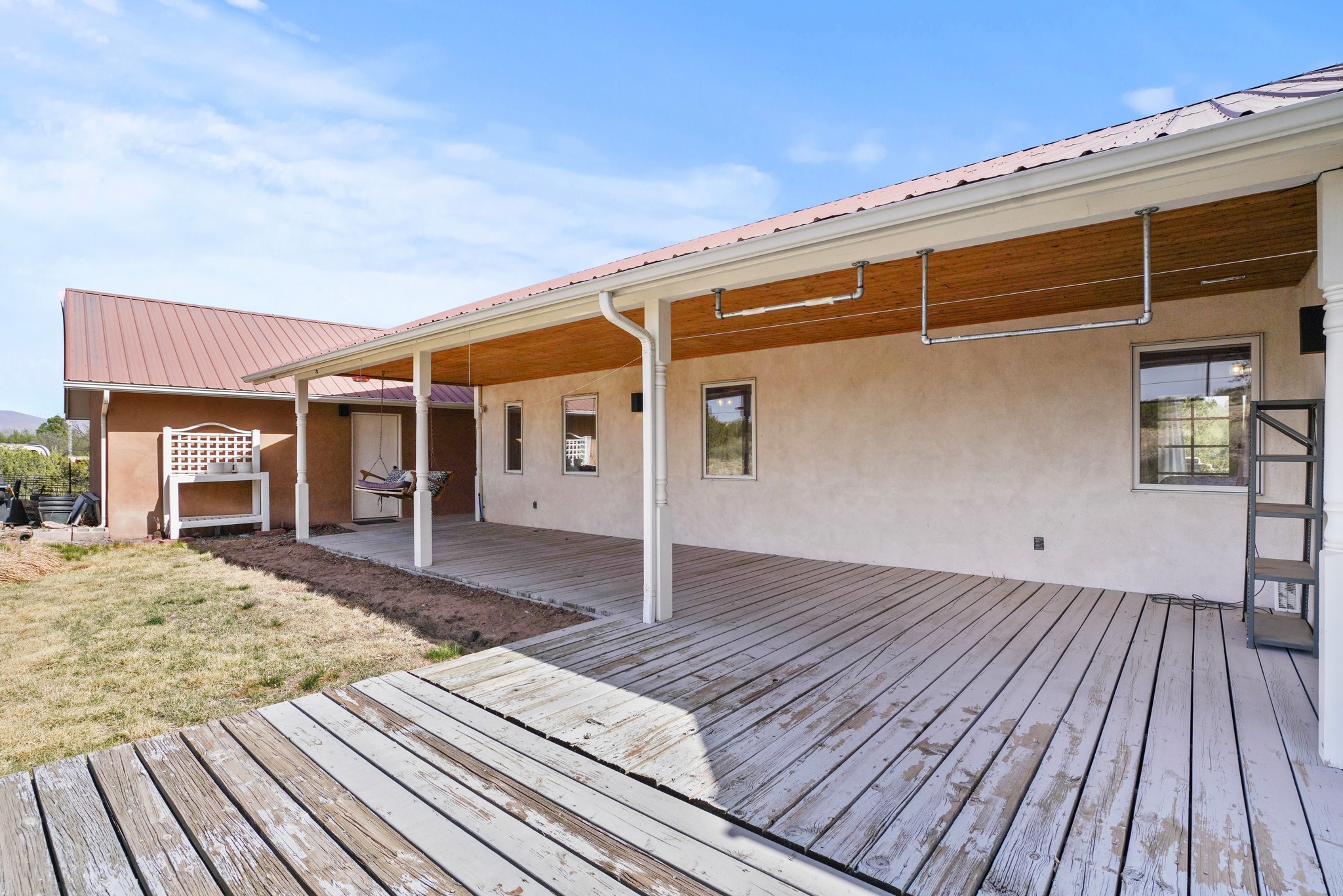 Peace and Tranquility coupled with views are added features to this custom, passive solar home. As you pull into this 3/4 acres property, you are met with a 2 car garage, and an adobe wall that welcomes you into the courtyard garden leading to the front door. This home boasts pitched, high ceilings with blonde T&G planks and large windows which make this home fill with light. The three bedrooms are generous in size and one is currently used as an exercise room. There are 2 bathrooms, and the primary suite bath has a large window to take in the view. The land abuts the San Ildefonso Pueblo with unobstructed sunset views of the Jemez mountains and Pajarito Plateau. Recent updates include an energy efficient 2 ton mini split system for auxiliary heating in winter and cooling in summer 2024, new propane water heater 2022, upgrade to the zone system of the boiler for radiant floor heating system 2022. This property is country living with an easy drive to Los Alamos, Santa Fe and Espanola.