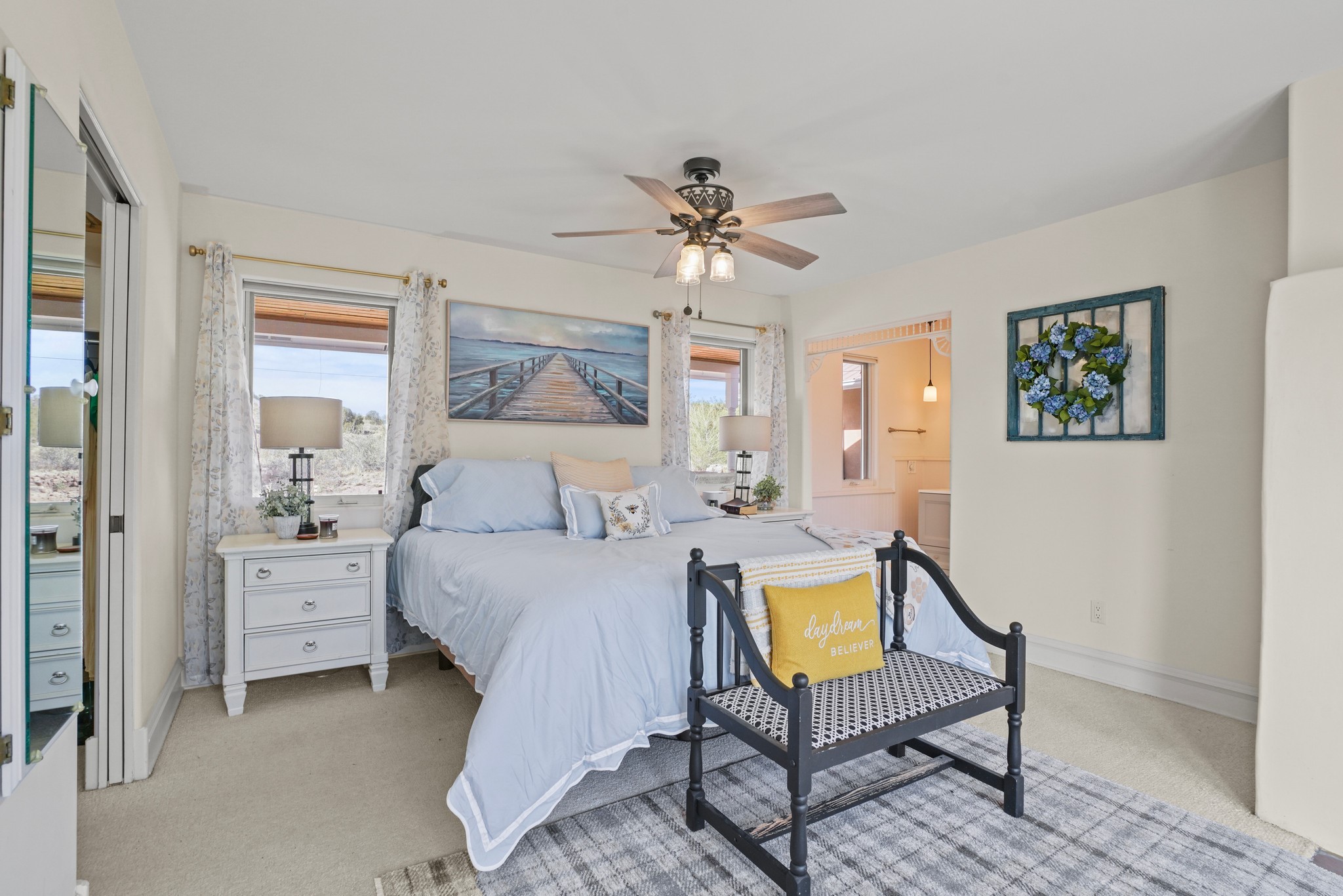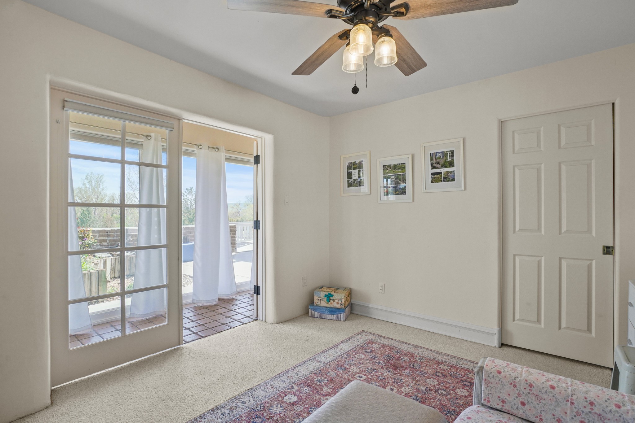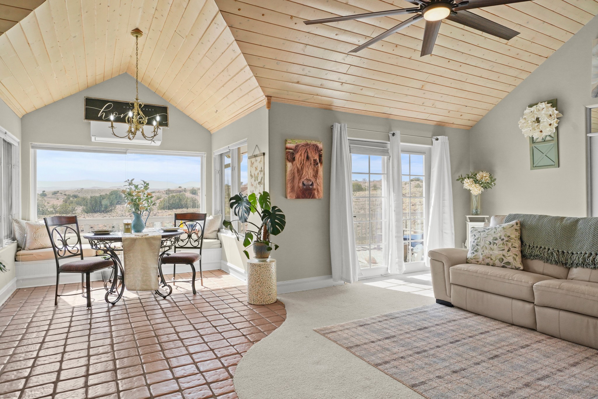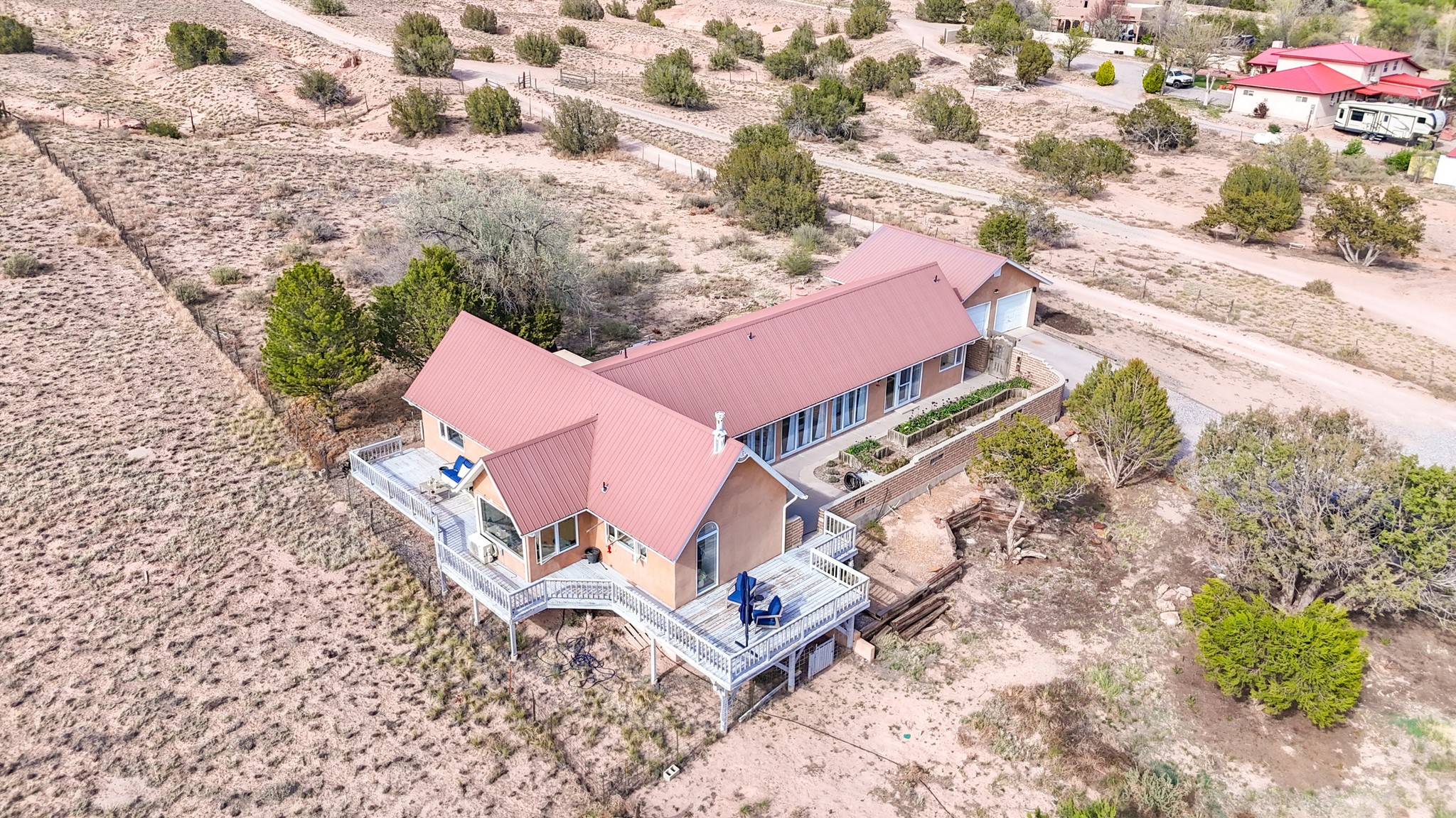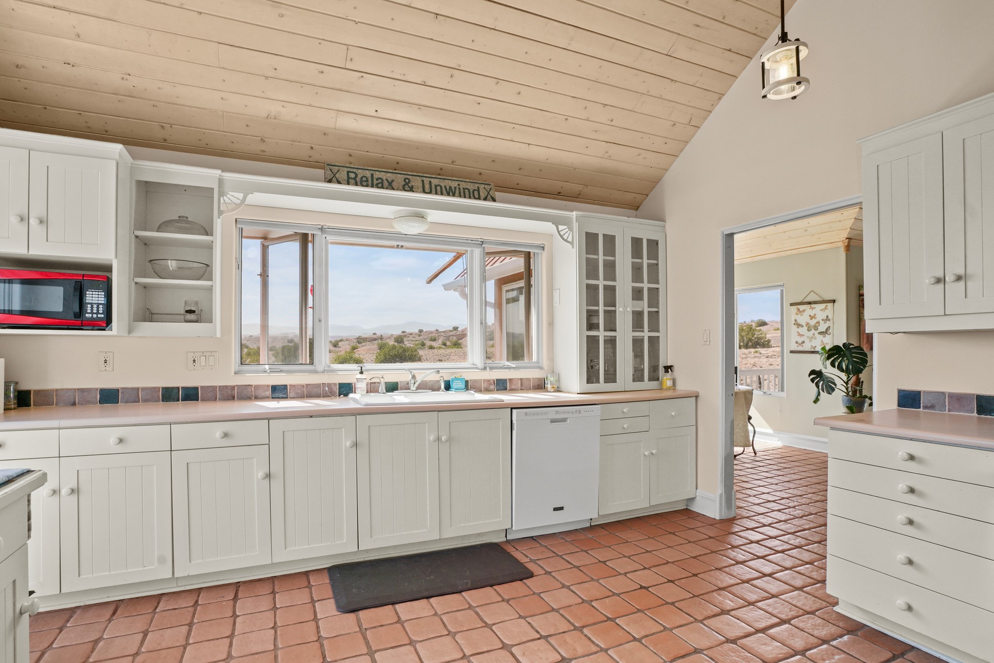 Peace and Tranquility coupled with views are added features to this custom, passive solar home. As you pull into this 3/4 acres property, you are met with a 2 car garage, and an adobe wall that welcomes you into the courtyard garden leading to the front door. This home boasts pitched, high ceilings with blonde T&G planks and large windows which make this home fill with light. The three bedrooms are generous in size and one is currently used as an exercise room. There are 2 bathrooms, and the primary suite bath has a large window to take in the view. The land abuts the San Ildefonso Pueblo with unobstructed sunset views of the Jemez mountains and Pajarito Plateau. Recent updates include an energy efficient 2 ton mini split system for auxiliary heating in winter and cooling in summer 2024, new propane water heater 2022, upgrade to the zone system of the boiler for radiant floor heating system 2022. This property is country living with an easy drive to Los Alamos, Santa Fe and Espanola.