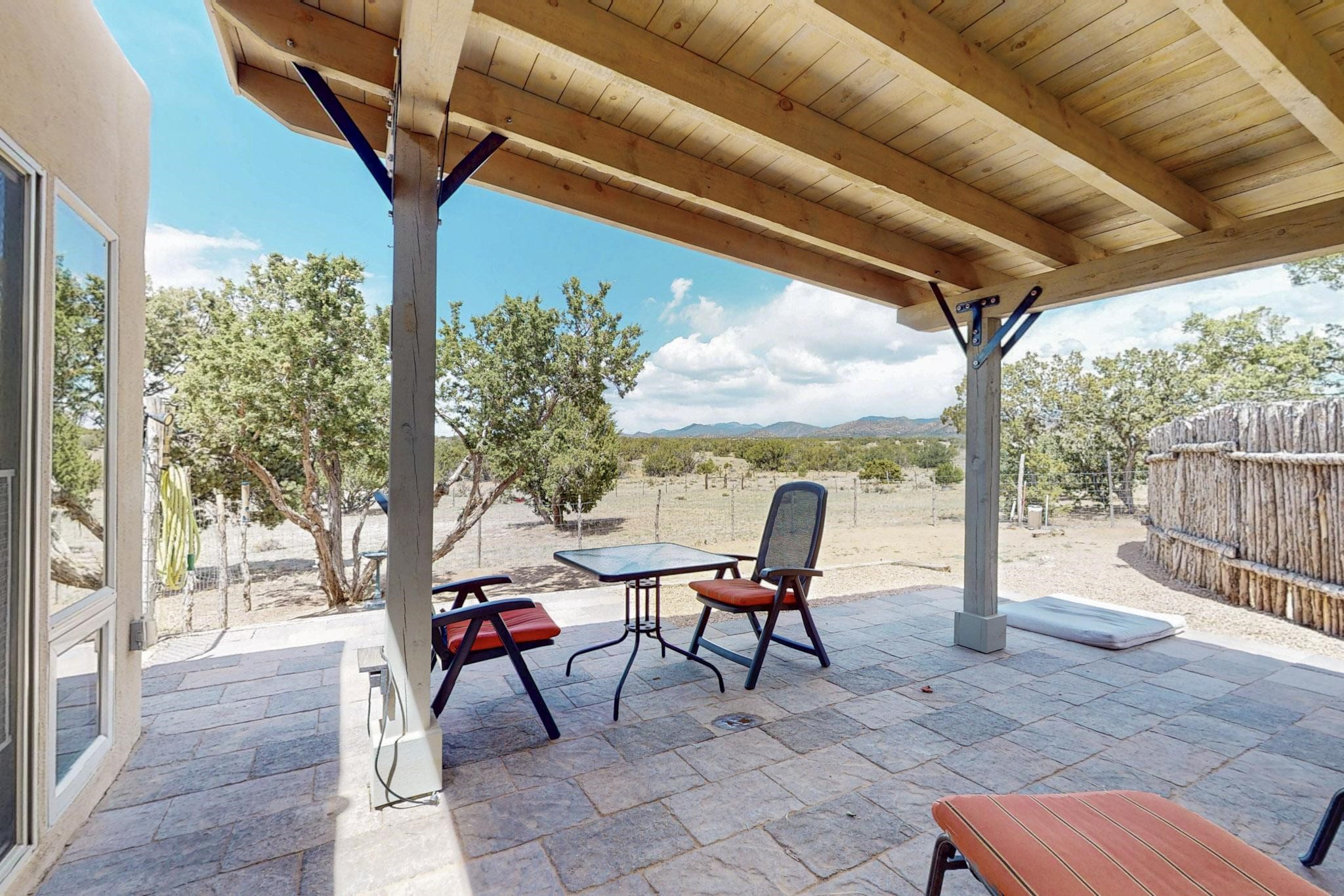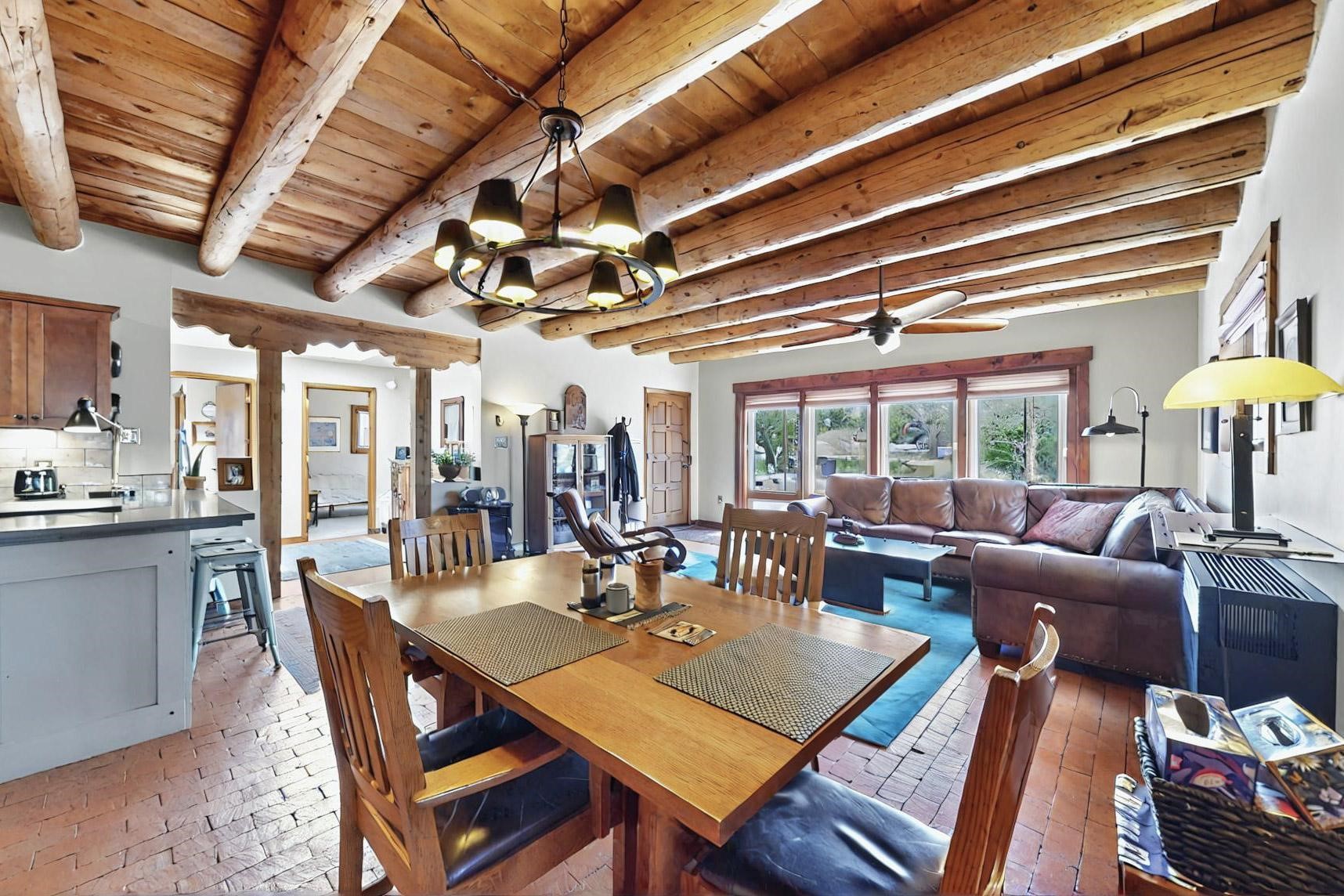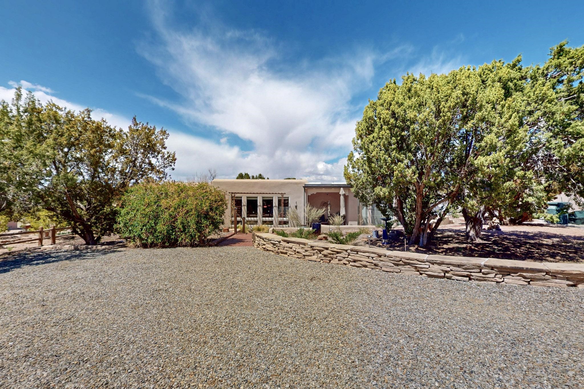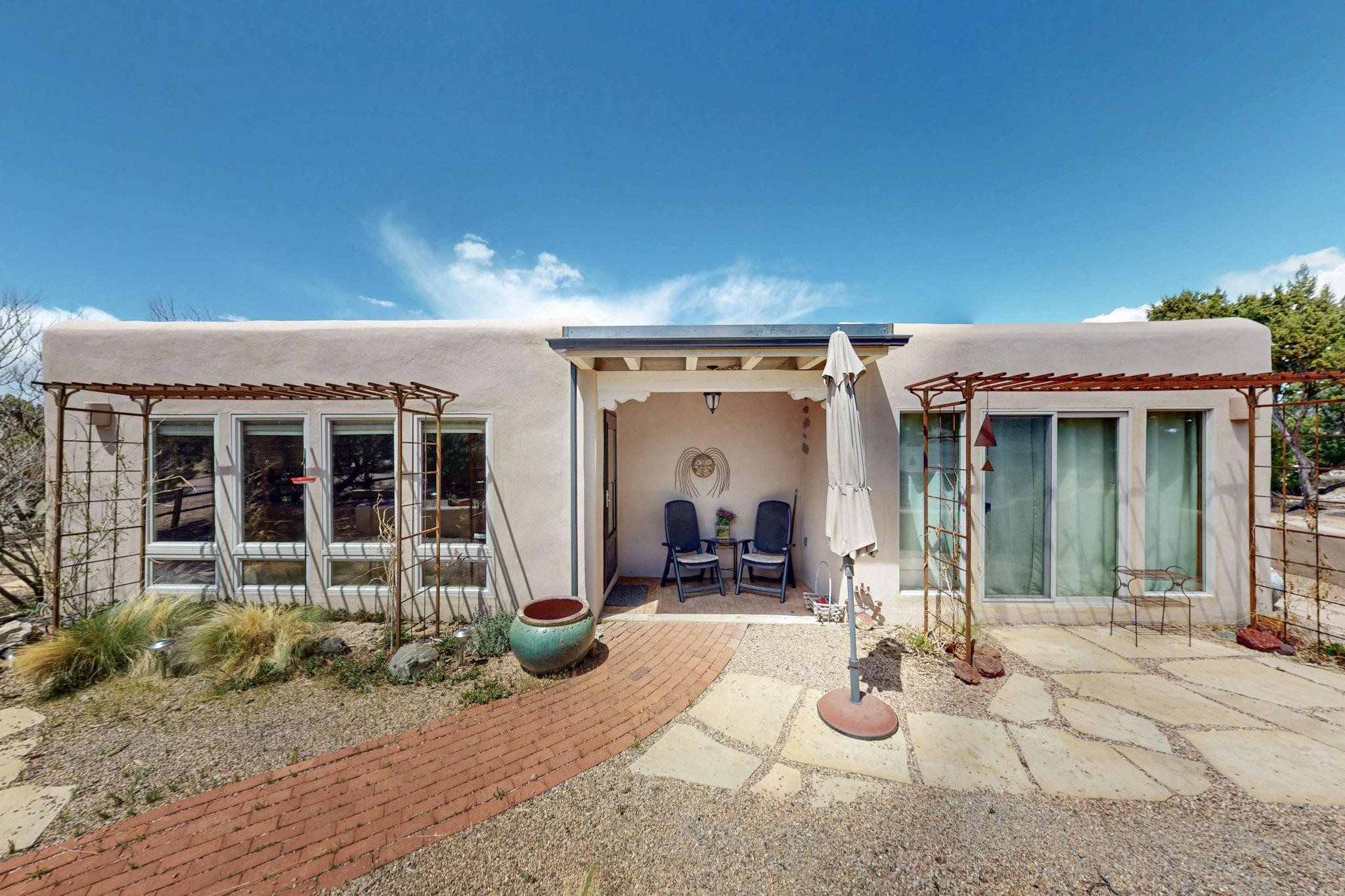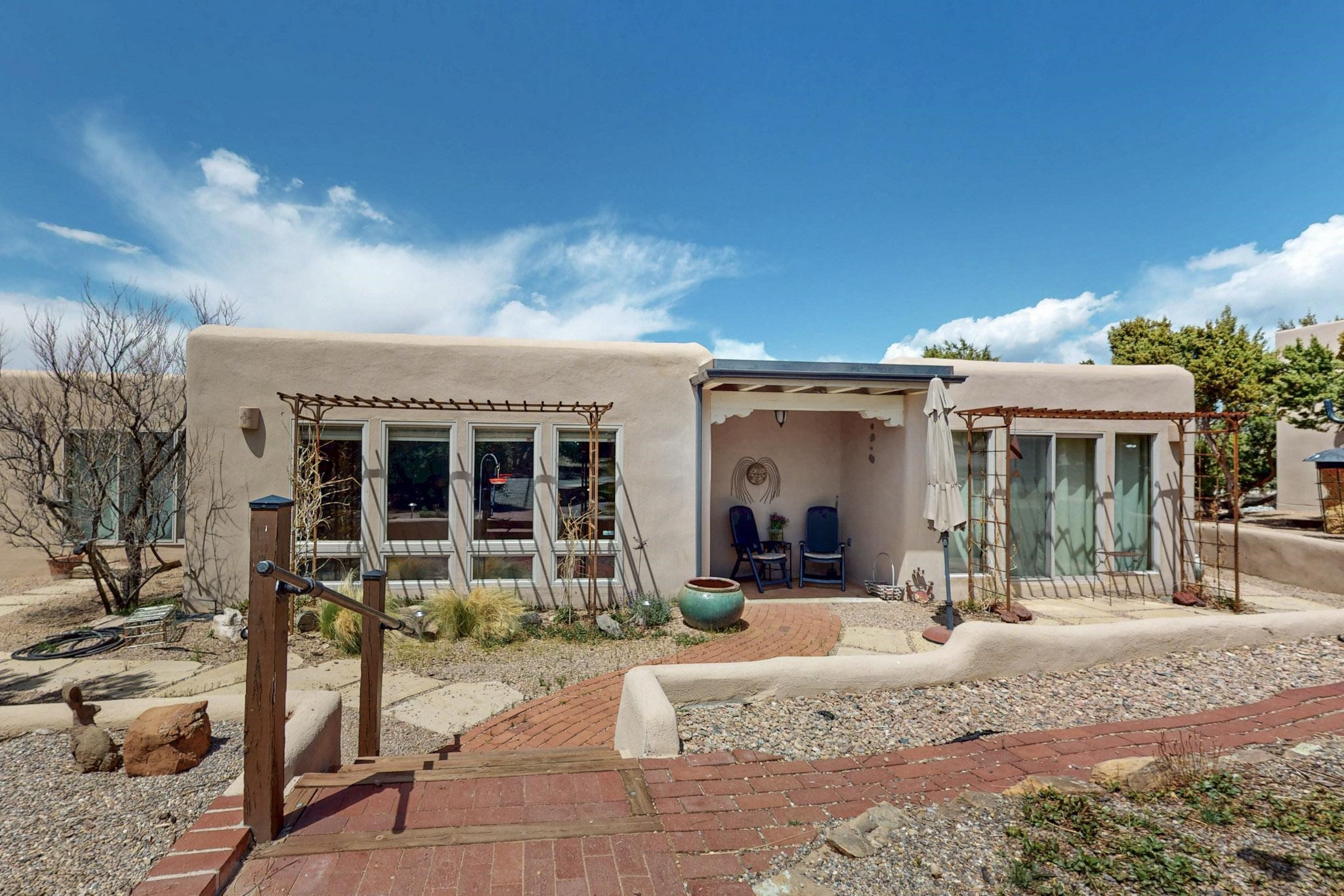 Spacious, open plan split bedroom, passive solar design on the ranch fence line. Sitting back off the road this home is an ideal private getaway custom built by R.J. McMillan, a prestigious local builder. Featuring Santa Fe detailing with Viga beams, T&G decking, corbels, gleaming brick floors and long south facing Pella windows to catch the winter heat. Two natural gas heating stoves supplement the electric baseboard, plus two window a/c units for summer comfort. The kitchen has been recently remodeled with quartz countertops and newer appliances. The large owners suite includes a large walk in closet, and remodeled bathroom, the guest suite includes 2 bedrooms and a remodelled bathroom also. An extra large family room/recreation room has a gas heating stove and spills out to the rear portal for summer entertainment. An oversized detached 2 car garage has extra workspace or storage and is accessed by a circular driveway with lots of guest parking. The private well has been maintained annually. This home has access to all Eldorado amenities and within easy reach of local shopping, parks, trails, schools, and the local library, only minutes into Santa Fe.