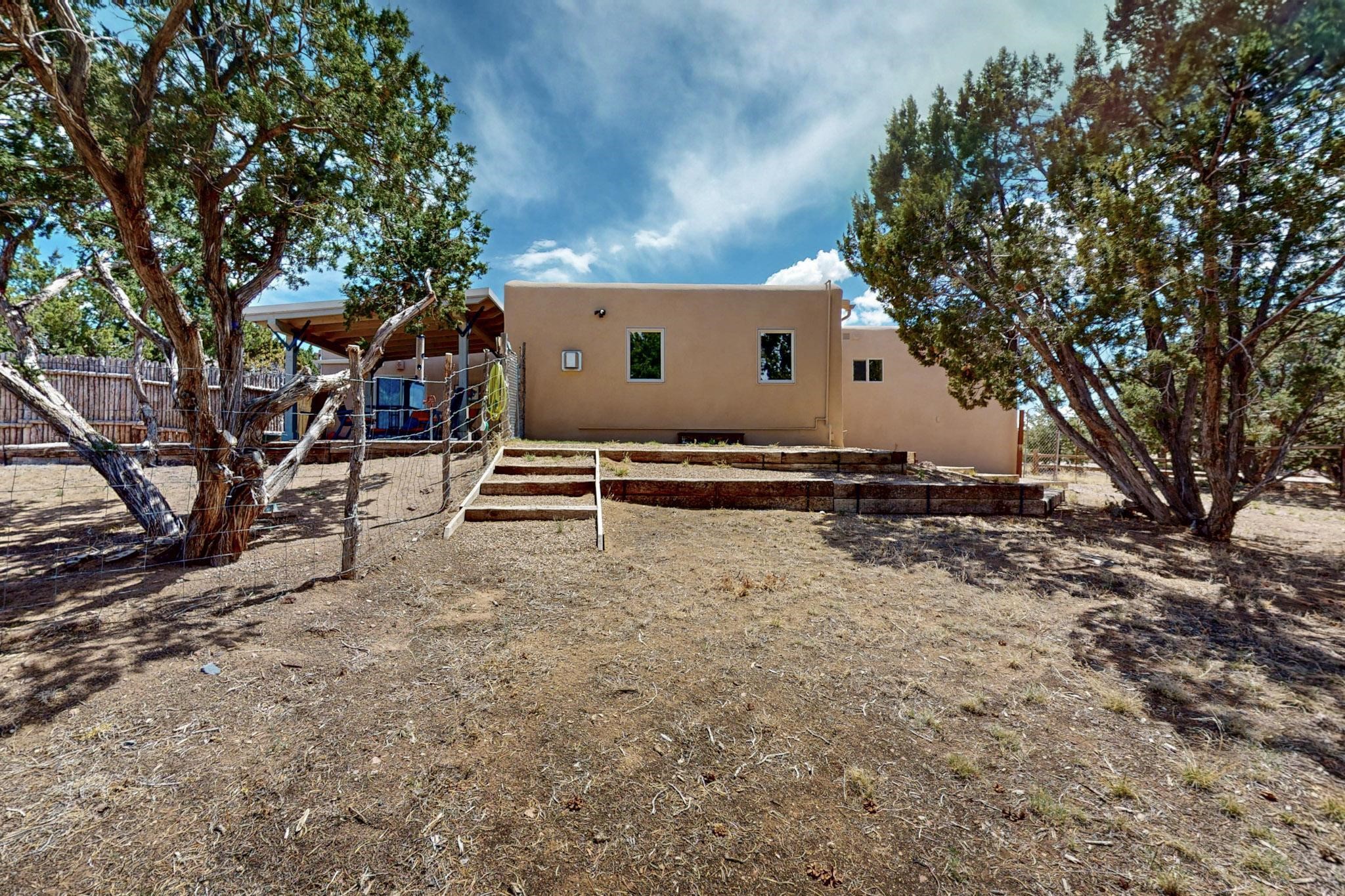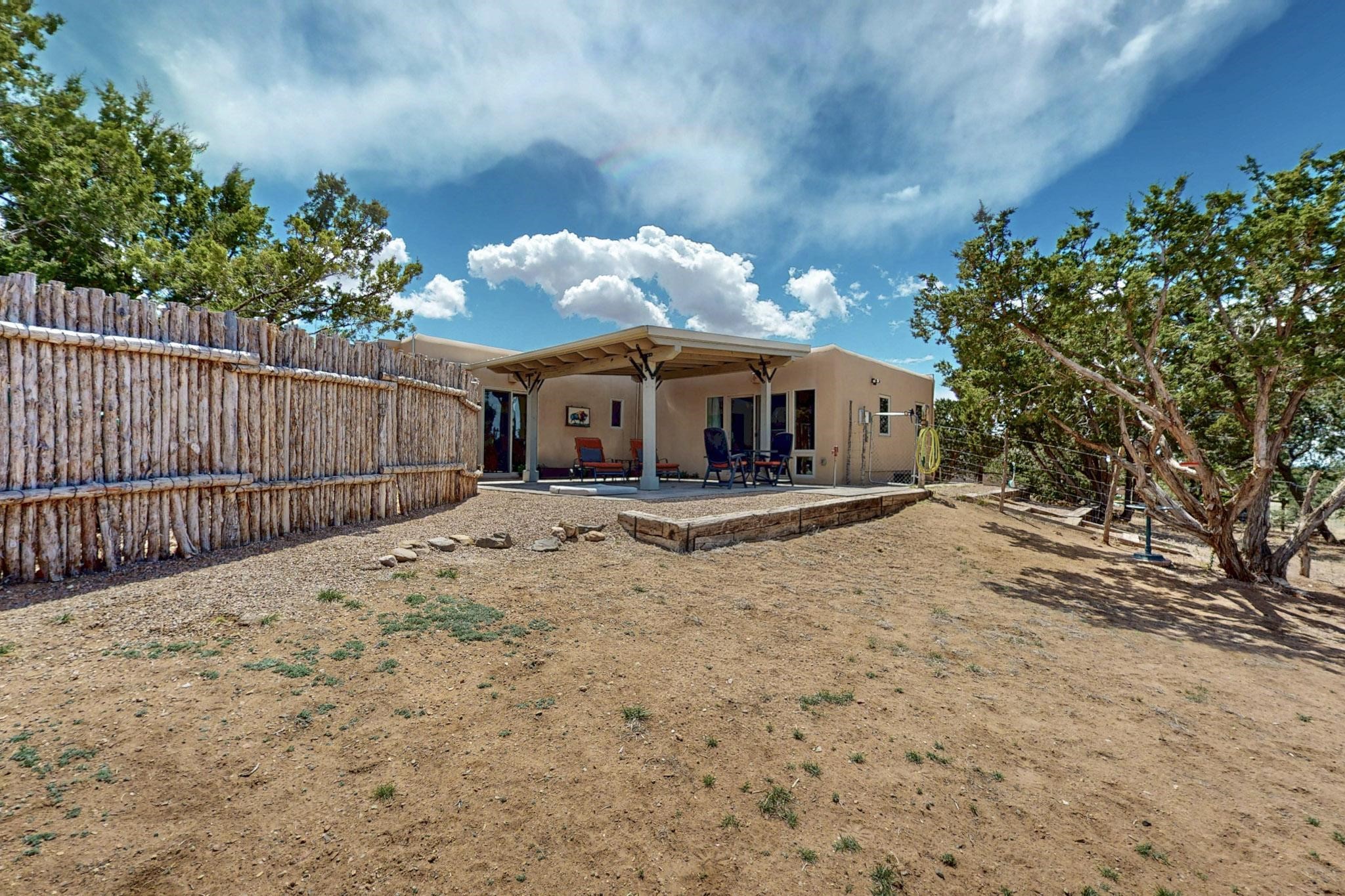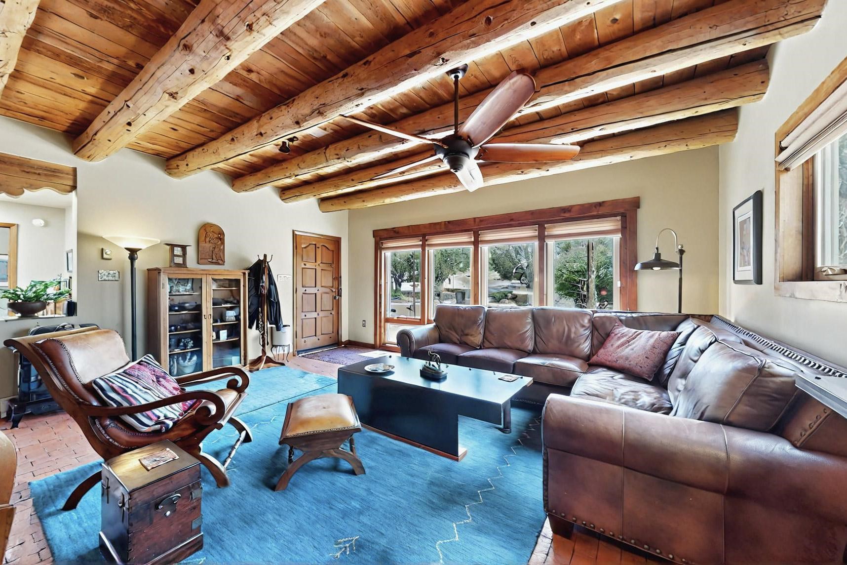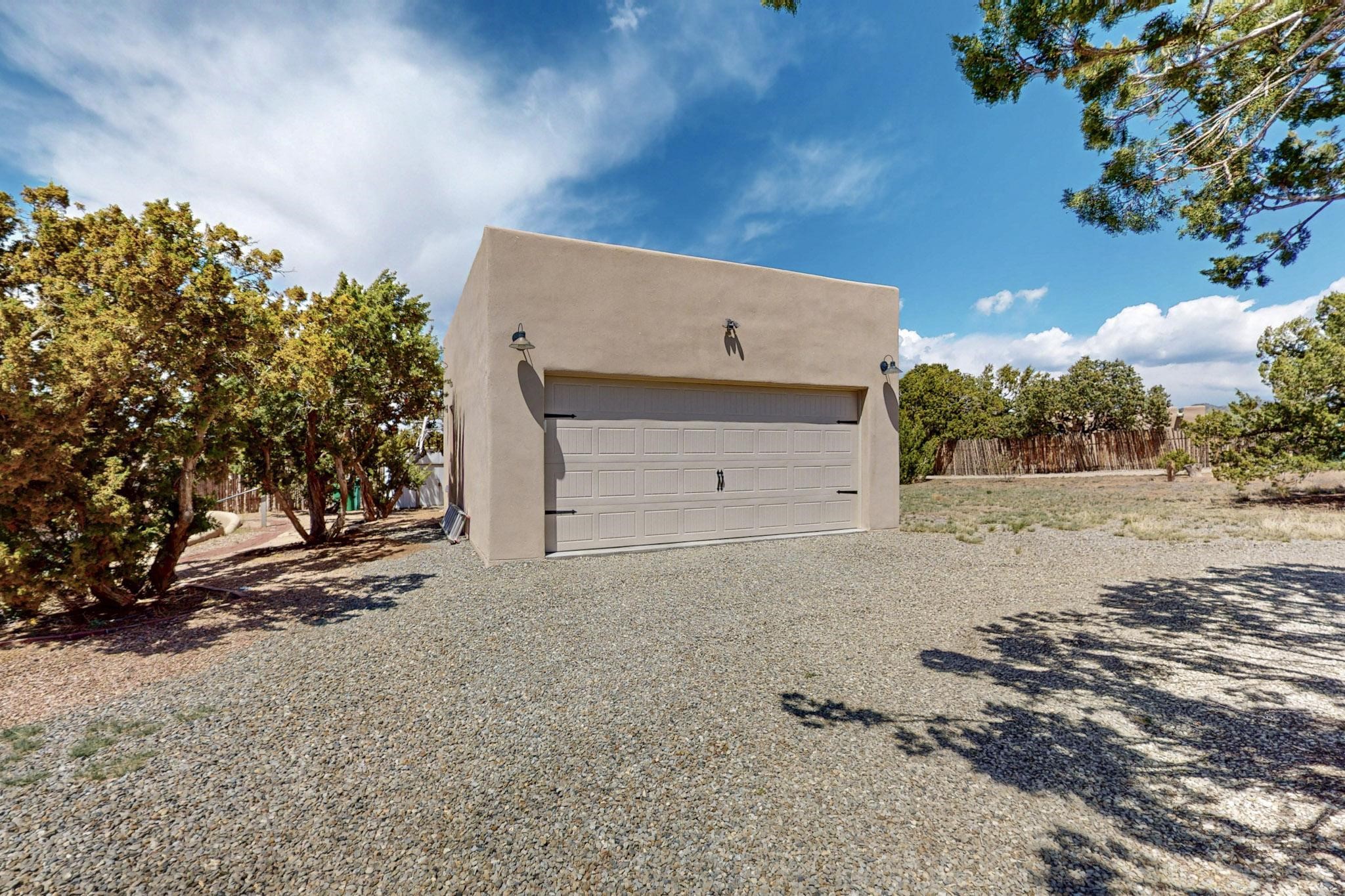 Spacious, open plan split bedroom, passive solar design on the ranch fence line. Sitting back off the road this home is an ideal private getaway custom built by R.J. McMillan, a prestigious local builder. Featuring Santa Fe detailing with Viga beams, T&G decking, corbels, gleaming brick floors and long south facing Pella windows to catch the winter heat. Two natural gas heating stoves supplement the electric baseboard, plus two window a/c units for summer comfort. The kitchen has been recently remodeled with quartz countertops and newer appliances. The large owners suite includes a large walk in closet, and remodeled bathroom, the guest suite includes 2 bedrooms and a remodelled bathroom also. An extra large family room/recreation room has a gas heating stove and spills out to the rear portal for summer entertainment. An oversized detached 2 car garage has extra workspace or storage and is accessed by a circular driveway with lots of guest parking. The private well has been maintained annually. This home has access to all Eldorado amenities and within easy reach of local shopping, parks, trails, schools, and the local library, only minutes into Santa Fe.