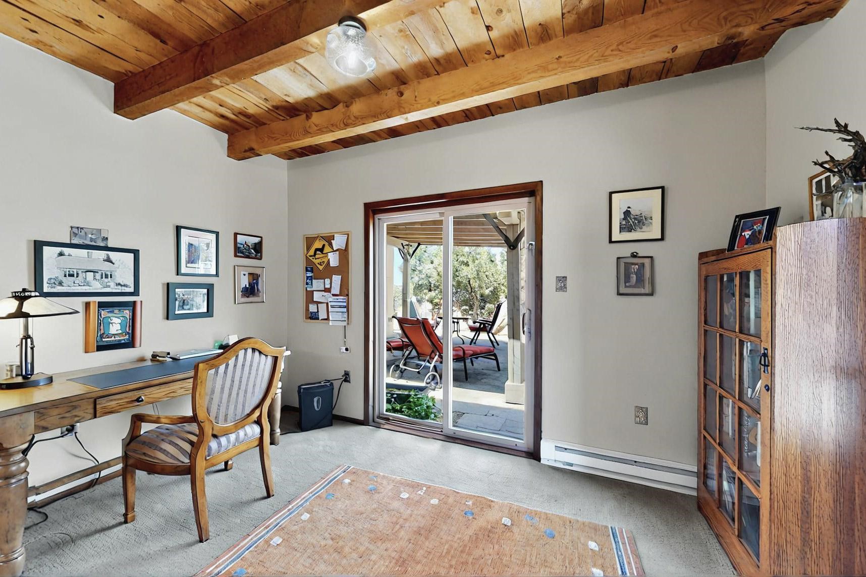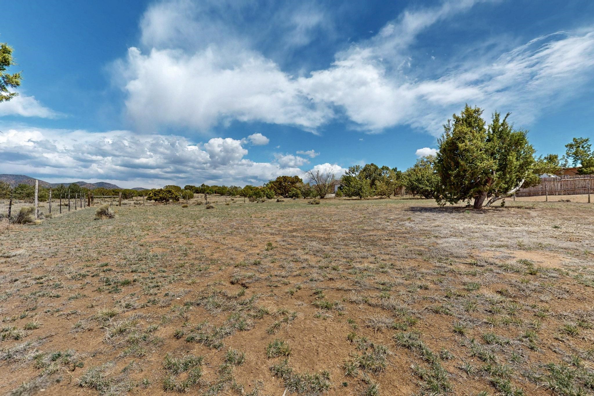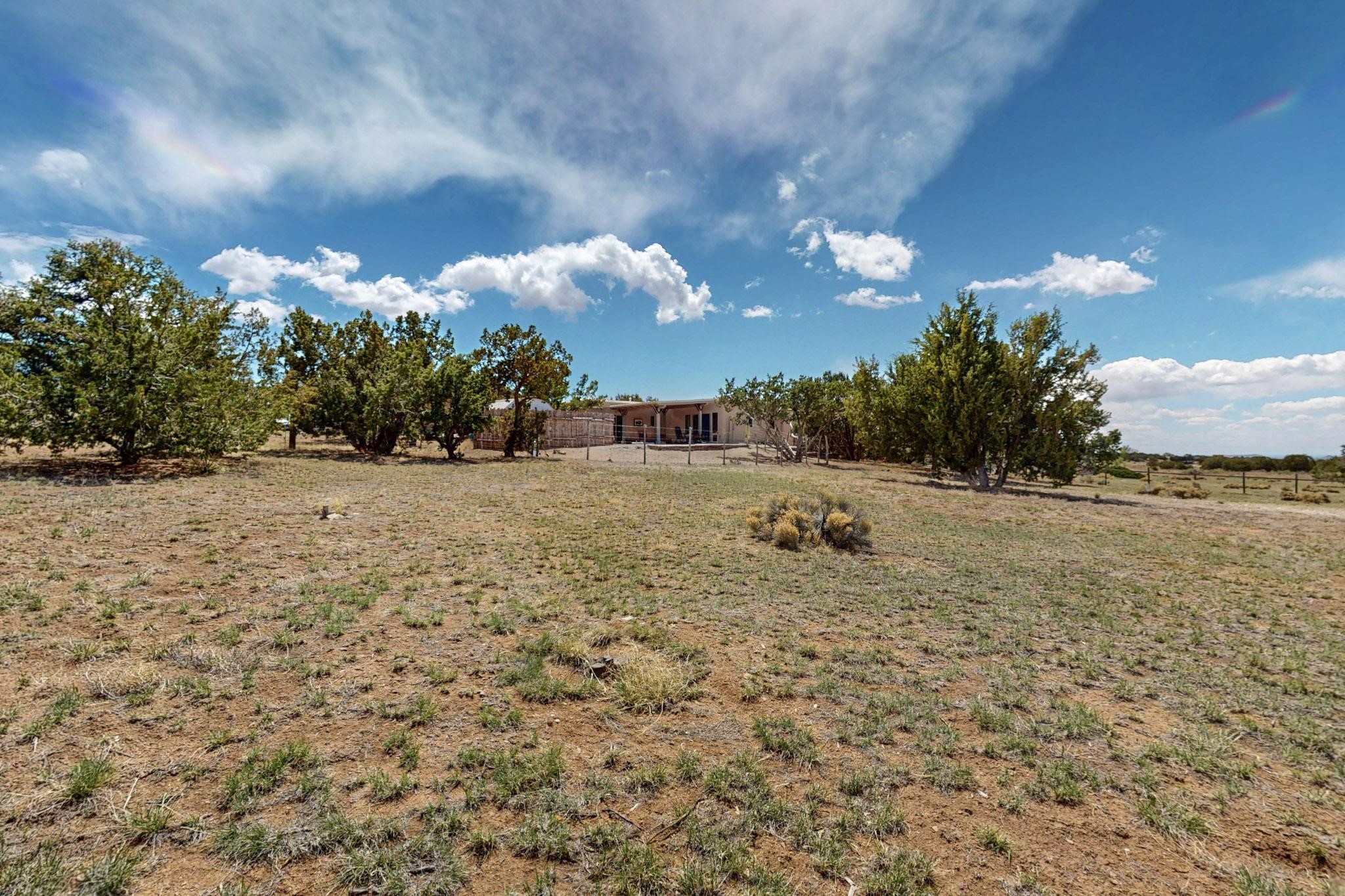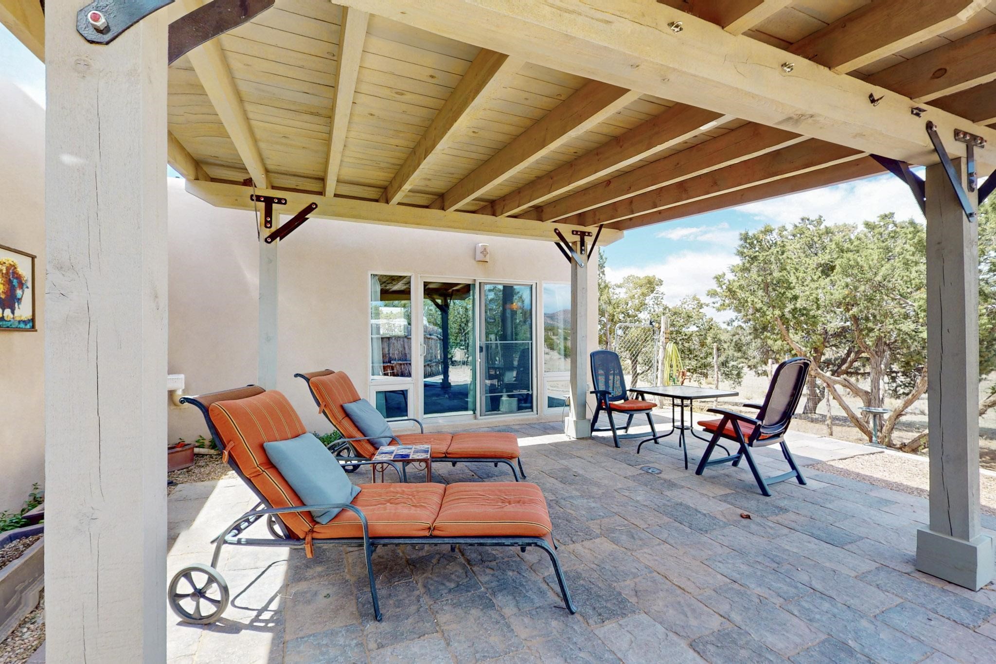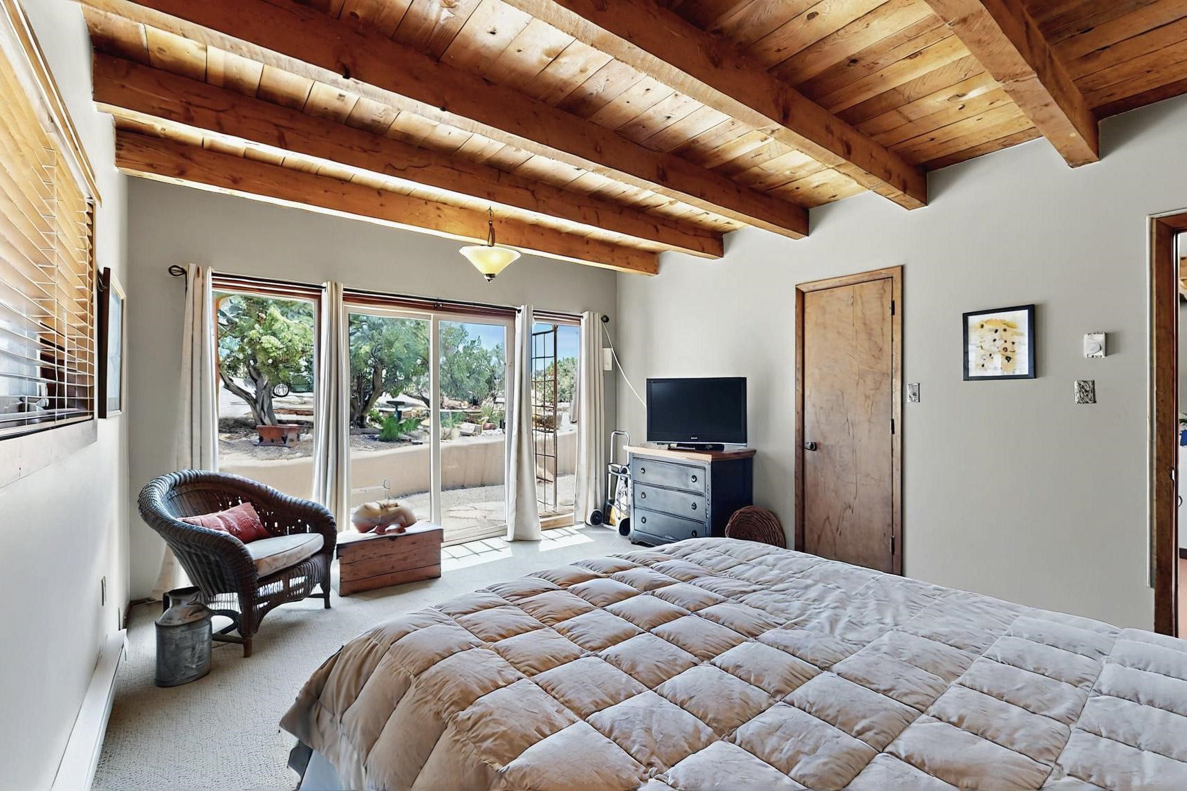 Spacious, open plan split bedroom, passive solar design on the ranch fence line. Sitting back off the road this home is an ideal private getaway custom built by R.J. McMillan, a prestigious local builder. Featuring Santa Fe detailing with Viga beams, T&G decking, corbels, gleaming brick floors and long south facing Pella windows to catch the winter heat. Two natural gas heating stoves supplement the electric baseboard, plus two window a/c units for summer comfort. The kitchen has been recently remodeled with quartz countertops and newer appliances. The large owners suite includes a large walk in closet, and remodeled bathroom, the guest suite includes 2 bedrooms and a remodelled bathroom also. An extra large family room/recreation room has a gas heating stove and spills out to the rear portal for summer entertainment. An oversized detached 2 car garage has extra workspace or storage and is accessed by a circular driveway with lots of guest parking. The private well has been maintained annually. This home has access to all Eldorado amenities and within easy reach of local shopping, parks, trails, schools, and the local library, only minutes into Santa Fe.