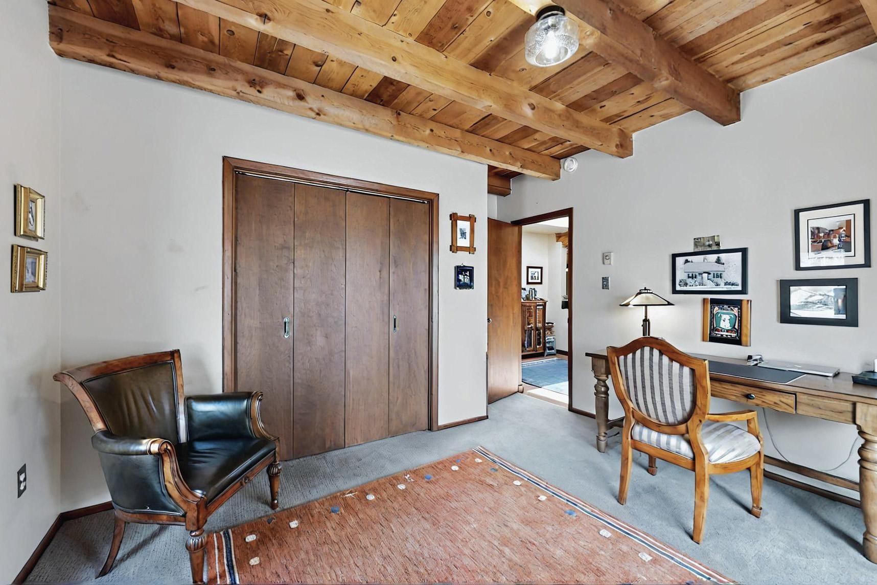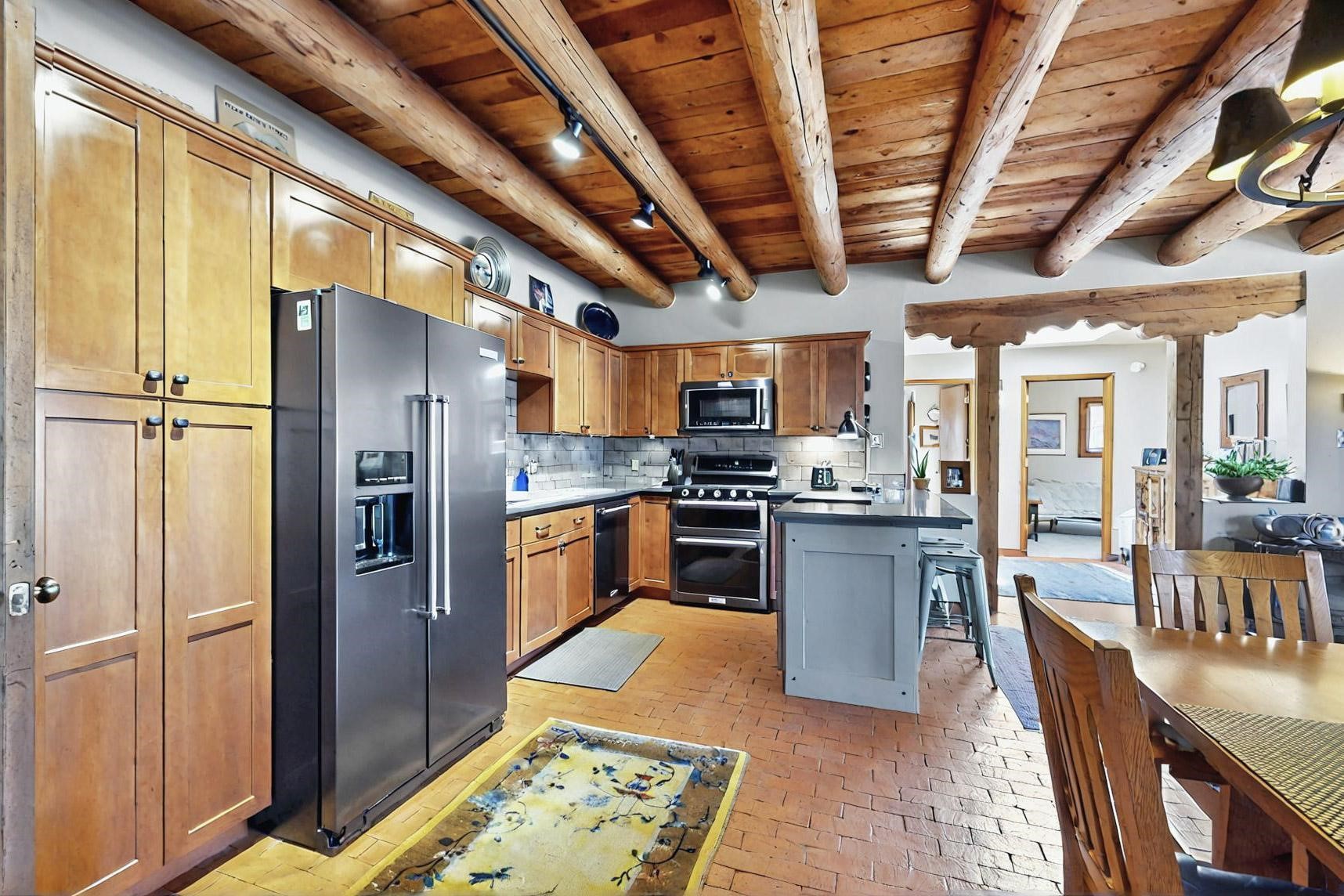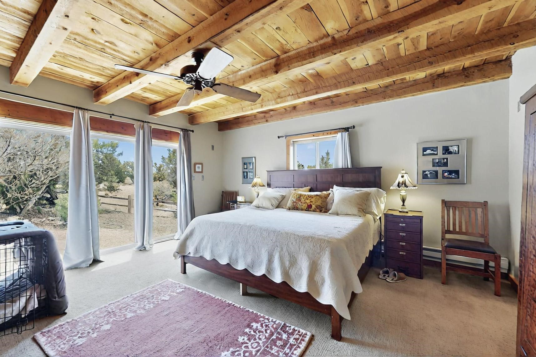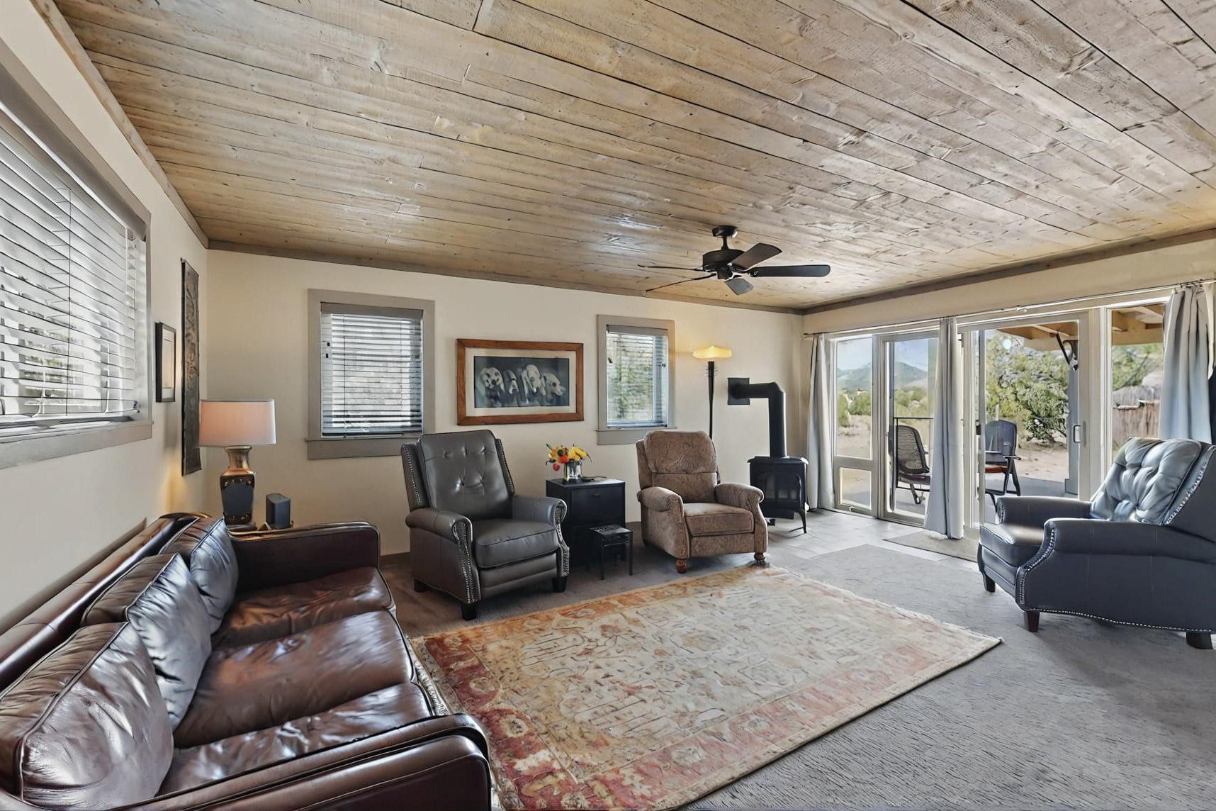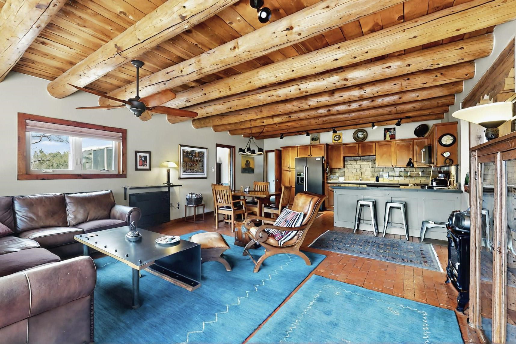Spacious, open plan split bedroom, passive solar design on the ranch fence line. Sitting back off the road this home is an ideal private getaway custom built by R.J. McMillan, a prestigious local builder. Featuring Santa Fe detailing with Viga beams, T&G decking, corbels, gleaming brick floors and long south facing Pella windows to catch the winter heat. Two natural gas heating stoves supplement the electric baseboard, plus two window a/c units for summer comfort. The kitchen has been recently remodeled with quartz countertops and newer appliances. The large owners suite includes a large walk in closet, and remodeled bathroom, the guest suite includes 2 bedrooms and a remodelled bathroom also. An extra large family room/recreation room has a gas heating stove and spills out to the rear portal for summer entertainment. An oversized detached 2 car garage has extra workspace or storage and is accessed by a circular driveway with lots of guest parking. The private well has been maintained annually. This home has access to all Eldorado amenities and within easy reach of local shopping, parks, trails, schools, and the local library, only minutes into Santa Fe.
