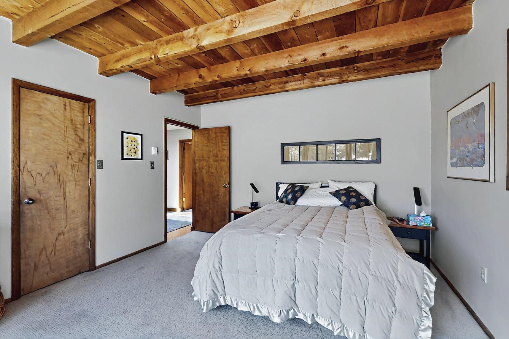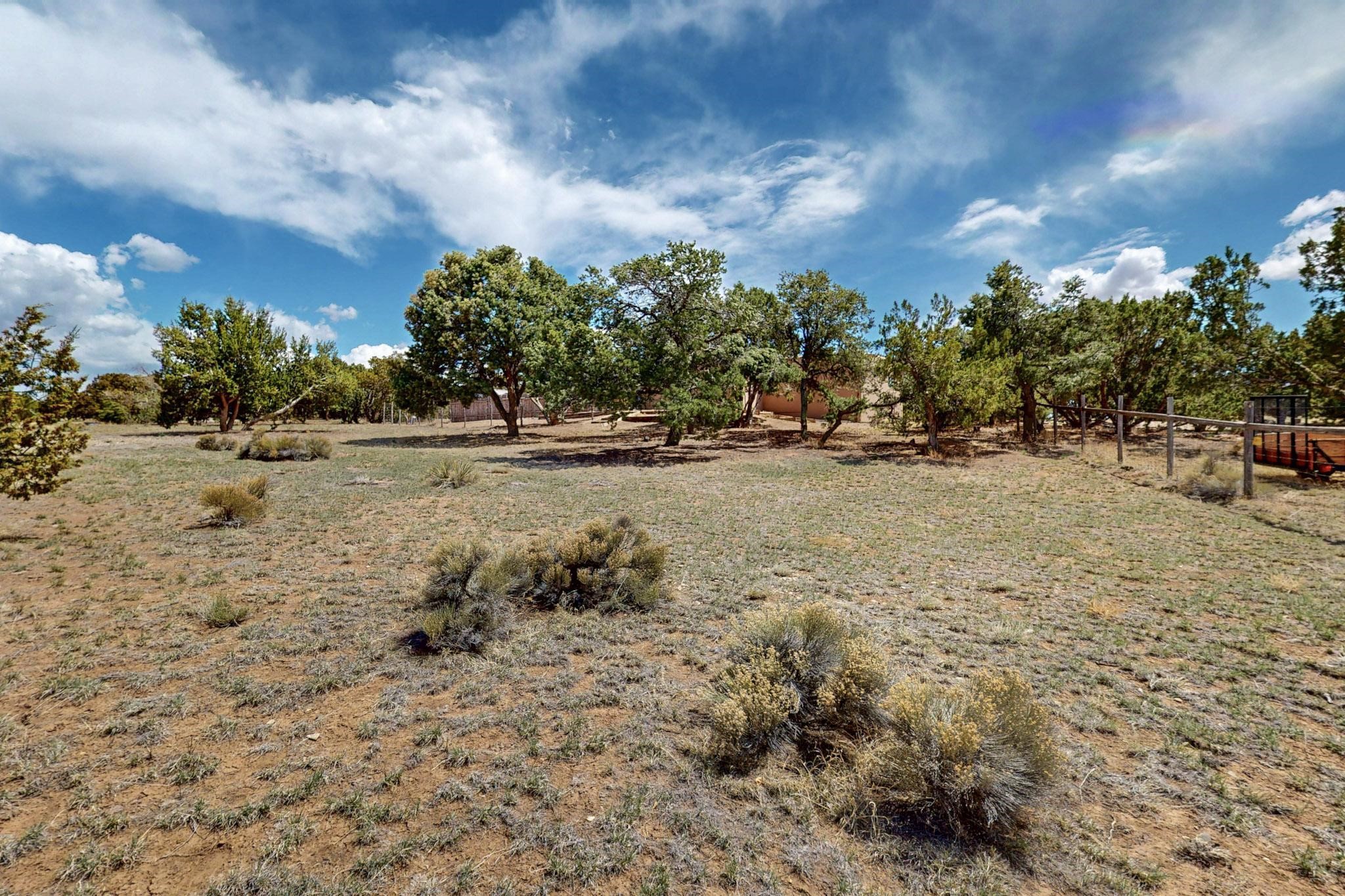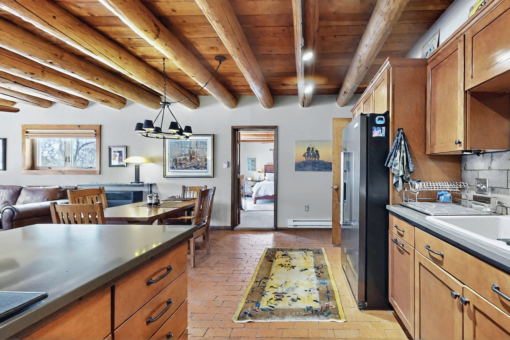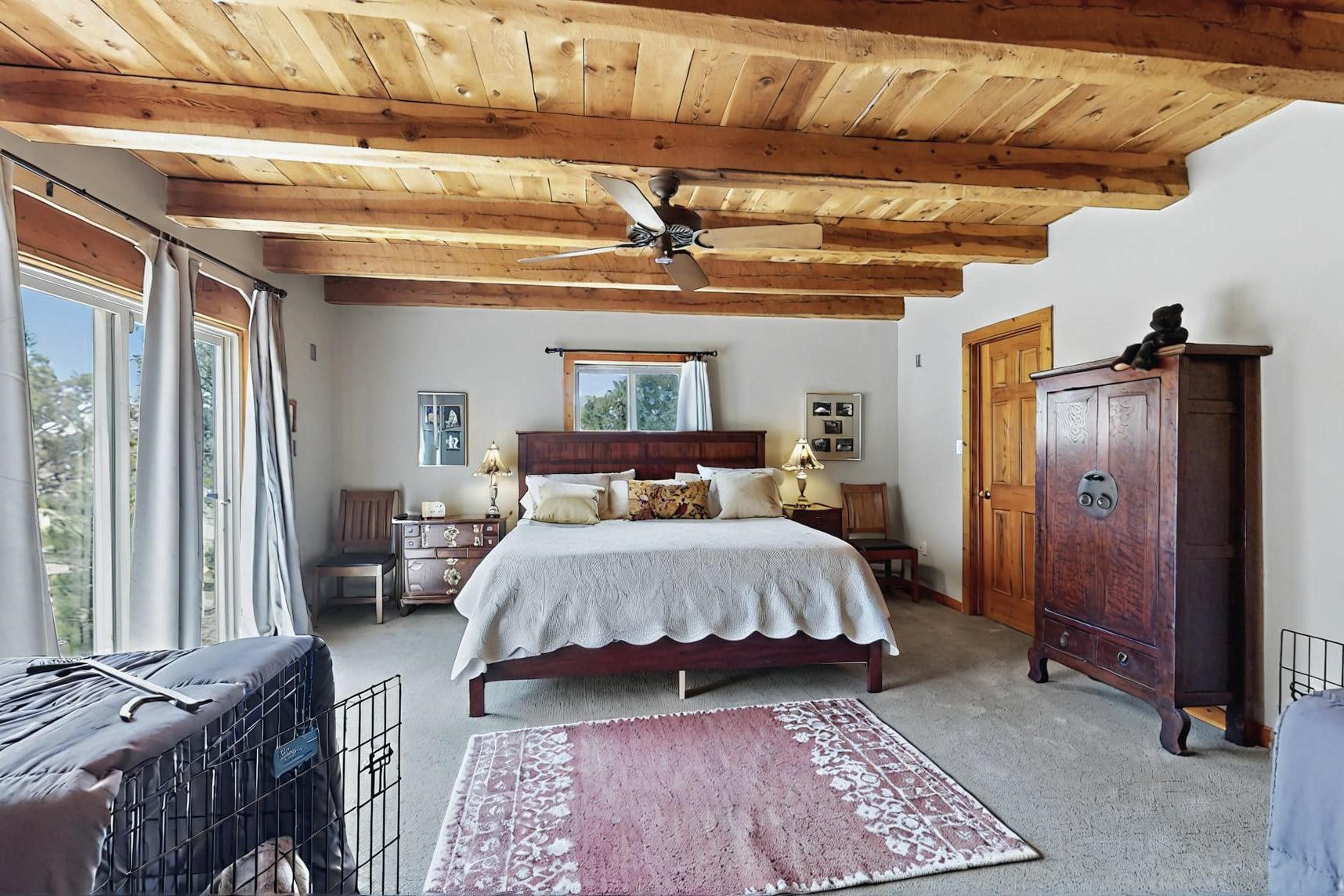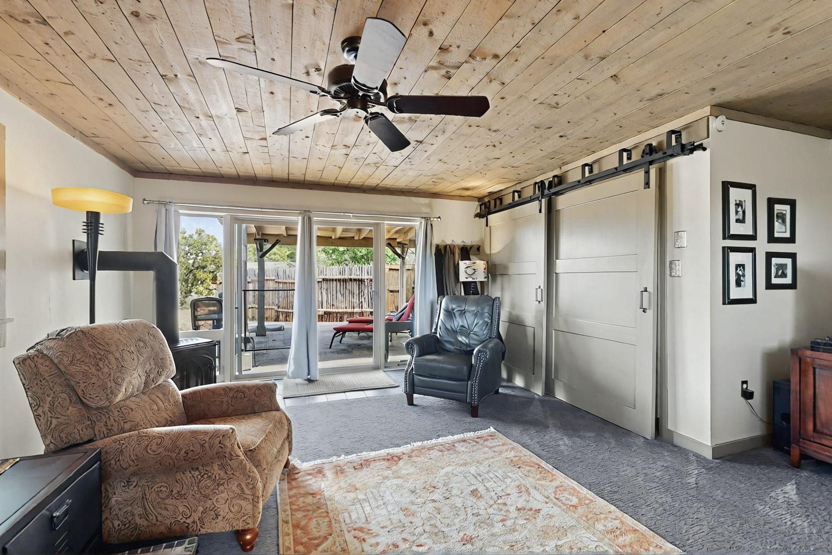 Spacious, open plan split bedroom, passive solar design on the ranch fence line. Sitting back off the road this home is an ideal private getaway custom built by R.J. McMillan, a prestigious local builder. Featuring Santa Fe detailing with Viga beams, T&G decking, corbels, gleaming brick floors and long south facing Pella windows to catch the winter heat. Two natural gas heating stoves supplement the electric baseboard, plus two window a/c units for summer comfort. The kitchen has been recently remodeled with quartz countertops and newer appliances. The large owners suite includes a large walk in closet, and remodeled bathroom, the guest suite includes 2 bedrooms and a remodelled bathroom also. An extra large family room/recreation room has a gas heating stove and spills out to the rear portal for summer entertainment. An oversized detached 2 car garage has extra workspace or storage and is accessed by a circular driveway with lots of guest parking. The private well has been maintained annually. This home has access to all Eldorado amenities and within easy reach of local shopping, parks, trails, schools, and the local library, only minutes into Santa Fe.