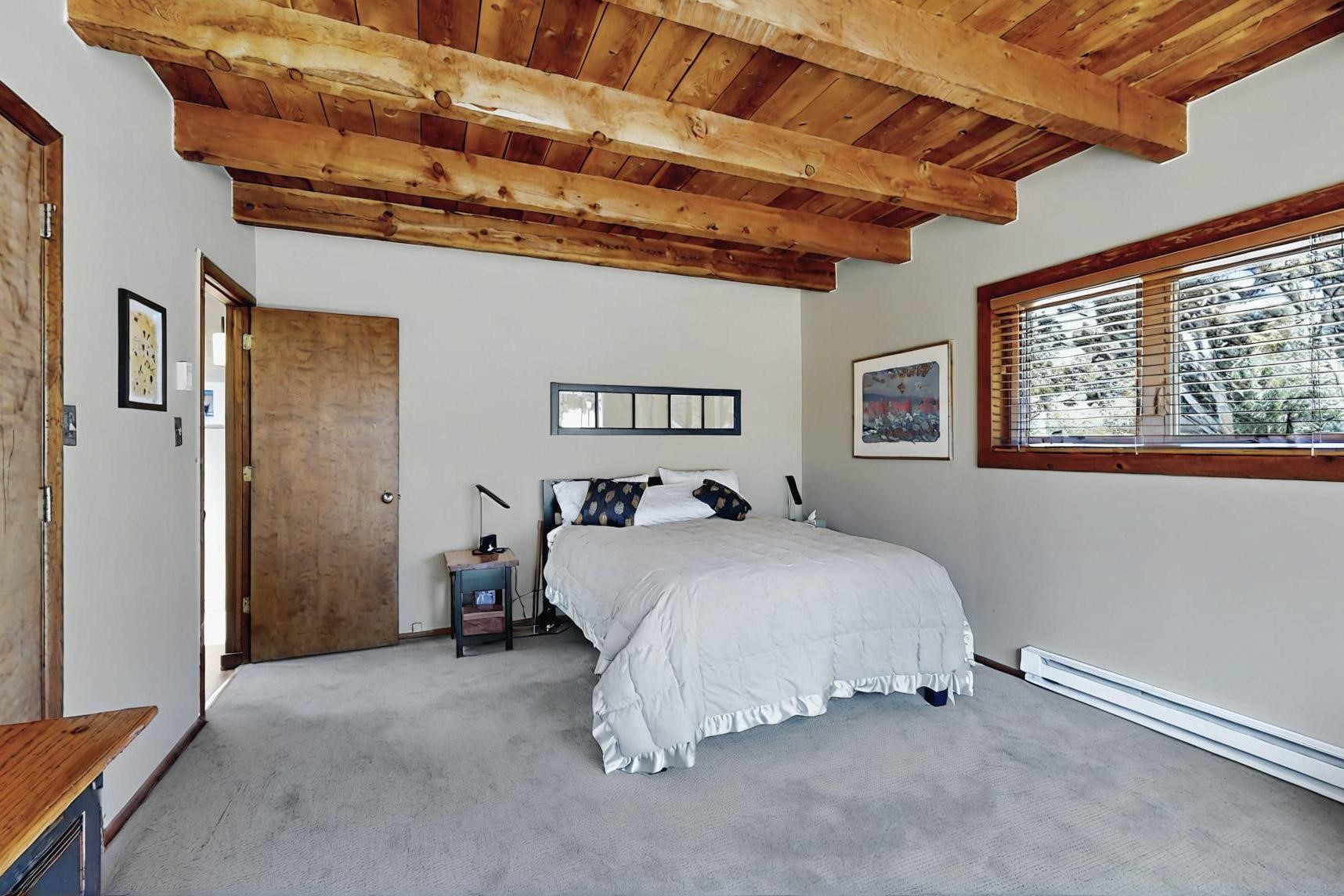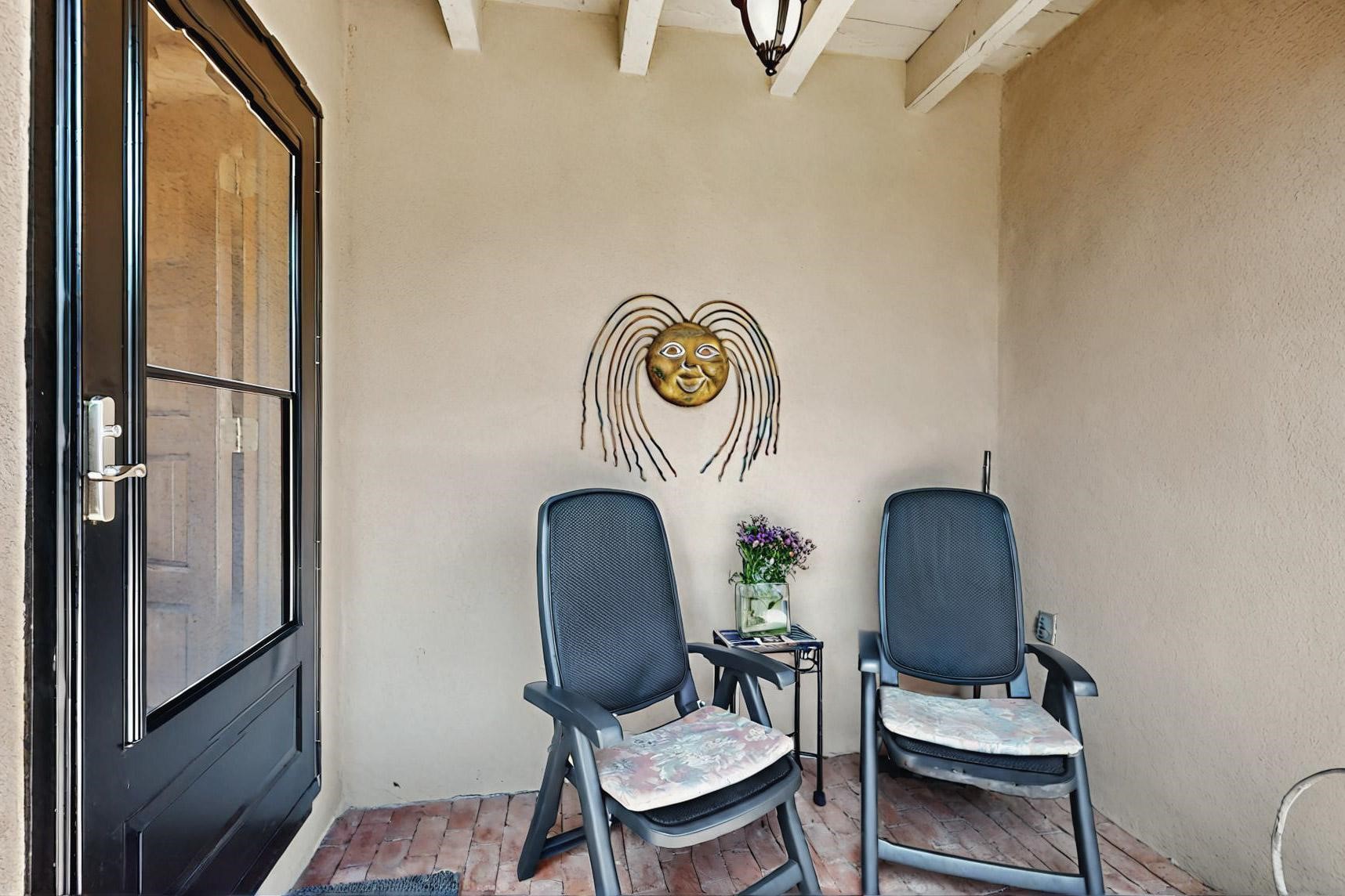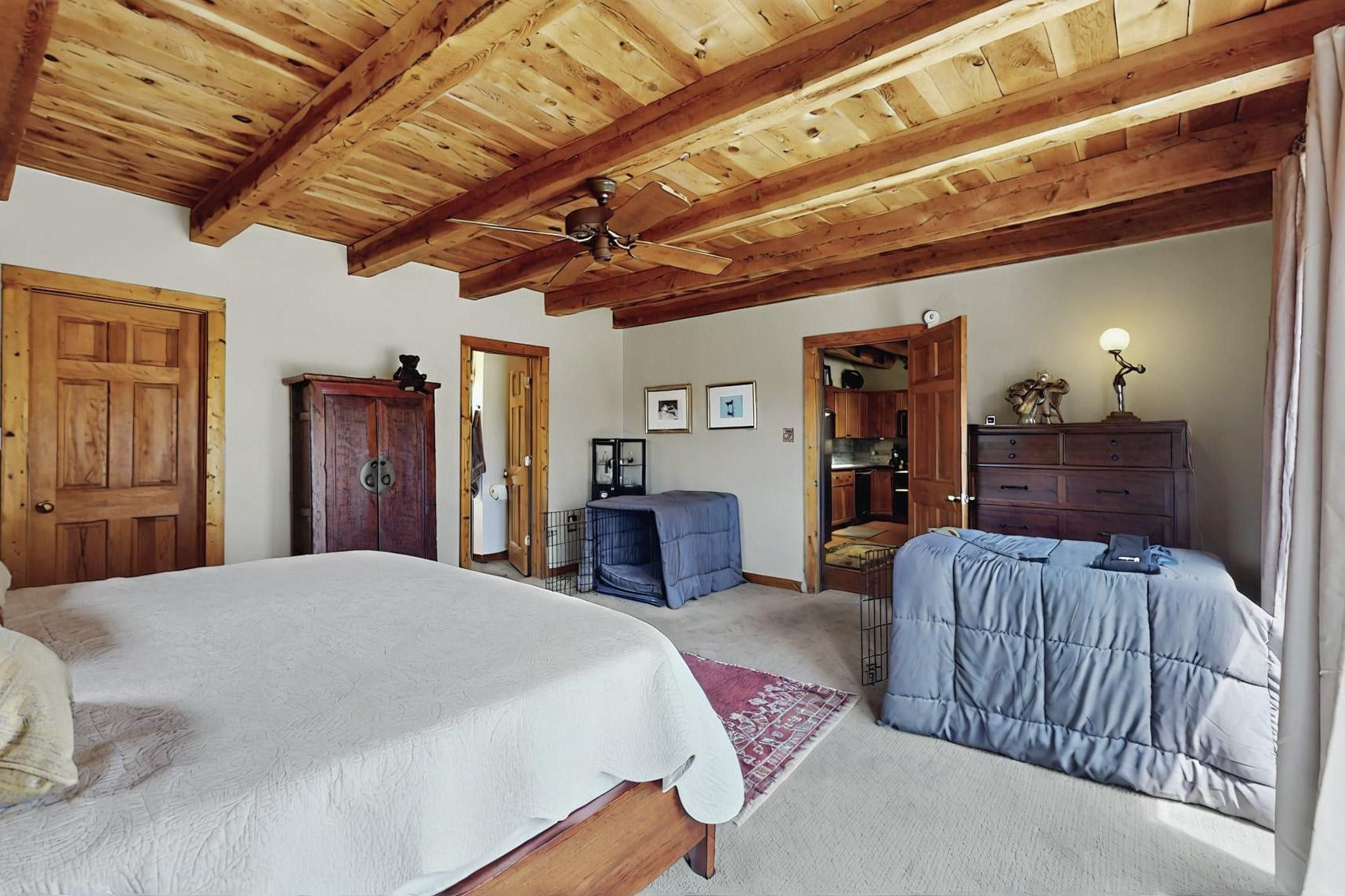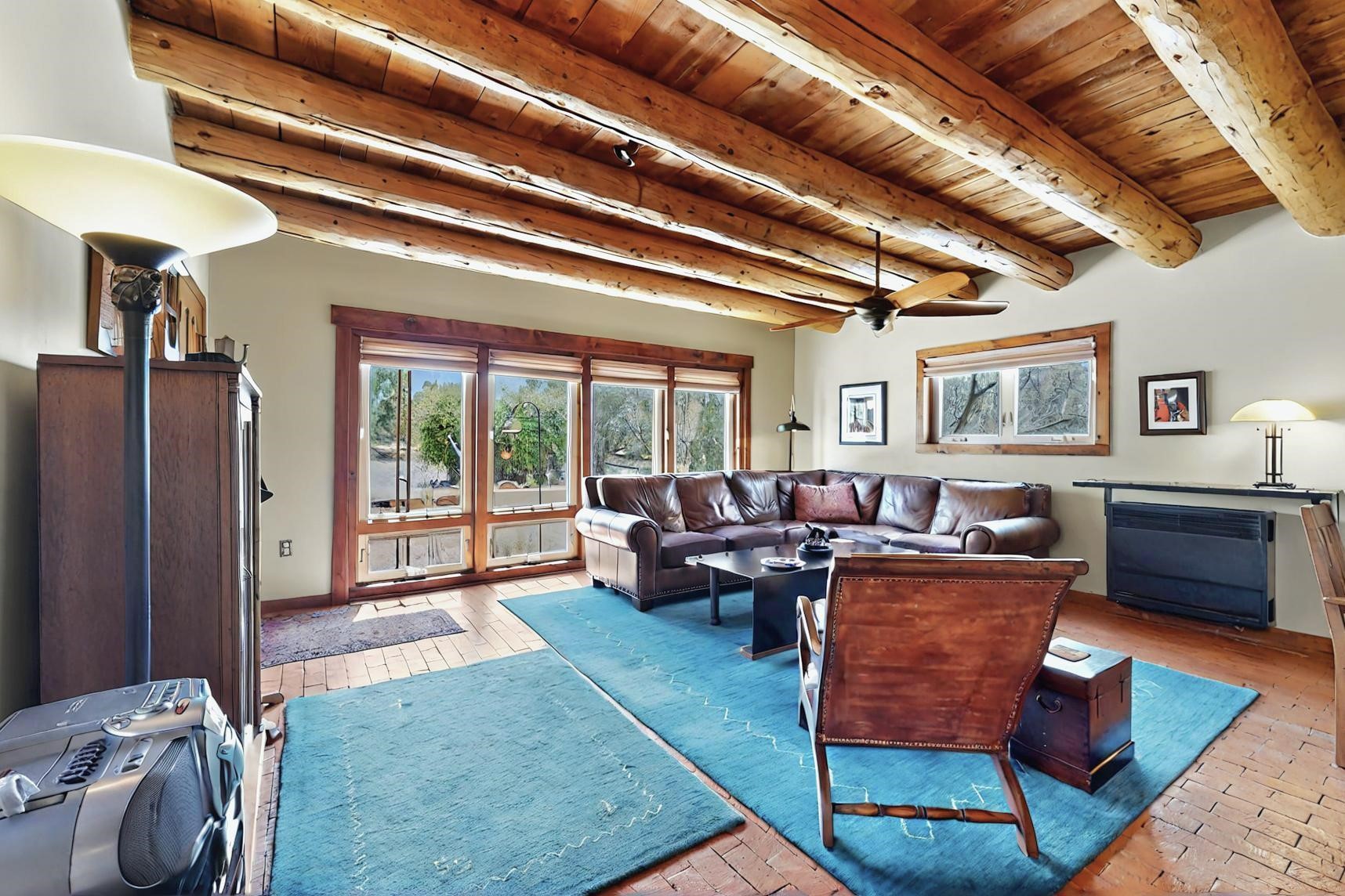 Spacious, open plan split bedroom, passive solar design on the ranch fence line. Sitting back off the road this home is an ideal private getaway custom built by R.J. McMillan, a prestigious local builder. Featuring Santa Fe detailing with Viga beams, T&G decking, corbels, gleaming brick floors and long south facing Pella windows to catch the winter heat. Two natural gas heating stoves supplement the electric baseboard, plus two window a/c units for summer comfort. The kitchen has been recently remodeled with quartz countertops and newer appliances. The large owners suite includes a large walk in closet, and remodeled bathroom, the guest suite includes 2 bedrooms and a remodelled bathroom also. An extra large family room/recreation room has a gas heating stove and spills out to the rear portal for summer entertainment. An oversized detached 2 car garage has extra workspace or storage and is accessed by a circular driveway with lots of guest parking. The private well has been maintained annually. This home has access to all Eldorado amenities and within easy reach of local shopping, parks, trails, schools, and the local library, only minutes into Santa Fe.