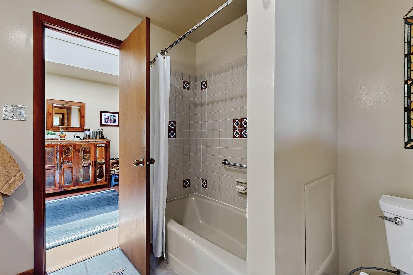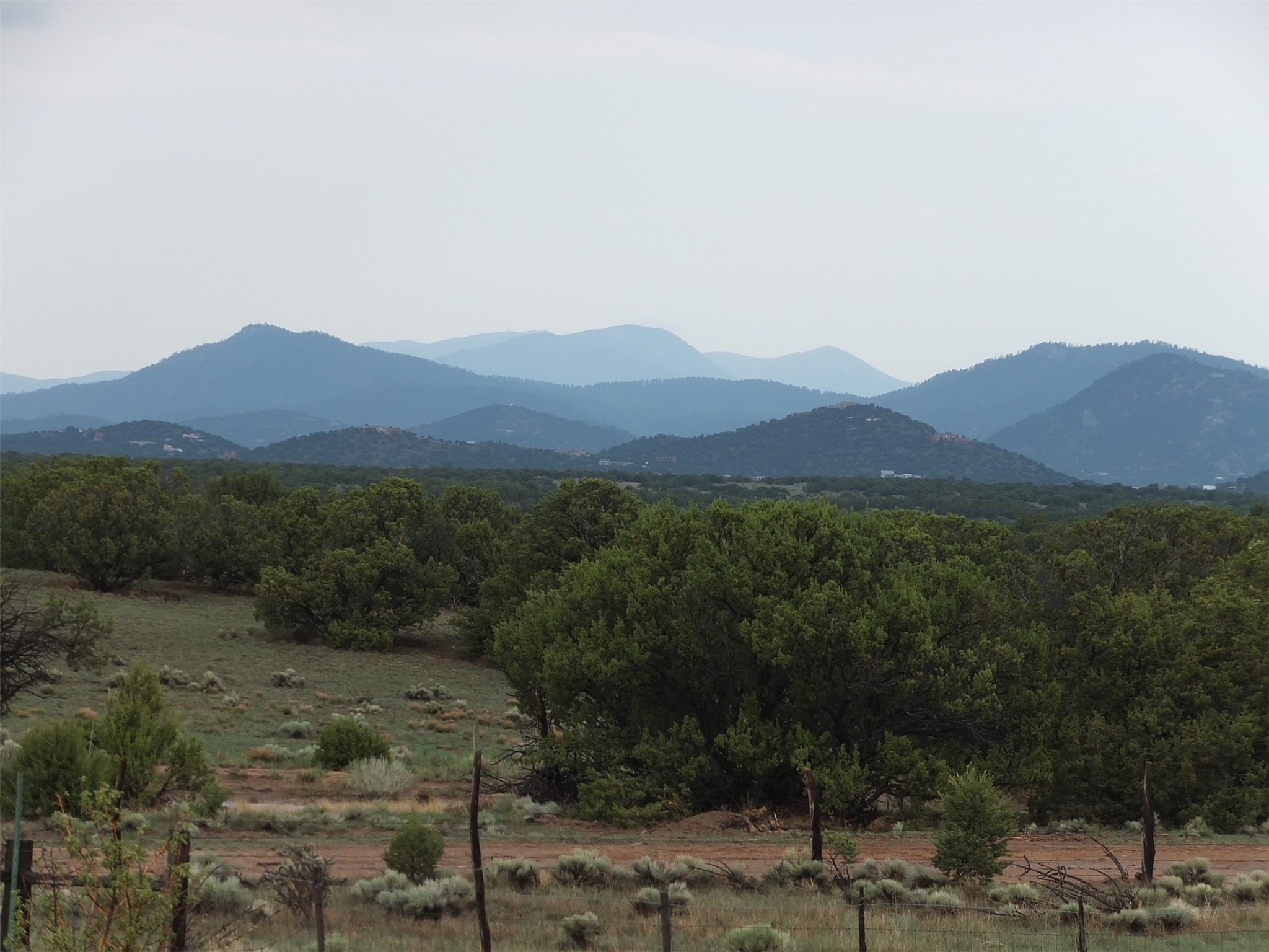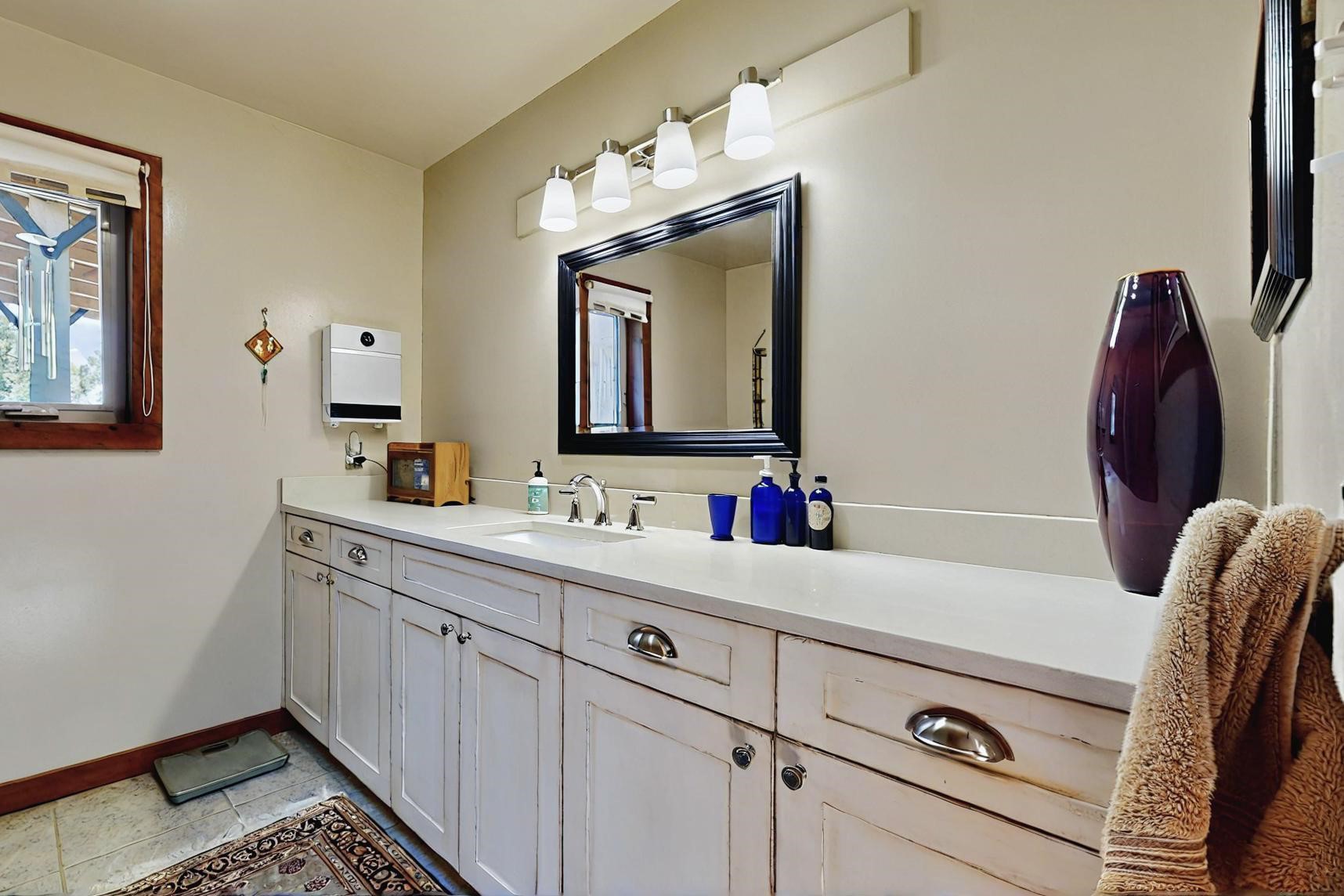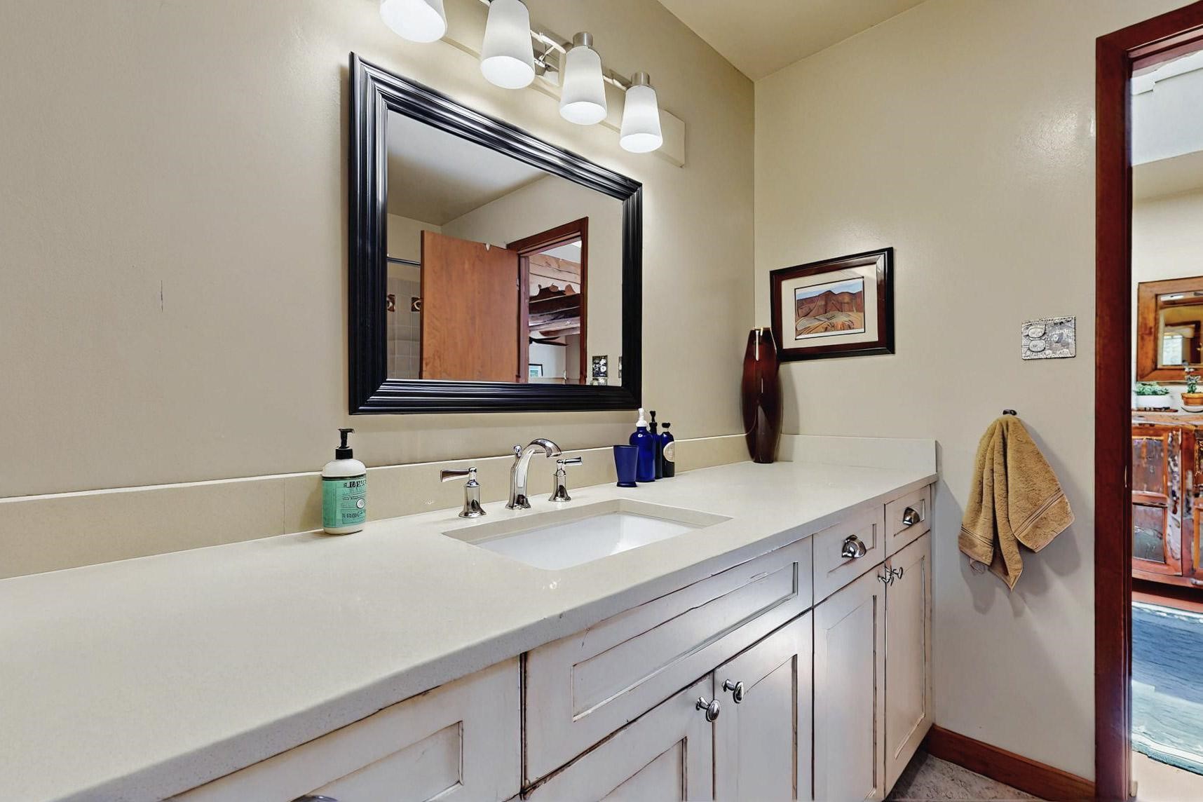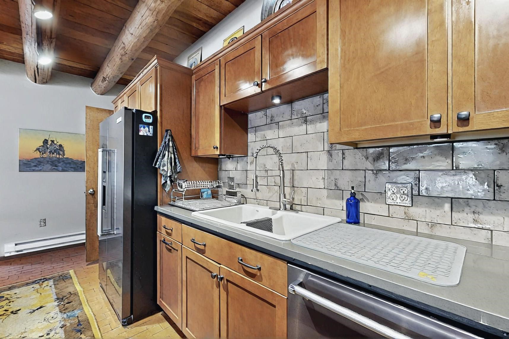 Spacious, open plan split bedroom, passive solar design on the ranch fence line. Sitting back off the road this home is an ideal private getaway custom built by R.J. McMillan, a prestigious local builder. Featuring Santa Fe detailing with Viga beams, T&G decking, corbels, gleaming brick floors and long south facing Pella windows to catch the winter heat. Two natural gas heating stoves supplement the electric baseboard, plus two window a/c units for summer comfort. The kitchen has been recently remodeled with quartz countertops and newer appliances. The large owners suite includes a large walk in closet, and remodeled bathroom, the guest suite includes 2 bedrooms and a remodelled bathroom also. An extra large family room/recreation room has a gas heating stove and spills out to the rear portal for summer entertainment. An oversized detached 2 car garage has extra workspace or storage and is accessed by a circular driveway with lots of guest parking. The private well has been maintained annually. This home has access to all Eldorado amenities and within easy reach of local shopping, parks, trails, schools, and the local library, only minutes into Santa Fe.