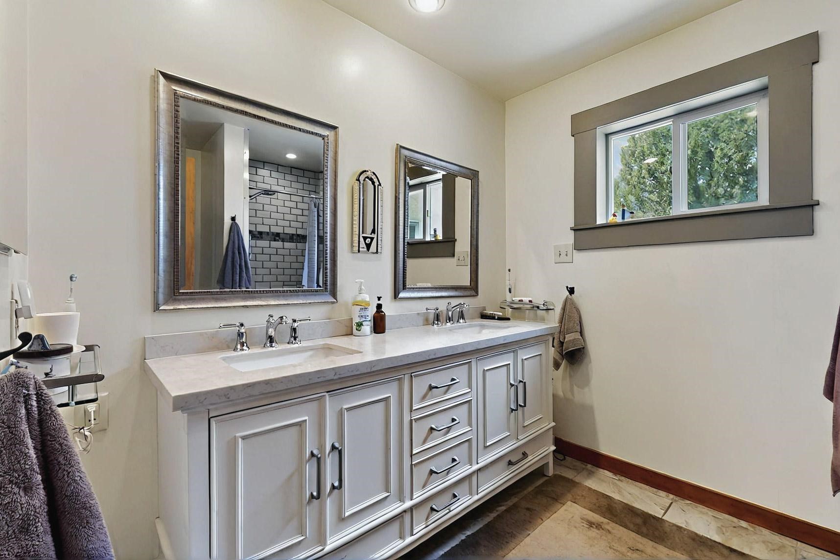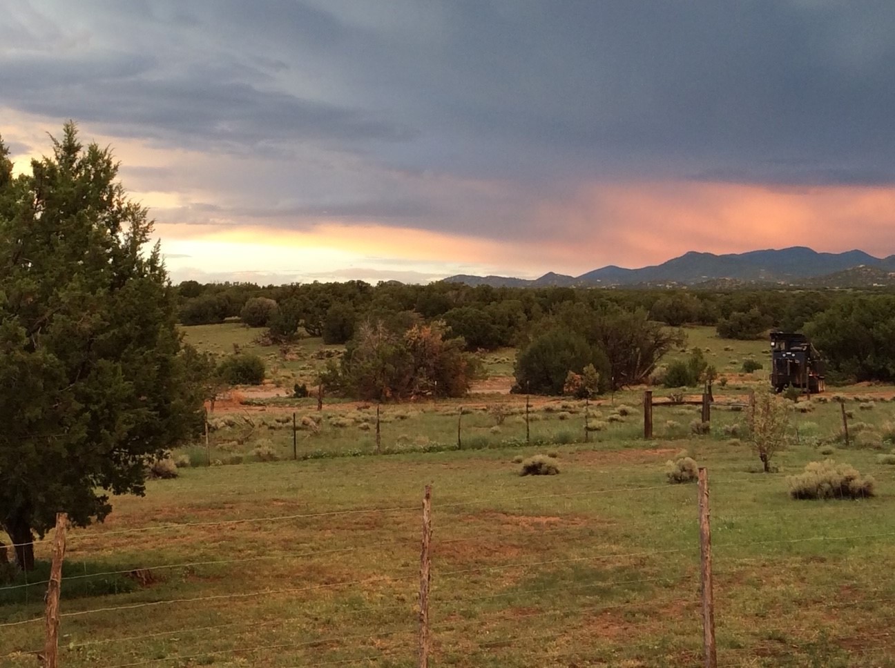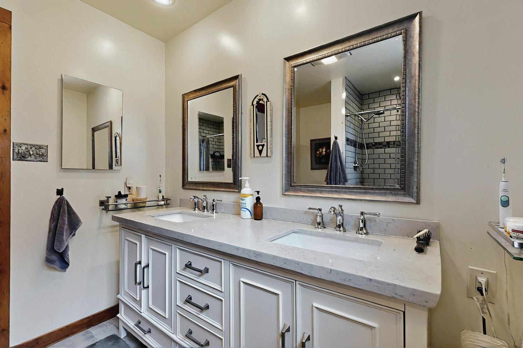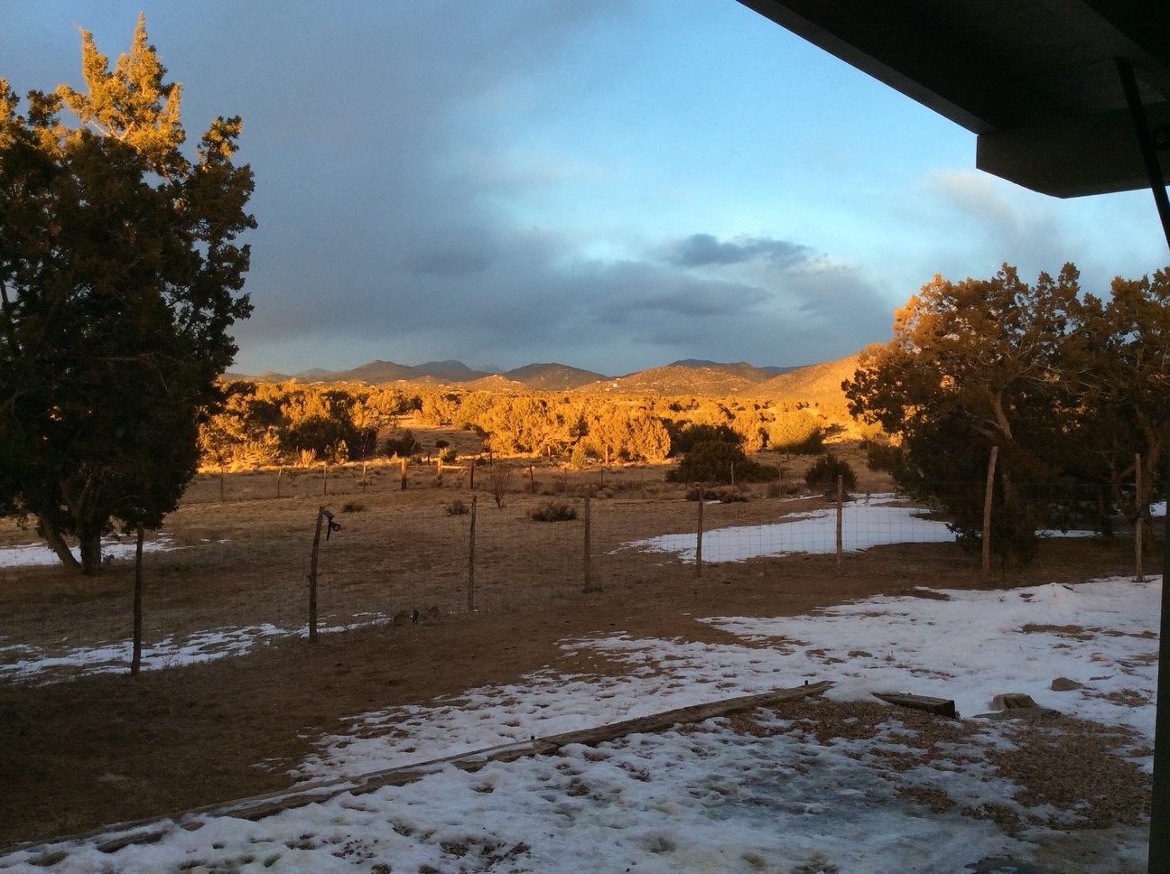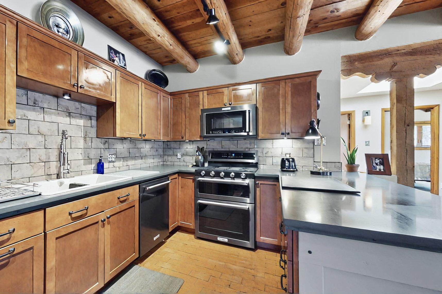 Spacious, open plan split bedroom, passive solar design on the ranch fence line. Sitting back off the road this home is an ideal private getaway custom built by R.J. McMillan, a prestigious local builder. Featuring Santa Fe detailing with Viga beams, T&G decking, corbels, gleaming brick floors and long south facing Pella windows to catch the winter heat. Two natural gas heating stoves supplement the electric baseboard, plus two window a/c units for summer comfort. The kitchen has been recently remodeled with quartz countertops and newer appliances. The large owners suite includes a large walk in closet, and remodeled bathroom, the guest suite includes 2 bedrooms and a remodelled bathroom also. An extra large family room/recreation room has a gas heating stove and spills out to the rear portal for summer entertainment. An oversized detached 2 car garage has extra workspace or storage and is accessed by a circular driveway with lots of guest parking. The private well has been maintained annually. This home has access to all Eldorado amenities and within easy reach of local shopping, parks, trails, schools, and the local library, only minutes into Santa Fe.