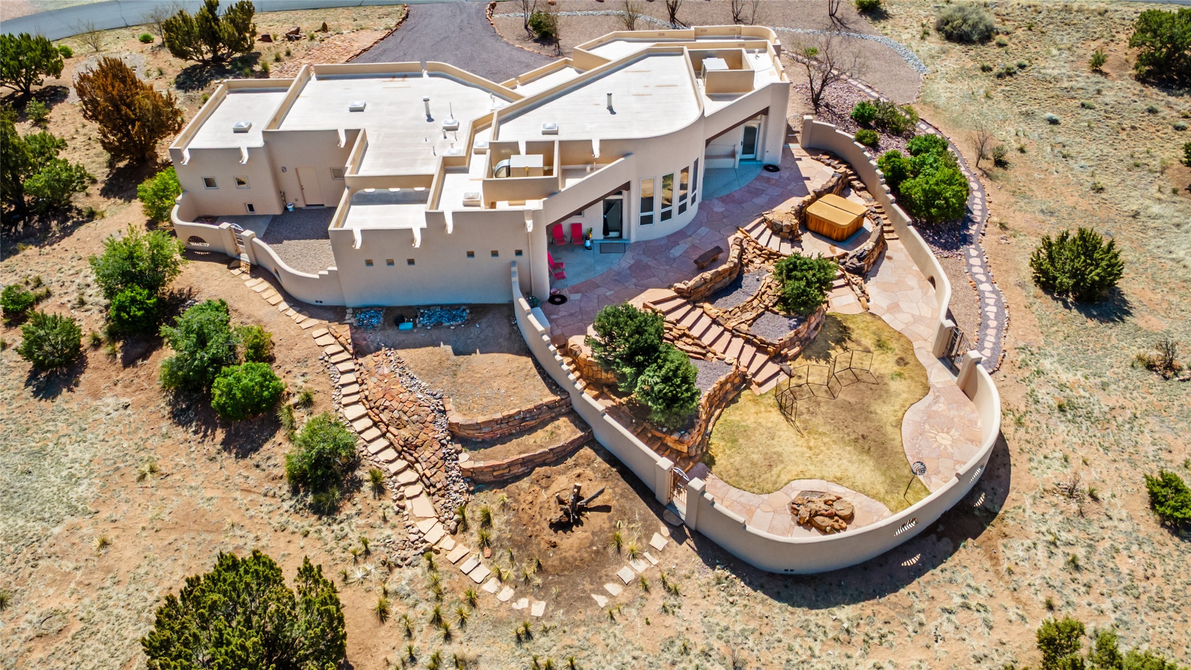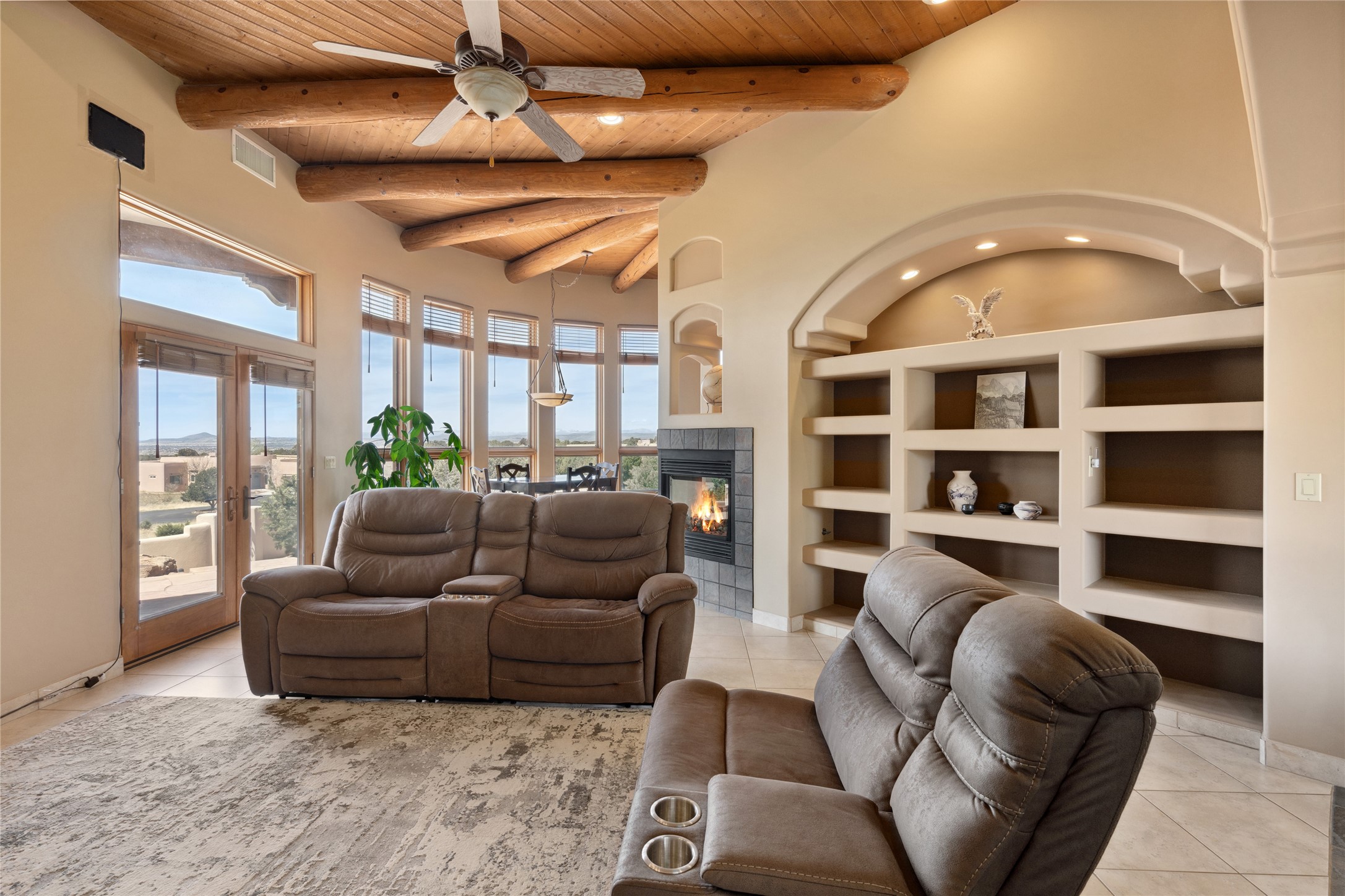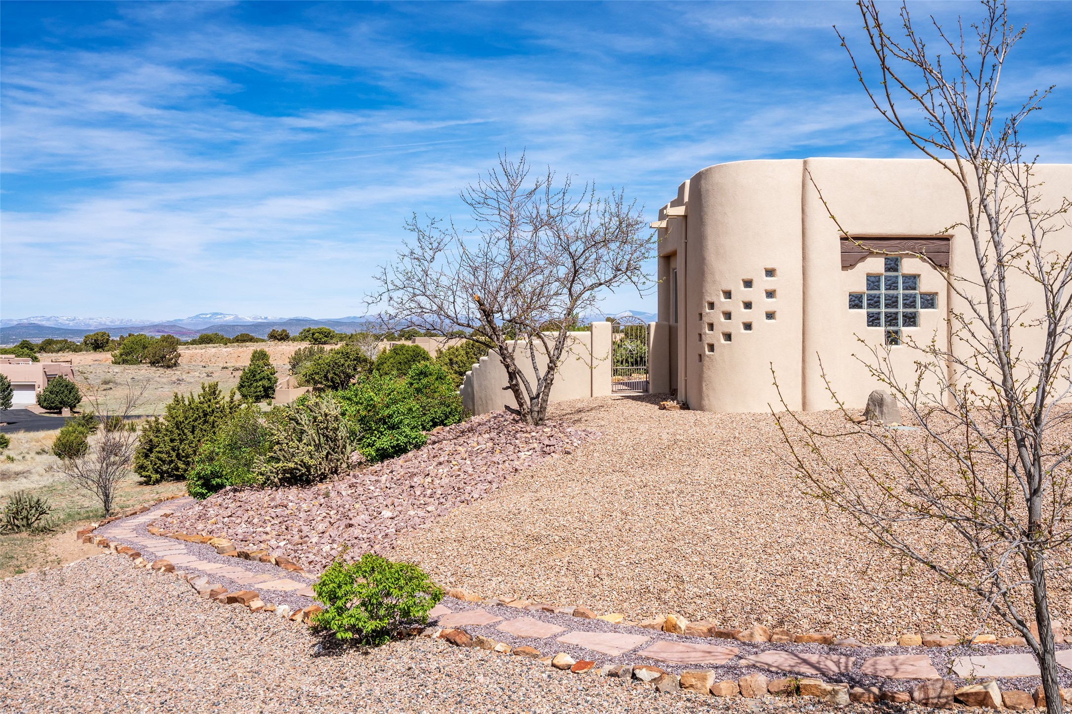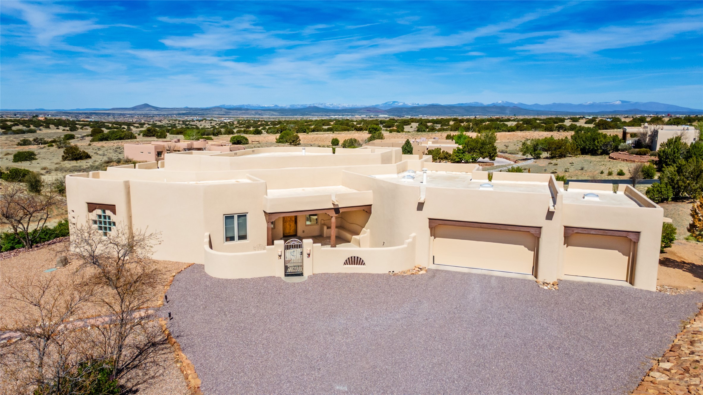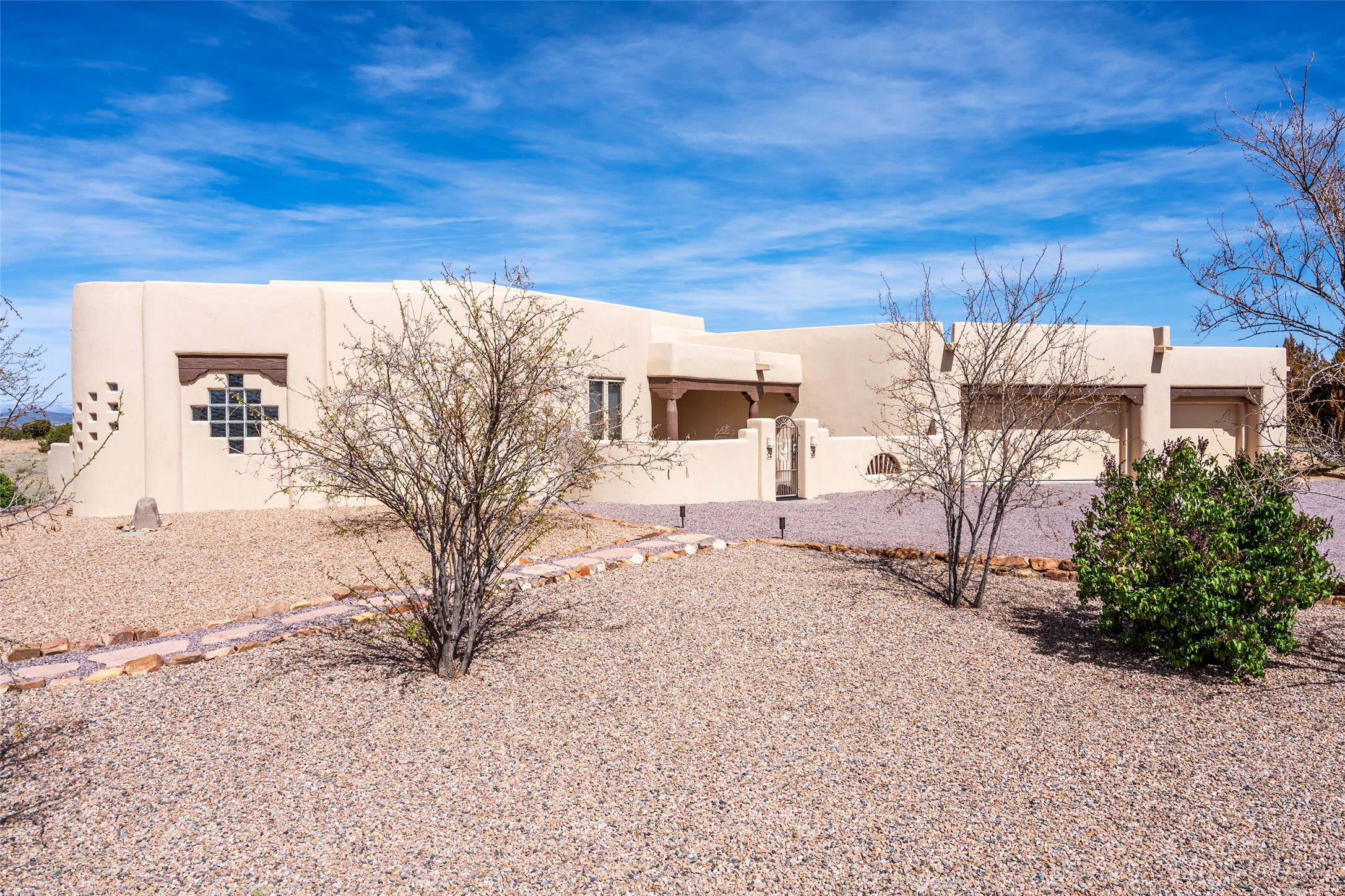 Welcome to this exceptional one-owner custom home, nestled in the coveted Estates section of Rancho Viejo. Set on a generous one-acre view lot, this thoughtfully designed single-level home offers 2,369 square feet of refined Southwest living. From the moment you enter, you'll be captivated by the stunning wood ceilings with vigas, artful nichos, and built-in shelving that blend function with authentic Santa Fe character. A dramatic two-sided gas fireplace anchors the living and dining areas, where a curved wall of windows frames breathtaking Jemez Mountain views. The well-appointed kitchen is a chef's delight, featuring custom wood cabinetry, luxurious granite counters, a stone tile backsplash, and premium appliances including a Dacor cooktop and wall oven, plus a Bosch dishwasher. The home's smart layout offers privacy and comfort, with a dedicated office and a spacious owner's suite in one wing. Enjoy a spa-like bathroom with dual vanities and a large, distinctive walk-in shower plus soaking tub, an oversized walk-in closet with safe cubby, and direct access to the rear portal from the serene primary bedroom. The opposite wing includes three additional bedrooms (one used as a hobby room), a stylish guest bath, a powder room, and a well-equipped laundry area. Outside, the landscaped backyard is a true retreat, complete with artistic custom flagstone patios, a soothing water feature, dramatic natural boulders, and a hot tub--perfect for relaxing under the stars. The oversized three-car garage includes space for a workshop or extra storage. Lovingly maintained and rich in Southwest charm, this home offers privacy, views, and elegant livability in one of Santa Fe's most desirable neighborhoods.