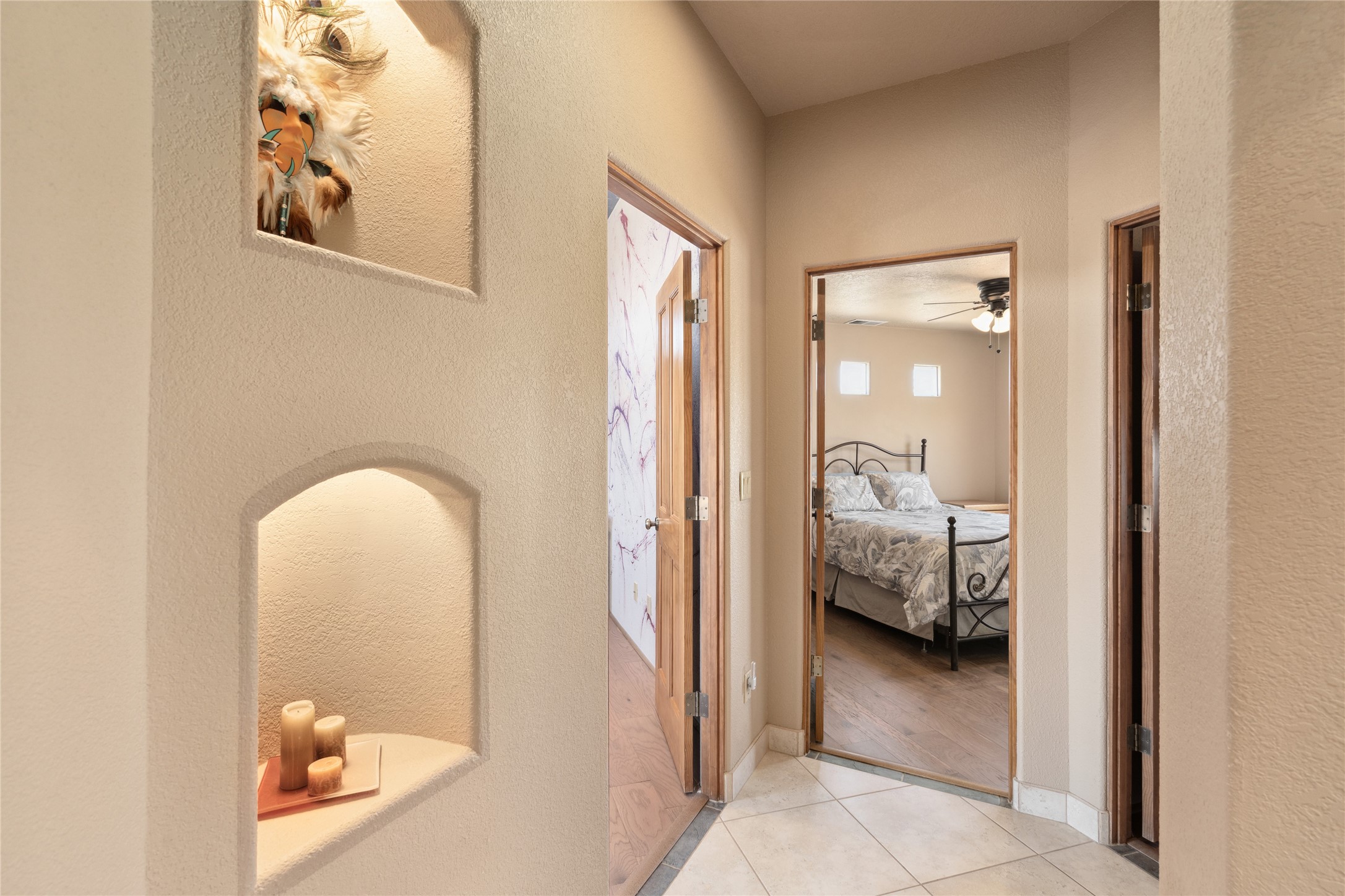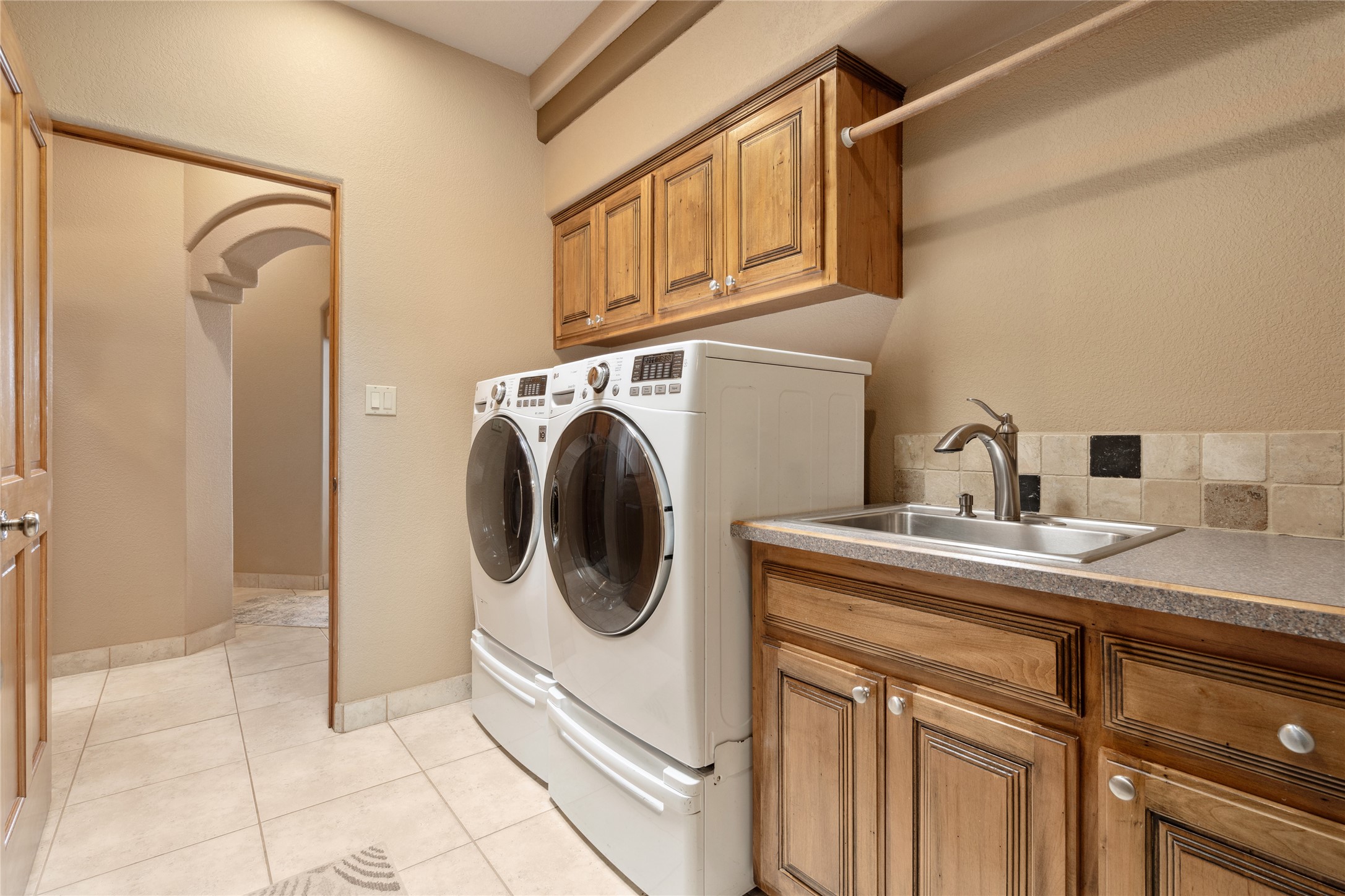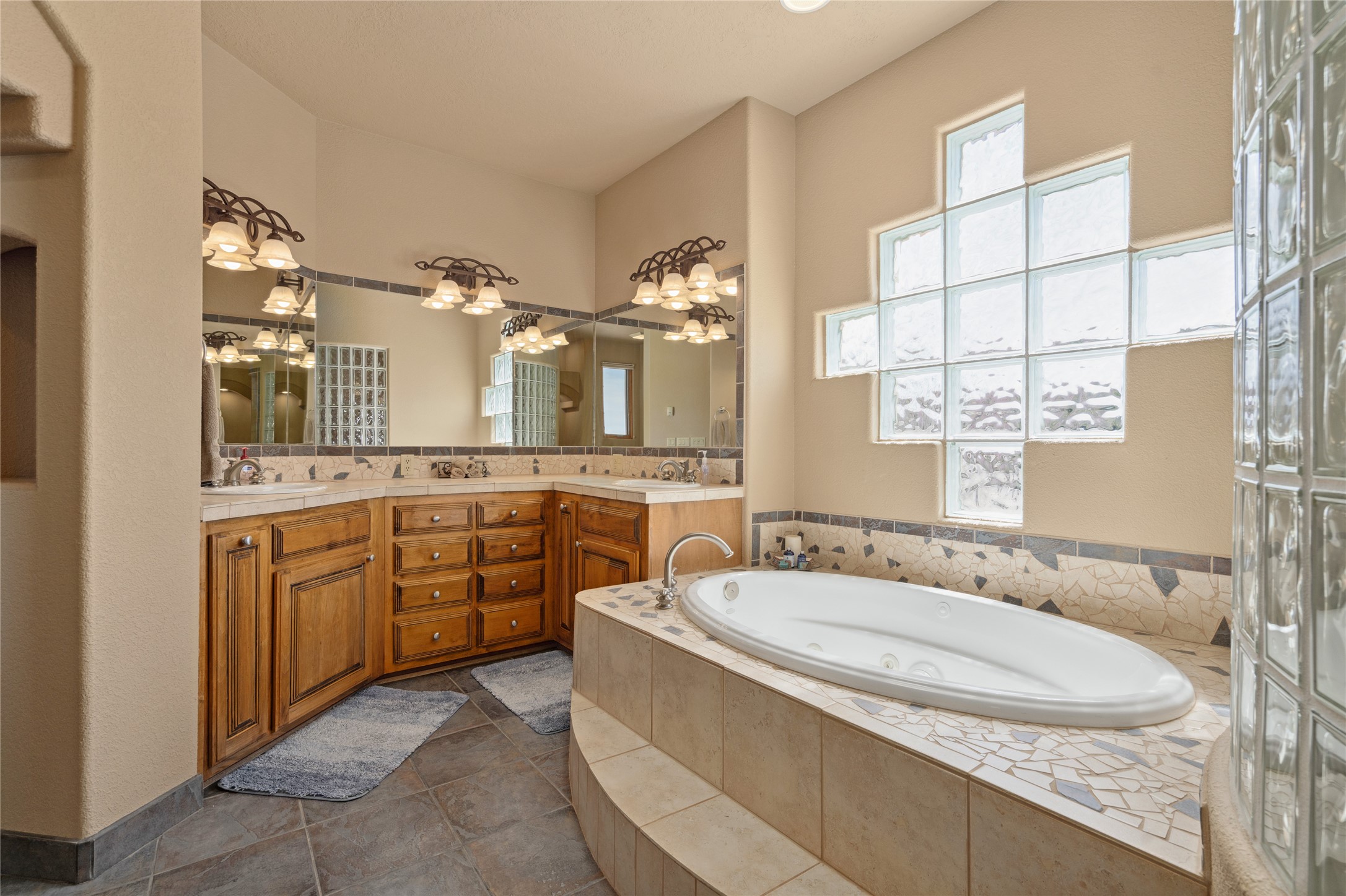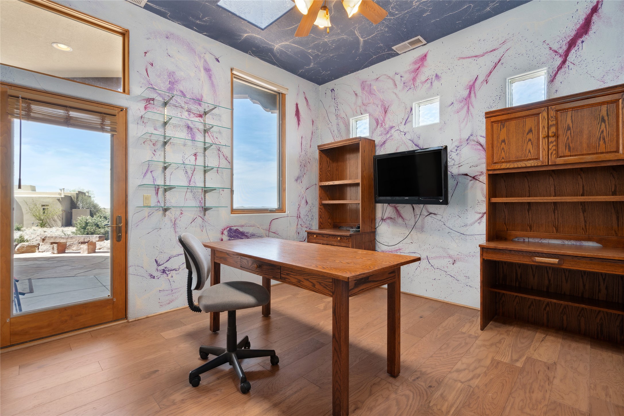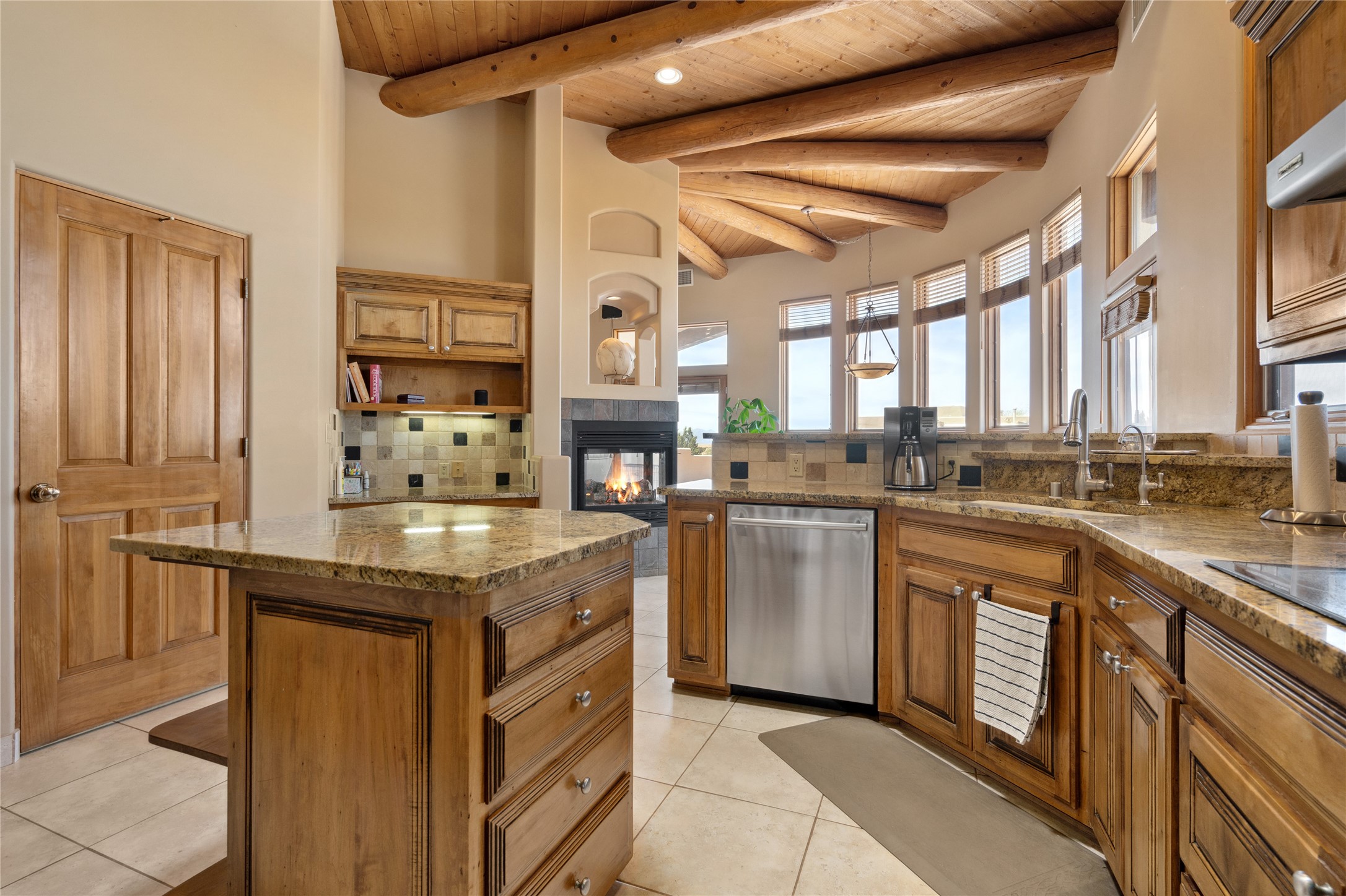 Welcome to this exceptional one-owner custom home, nestled in the coveted Estates section of Rancho Viejo. Set on a generous one-acre view lot, this thoughtfully designed single-level home offers 2,369 square feet of refined Southwest living. From the moment you enter, you'll be captivated by the stunning wood ceilings with vigas, artful nichos, and built-in shelving that blend function with authentic Santa Fe character. A dramatic two-sided gas fireplace anchors the living and dining areas, where a curved wall of windows frames breathtaking Jemez Mountain views. The well-appointed kitchen is a chef's delight, featuring custom wood cabinetry, luxurious granite counters, a stone tile backsplash, and premium appliances including a Dacor cooktop and wall oven, plus a Bosch dishwasher. The home's smart layout offers privacy and comfort, with a dedicated office and a spacious owner's suite in one wing. Enjoy a spa-like bathroom with dual vanities and a large, distinctive walk-in shower plus soaking tub, an oversized walk-in closet with safe cubby, and direct access to the rear portal from the serene primary bedroom. The opposite wing includes three additional bedrooms (one used as a hobby room), a stylish guest bath, a powder room, and a well-equipped laundry area. Outside, the landscaped backyard is a true retreat, complete with artistic custom flagstone patios, a soothing water feature, dramatic natural boulders, and a hot tub--perfect for relaxing under the stars. The oversized three-car garage includes space for a workshop or extra storage. Lovingly maintained and rich in Southwest charm, this home offers privacy, views, and elegant livability in one of Santa Fe's most desirable neighborhoods.
