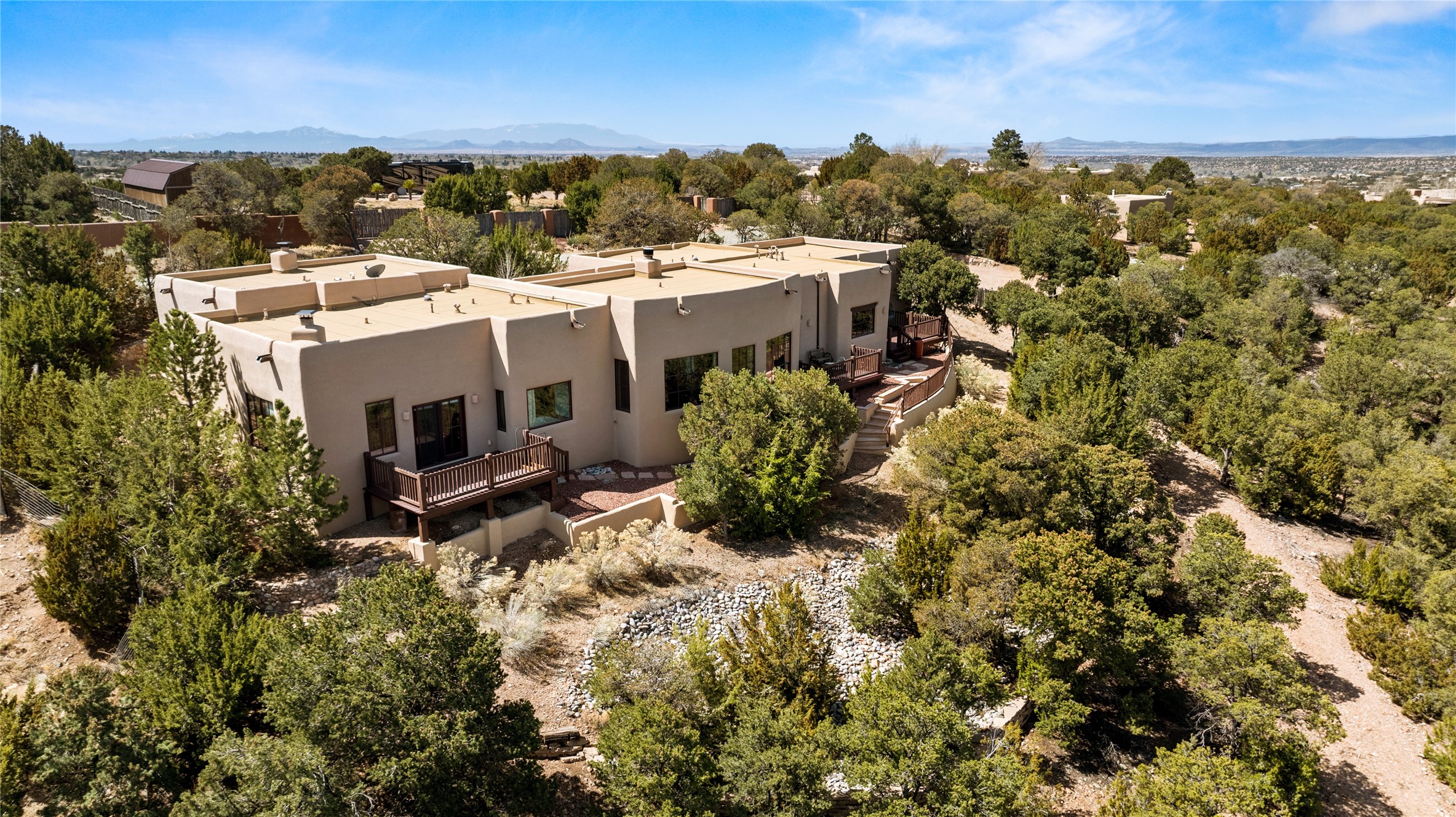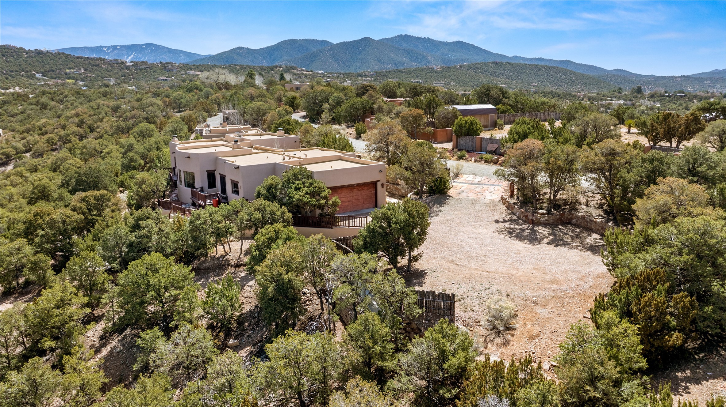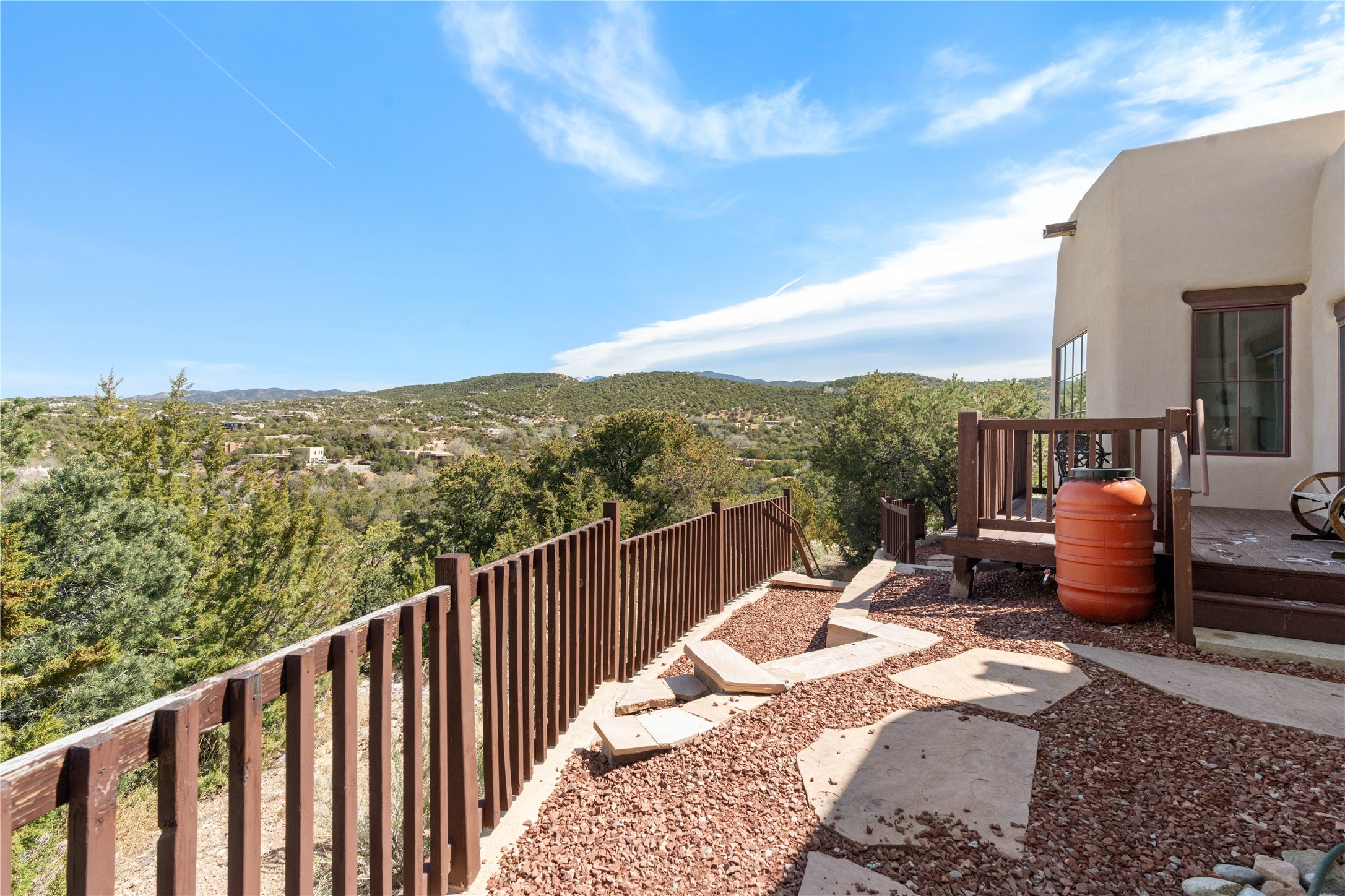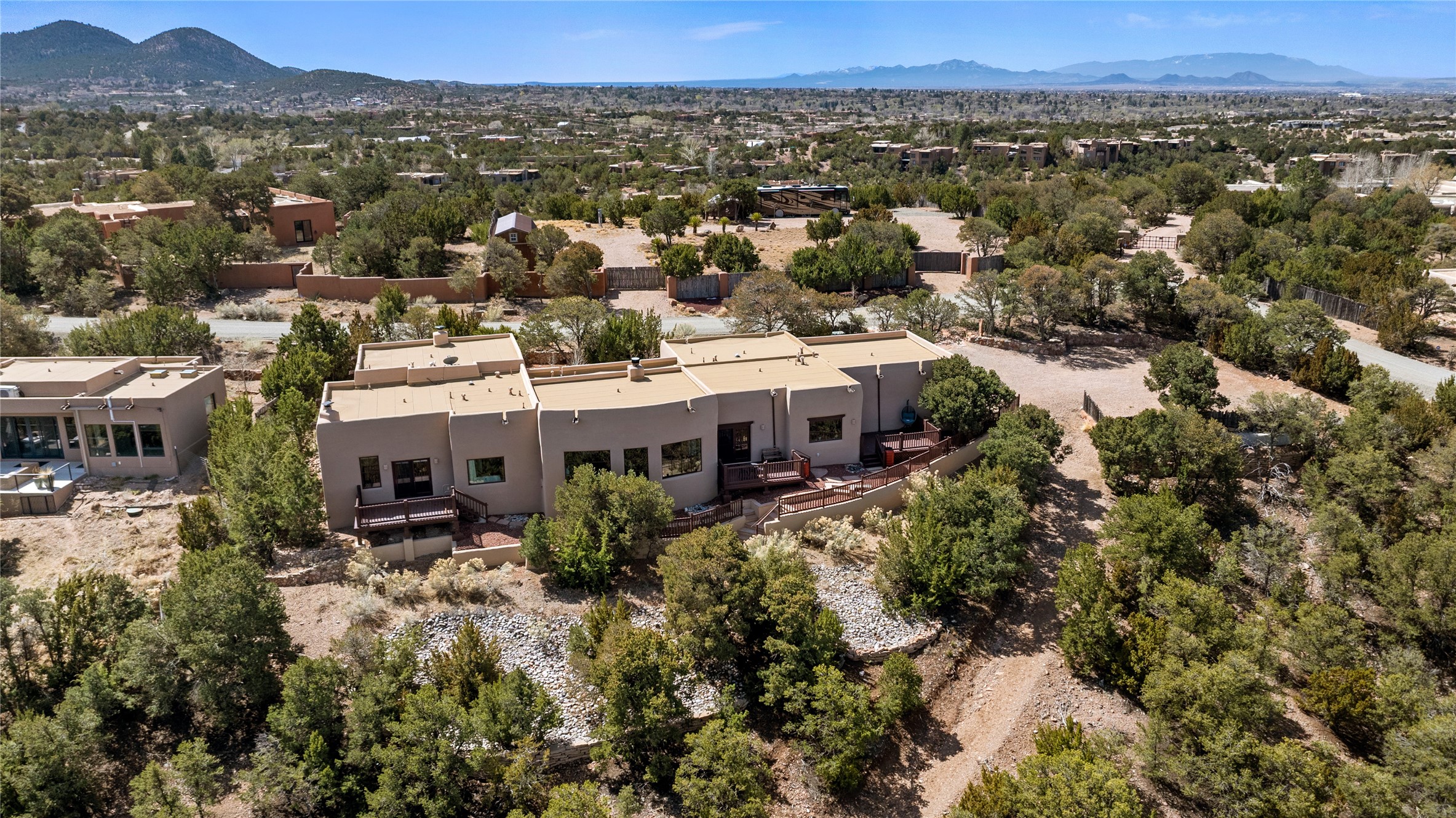 Experience timeless Santa Fe elegance in this exquisite 3-bedroom, 4-bath double adobe home perched on a 2.017 acre lot, offering sweeping 180 degree views of the Sangre de Cristo foothills. The location is fantastic--just minutes from the Santa Fe Plaza, Canyon Road, Museum Hill, Ten Thousand Waves, and less than 1/2 hour to the Santa Fe Ski Area. The residence features white plaster walls, beautifully laid brick floors, and soaring ceilings adorned with vigas and latillas. A new custom-made La Puerta front door sets the tone for the home's authentic charm. The en-suite primary bedroom boasts a corner fireplace and private balcony access. A separate guest suite includes its own kitchenette and entrance. Multiple decks provide perfect vantage points to relax and take in the stunning scenery. The gourmet kitchen, formal dining room, and three fireplaces create a warm, inviting atmosphere. A new roof was installed in 2020 and includes a transferable warranty for peace of mind. Additional highlights include a 2-car garage, ample off-street parking, and a potential building site on the lower portion of the lot. This is Santa Fe living at its finest - Schedule a showing today!