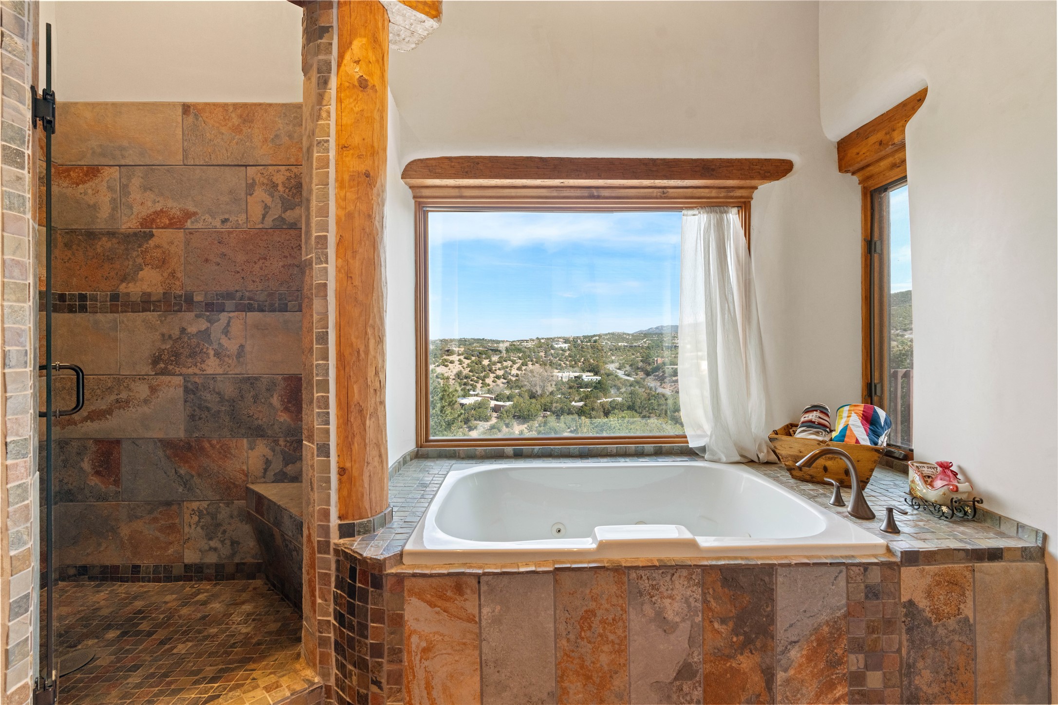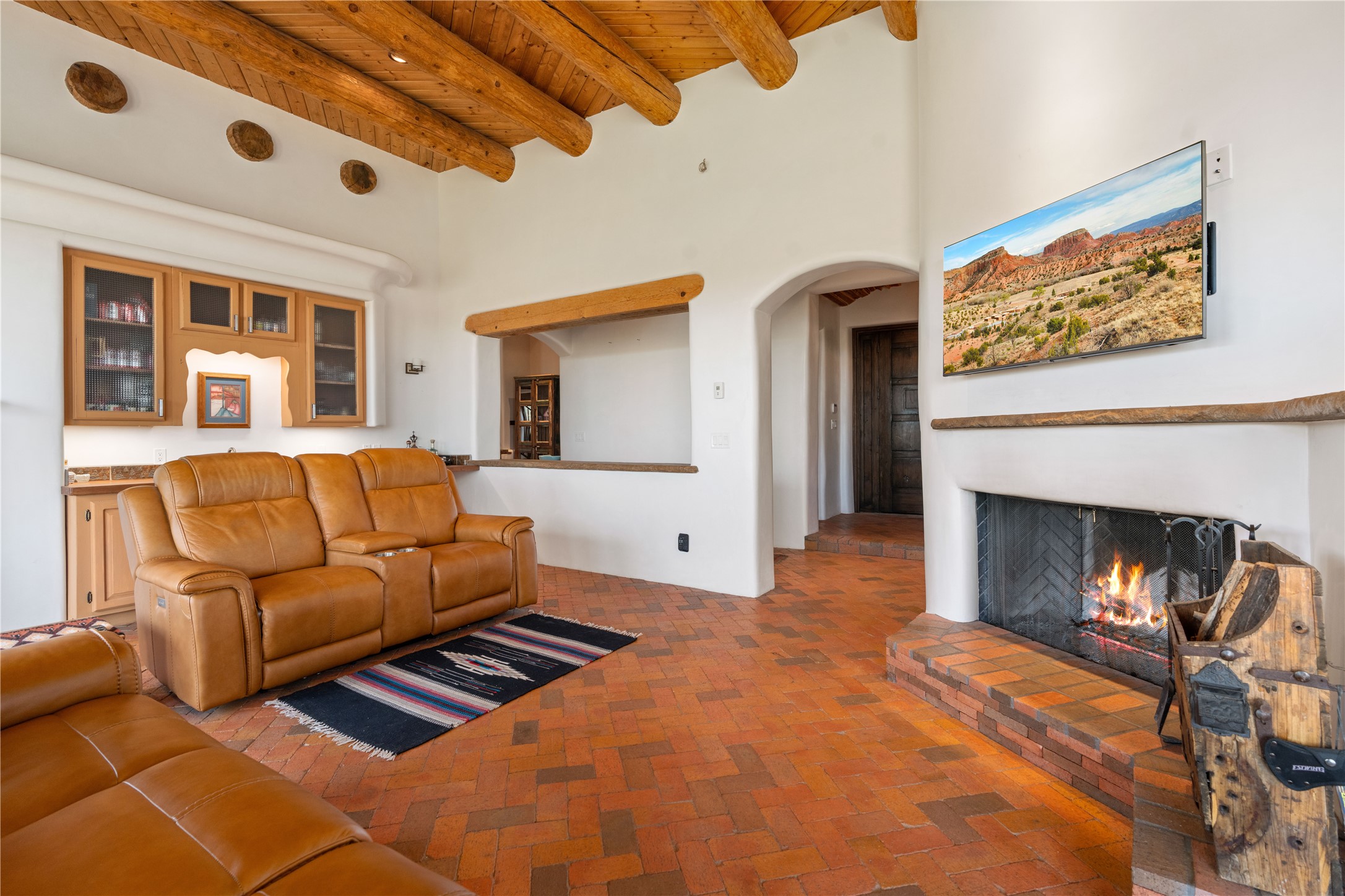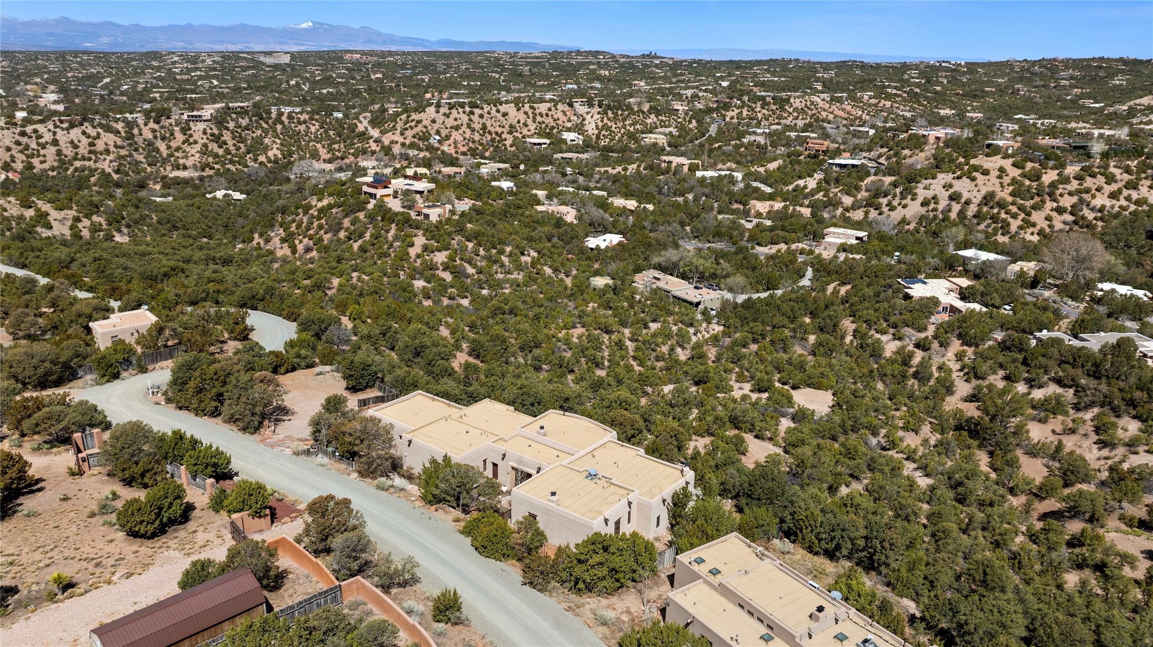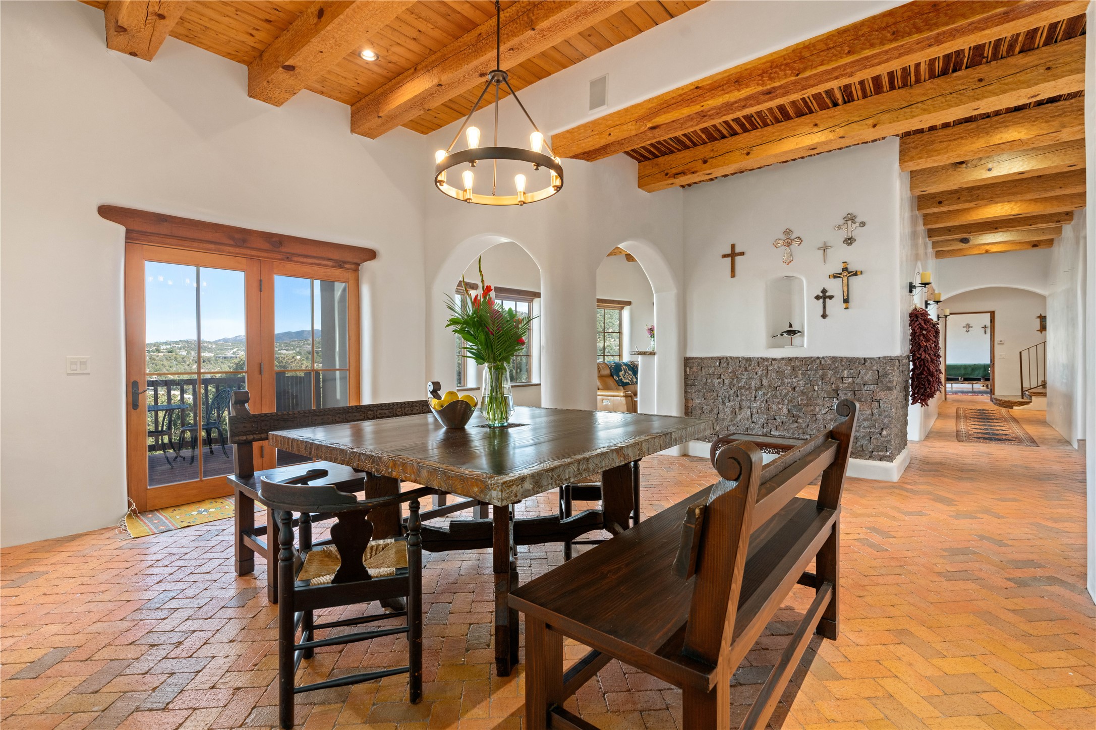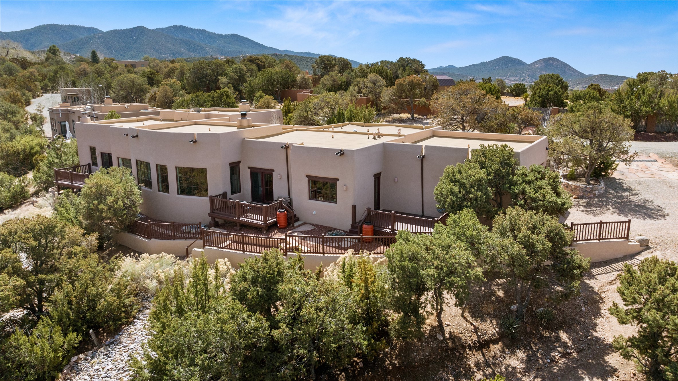 Experience timeless Santa Fe elegance in this exquisite 3-bedroom, 4-bath double adobe home perched on a 2.017 acre lot, offering sweeping 180 degree views of the Sangre de Cristo foothills. The location is fantastic--just minutes from the Santa Fe Plaza, Canyon Road, Museum Hill, Ten Thousand Waves, and less than 1/2 hour to the Santa Fe Ski Area. The residence features white plaster walls, beautifully laid brick floors, and soaring ceilings adorned with vigas and latillas. A new custom-made La Puerta front door sets the tone for the home's authentic charm. The en-suite primary bedroom boasts a corner fireplace and private balcony access. A separate guest suite includes its own kitchenette and entrance. Multiple decks provide perfect vantage points to relax and take in the stunning scenery. The gourmet kitchen, formal dining room, and three fireplaces create a warm, inviting atmosphere. A new roof was installed in 2020 and includes a transferable warranty for peace of mind. Additional highlights include a 2-car garage, ample off-street parking, and a potential building site on the lower portion of the lot. This is Santa Fe living at its finest - Schedule a showing today!