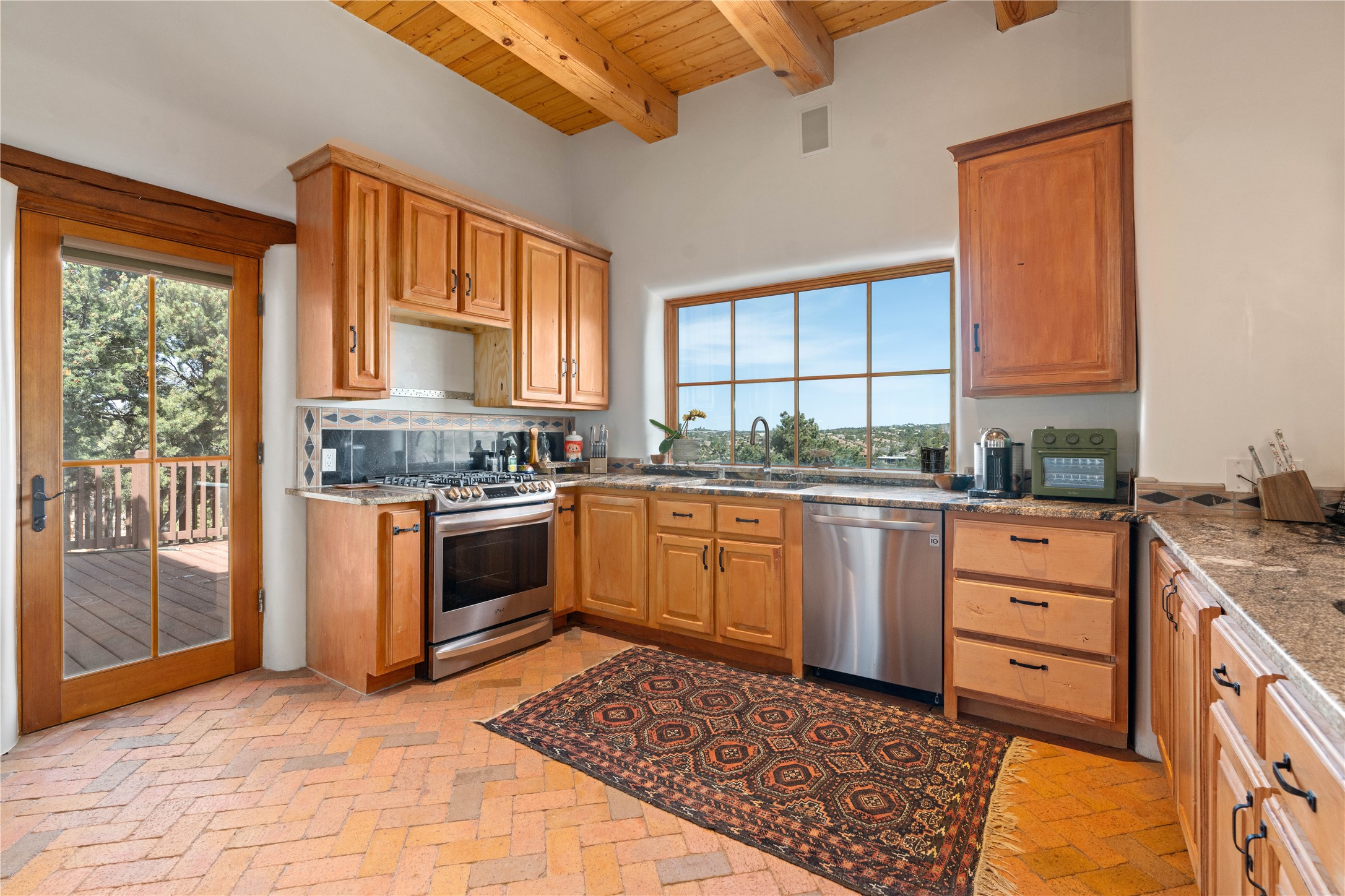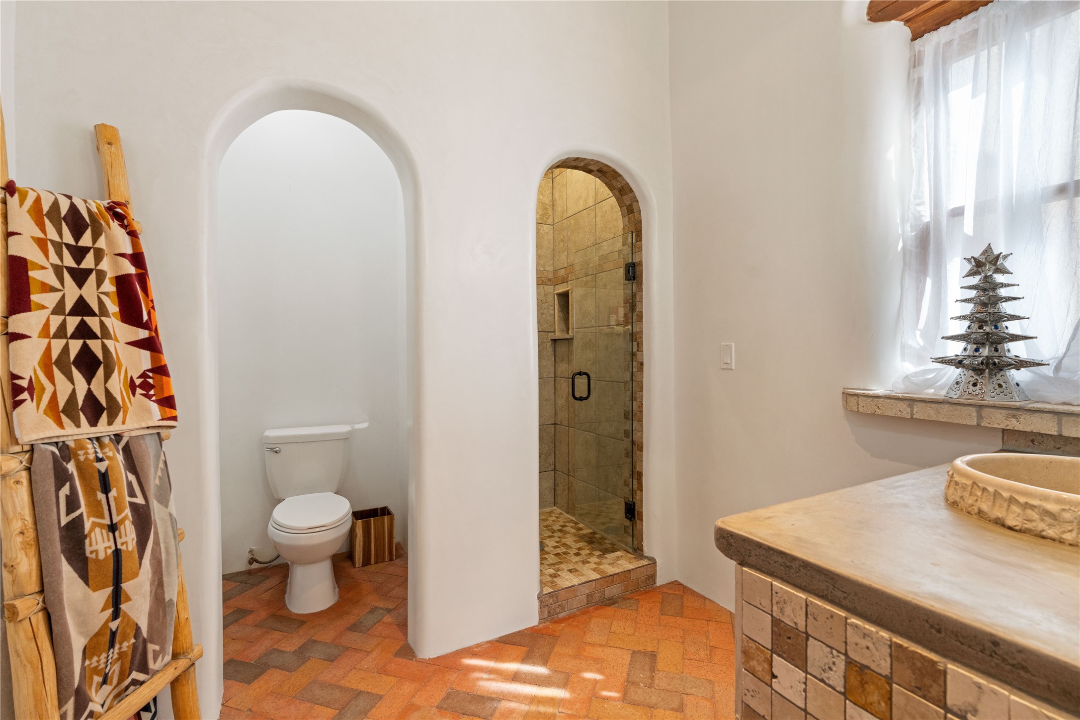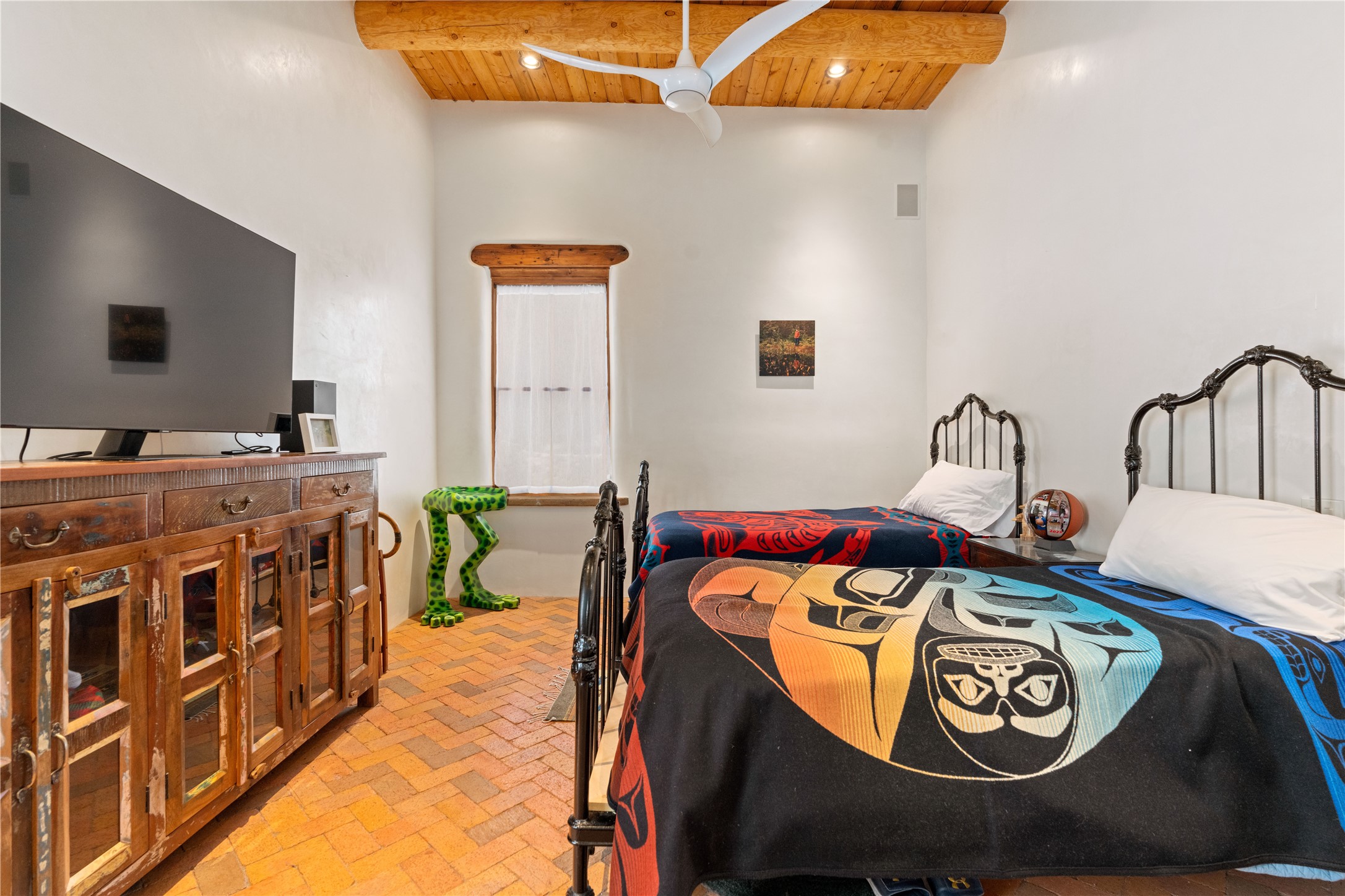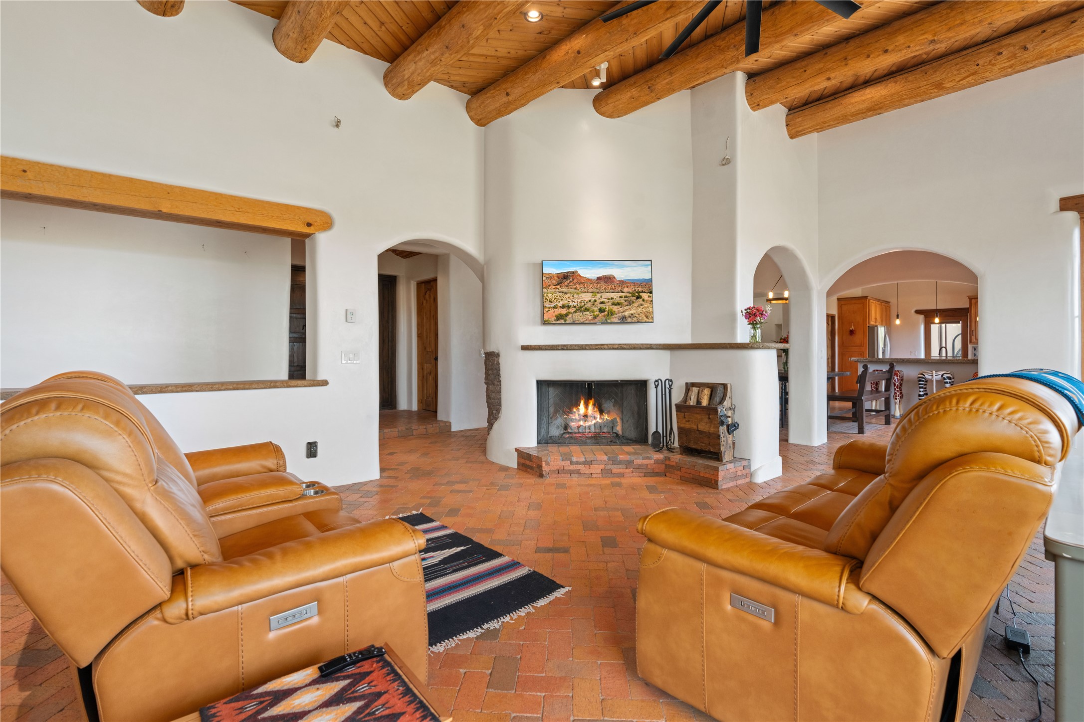 Experience timeless Santa Fe elegance in this exquisite 3-bedroom, 4-bath double adobe home perched on a 2.017 acre lot, offering sweeping 180 degree views of the Sangre de Cristo foothills. The location is fantastic--just minutes from the Santa Fe Plaza, Canyon Road, Museum Hill, Ten Thousand Waves, and less than 1/2 hour to the Santa Fe Ski Area. The residence features white plaster walls, beautifully laid brick floors, and soaring ceilings adorned with vigas and latillas. A new custom-made La Puerta front door sets the tone for the home's authentic charm. The en-suite primary bedroom boasts a corner fireplace and private balcony access. A separate guest suite includes its own kitchenette and entrance. Multiple decks provide perfect vantage points to relax and take in the stunning scenery. The gourmet kitchen, formal dining room, and three fireplaces create a warm, inviting atmosphere. A new roof was installed in 2020 and includes a transferable warranty for peace of mind. Additional highlights include a 2-car garage, ample off-street parking, and a potential building site on the lower portion of the lot. This is Santa Fe living at its finest - Schedule a showing today!