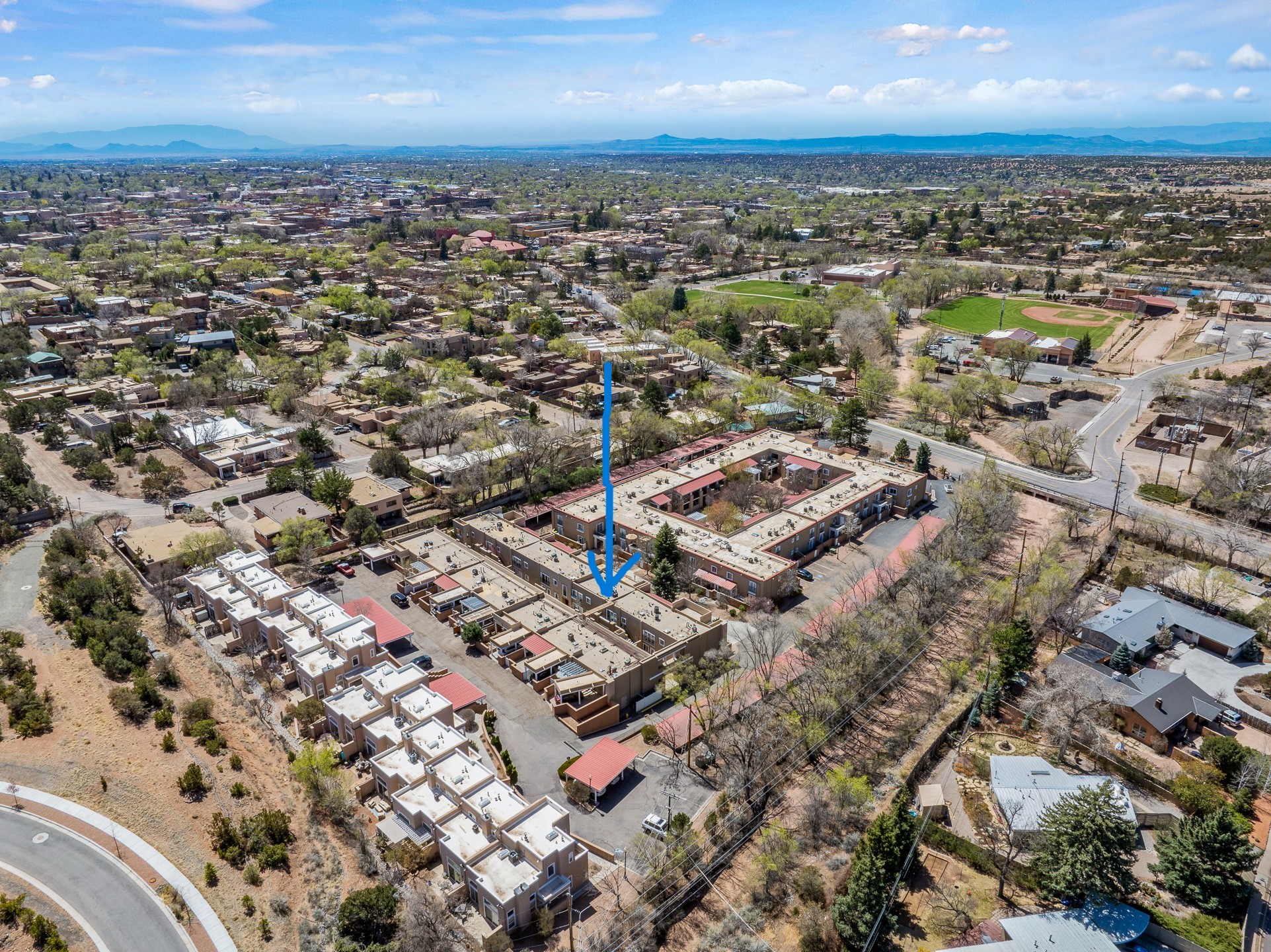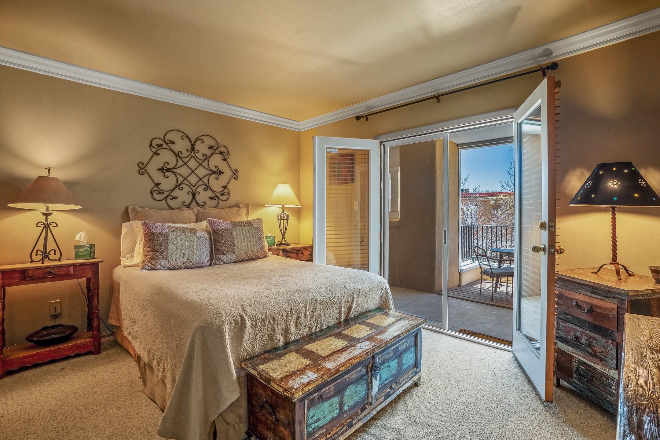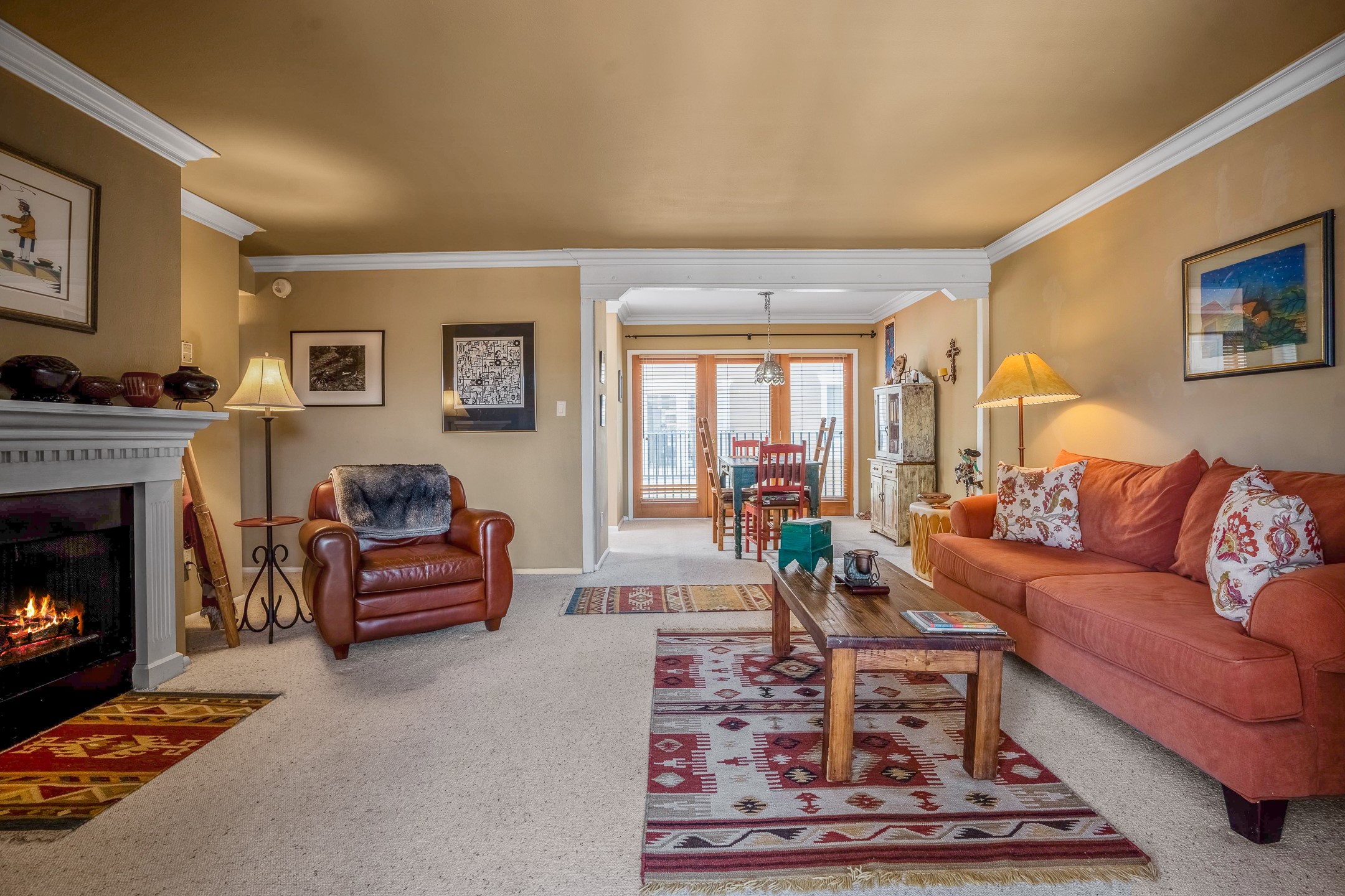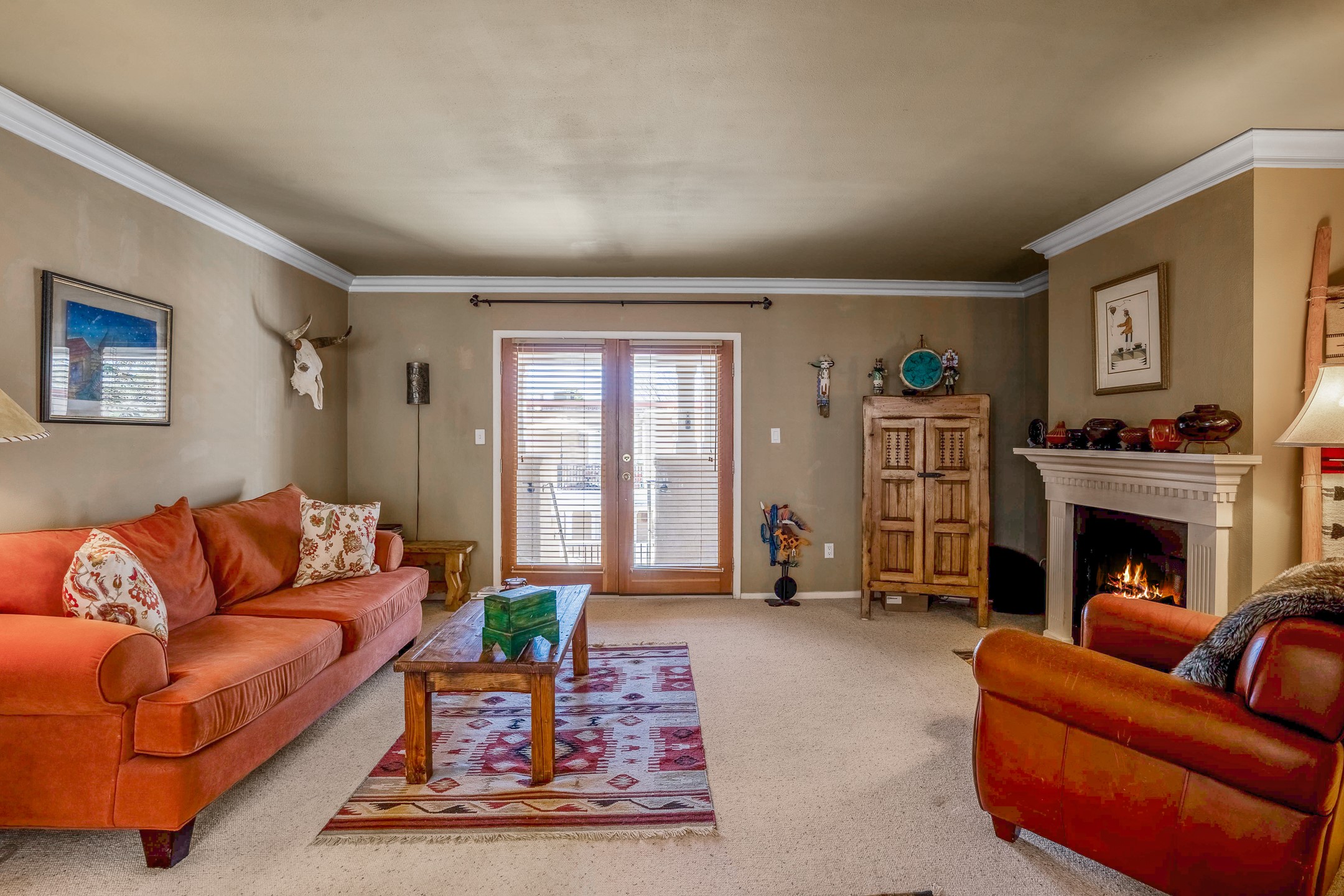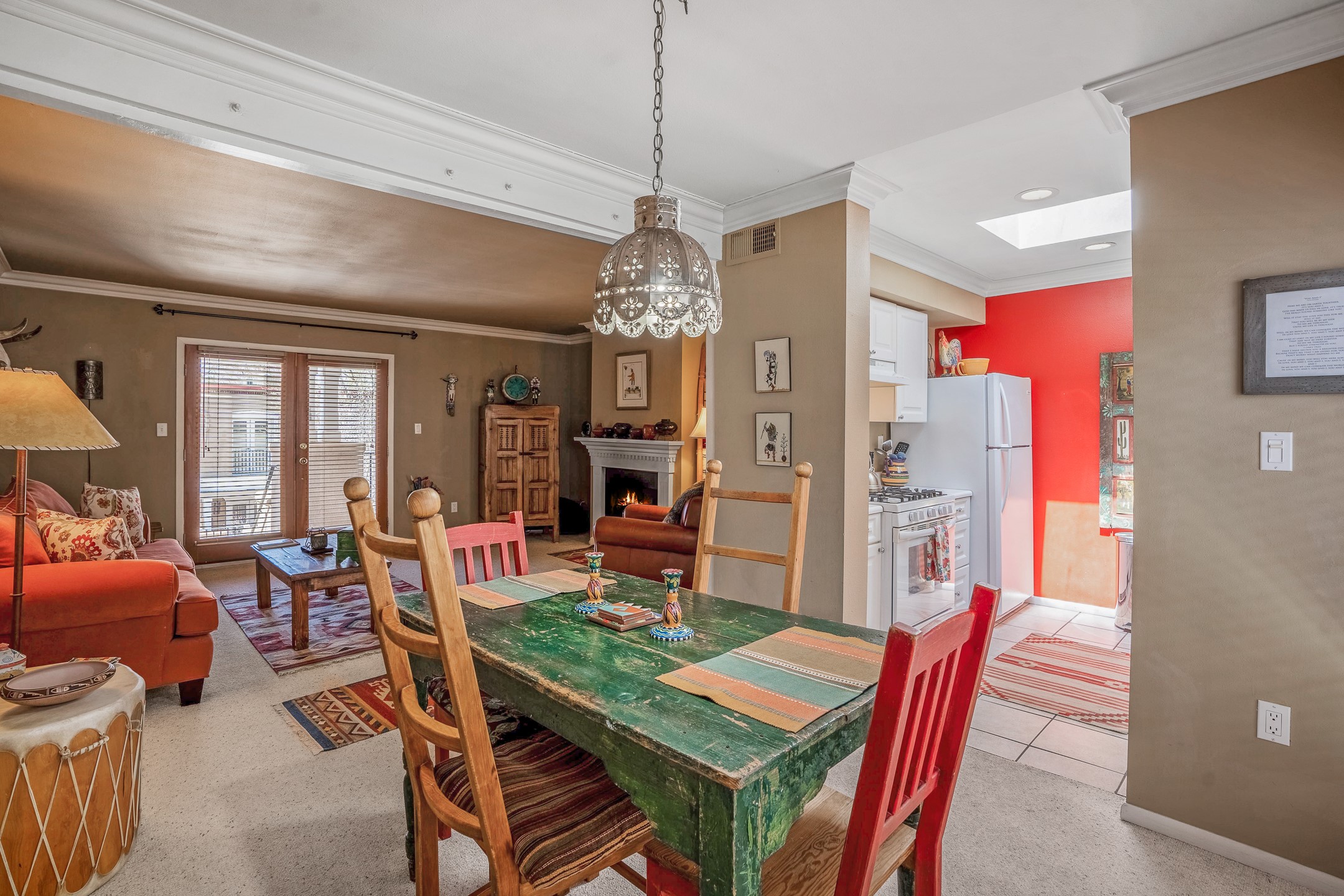 This second-floor condo has a warm and bright interior and offers a very spacious feel. The front patio is generously sized and can be accessed from the living room and the bedroom through 2 sets of French doors. This gated community is ideally located just a few blocks north of the downtown plaza, and across the street from the Fort Marcy Sports Complex, which offers a large park, pickle ball courts, a workout facility and indoor pool. The El Matador Condominiums feature a gated entrance and a beautiful and lush interior courtyard. There is one reserved space in the carport, and several guest parking spots. The condo has refrigerated central air-conditioning and forced-air heat, and a gas fireplace. Ideal for investors, and as a part-time home. Some furnishings included with sale at no additional cost. Washer/dryer in condo. Storage locker located off front patio area.