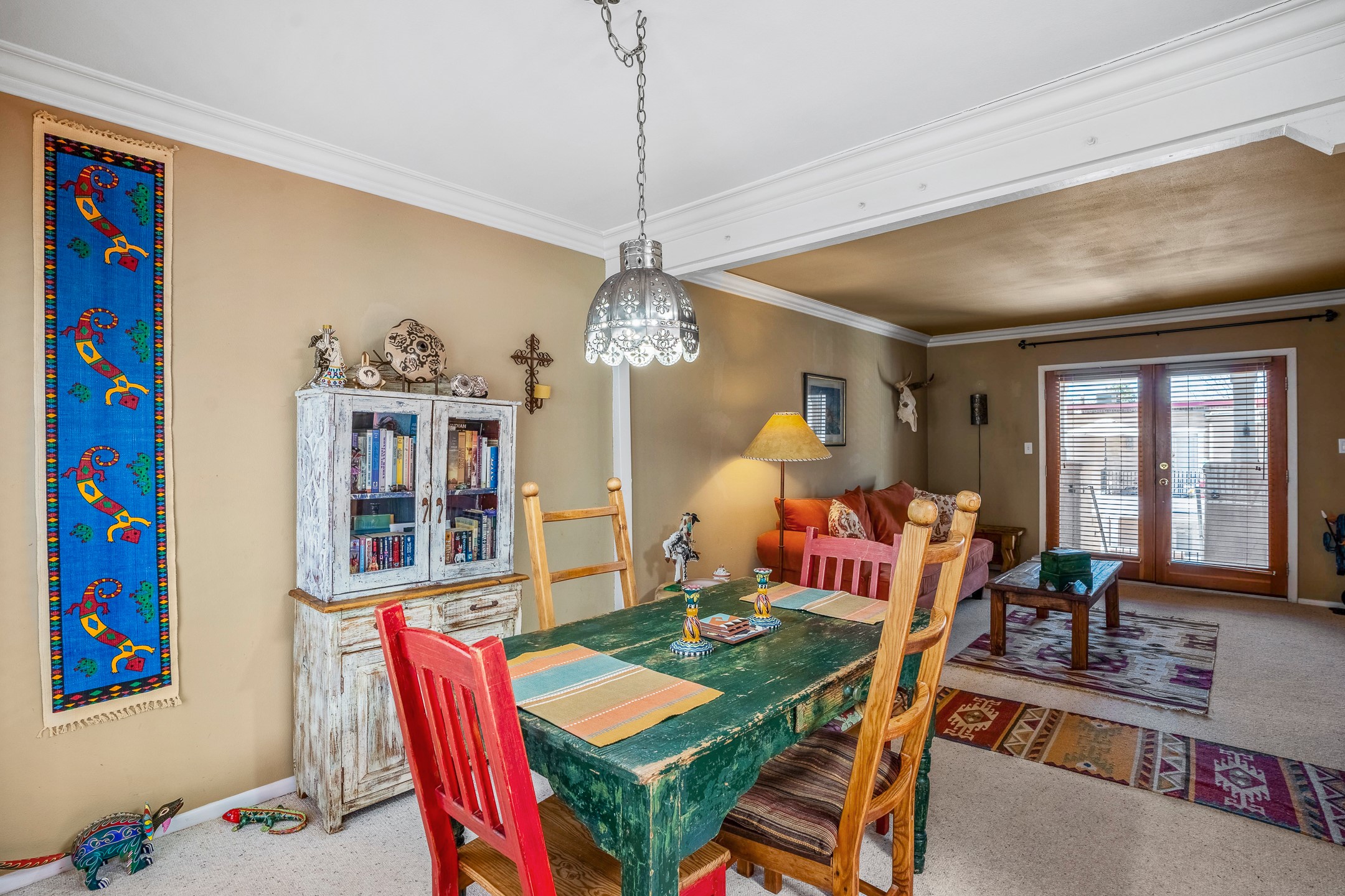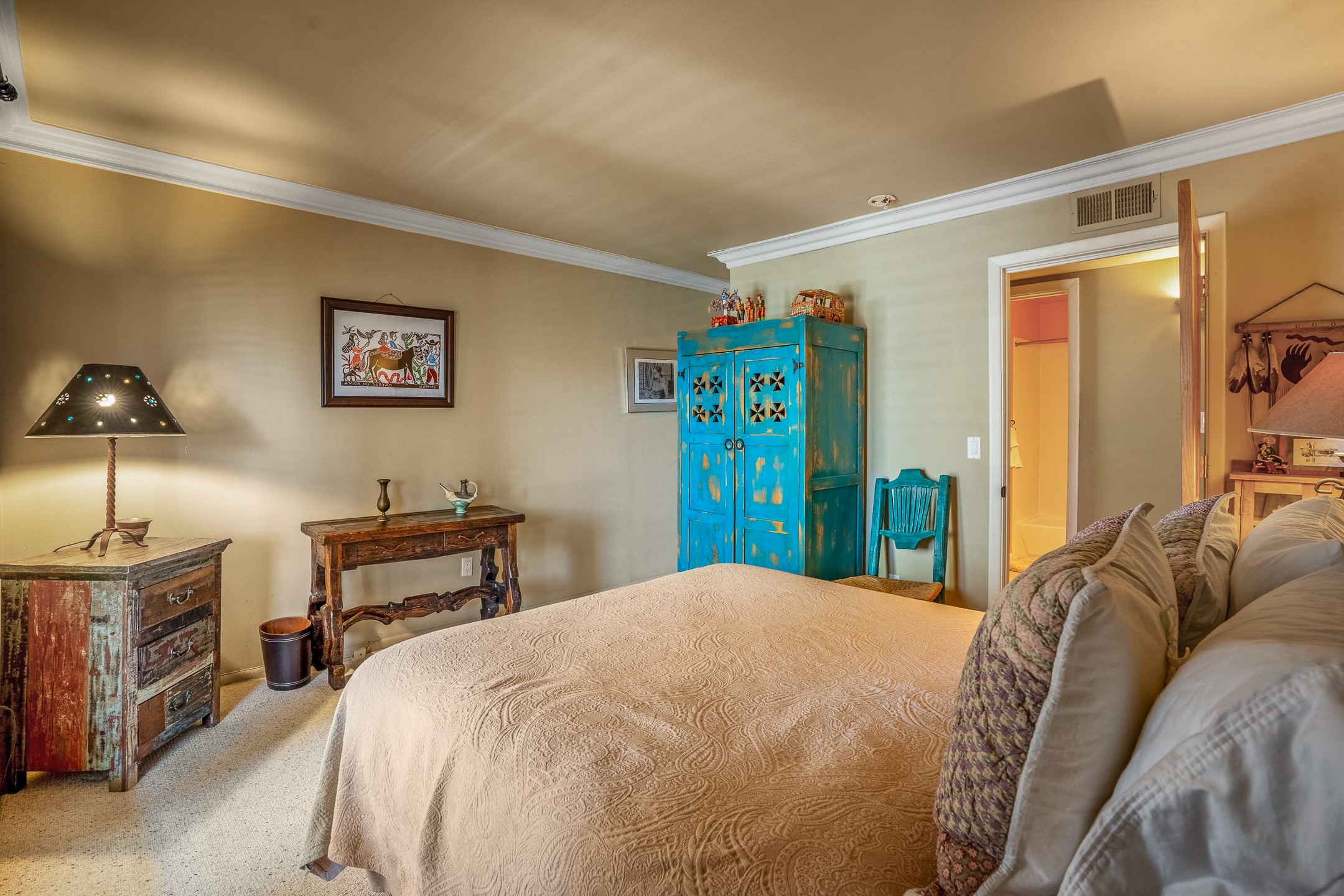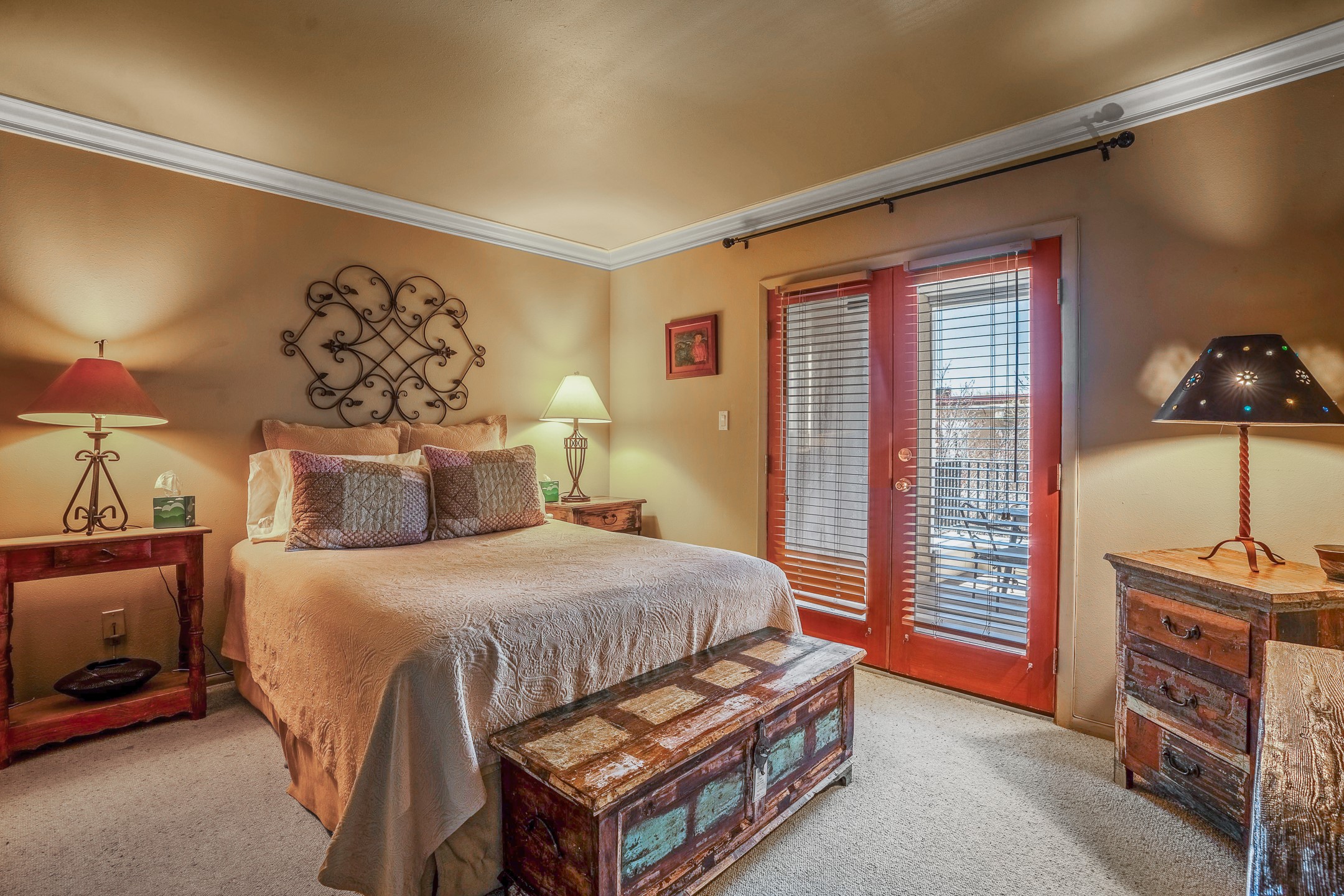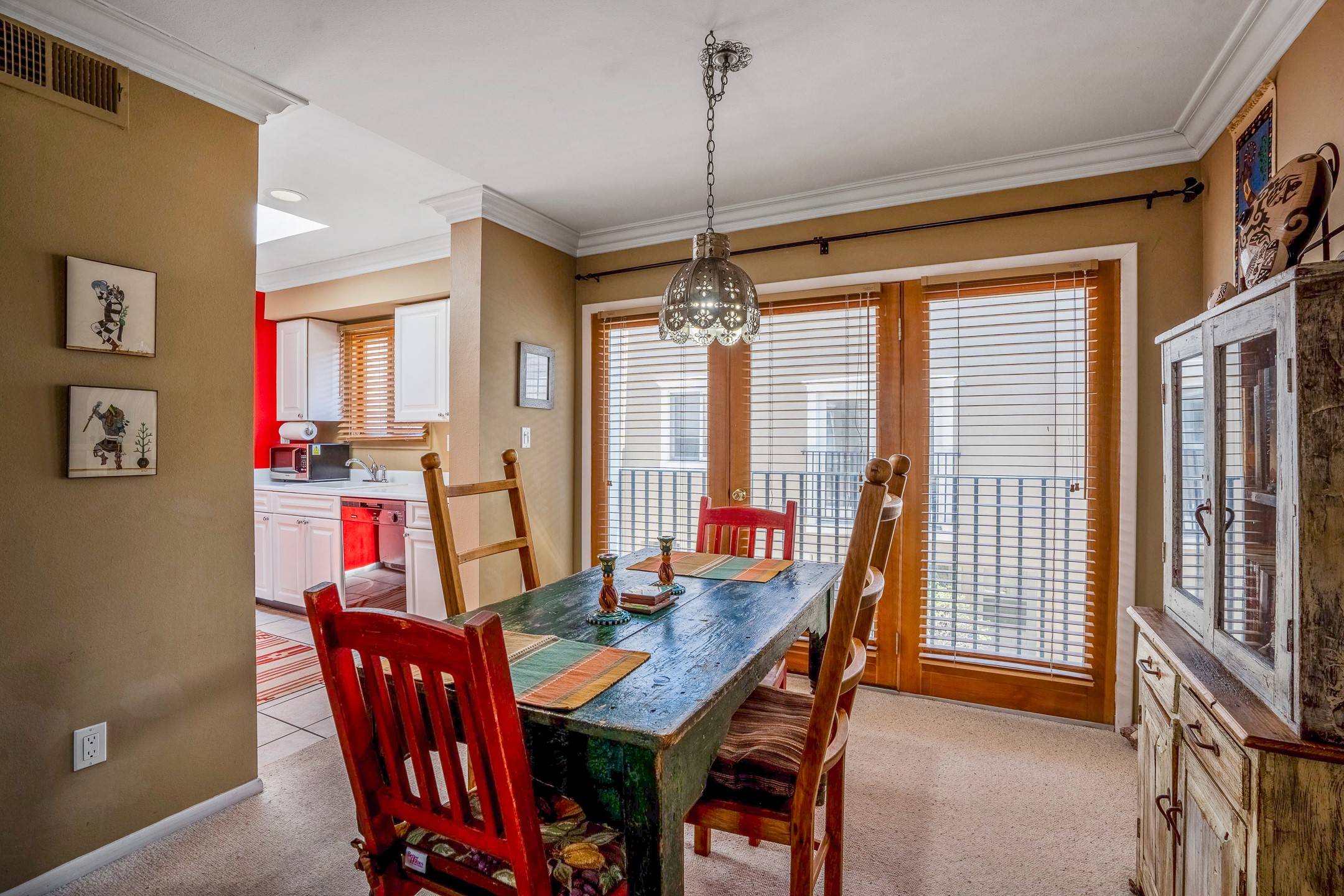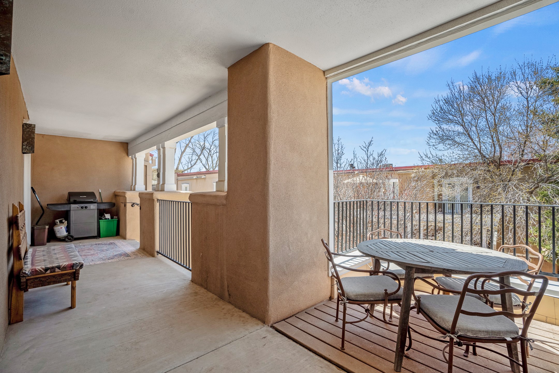 This second-floor condo has a warm and bright interior and offers a very spacious feel. The front patio is generously sized and can be accessed from the living room and the bedroom through 2 sets of French doors. This gated community is ideally located just a few blocks north of the downtown plaza, and across the street from the Fort Marcy Sports Complex, which offers a large park, pickle ball courts, a workout facility and indoor pool. The El Matador Condominiums feature a gated entrance and a beautiful and lush interior courtyard. There is one reserved space in the carport, and several guest parking spots. The condo has refrigerated central air-conditioning and forced-air heat, and a gas fireplace. Ideal for investors, and as a part-time home. Some furnishings included with sale at no additional cost. Washer/dryer in condo. Storage locker located off front patio area.