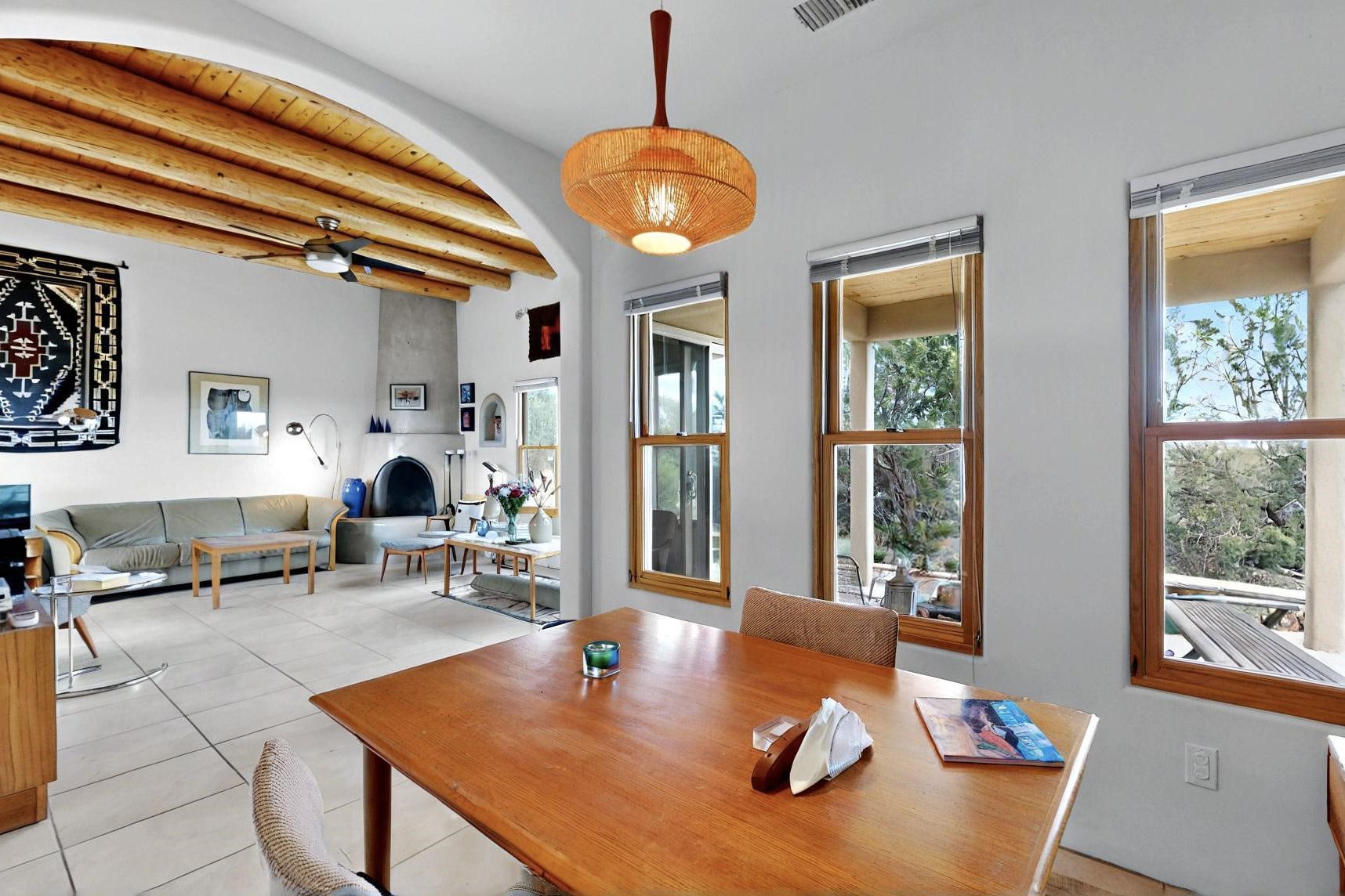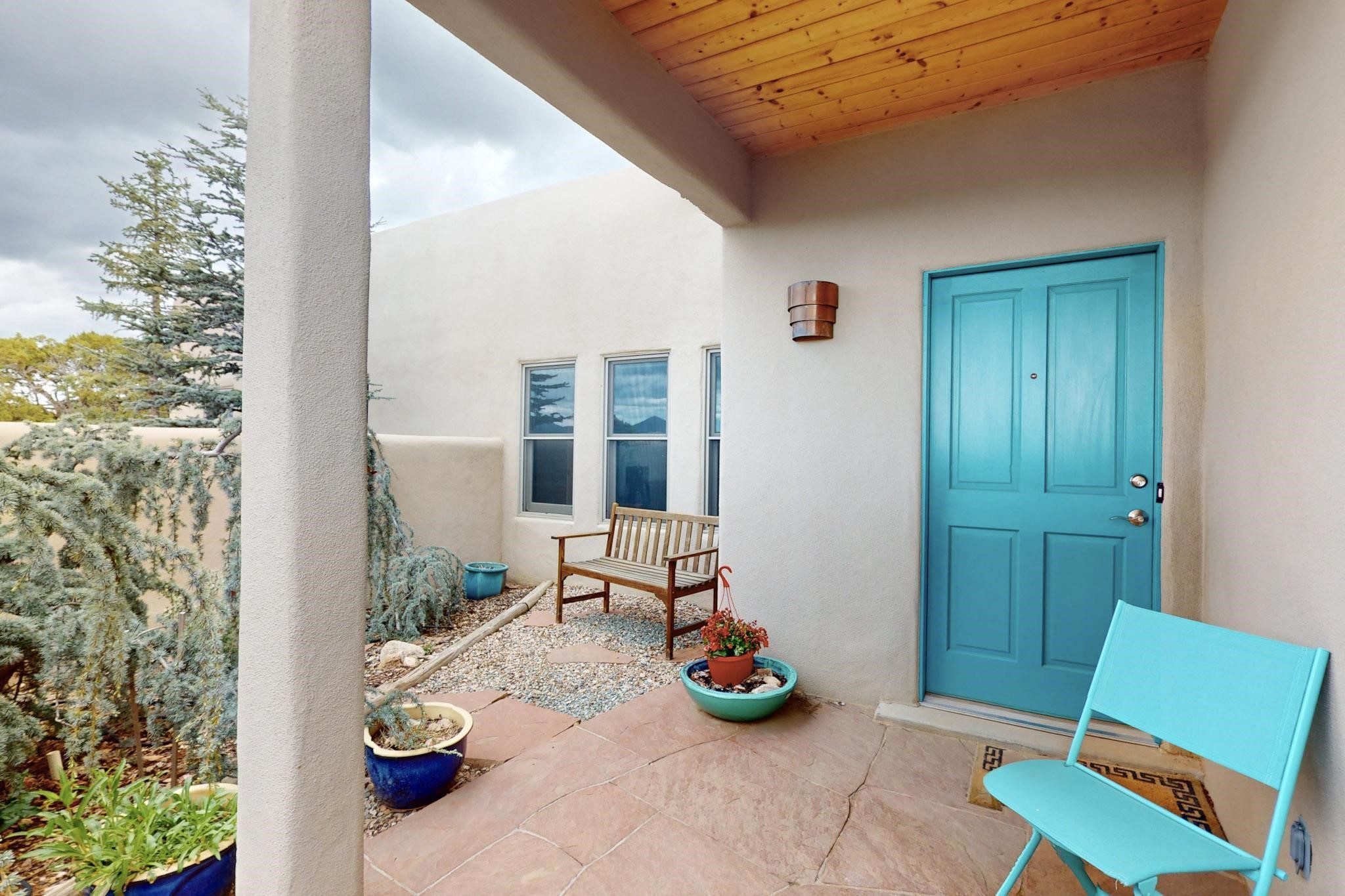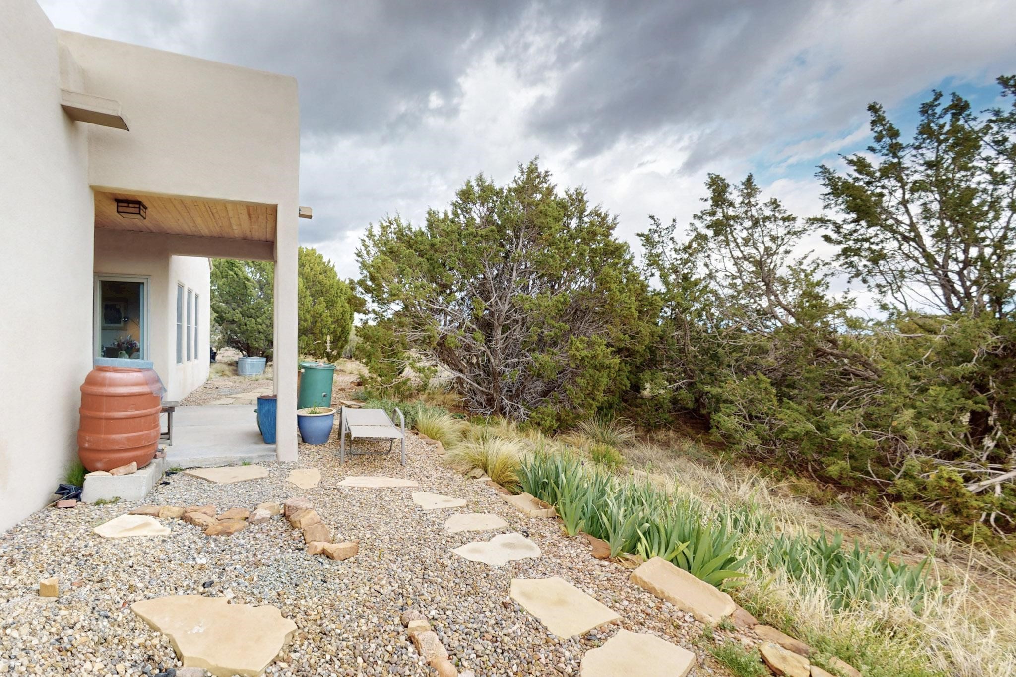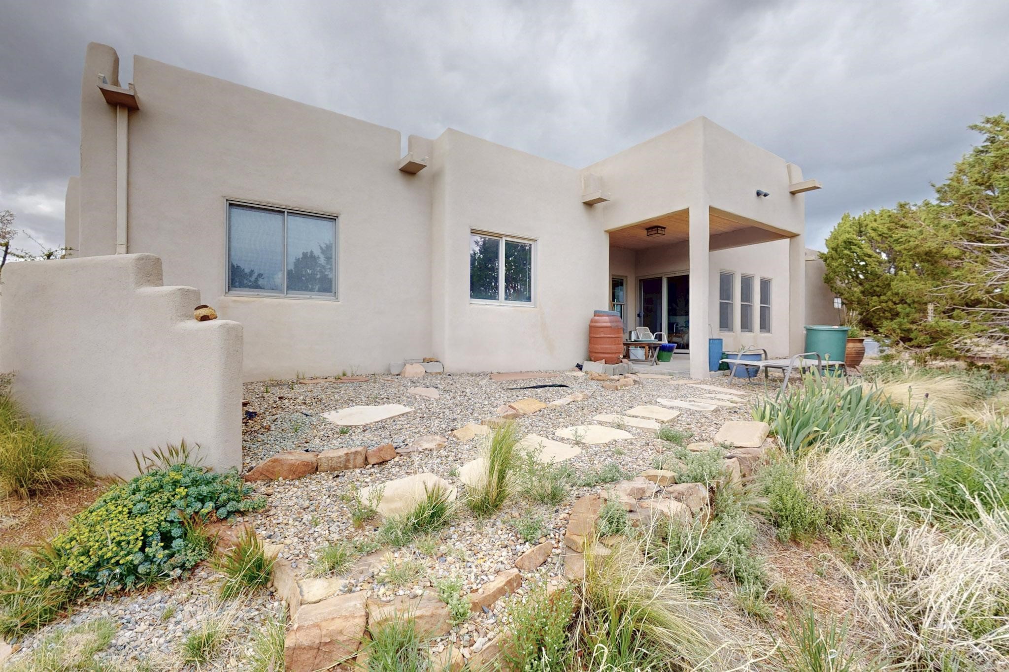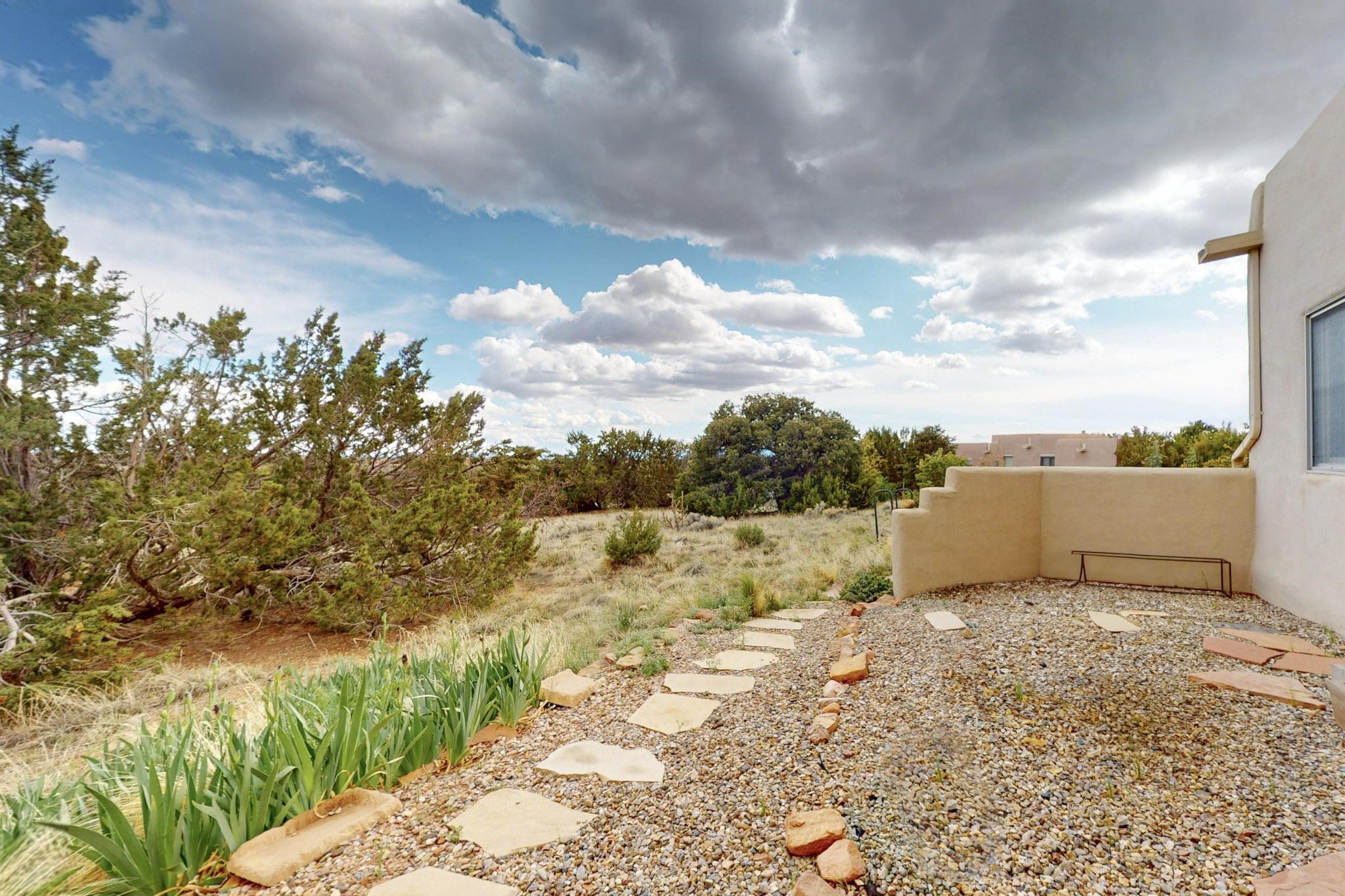 Charming custom designed and built home for the owner in 2004 by Casas de Suenos Construction on a premium lot in the Island at Eldorado. This 1510 sq ft is a split 3bedroom, 2 baths with a central open plan living concept ideal for family or guest separation. The kitchen is a good size with plenty of cabinetry and flows to the dining area and great room. A corner kiva fireplace and viga beams add that lovely Santa Fe touch. There is a 4 zone Radiant infloor heating system plus central air conditioning newly installed this year for all year round comfort. A new roof was installed also this year with a 10 year warranty. Colby double hung windows, operable skylights, annual maintenance on the natural gas boiler and hot water heater replaced in 2012. The garage is a full 2 car but has just one garage door opener installed currently. This home sits back privately from the road and enjoys south and west views from the back through the trees plus a wonderful vista of the north hills from the walled front garden. Within easy reach of Eldorado amenities, it is close to 2 local shopping centers, schools, library, senior center, playgrounds and trails, and only minutes into Santa Fe.