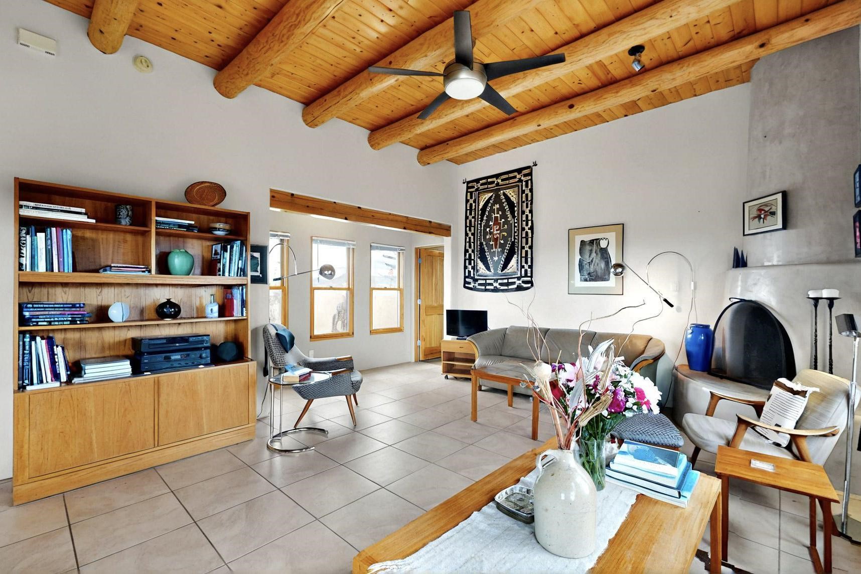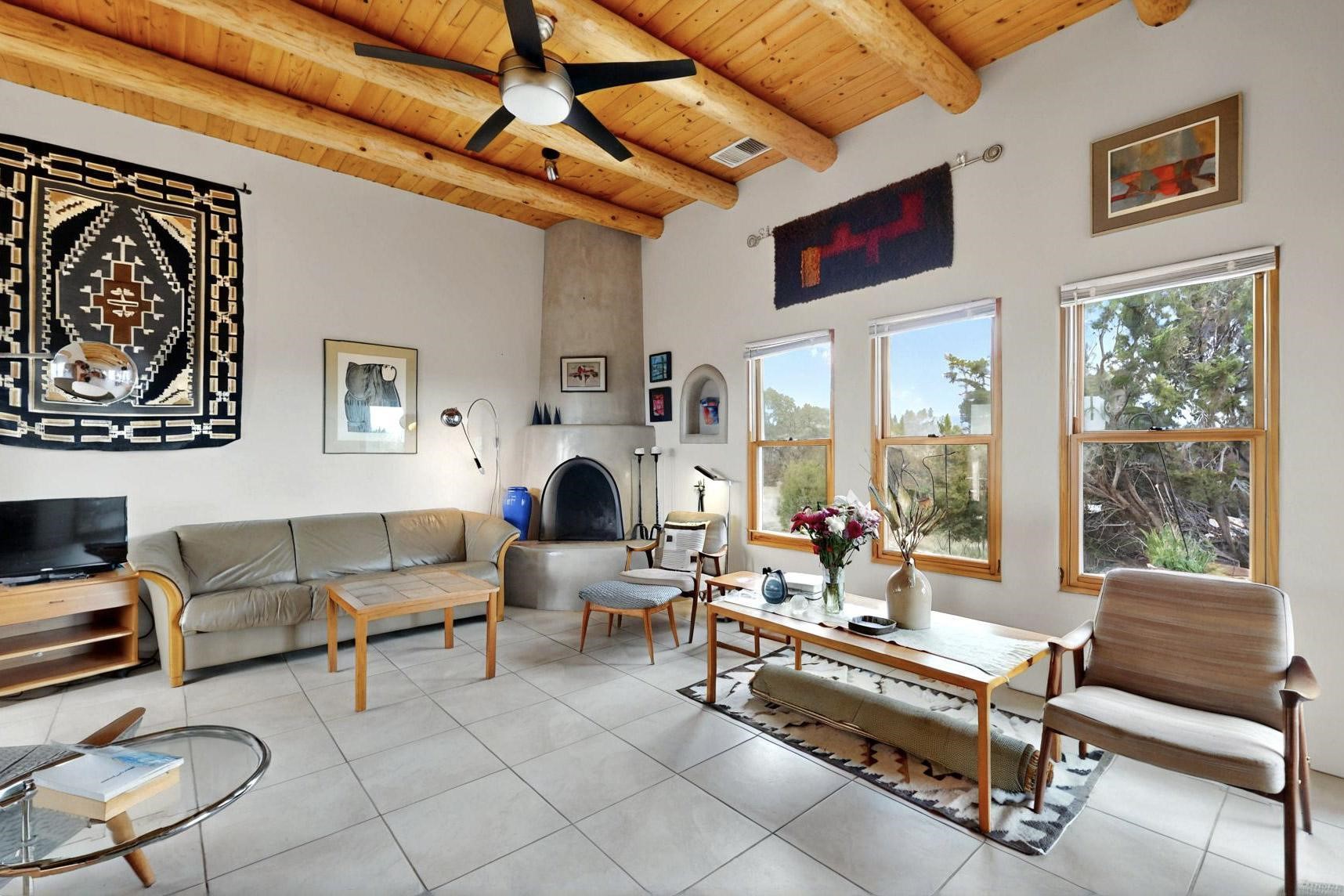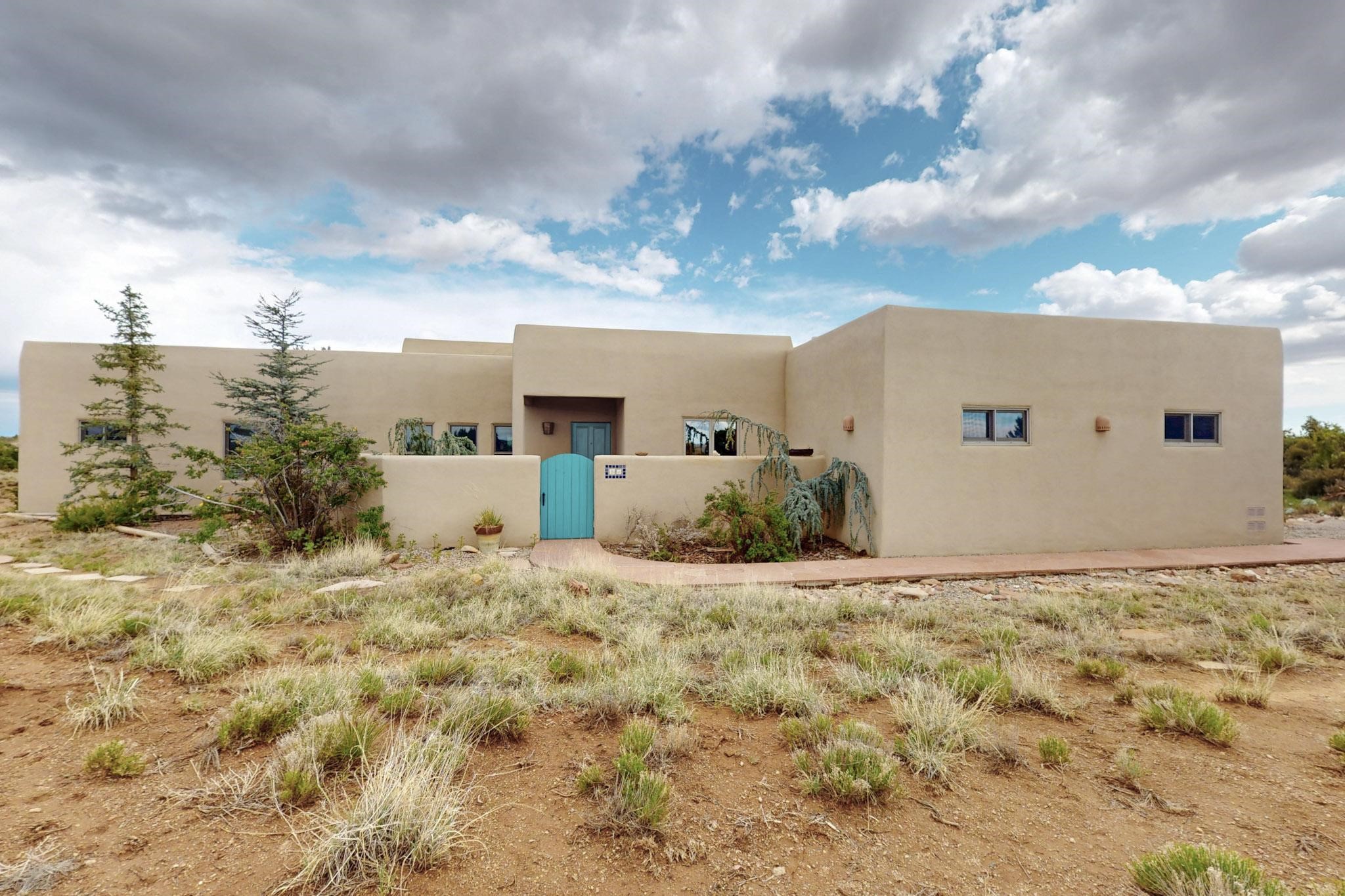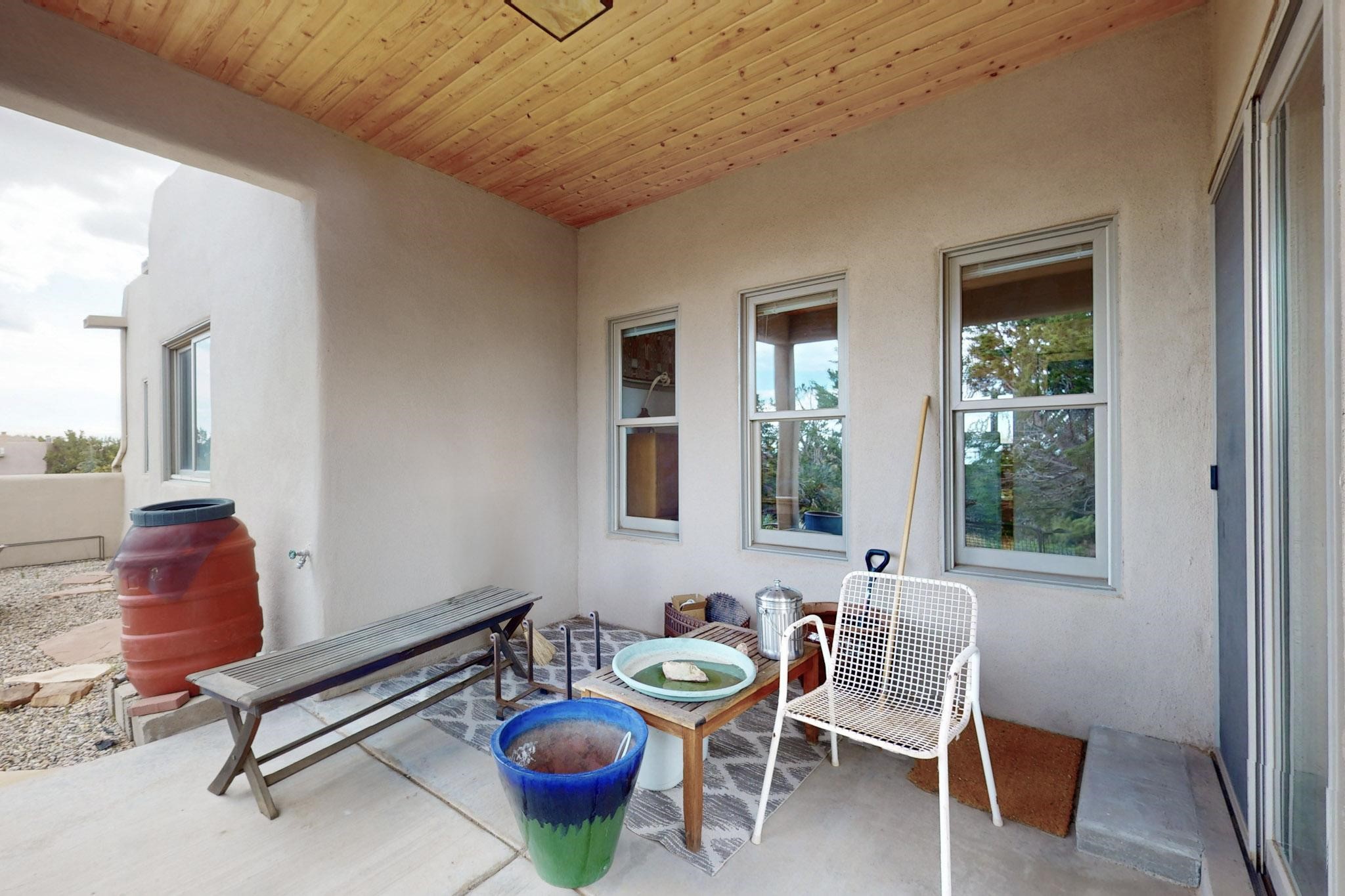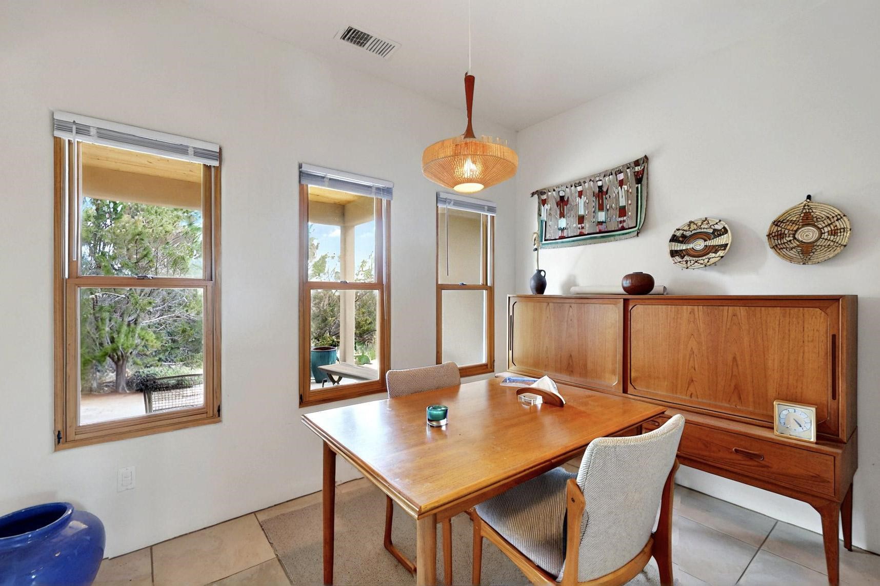 Charming custom designed and built home for the owner in 2004 by Casas de Suenos Construction on a premium lot in the Island at Eldorado. This 1510 sq ft is a split 3bedroom, 2 baths with a central open plan living concept ideal for family or guest separation. The kitchen is a good size with plenty of cabinetry and flows to the dining area and great room. A corner kiva fireplace and viga beams add that lovely Santa Fe touch. There is a 4 zone Radiant infloor heating system plus central air conditioning newly installed this year for all year round comfort. A new roof was installed also this year with a 10 year warranty. Colby double hung windows, operable skylights, annual maintenance on the natural gas boiler and hot water heater replaced in 2012. The garage is a full 2 car but has just one garage door opener installed currently. This home sits back privately from the road and enjoys south and west views from the back through the trees plus a wonderful vista of the north hills from the walled front garden. Within easy reach of Eldorado amenities, it is close to 2 local shopping centers, schools, library, senior center, playgrounds and trails, and only minutes into Santa Fe.