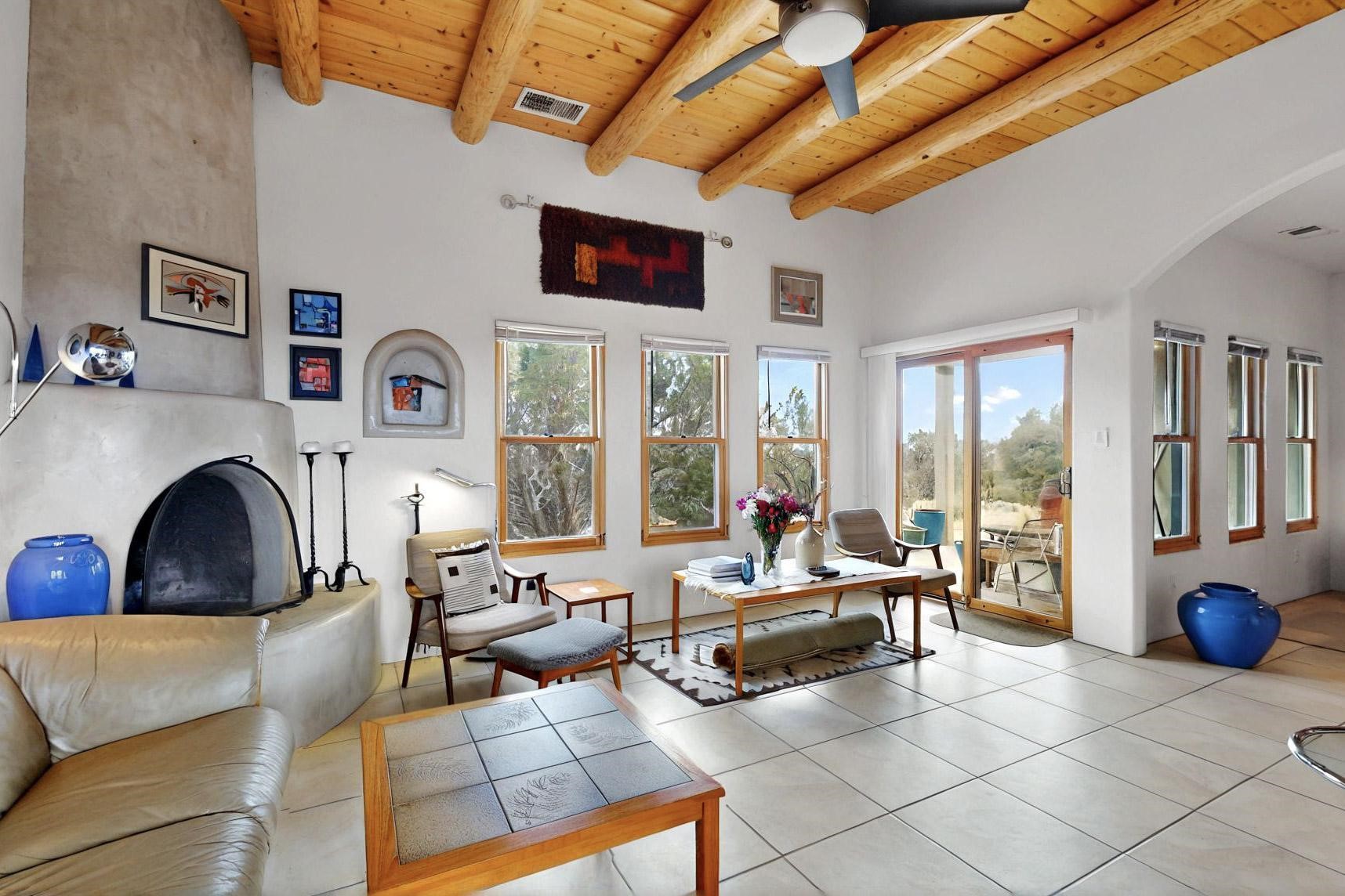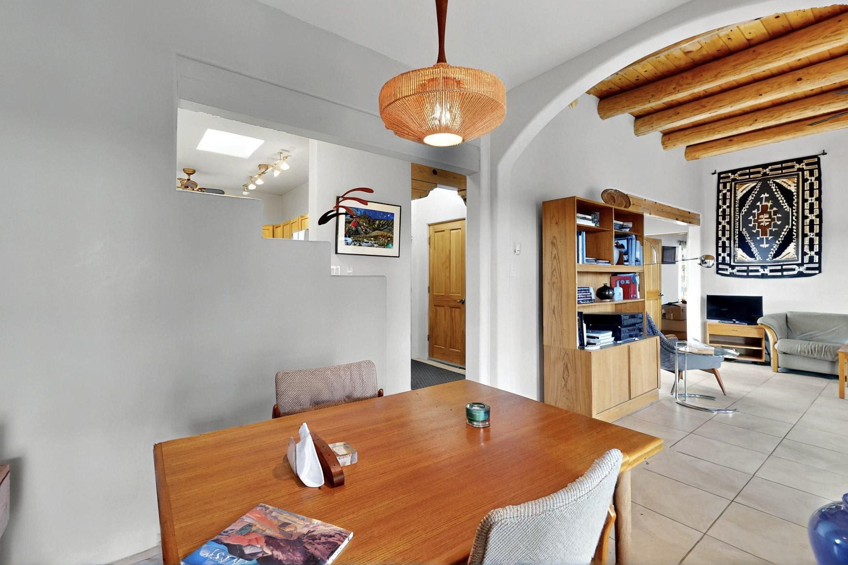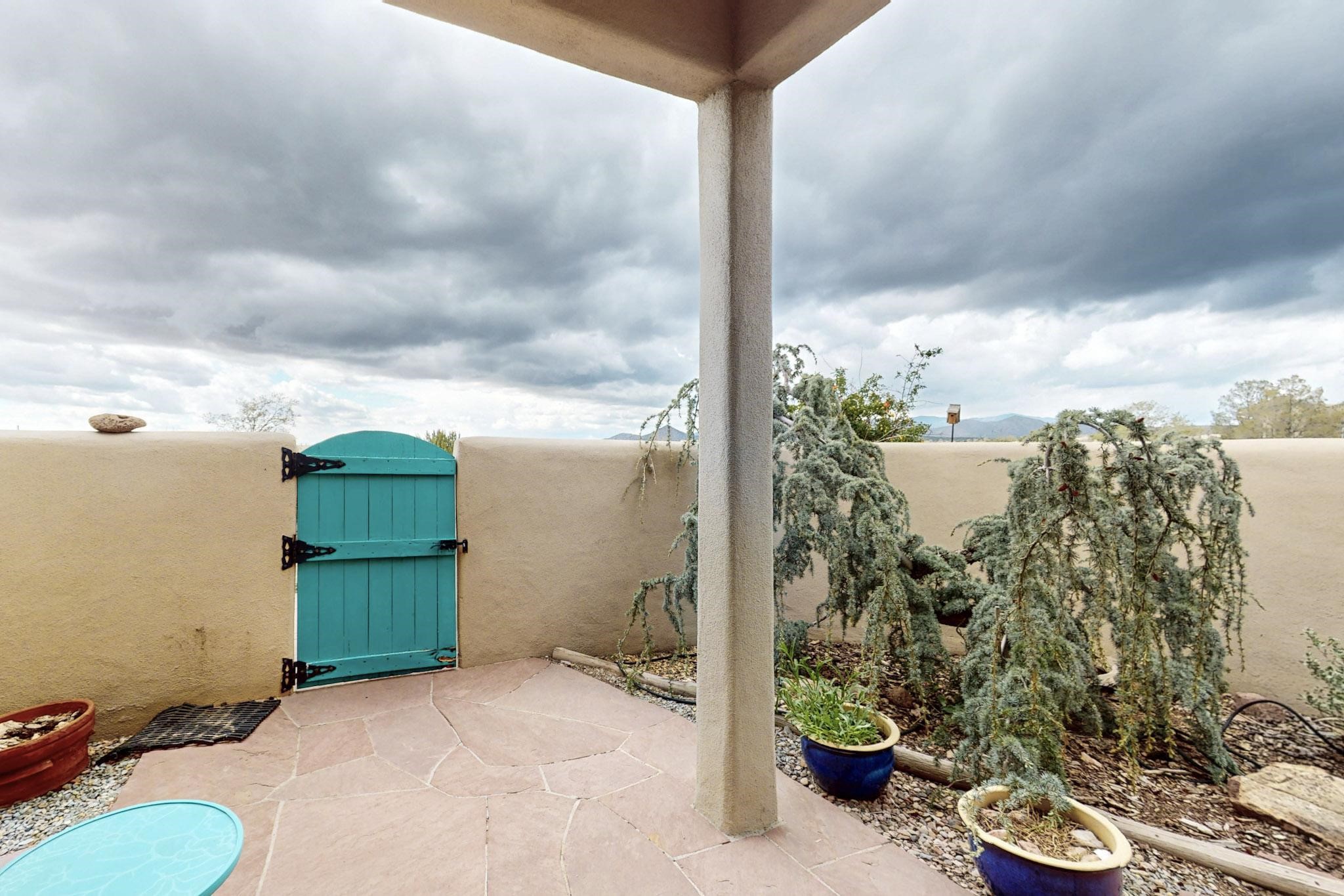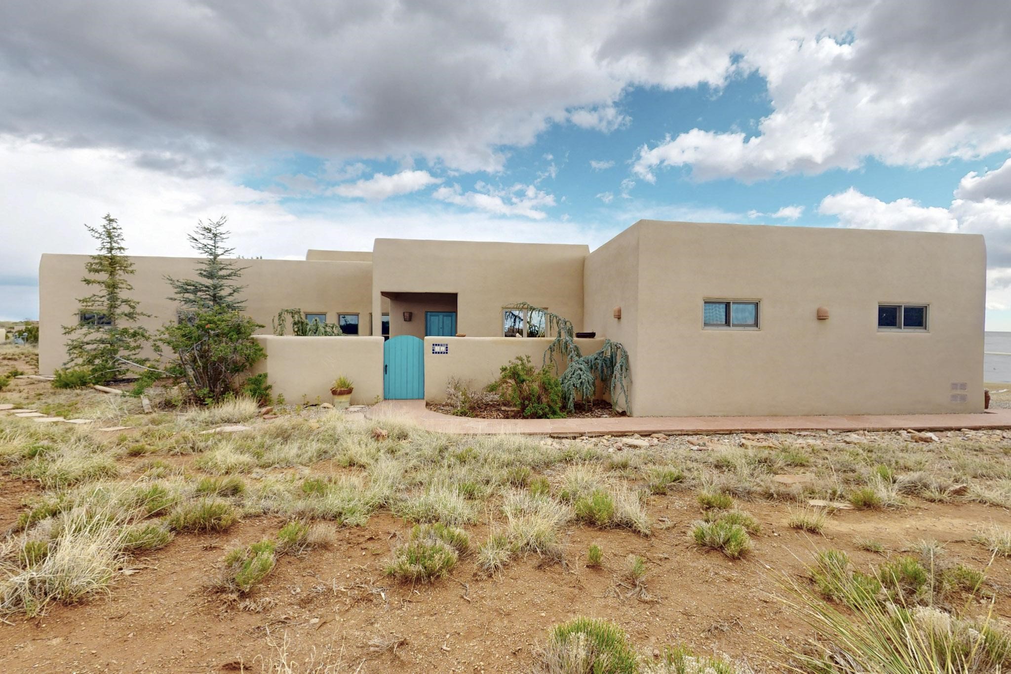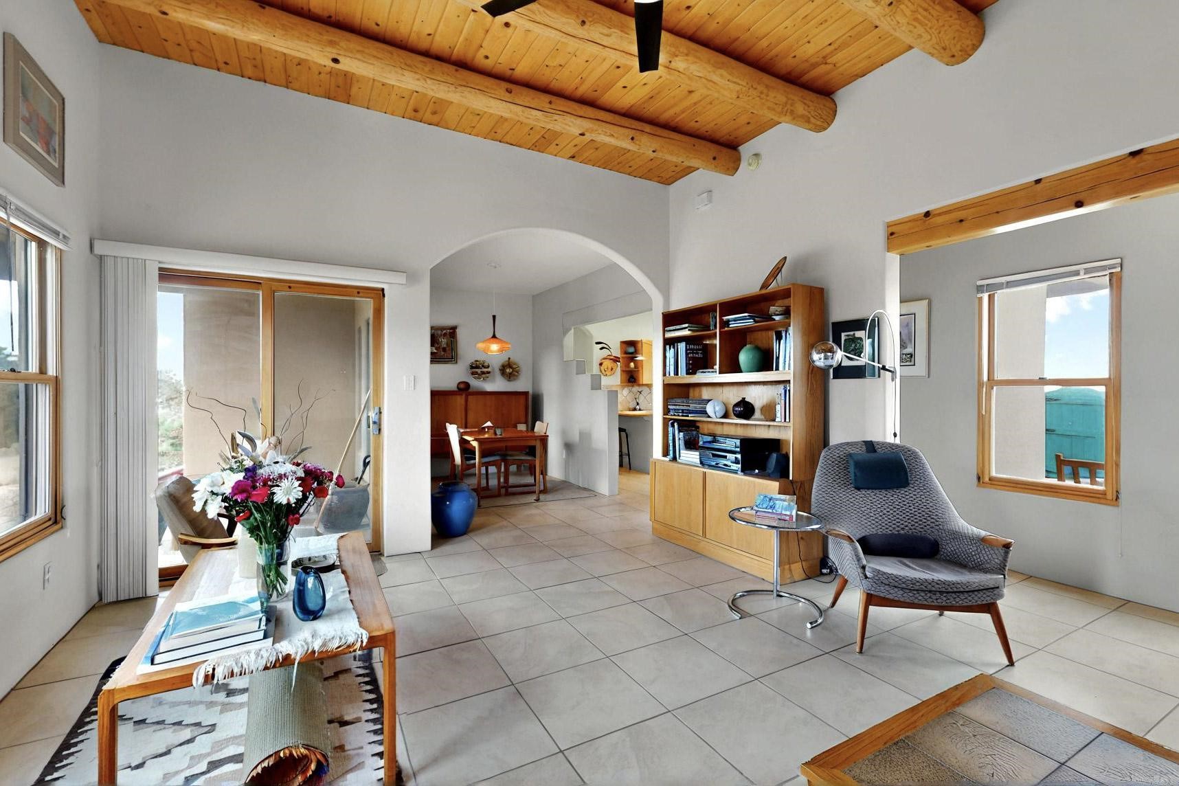 Charming custom designed and built home for the owner in 2004 by Casas de Suenos Construction on a premium lot in the Island at Eldorado. This 1510 sq ft is a split 3bedroom, 2 baths with a central open plan living concept ideal for family or guest separation. The kitchen is a good size with plenty of cabinetry and flows to the dining area and great room. A corner kiva fireplace and viga beams add that lovely Santa Fe touch. There is a 4 zone Radiant infloor heating system plus central air conditioning newly installed this year for all year round comfort. A new roof was installed also this year with a 10 year warranty. Colby double hung windows, operable skylights, annual maintenance on the natural gas boiler and hot water heater replaced in 2012. The garage is a full 2 car but has just one garage door opener installed currently. This home sits back privately from the road and enjoys south and west views from the back through the trees plus a wonderful vista of the north hills from the walled front garden. Within easy reach of Eldorado amenities, it is close to 2 local shopping centers, schools, library, senior center, playgrounds and trails, and only minutes into Santa Fe.