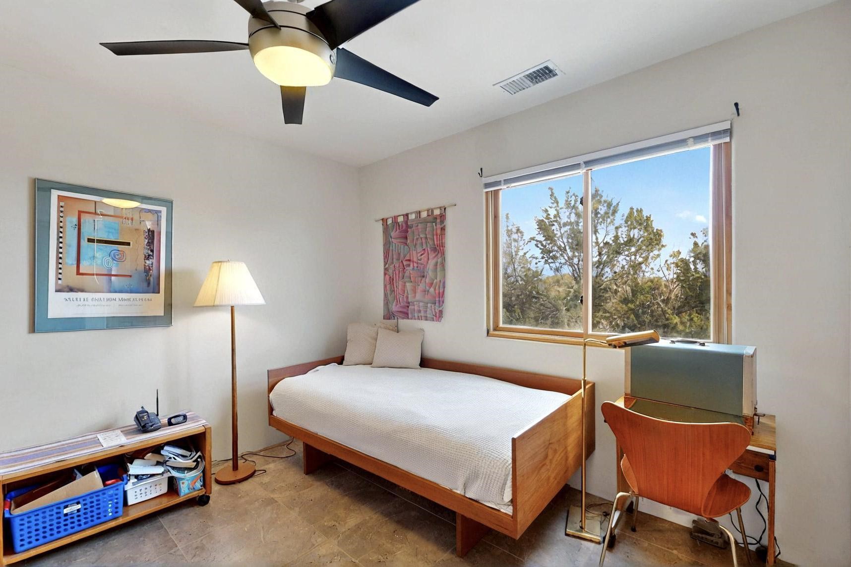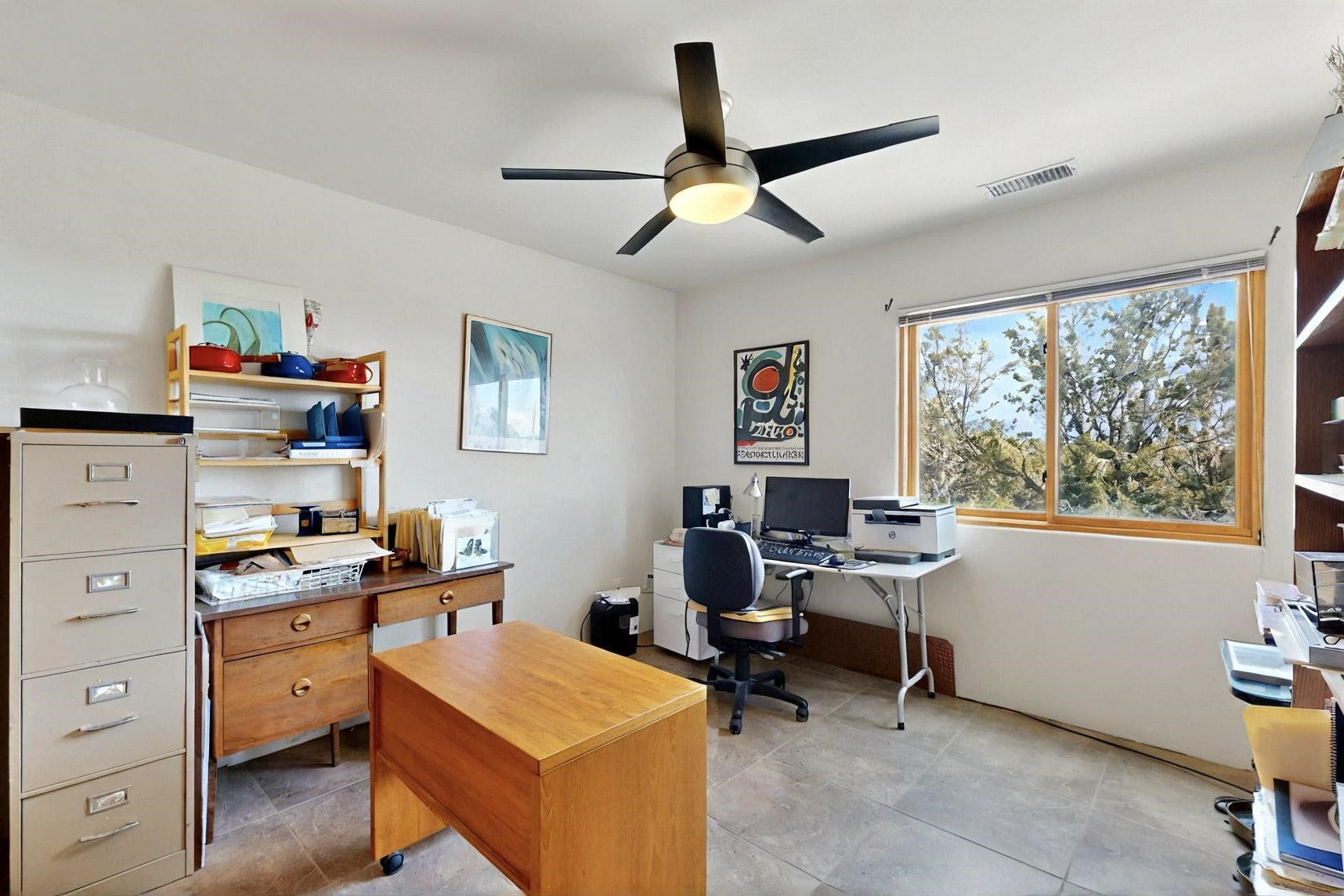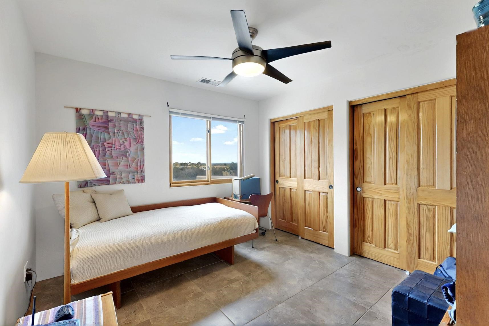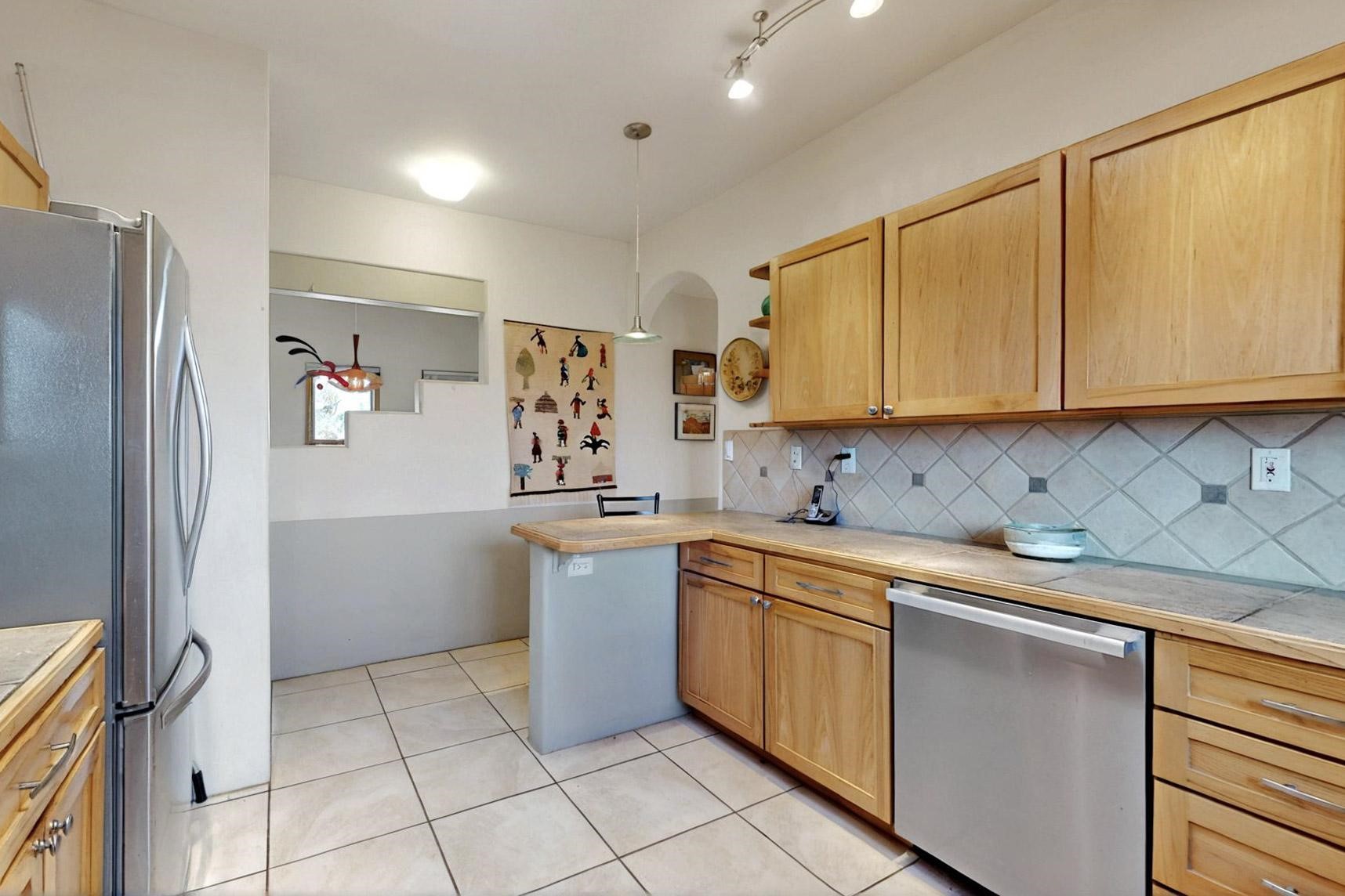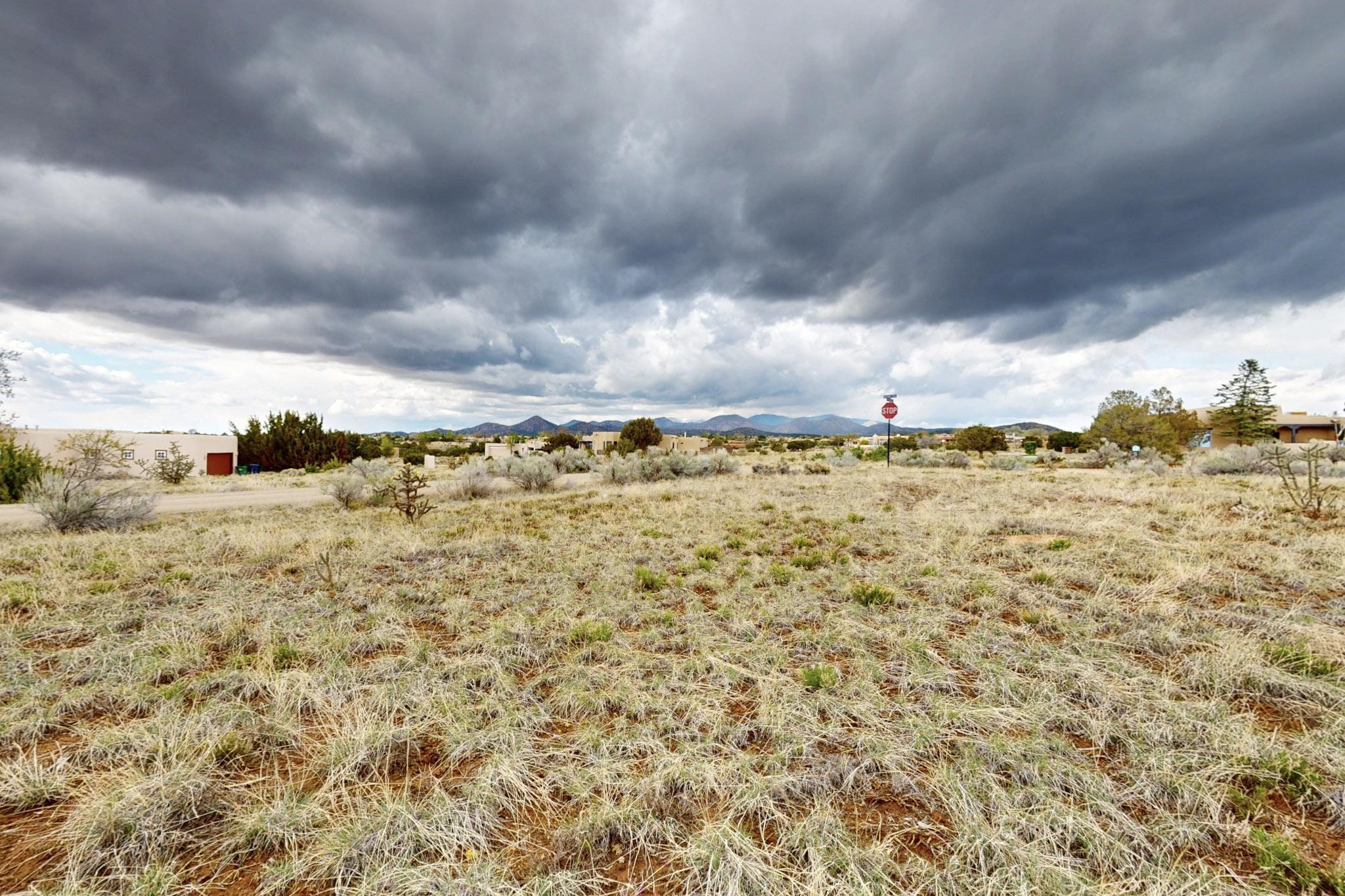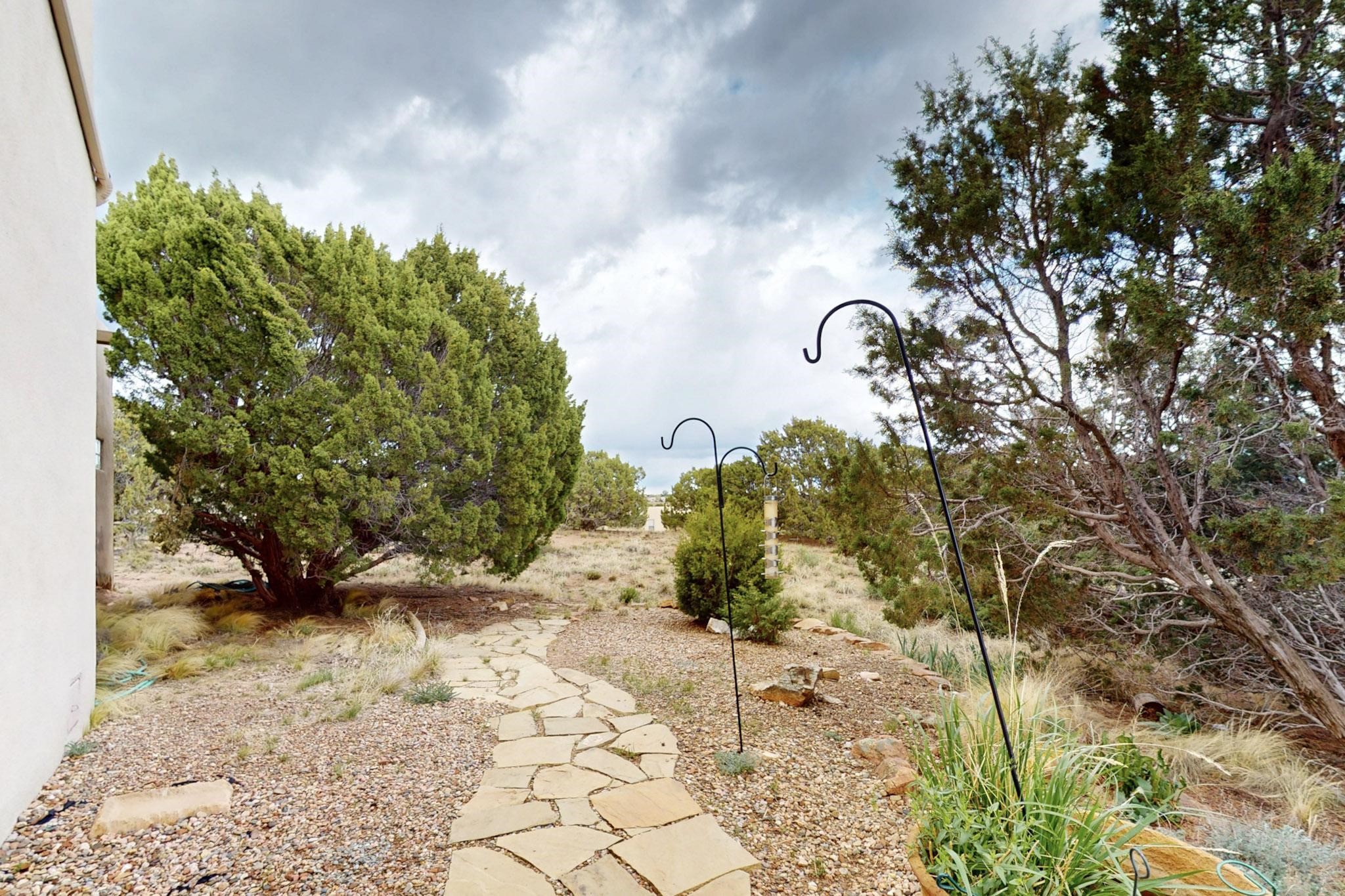 Charming custom designed and built home for the owner in 2004 by Casas de Suenos Construction on a premium lot in the Island at Eldorado. This 1510 sq ft is a split 3bedroom, 2 baths with a central open plan living concept ideal for family or guest separation. The kitchen is a good size with plenty of cabinetry and flows to the dining area and great room. A corner kiva fireplace and viga beams add that lovely Santa Fe touch. There is a 4 zone Radiant infloor heating system plus central air conditioning newly installed this year for all year round comfort. A new roof was installed also this year with a 10 year warranty. Colby double hung windows, operable skylights, annual maintenance on the natural gas boiler and hot water heater replaced in 2012. The garage is a full 2 car but has just one garage door opener installed currently. This home sits back privately from the road and enjoys south and west views from the back through the trees plus a wonderful vista of the north hills from the walled front garden. Within easy reach of Eldorado amenities, it is close to 2 local shopping centers, schools, library, senior center, playgrounds and trails, and only minutes into Santa Fe.