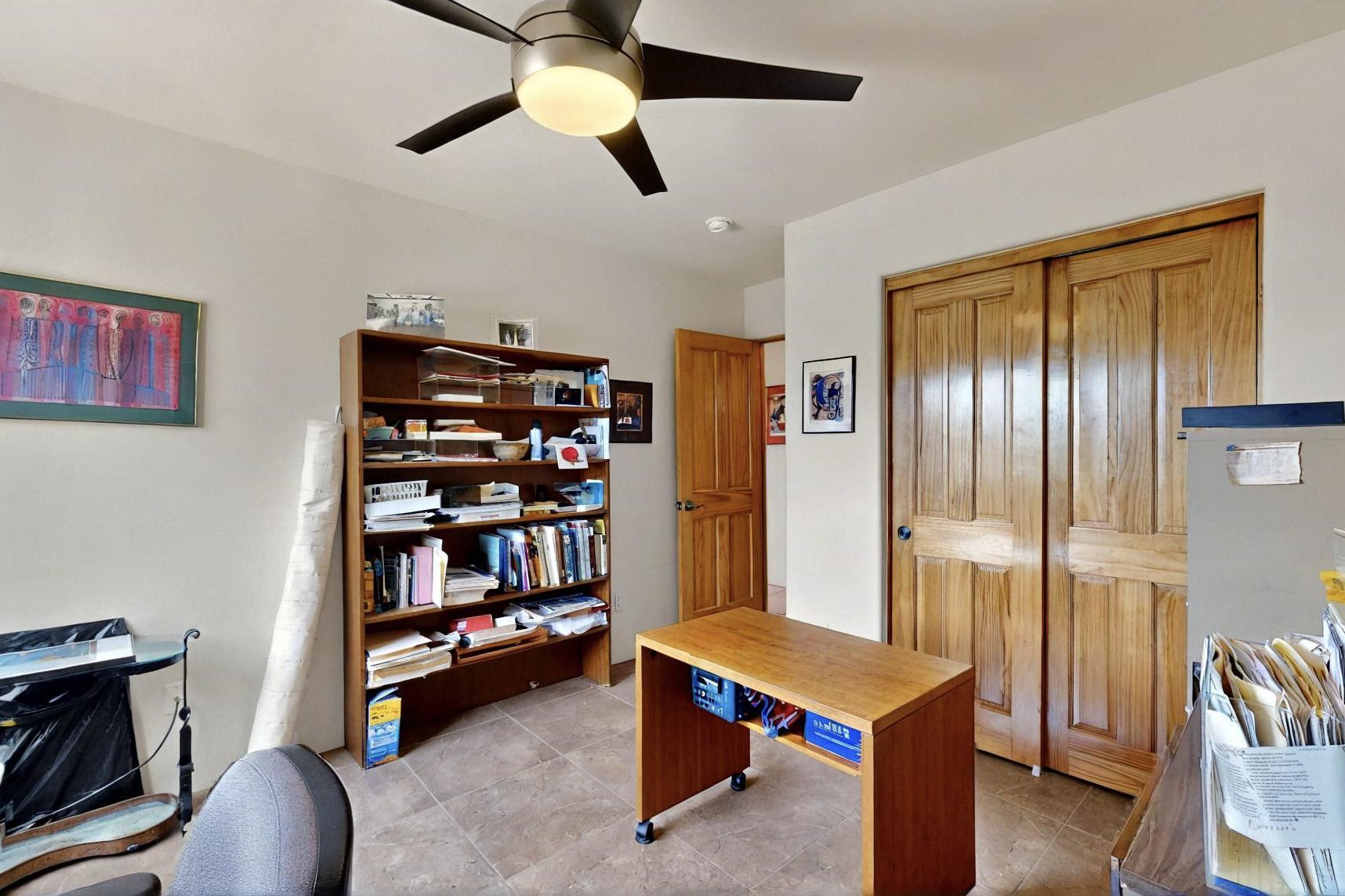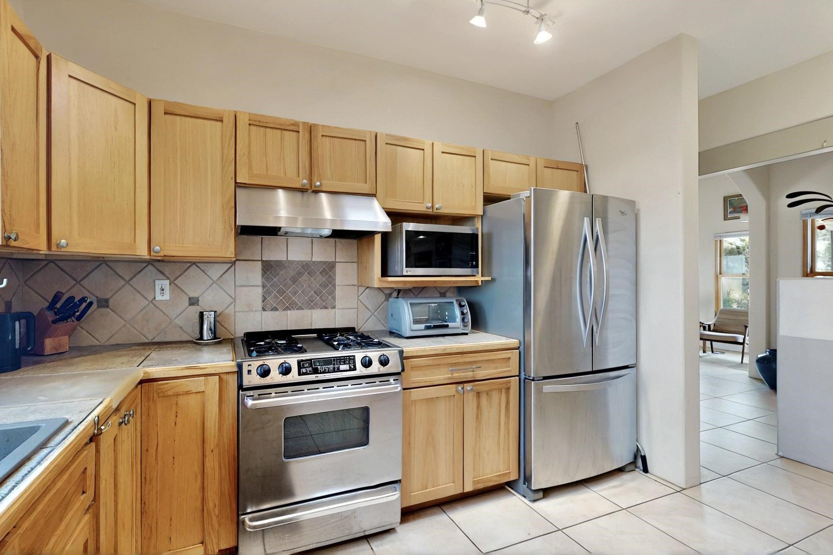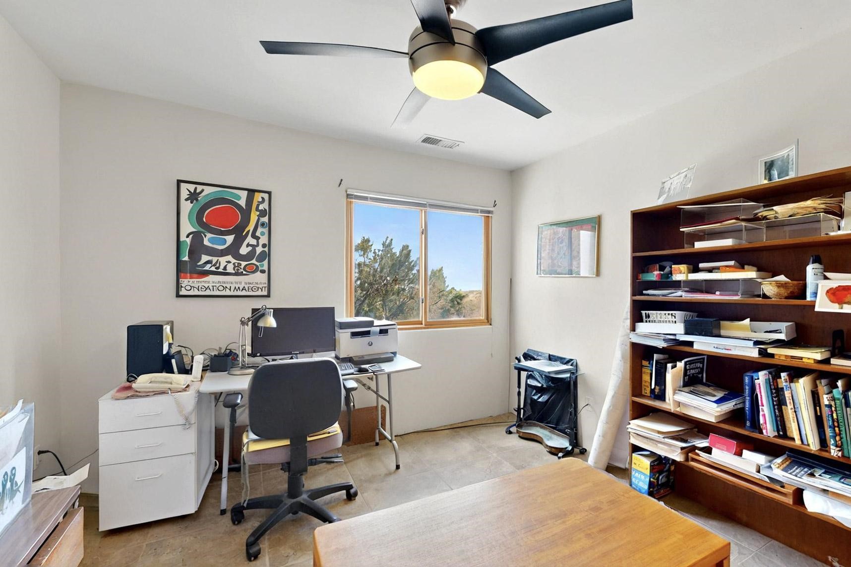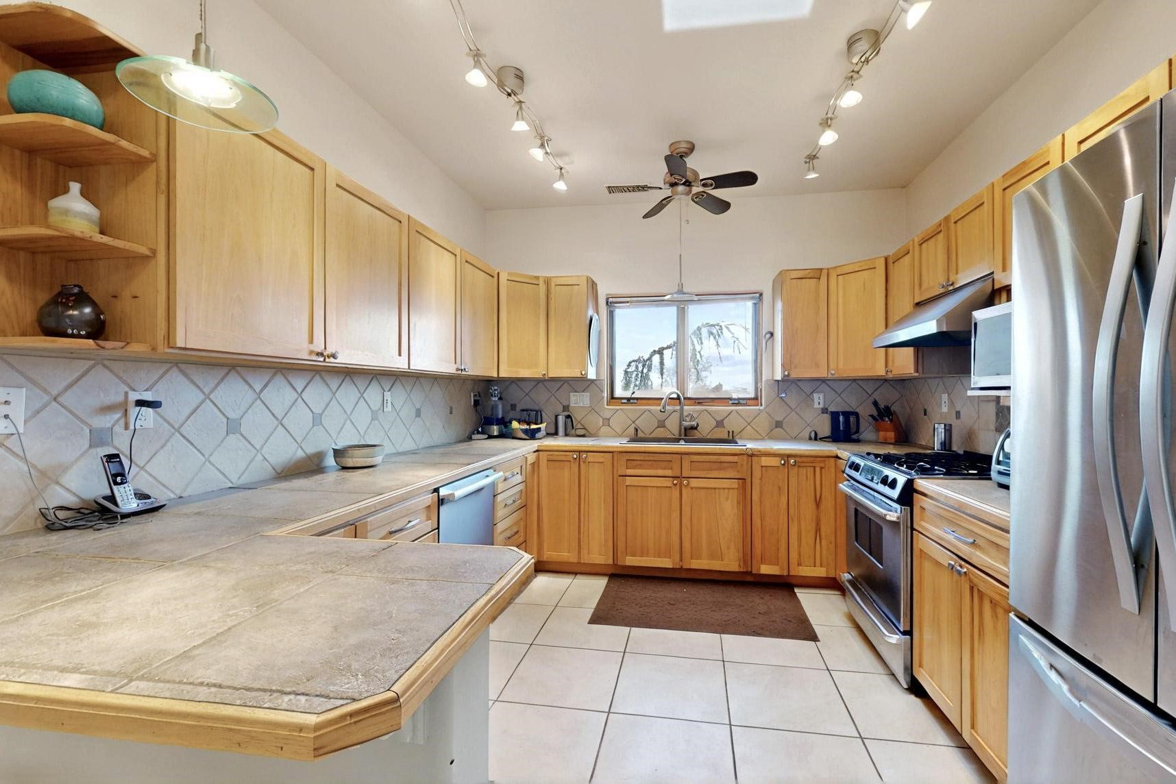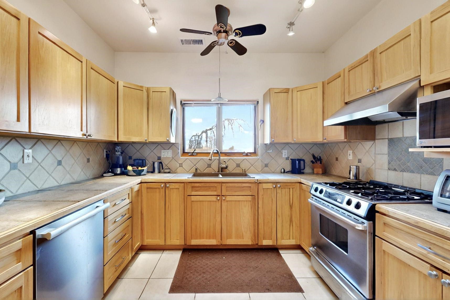 Charming custom designed and built home for the owner in 2004 by Casas de Suenos Construction on a premium lot in the Island at Eldorado. This 1510 sq ft is a split 3bedroom, 2 baths with a central open plan living concept ideal for family or guest separation. The kitchen is a good size with plenty of cabinetry and flows to the dining area and great room. A corner kiva fireplace and viga beams add that lovely Santa Fe touch. There is a 4 zone Radiant infloor heating system plus central air conditioning newly installed this year for all year round comfort. A new roof was installed also this year with a 10 year warranty. Colby double hung windows, operable skylights, annual maintenance on the natural gas boiler and hot water heater replaced in 2012. The garage is a full 2 car but has just one garage door opener installed currently. This home sits back privately from the road and enjoys south and west views from the back through the trees plus a wonderful vista of the north hills from the walled front garden. Within easy reach of Eldorado amenities, it is close to 2 local shopping centers, schools, library, senior center, playgrounds and trails, and only minutes into Santa Fe.