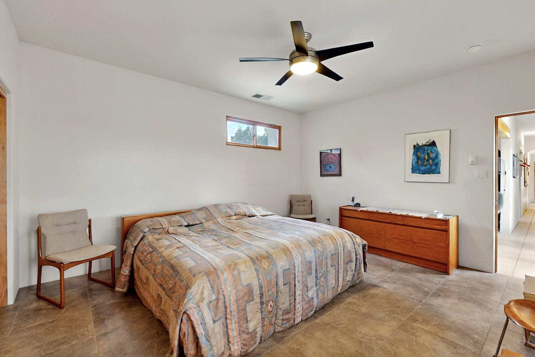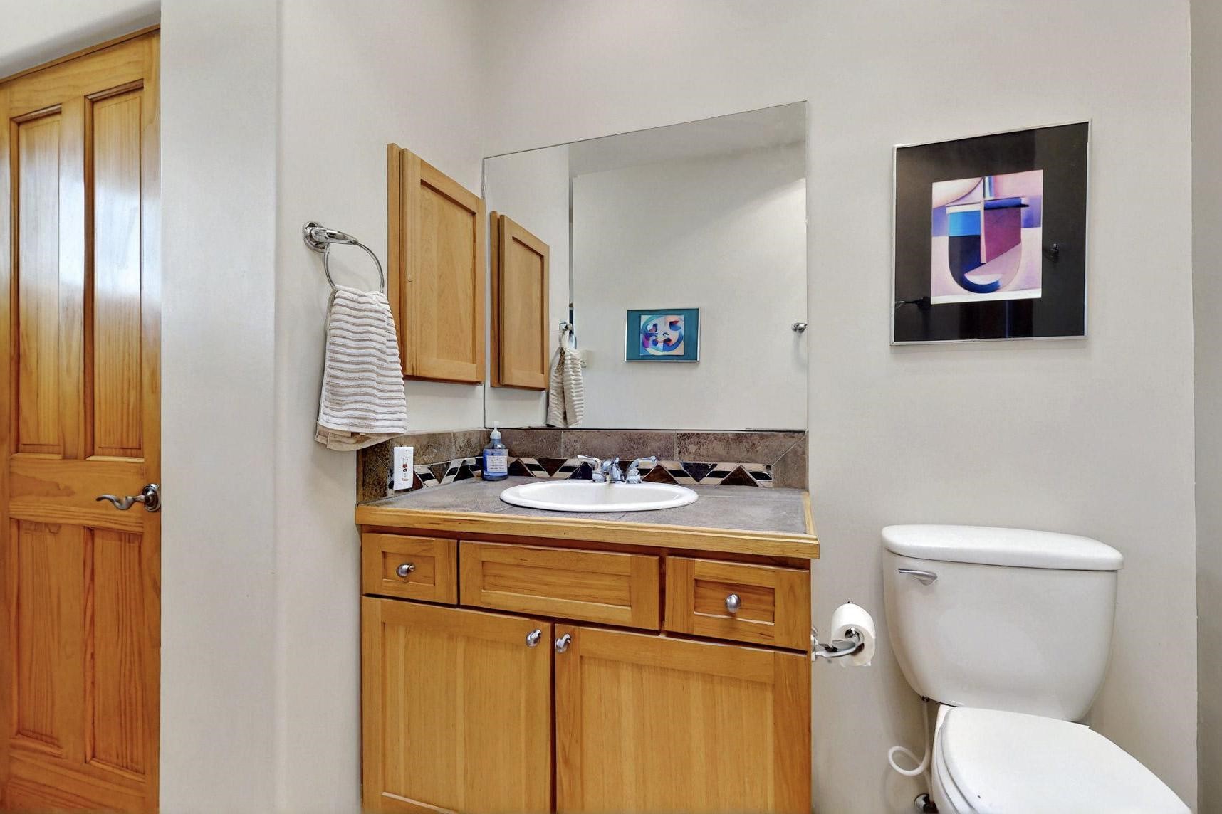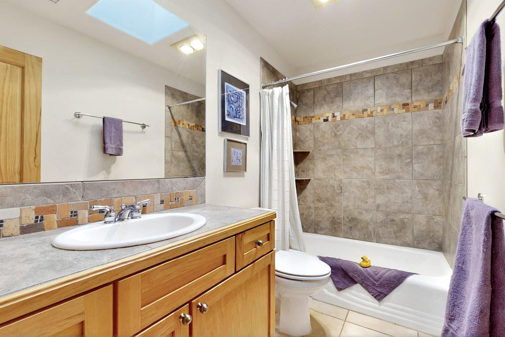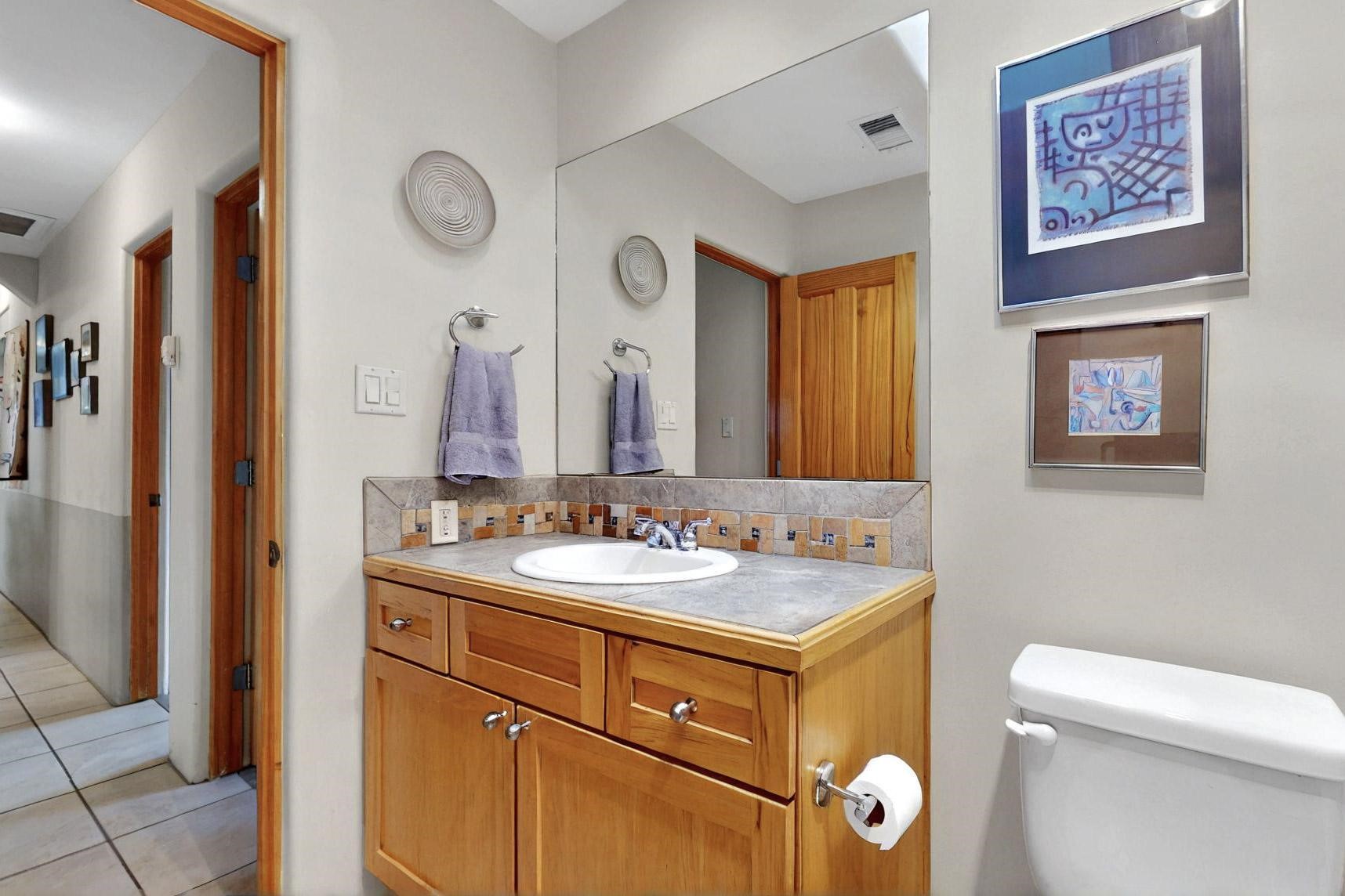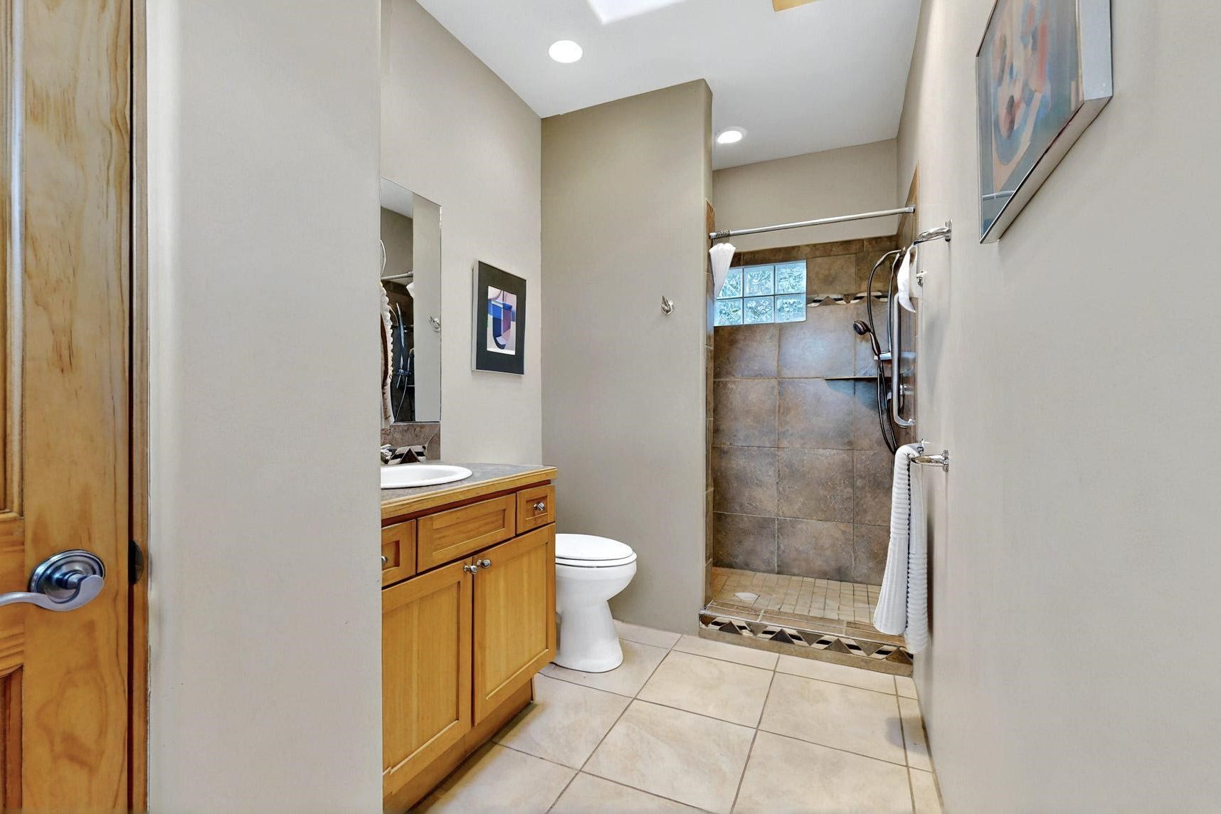 Charming custom designed and built home for the owner in 2004 by Casas de Suenos Construction on a premium lot in the Island at Eldorado. This 1510 sq ft is a split 3bedroom, 2 baths with a central open plan living concept ideal for family or guest separation. The kitchen is a good size with plenty of cabinetry and flows to the dining area and great room. A corner kiva fireplace and viga beams add that lovely Santa Fe touch. There is a 4 zone Radiant infloor heating system plus central air conditioning newly installed this year for all year round comfort. A new roof was installed also this year with a 10 year warranty. Colby double hung windows, operable skylights, annual maintenance on the natural gas boiler and hot water heater replaced in 2012. The garage is a full 2 car but has just one garage door opener installed currently. This home sits back privately from the road and enjoys south and west views from the back through the trees plus a wonderful vista of the north hills from the walled front garden. Within easy reach of Eldorado amenities, it is close to 2 local shopping centers, schools, library, senior center, playgrounds and trails, and only minutes into Santa Fe.