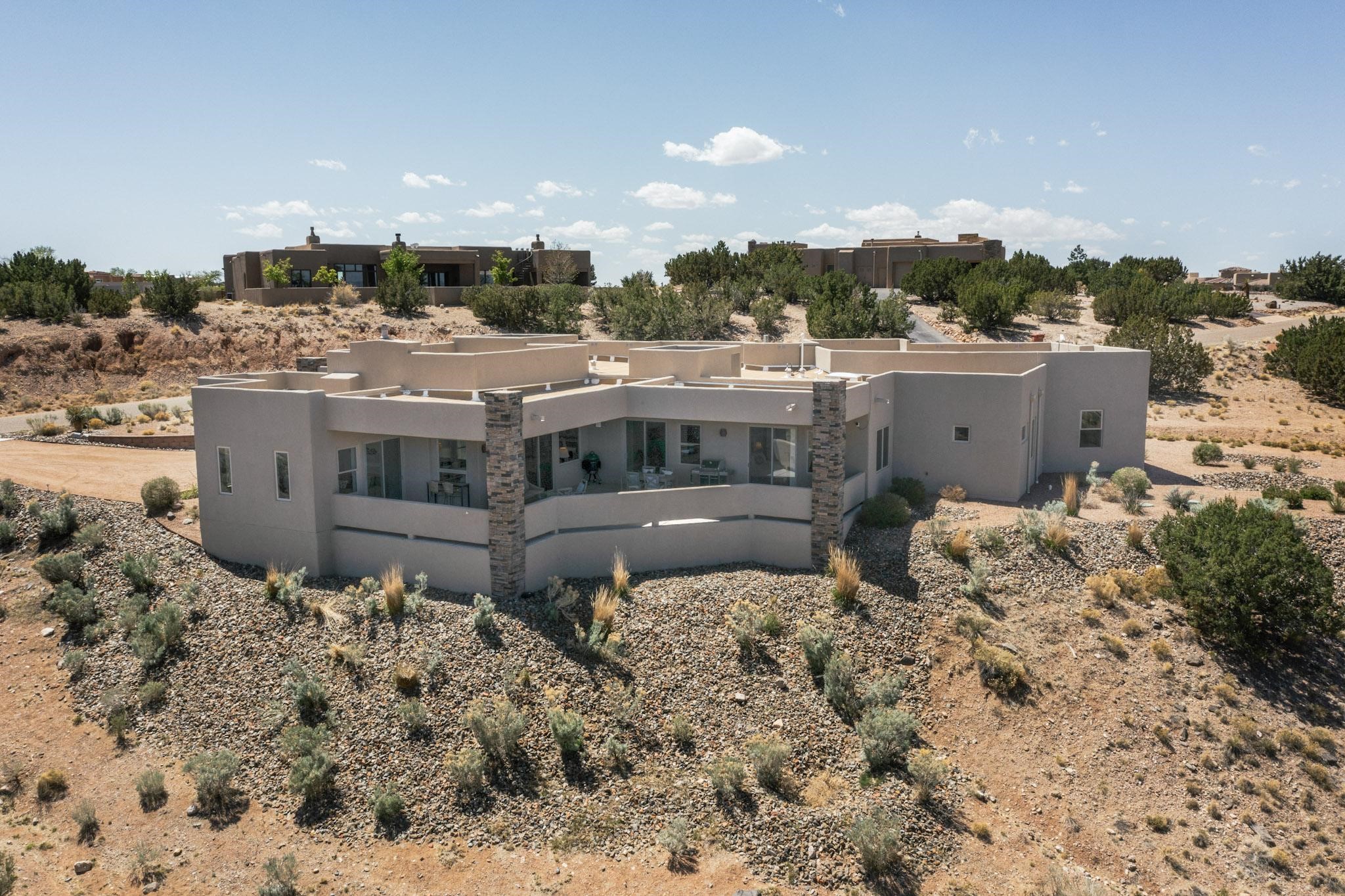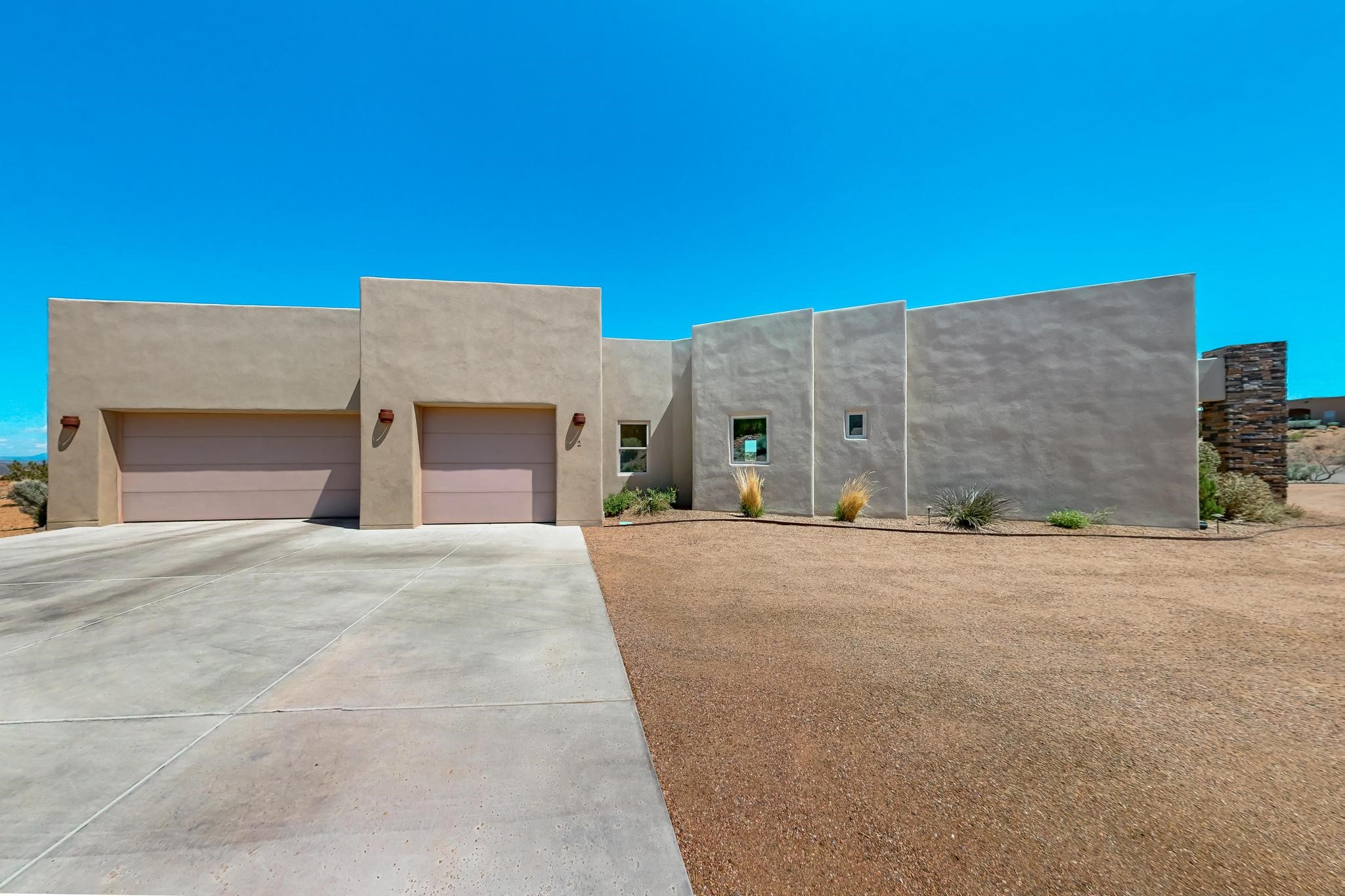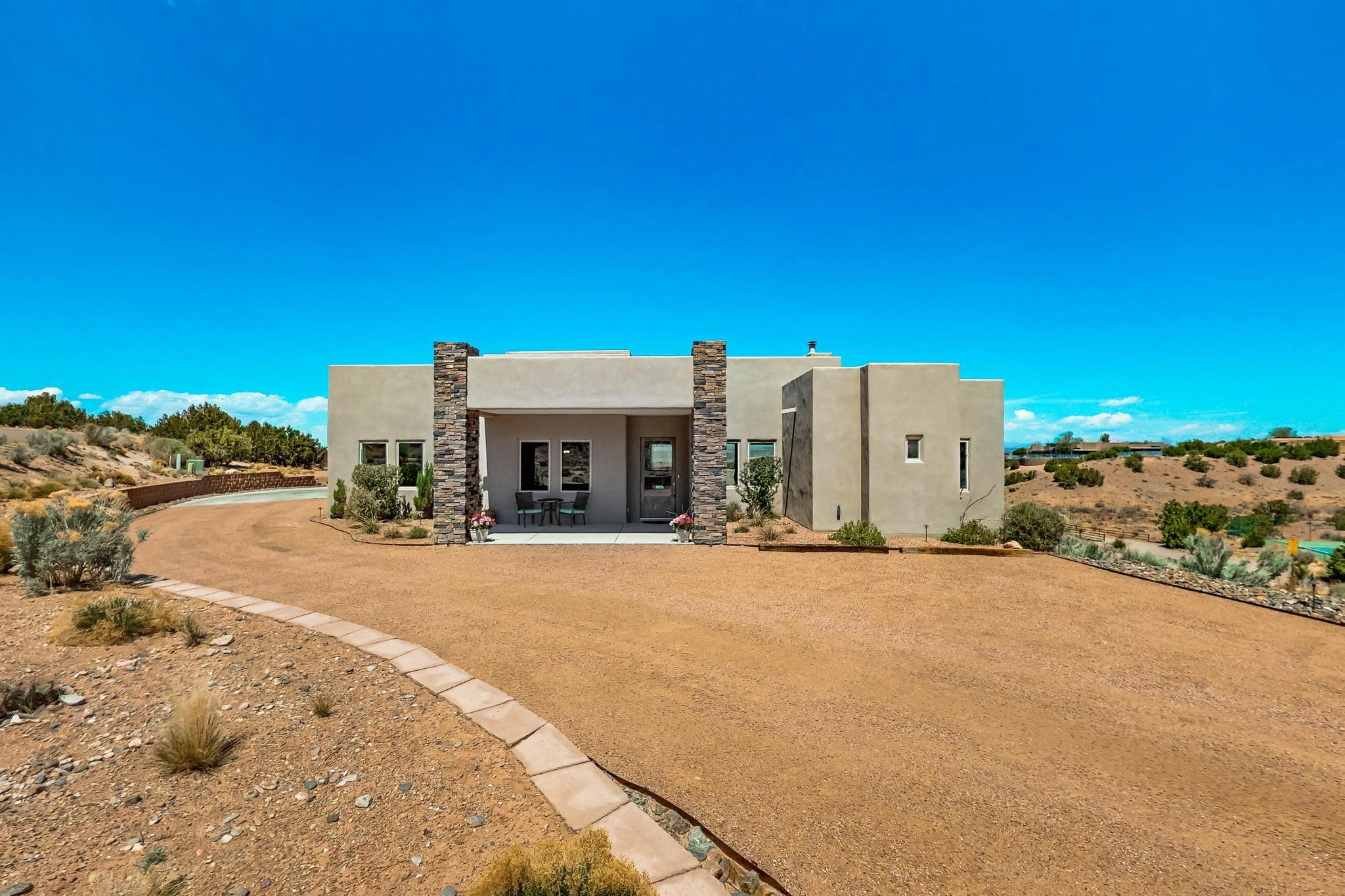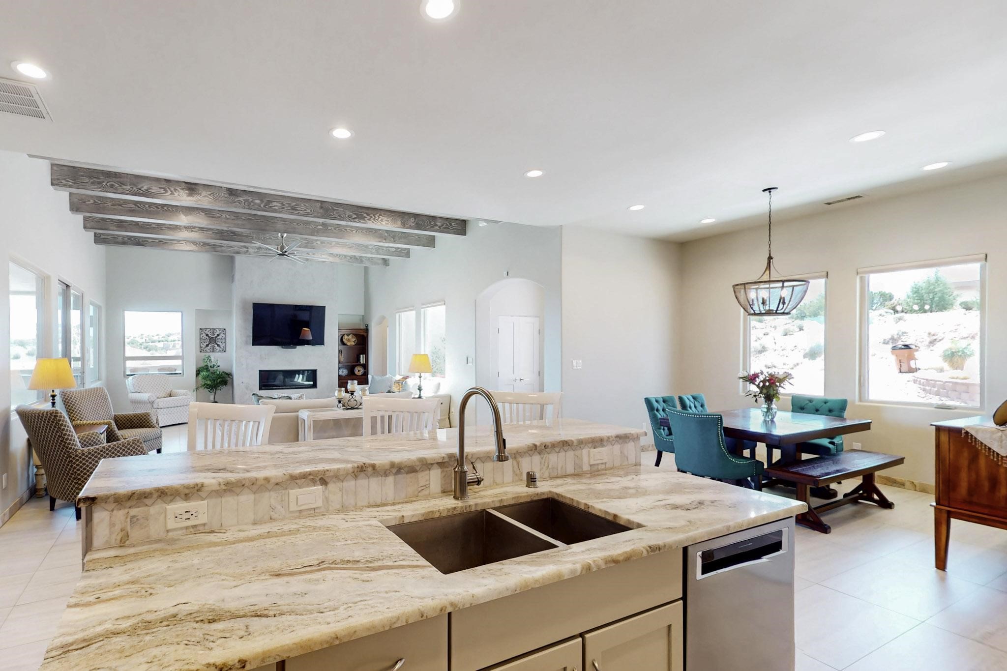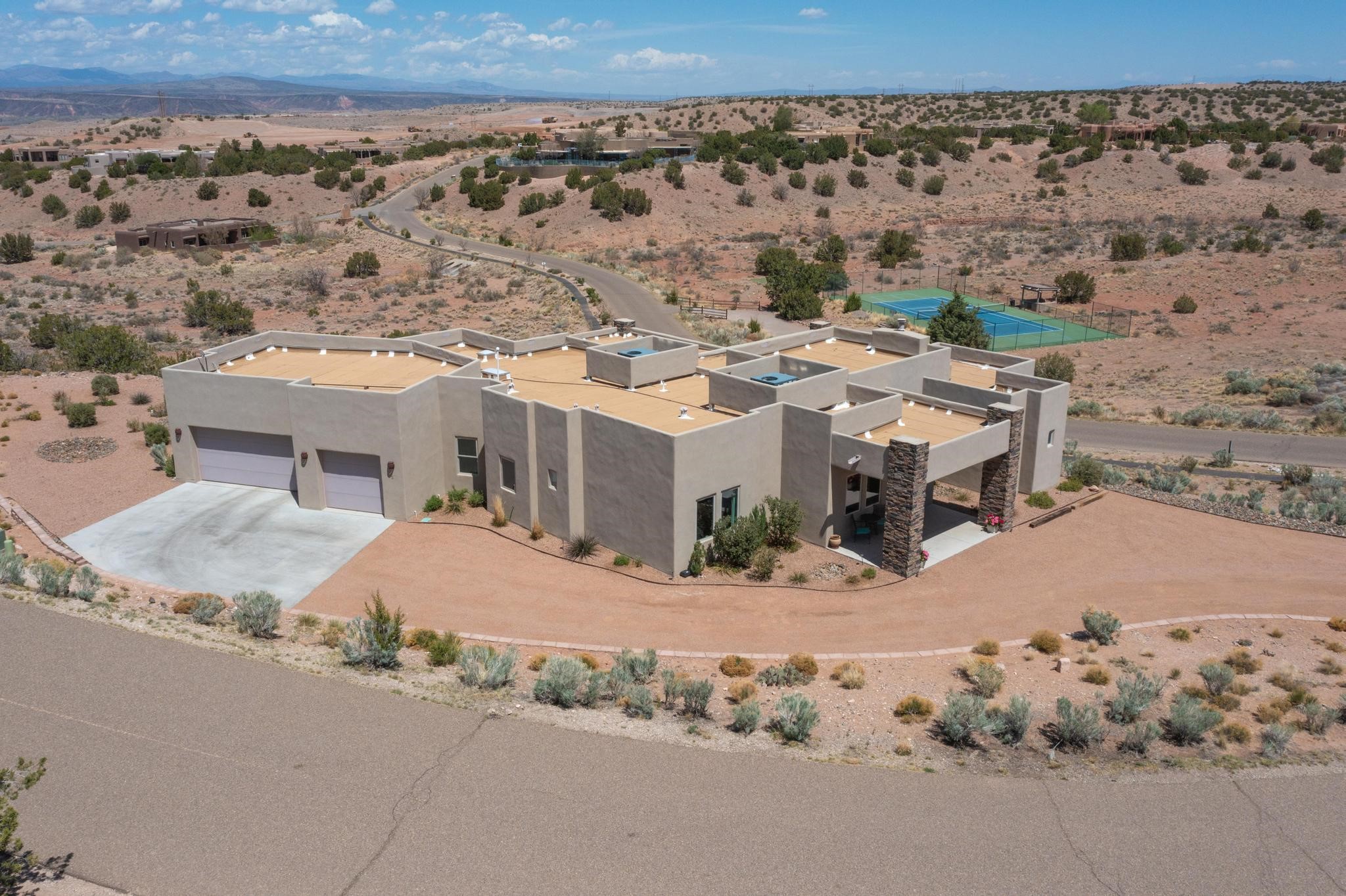 Experience the perfect balance of elegance, comfort, and functionality in this custom built 2022 Parade of Homes award winning home. Ideally situated on a 1.71-acre cul-de-sac lot in the prestigious Anasazi Trails subdivision, this thoughtfully designed single-level 2,850 sq ft residence is a rare find. Featuring 3 bedrooms, 3 bathrooms, and 2 spacious living areas, the home's open, split-bedroom floorplan offers both privacy and versatility. The luxurious primary suite and ensuite guest room are thoughtfully placed and perfect for multigenerational living or hosting out-of-town guests. Soak in the beauty of New Mexico's natural landscape from every angle. Strategically placed large windows provide lots of natural light and frame breathtaking views of the Sandia Mountains, Jemez Mesas, and the Rio Grande Valley. The family room highlights include beam ceilings and a sleek linear direct-vent fireplace, while the formal dining and living areas offer the perfect backdrop for gathering and entertaining. At the heart of the home, the gourmet kitchen is a chef's dream with granite countertops and stylish tile backsplash, stainless steel appliances including a 5-burner gas stove with double ovens and a beverage cooler, walk-in pantry, breakfast bar, and ample cabinetry for storage and organization. The primary suite is a private retreat, complete with backyard patio access, beam ceilings and a spa-like bathroom including dual vanities, soaking tub, large shower room with rainfall shower heads, and 2 walk-in closets with built-in shelving. Additional features include an 880 sq ft covered patio with multiple sliders and built-in speakers perfect for outdoor entertaining while enjoying panoramic views, a massive 3-car garage, an oversized laundry room with utility sink, cabinets and countertop space, a tankless hot water heater system, 36" tile and laminate flooring throughout, and a built-in Yamaha MusicCast sound system. Anasazi Trails offers a peaceful lifestyle with community tennis and pickleball courts and walking trails to explore the natural beauty of Placitas. With clean, contemporary lines, high-end finishes, and unparalleled craftsmanship, this home is truly one of a kind. Don't miss the opportunity to make this your Dream Home!