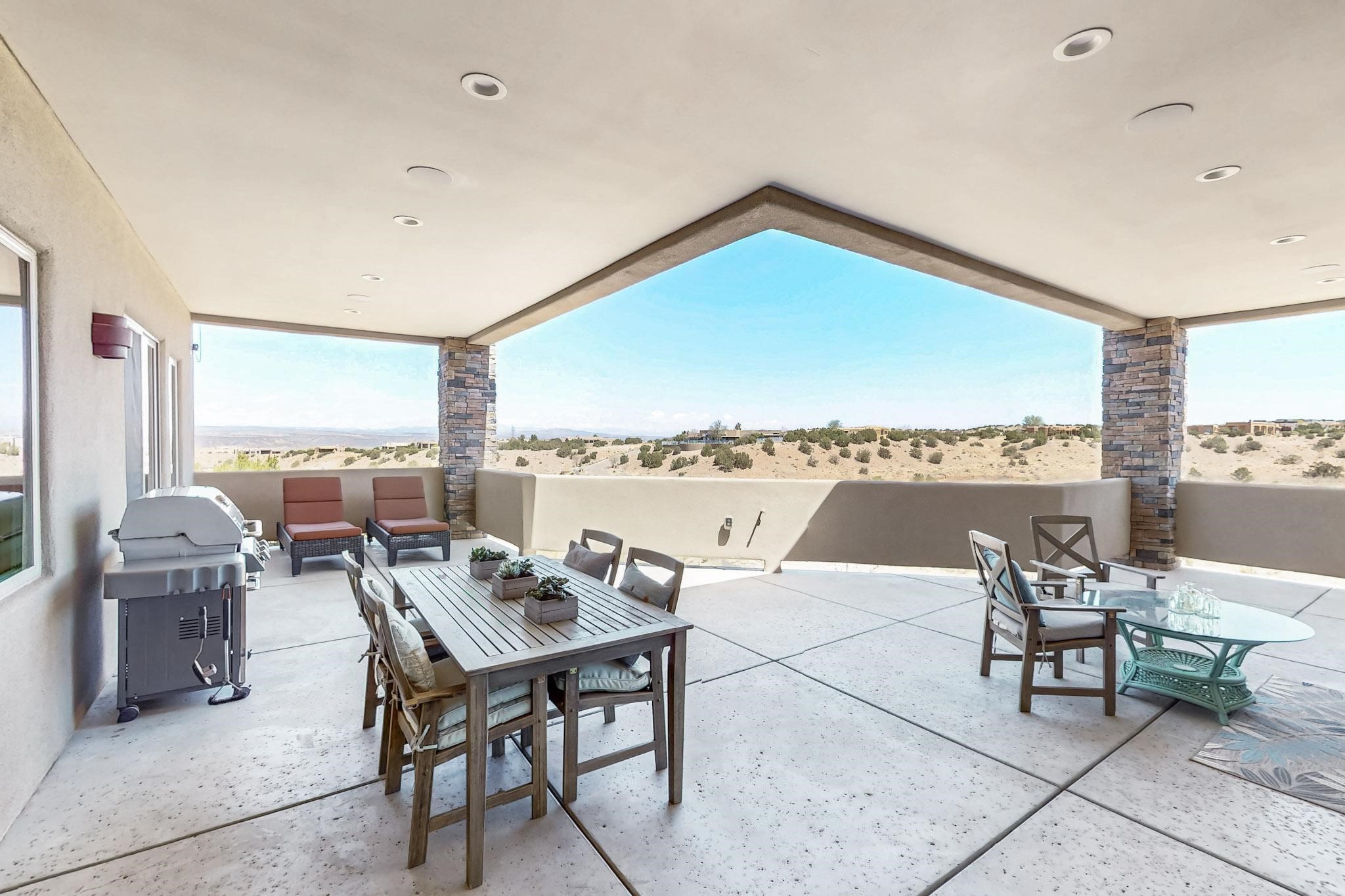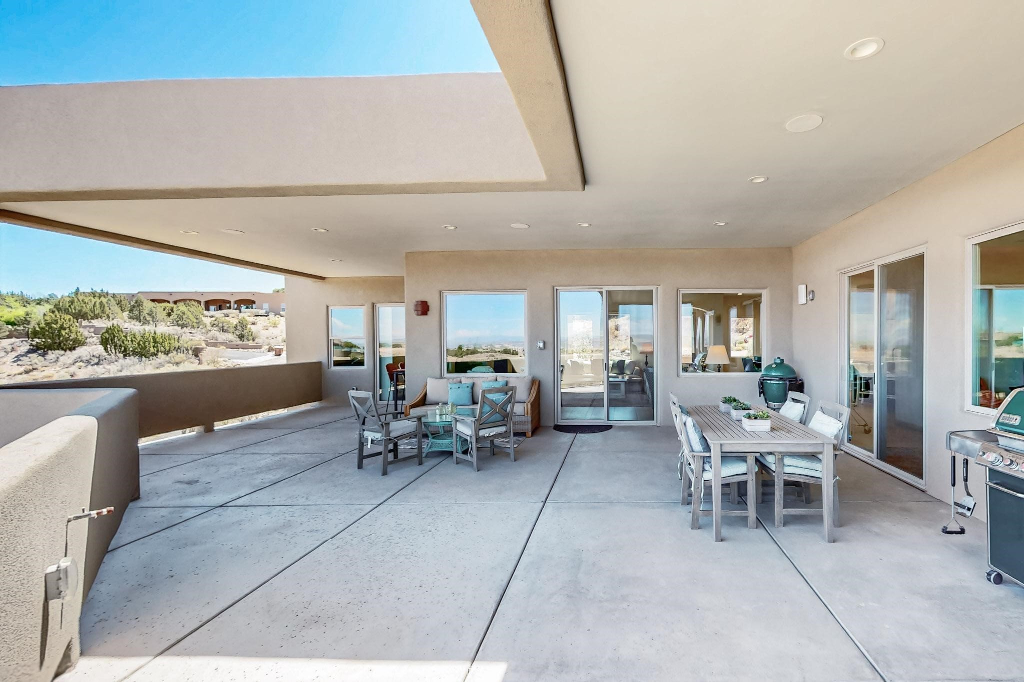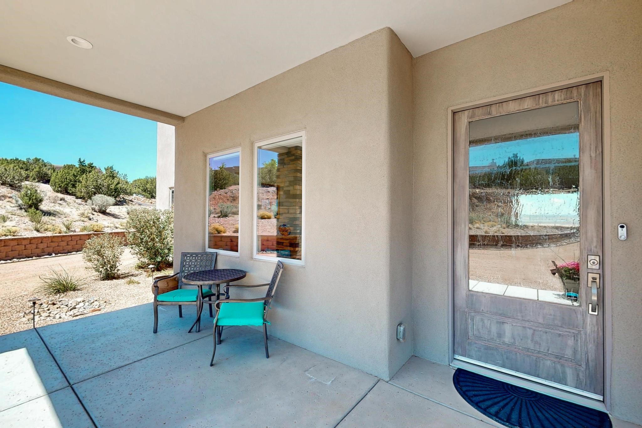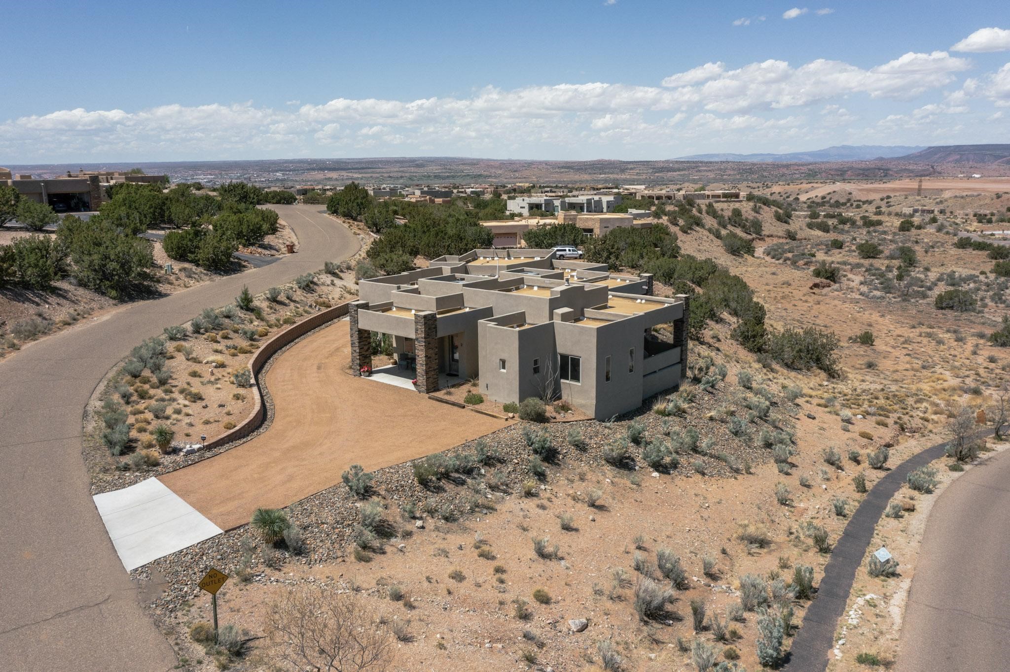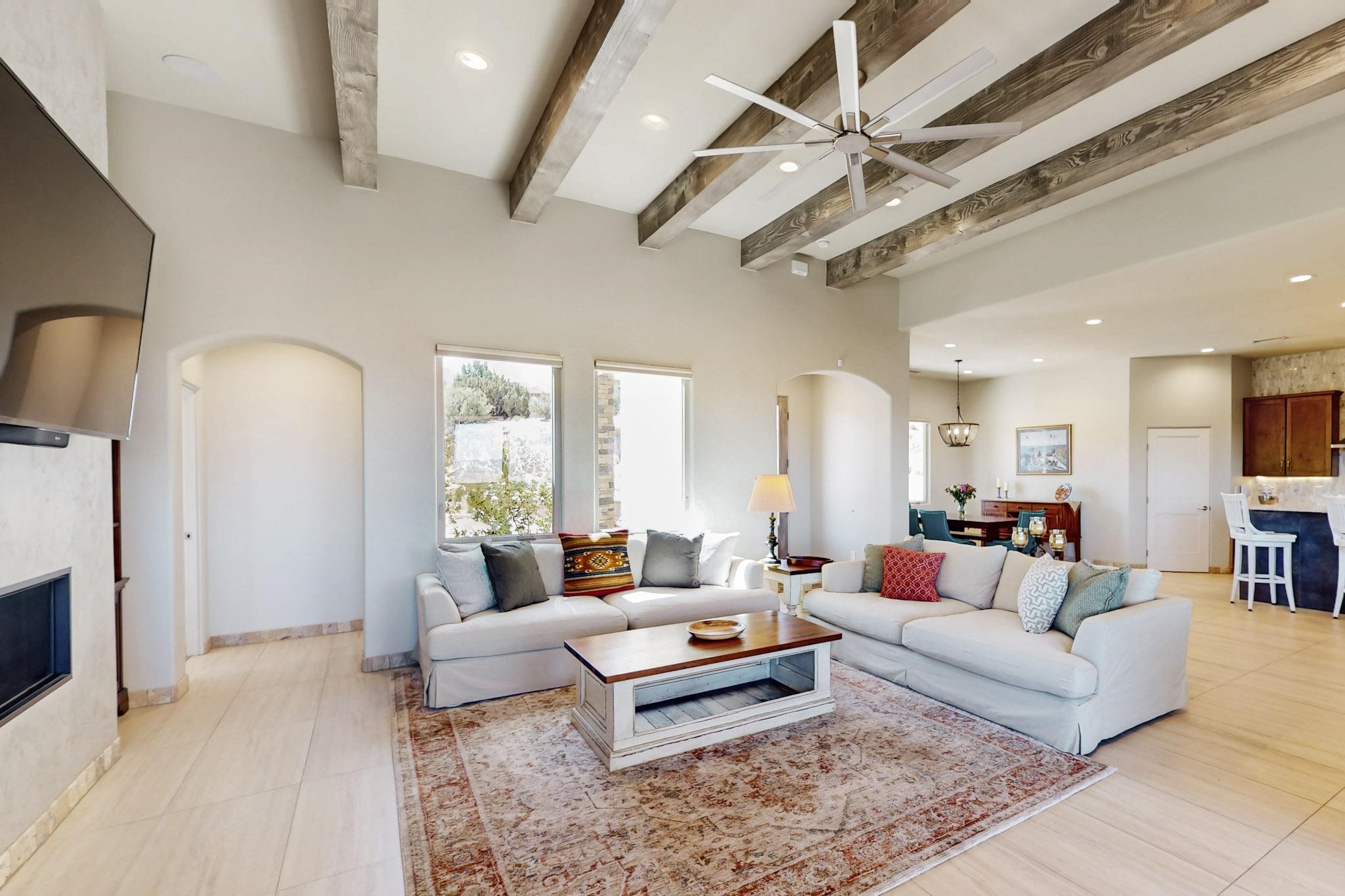 Experience the perfect balance of elegance, comfort, and functionality in this custom built 2022 Parade of Homes award winning home. Ideally situated on a 1.71-acre cul-de-sac lot in the prestigious Anasazi Trails subdivision, this thoughtfully designed single-level 2,850 sq ft residence is a rare find. Featuring 3 bedrooms, 3 bathrooms, and 2 spacious living areas, the home's open, split-bedroom floorplan offers both privacy and versatility. The luxurious primary suite and ensuite guest room are thoughtfully placed and perfect for multigenerational living or hosting out-of-town guests. Soak in the beauty of New Mexico's natural landscape from every angle. Strategically placed large windows provide lots of natural light and frame breathtaking views of the Sandia Mountains, Jemez Mesas, and the Rio Grande Valley. The family room highlights include beam ceilings and a sleek linear direct-vent fireplace, while the formal dining and living areas offer the perfect backdrop for gathering and entertaining. At the heart of the home, the gourmet kitchen is a chef's dream with granite countertops and stylish tile backsplash, stainless steel appliances including a 5-burner gas stove with double ovens and a beverage cooler, walk-in pantry, breakfast bar, and ample cabinetry for storage and organization. The primary suite is a private retreat, complete with backyard patio access, beam ceilings and a spa-like bathroom including dual vanities, soaking tub, large shower room with rainfall shower heads, and 2 walk-in closets with built-in shelving. Additional features include an 880 sq ft covered patio with multiple sliders and built-in speakers perfect for outdoor entertaining while enjoying panoramic views, a massive 3-car garage, an oversized laundry room with utility sink, cabinets and countertop space, a tankless hot water heater system, 36" tile and laminate flooring throughout, and a built-in Yamaha MusicCast sound system. Anasazi Trails offers a peaceful lifestyle with community tennis and pickleball courts and walking trails to explore the natural beauty of Placitas. With clean, contemporary lines, high-end finishes, and unparalleled craftsmanship, this home is truly one of a kind. Don't miss the opportunity to make this your Dream Home!
